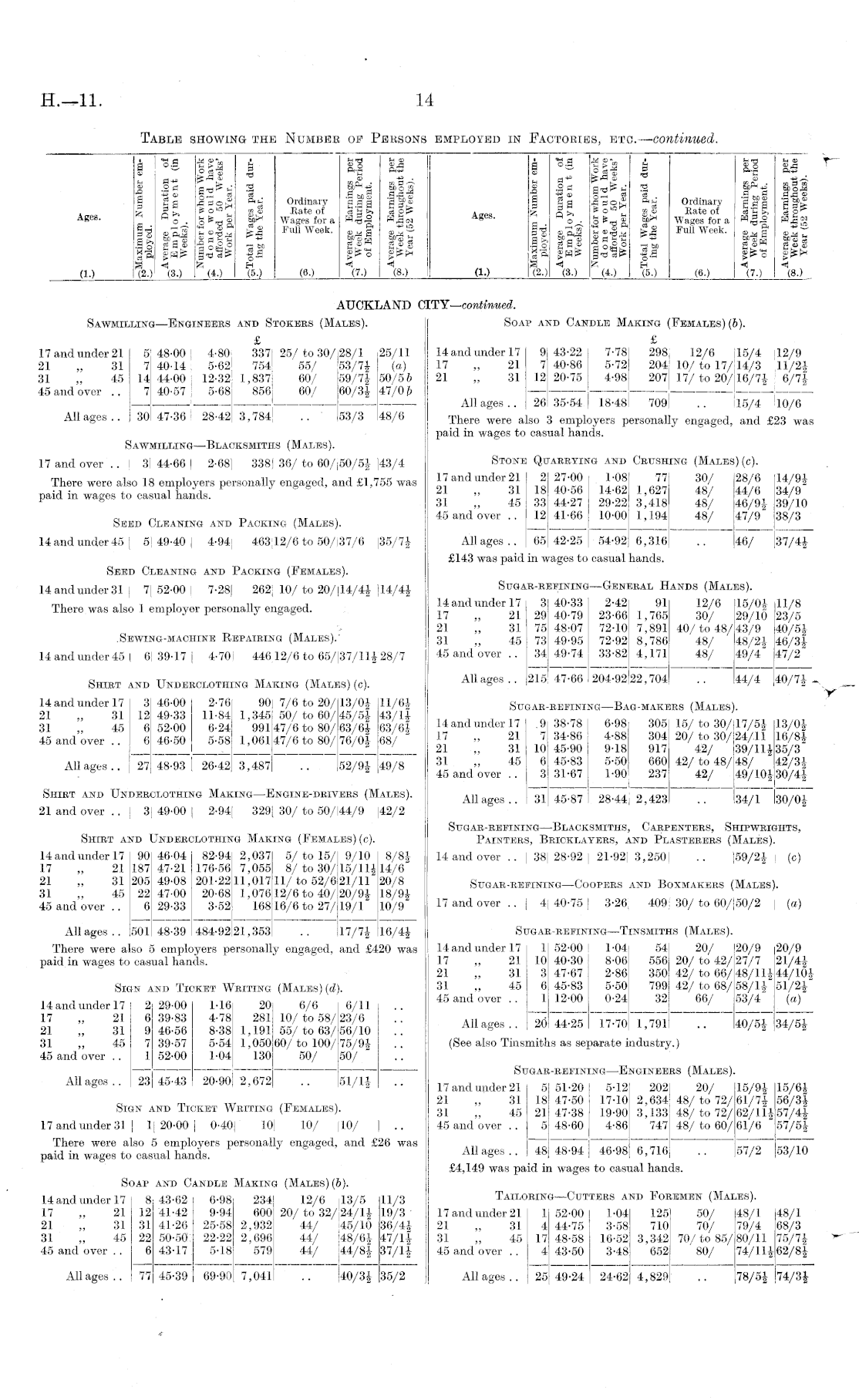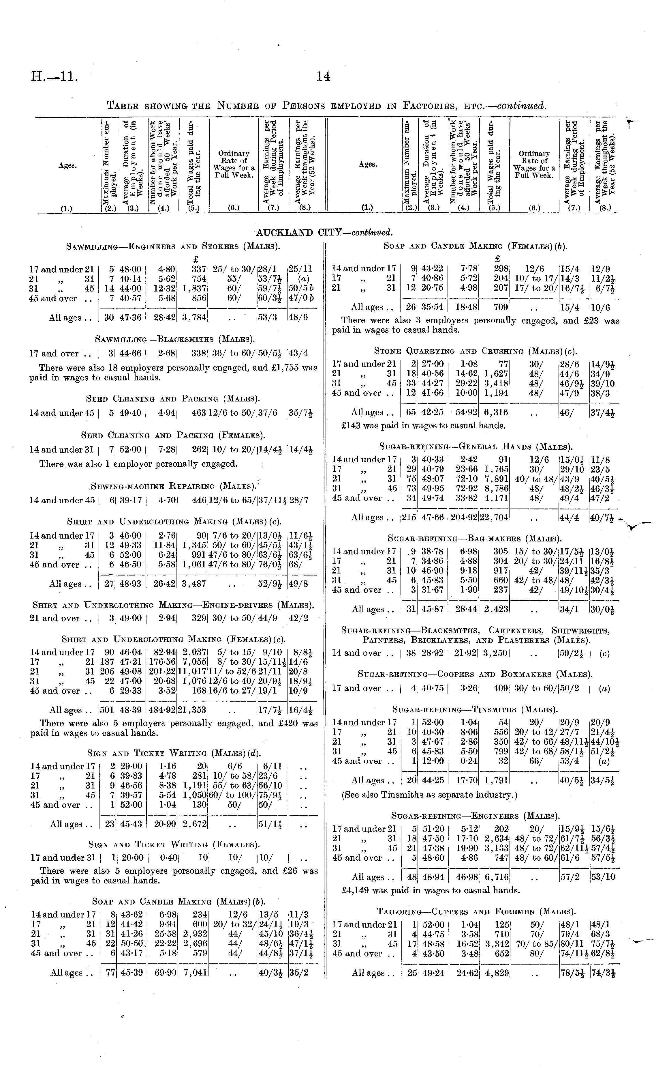 Ages. (10 S P S S3 0 hh *--•--£ s .2 fl 0 ts ts 93 AH 03 CH S CO „ _ 03 3 a a .0 so>H 5 0 ? ss o-o^ *H p h*1 ia 9. tH li ssli i .1* at, to !7*3 03 fl s •£ fi S? oi BZ - Q ~ © 3 |f gSl g^r3 4 ir, (2.) (3.) (4.) 3 T3 TS '3 Phhhaw . 03 H9-9 S3 Ordinary Jlate of Wages for a Full Week. 0,2 01 M-Hhh 3cmS S.SS &3s oom a SfSo 4 (7.) ts Ol "flr^ ana's 5 a - CO OS-■+-1 iO US 0! m ffl gr*r(8.) Ages. a 0H tH 93 0S3 a a ir, B>. ■ts O gpn "S3 0* .2 0 8 0 a 0 «>> 0 aS CM 2*0 2 ap 4 (3.) III IrTS f 0 s* 3^t BTS eor": r, (4.) 3 TS Is) '3 &HH CO Hj 03 bCK-l £i si to o' -1 Eh (5.) Ordinary Kate of Wages for a Full Week. fH rr( ft? „ 9 fi ,. fi £.sa 111 gr^ (7.) tn oi 03 _-; &lS fi-Q 9 M & £ g <a o S-SSr, (8.) r~ (6.) (1.) (6.) AUCKLAND 1 ]TY— continued. Sawmilling—Engineers and Stokers (Males). Soap and Candle Making (Females) (6). £ 17andunder21 5 48-00 ( 4-80 337| 25/ to 30/|28/l 25/11 21 „ 31 7 40-14 5-621 754 ! 55/ 53/7$ (a) 31 „ 45 14 44-00; 12-32 1,837: 60/ 59/7$ 50/56 45 and over .. 7 40-57 5-68 856j 60/ 60/3$ 47/0 6 Allages.. 30 47-36 28-42 3.784J .. 53/3 48/6 £ Hand under 17 9 43-22 7-78 298, 12/6 15/4 :12/9 17 „ 21 7 40-86 5-72 204( 10/to 17/14/3 11/2$ 21 „ 31 12 20-75 4-98 207| 17/ to 20/16/7$ 6/7$ All ages .. 26 35-54 18-48 709] .. 115/4 ll0/6 There were also 3 employers personally engaged, and £23 was paid in wages to casual hands. Sawmilling—Blacksmiths (Males). 17 and over ..13] 44-66 | 2-68] 338] 36/ to 60/i50/5$ (43/4 There were also 18 employers personally engaged, and £1,755 was paid in wages to casual hands. Stone Quarrying and Crushing (Males) (c). 17 and under 21 2 27-00 1-08 77 30/ 28/6 14/9$ 21 „ 31 18 40-56 14-62 1,627 48/ 44/6 34/9 31 „ 45 33 44-27 29-22 3,418 48/ 46/9$ 39/10 45 and over .. 12 41-66 10-00 1,194 48/ 47/9 38/3 Allages.. 65 42-25 54-92 6,316 .. 46/ 37/4$ Seed Cleaning and Packing (Males). Hand under 45 ( 5] 49-40 | 4-94( 463(12/6 to 50/137/6 (35/7$ Seed Cleaning and Packing (Females). £143 was paid in wages to casual hands. 14andunder31 | 7| 52-00 I 7-28) 262( 10/ to 20/114/4$ |H/4$ There was also 1 employer personally engaged. .Sewing-machine Repairing (Males).' Sugar-repining—General Hands (Males). 14 and under 17 3 40-33 2-42 91 12/6 15/0$ 11/8 17 „ 21 29 40-79 23-66 1,765 30/ 29/10 23/5 21 „ 31 75 48-07 72-10 7,891 40/to 48/43/9 40/5$ 31 „ 45 73 49-95 72-92 8,786 48/ 48/2$ 46/3$ 45 and over .. 34 49-74 33-82 4,171 48/ 49/4 47/2 Allages.. 215(47-66 204-92 22,704 .. 44/4 40/7$ y 14andunder45 I 6(39-17] 4-701 446 12/6 to 65/(37/11$28/7 Shirt and Underclothing Making (Males) (c). 14 and under 17 3 46-00 2-76 90j 7/6 to 20/13/0$ 11/6$ 21 „ 31 12 49-33 11-84 1,345 50/to 60/45/5$ 43/1$ 31 „ 45 6 52-00 6-24 99147/6 to 80/ 63/6$ 63/6$ 45 and over.. 6 46-50 5-58 1,061 47/6 to 80/76/0$ 68/ Allages.. ( 27 48-93 26-42 3,487 .. 52/9$ 49/8 Sugar-refining—Bag-makers (Males). Hand under 17 .9 38-78 6-98 305 15/ to 30/(17/5$ 13/0$ 17 „ 21 7 34-86 4-88 304 20/to 30/24/11 16/8$ 21 „ 31 10 45-90 9-18 917 42/ 39/11$ 35/3 31 „ 45 6 45-83 5-50 660 42/ to 48/ 48/ 42/3$ 45 and over.. 3 31-67 1-90 237 42/ 49/10$ 30/4$ Allages.. 3145-87 28-44(2,423 .. 34/1 30/0$ aAR9 7 10 6 3 Shirt and Underclothing Making—Engine-drivers (Males). 21 and over .. [ 3[ 49-00 j 2-94J 329( 30/ to 50/144/9 (42/2 31 Shirt and Underclothing Making (Females) (c). 14andunderl7 90 46-04 82-94 2,037 5/to 15/ 9/10 8/8$ 17 „ 21 187 47-21 176-56 7,055 8/to 30/15/11$ 14/6 21 „ 31 205 49-08 201-22 11,017 11/to 52/6 21/11 20/8 31 „ 45 22 47-00 20-68 1,07612/6 to 40/20/9$ 18/9$ 45 and over .. 6 29-33 3-52 168 16/6 to 27/ 19/1 10/9 Allages.. 501 48-39 484-9221,353 .. 17/7$ 16/4$ There were also 5 employers personally engaged, and £420 was paid in wages to casual hands. sugar-reeining blacksmiths, carpenters, shipwrights, Painters, Bricklayers, and Plasterers (Males). 14 and over .. | 38] 28-92 | 21-92 3,250( .. |59/2$ 1 (c) Sugar-refining—Coopers and Boxmakers (Males). 17 and over .. j 4( 40-75 | 3-26. 409: 30/ to 60/(50/2 | (a) Sugar-refining—Tinsmiths (Males). 14 and under 17 1 52-00! 1-04 54 20/ 20/9 20/9 17 „ 21 10 40-30 8-06 556 20/ to 42/ 27/7 21/4$ 21 „ 31 3 47-67 2-86 350 42/ to 66/48/11$ 44/10$ 31 „ 45 6 45-83 5-50 799 42/ to 68/ 58/1$ 51/2$ 45 and over .. 1 12-00 0-24 32 66/ 53/4 (a) Sign and Ticket Writing (Males) (d). 14andunderl7 2 29-00 1-16 20 6/6 6/11 17 „ 21 6 39-83 4-78 281 10/ to 58/ 23/6 21 „ 31 9 46-56 8-38 1,191 55/to 63/56/10 31 „ 45 7 39-57 5-54 1,050 60/to 100/75/9$ 45 and over .. 1 52-00 1-04 130 50/ 50/ Allages.. 23 45-43 20-90 2,672 .. 51/1$ Allages.. 20 44-25 17-70 1,791 .. 40/5$ 34/5$ (See also Tinsmiths as separate industry.) Sugar-refining—Engineers (Males). Sign and Ticket Writing (Females). 17 and under 31 ] 1] 20-00 | 0-40| 10| 10/ (10/ | .. There were also 5 employers personally engaged, and £26 was paid in wages to casual hands. 17 and under 21 5 51-20 5-12 202( 20/ 15/9$ 15/6$ 21 „ 31 18 47-50 17-10 2,634 48/to 72/61/7$ 56/3$ 31 „ 45 21 47-38 19-90 3,133 48/to 72/62/11$57/4$ 45 and over .. 5 48-60 4-86 747 48/ to 60/ 61/6 57/5$ Allages.. 48 48-94 46-98 6,716 .. 57/2 53/10 £4,149 was paid in wages to casual hands. Soap and Candle Making (Males) (6). 14 and under 17 8 43-62 6-98 234 12/6 (13/5 11/3 17 „ 21 12 41-42 9-94 600 20/ to 32/(24/1$ 19/3 21 „ 31 31 41-26 25-58 2,932 44/ 45/10 36/4$ 31 „ 45 22 50-50 22-22 2,696 44/ 48/6$ 47/1$ 45 and over . . 6 43-17 5-18 579 44/ (44/8$ 37/1$ Allages.. 77 45-39 69-90 7,041 .. |40/3$ 35/2 Tailoring—Cutters and Foremen (Males). 17 and under 21 1 52-00 1-04 125 50/ 48/1 48/1 21 „ 31 4 44-75 3-58 710 70/ 79/4 68/3 31 „ 45 17 48-58 16-52 3,342 70/to 85/80/11 75/7$ 45 and over.. 4 43-50 3-48 652 80/ 74/ll$62/8$ Allages.. 25 49-24 24-62 4,829 .. 78/5$ 74/3$ *