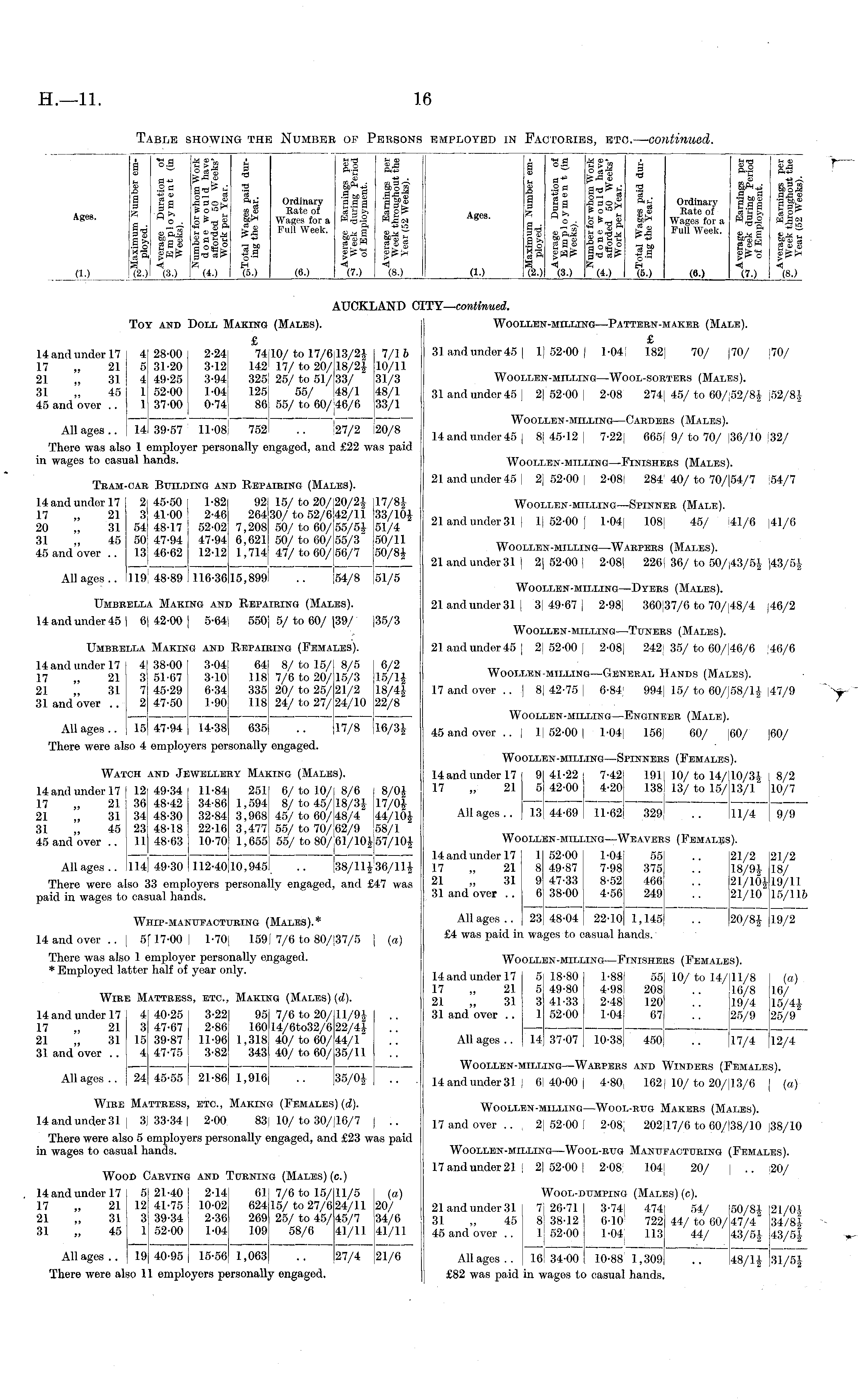 Ages. I M 0} SO ir, §■8 3 oo 3 *»> *ft (2.1 S3 0HH .2 a HH 90 Q °aS iH g S 90 4 (30 t>"o* O eO-fl S C-dr tS Or- a ■a aoiS rO«"" tn te fl s*%t p-fl eSi9 5 si "e$ Pir4 eS «> 03 MrX to ES*S £ A Ordinary Rate of Wages for a Full Week. ts 0) .Steal B.SS a b >i *H 111 gP-o (7.) Fh 09 93 r, ais rfrfl Bf! 00 °r> H£cm 93 oh w $?« a a an ah «(SrH 4 (80 Ages. I u 03 S3 ft fir-. ■fi z gft io a" .2 a ■tt S3 u ° S. 8,ftJ2 CD _ 03 gS| 4 (3.) OS 05- « >3S 1-2 g -3*-gft #st cet> ft (4.) 3 TS '£ ft In' oi Sj|S $ fl o ,FH H (5.) Ordinary Rate of Wages for a Full Week. (6.) *! BrH«i 0 h a •a too B.SS & S *"• "H 111 (70 a£ <it fl m bBOrW S-fi s if! CO g" W Hflg HH g 93 9o OJ^^H ■< , (8.) (1.0 (6.) (10 AUCKLAND 0. FY— continued. Toy and Doll Making (Males). Woollen-milling—Pattern-maker (Male). £ 14 and under 17 4 28-00 2-24( 7440/ to 17/6 13/2$ 7/16 17 „ 21 5 31-20 3-12 142' 17/to 20/18/2$ 10/11 21 „ 31 4 49-25 3-94 325! 25/ to 51/ 33/ 31/3 31 „ 45 1 52-00 1-04, 125 55/ 48/1 48/1 45 and over .. 1 37-00 0-74( 86 55/ to 60/46/6 33/1 Allages.. 14 39-57 11-08: 752 .. ?27/2 120/8 There was also 1 employer personally engaged, and £22 was paid in wages to casual hands. £ 31andunder45 | 1(52-00) 1-04 182] 70/ |70/ 170/ Woollen-milling—Wool-sorters (Males ). 31 and under 45 j 2] 52-00 ] 2-08 274] 45/ to 60/(52/8$ (52/8$ Woollen-milling—Carders (Males). 14 and under 45 | 8] 45-12 | 7-22[ 666/ 9/ to 70/ 36/10 132/ Woollen-milling—Finishers (Males). 21 and under 45 | 2] 52-00 2-08 284 40/to 70/(54/7 154/7 Tram-car Building and Repairing (Males). 14 and under 17 2(45-50, 1-82 92 15/to 20/20/2$ 17/8$ 17 „ 21 3[ 41-00 2-46 264 30/to 52/6 42/11 33/10$ 20 „ 31 54 48-17! 52-02 7,208 50/to 60/55/5$ 51/4 31 „ 45 50 l 47-94 47-94 6,621 50/to 60/55/3 50/11 45 and over .. 13(46-62 12-12 1,714 47/to 60/56/7 (50/8$ Allages.. 119 48-89 116-3615,899 .. ]64/8 [61/5 Woollen-milling—Spinner (Male). 21andunder31 | 1( 52-00 | l-04( 108: 45/ 41/6 |41/6 Woollen-milling—Warpers (Males). 21andunder31 | 2| 52-00 ( 2-08] 226 36/ to 50/43/5$ ]43/5$ Umbrella Making and Repairing (Males). 14 and under 45] 6| 42-00 | 5-64 550| 5/to 60/ [39/ |35/3 Woollen-milling—Dyers (Males). 21andunder31 3(49-67] 2-98] 360:37/0 to 70/(48/4 (46/2 Umbrella Making and Repairing (Females). 14 and under 17 4 38-00 3-04 64i 8/to 15/ 8/5 6/2 17 „ 21 3 51-67 3-10 118 7/6 to 20/15/3 15/1$ 21 „ 31 7 45-29 6-34 335 20/to 25/21/2 18/4$ 31 and over .. 2 47-50 1-90 118 24/to 27/24/10 22/8 Allages.. 15 47-94 14-38 635 .. 17/8 16/3$ Woollen-milling—Tuners (Males). 21 and under 45 [ 2] 52-00 ] 2-08 242] 35/ to 60/(46/6 (46/6 Woollen-milling—General Hands (Males). 17 and over .. | 8| 42-75 | 6-84; 994 15/ to 60/(58/1$ 47/9 r Woollen-milling—Engineer (Male). 45 and over .. | 1| 52-00 j 1-04| 156] 60/ ]60/ |60/ There were also 4 employers personally engaged. Woollen-milling—Spinners (Females). 14 and under 17 9(41-22: 7-42 191; 10/to 14/10/3$ 8/2 17 „ 21 5 42-00 4-20 138 13/ to 15/ 13/1 10/7 Allages.. 13 44-69 11-62 329' .. 11/4 9/9 Watch and Jewellery Making (Males). Hand under 17 I 12 49-34 11-84 251[ 6/to 10/ 8/6 ; 8/0$ 17 „ 21(36 48-42 34-86 1,594 8/to 45/18/3$ 17/0$ 21 „ 31 34 48-30 32-84 3,968| 45/to 60/48/4 44/10$ 31 „ 45 123 48-18 22-16 3,477! 55/to 70/62/9 58/1 45 and over ..11 48-63 10-70 1,655: 55/to 80/61/10$57/10$ Allages.. 1114 49-30 112-40 10,9451 .. !38/Il$'36/ll$ There were also 33 employers personally engaged, and £47 was paid in wages to casual hands. Woollen-milling—Weavers (Females). Hand under 17 1 52-00 1-04 55 .. 21/2 21/2 17 „ 21 8 49-87 7-98 375 .. 18/91 18/ 21 „ 31 9 47-33 8-52 466 .. 21/10$ 19/11 31 and over .. 6 38-00 4-56 249 .. 21/10 15/116 Allages.. 23 48-04 22-10 1,145 .. 20/8$ 19/2 £4 was paid in wages to casual hands. Whip-manueacturing (Males).* 14 and over .. ( 5f 17-00 ] 1-70] 159) 7/6 to 80/(37/5 ] (a) There was also 1 employer personally engaged. * Employed latter half of year only. Wire Mattress, etc., Making (Males) (d). 14 and under 17 4 40-25 3-22 95 7/6 to 20/11/9$ 17 „ 21 3 47-67 2-86 16014/6to32/6 22/4$ 21 „ 31 15 39-87 11-96 1,318 40/to 60/44/1 31 and over.. 4 47-75 3-82 343 40/to 60/35/11 Allages.. 24 45-55 21-86 1,916 .. 35/0$ Woollen-milling—Finishers (Females). Hand under 17 5 18-80 1-88 55 10/to 14/(11/8 | (a) 17 „ 21 5 49-80 4-98 208 .. 46/8 .16/ 21 „ 31 3 41-33 2-48 120 .. ]19/4 !l5/4$ 31 and over . . 1 52-00 1-04 67 ... 25/9 25/9 All ages .. 14 37-07 10-38 450 .. 17/4 12/4 Woollen-milling—Warpers and Winders (Females). 14 and under 31 i 6140-00] 4-80, 1621 10/ to 20/(13/6 | (a) Wire Mattress, etc., Making (Females) (d). 14 and under 31 | 3] 33-34 | 2-00 83] 10/to 30/(16/7 j .. There were also 5 employers personally engaged, and £23 was paid in wages to casual hands. Woollen-milling—Wool-rug Makers (Males). 17 and over... 2] 52-00 I 2-08J 202:17/6 to 60/(38/10 (38/10 Woollen-milling—Wool-rug Manufacturing (Females). 17 and under 21 2152-00] 2-08, 104! 20/ ( -.. 20/ Wood Carving and Turning (Males) (c.) 14 and under 17 5 21-40 2-14 61 7/6 to 15/11/5 (a) 17 „ 21 12 41-75 10-02 62415/to 27/6 24/11 20/ 21 „ 31 3 39-34 2-36 269 25/ to 45/ 45/7 34/6 31 „ 45 1 52-00 1-04 109 58/6 41/11 41/11 Allages.. 19 40-95 15-56 1,063 .. 27/4 21/6 There were also 11 employers personally engaged. Wool-dumping (Males) (c). 21 and under 31 7(26-71 3-74 474 54/ 50/8$ 21/OV 31 „ 45 8, 38-12 6-10 722 44/ to 60/ 47/4' 34/8-J-45 and over .. 1(52-00 1-04 113 44/ 43/5$ 43/5$ Allages.. 16! 34-00 10-88 1,309 .. 48/1$ 31/5$ £82 was paid in wages to casual hands. -