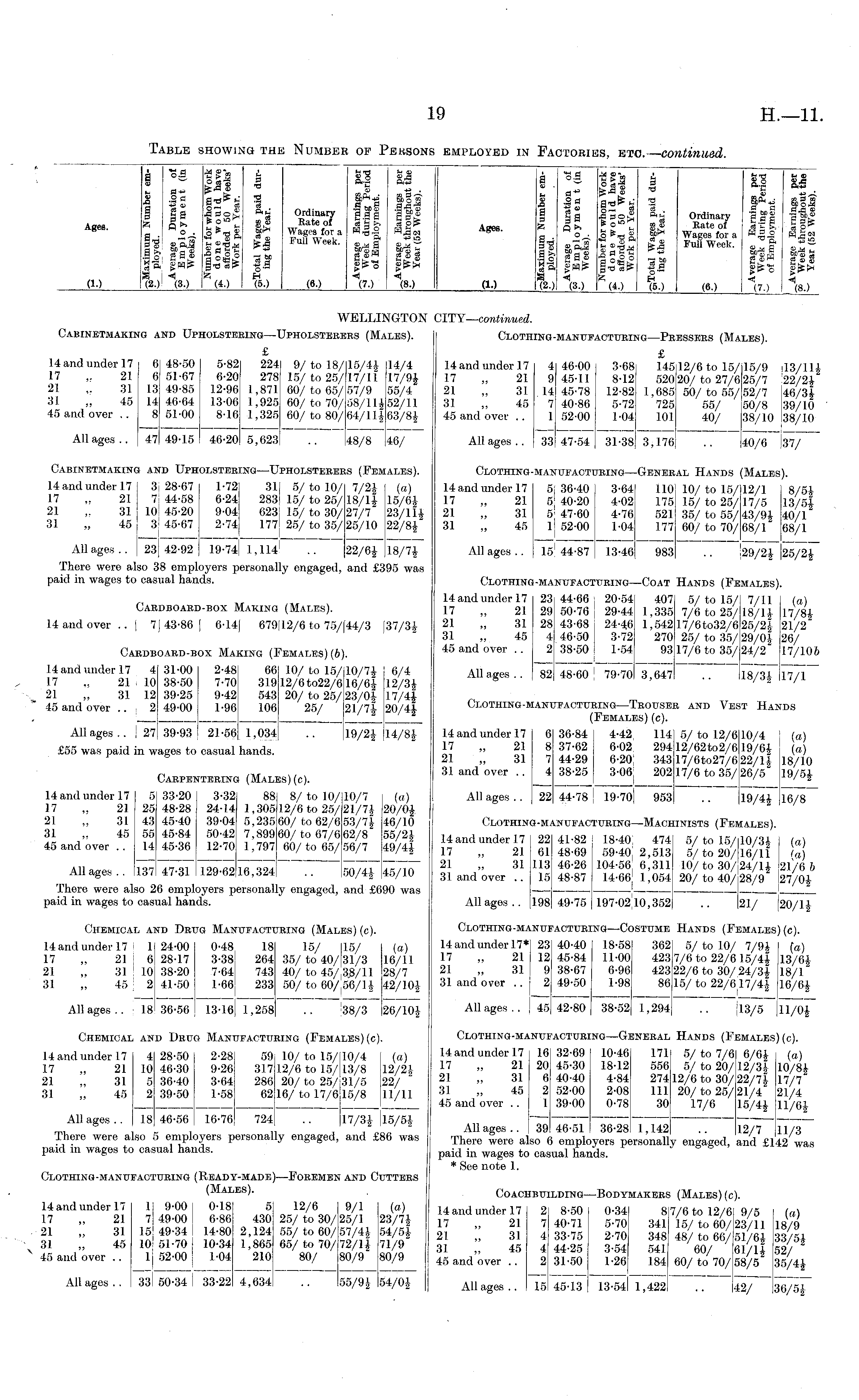 Ages. a "°-B 93 H 0HH S 3 a Bu' »ft^ B ( 4 %■)■ (8.) S4 eo* SboS. te 0 lC3^ SI °tsm H?*]c3g af «te %T3 SOr* ir, (i.) si '3 Ail 3 &s e* to SS to o ,fH Ik Ordinary Rate of Wages for a Full Week. ft'B ScmS S3 3 CO fl *-- Ct3 fl C ■° ft 111 gr*"3 4 (70 rH 03 ■rag 08 OfS hh ir, if 00 9 SS S gr=rH Hi (8.) Ages. i. I if. a >> ■fl O 3ft 1) °=. 0* .20 fi>> °rA 0> Oi OS CMShV s a * 4 (3.) OS o;-_ 0 >S *** te • a-o- 5 a o- a ■5 aoS t- te i, 0-fl es\> (4) 0 ■8 -a 'eO ftlH- « S Si* is si o'~ H (5.) Ordinary Kate of Wages for a Full Week. S-"0 fc- 03 SO £rC 03 -"--.r-i +--' Si 0 JS C U „S tiSS9 eto? &\ H"& «- £ SrS H^N 9 >s G 03 jj T* all Sffl grr-S gr=0< 4 4 (7.) _ (8.) (10 (6.) (1.) (6.) WELLINGTON CITY— continued. Cabinetmaking and Upholstering—Upholsterers (Males). Clothinc UNO-MANUFACTURING —PRESSERS (Males). £ 14 and under 17 6 48-50 5-82 224 9/to 18/15/4$ 14/4 17 ,= 21 6 51-67 6-20 278 15/to 25/17/11 17/9$ 21 „ 31 13 49-85 12-96 1,871 60/to 65/57/9 55/4 31 „ 45 14 46-64 13-06 1,925 60/to 70/58/11$ 52/11 45 and over .. 8 51-00 8-16 1,325 60/to 80/64/11$ 63/8$ Allages.. 47 49-15 46-20 5,623 .. 48/8 46/ 14 and under 17 17 „ 21 21 „ 31 1 31 „ 45 45 and over .. £ 4 46-00 3-68 145 12/6 to 15/15/9 13/11$ 9 45-11 8-12 520 20/to 27/6 25/7 22/2$ 14 45-78 12-82 1,685 50/to 55/52/7 46/3$ 7 40-86 5-72 725 55/ 50/8 (39/10 1 52-00 1-04 101 40/ 38/10 138/10 33 47-54 I 31-38 3,176 .. 40/6 \si/ All ages .. 3; Cabinetmaking and Upholstering—Upholsterers (Females). Clothing-ma -MANUFACTURING—GENERAL HANDS (MALES). 14 and under 17 I 3:28-67 1-72 31! 5/to 10/ 7/2$ (a) 17 „ 21 I 7(44-58 6-24 283; 15/to 25/18/1$ 15/6$ 21 „ 31 j 10! 45-20 9-04 623( 15/to 30/27/7 23/11$ 31 „ 45 3 45-67 2-74 177 25/ to 35/ 25/10 22/8$ Allages.. 23J42-92 19-74! 1,114 .. 22/6$ 18/7$ There were also 38 employers personally engaged, and £395 was paid in wages to casual hands. 14 and under 17 I 17 „ 21 i 21 „ 31 I 31 „ 45 5(36-40 3-64 110 10/to 15/12/1 8/5$ 5(40-20 4-02 175 15/to 25/17/5 13/5$ 5(47-60 4-76 521 35/to 55/43/9 $ 40/1 152-00 1-04 177 60/to 70/68/1 68/1 15' 44-87 13-46 983 .. |29/2$ 25/2$ All ages .. li Clothing-m. 3-MANUFACTURING —COAT HANDS (FEMALES). Cardboard-box Making (Males). Handover..! 7(43-86 | 6-14| 679(12/6 to 75/(44/3 (37/3$ 14 and under 17 2', 17 „ 21 2! 21 „ 31 21 31 „ 45 ( 45 and over . . ! 23 44-66 1 20-54 407 5/ to 15/ 7/11 (a) 29 50-76 29-44 1,335 7/6 to 25/18/1$ 17/8$ 28 43-68 24-46 1,542 17/6to32/6 25/2$ 21/2 4 46-50 3-72 270 25/ to 35/ 29/0$ 26/ 2 38-50 1-54 9317/6 to 35/24/2 17/106 82 48-60 ! 79-70 3,647 .. 18/3$ 17/1 Cardboard-box Making (Females) (b). 14 and under 17 4 31-00 2-48 66 10/to 15/10/7$ 6/4 17 ., 21-10 38-50 7-70 31912/6 to22/616/6$ 12/3$ 21 „ 31 12 39-25 9-42 543 20/to 25/23/0$ 17/4$ 45 and over .. : 2 49-00 1-96 106 25/ 21/7$ 20/4$ Allages.. (27 39-93 ; 21-56 1,034 .. 19/2$ 14/8$ All ages .. 8' Clothing-man £55 was paid in wages to casual hands. 14 and under 17 ( 17 „ 21 I 21 „ 31 ' 31 and over .. 4 ianufacturing—trouser and vest hands (Females) (c). 6 36-84 4-42 114] 5/to 12/610/4 la) 8 37-62 6-02 294!l2/62to2/619/6$ (a) 7 44-29 6-20] 343|17/6to27/6 22/l$ 18/10 4 38-25 3-06! 202(17/6 to 35/ 26/5 19/5$ 22 44-78 I 19-70l 953J .. 19/4$ 16/8 Carpentering (Males) (c). 14 and under 17 5 33-20 3-32 88 8/to 10/10/7 (a) 17 „ 21 25 48-28 24-14 1,30512/6 to 25/21/7$ 20/0$ 21 „ 31 43 45-40 39-04 5,235 60/to 62/6 53/7$ 46/10 31 „ 45 55 45-84 50-42 7,899 60/to 67/6 62/8 55/2$ 45 and over.. 14 45-36 12-70 1,797 60/to 65/56/7 49/4$ Allages.. 137 47-31 129-6216,324 .. 50/4$ 45/10 There were also 26 employers personally engaged, and £690 was paid in wages to casual hands. All ages .. 2't Clothing-m 14 and under 17 22 17 „ 21 61 21 „ 31 113 31 and over .. 15 S-MANUFACTURING—MACHINISTS (FEMALES). 22 41-82 ( 18-40] 474 5/ to 15/(10/3$ (a) 61 48-69 59-40 2,513 5/ to 20/116/11 la) 113 46-26 104-56, 6,311 10/to 30/24/1$ 21/6 5 15 48-87 14-66( 1,054 20/ to 40/28/9 27/0$ 198 49-75 197-02(10,352 .. 21/ J20/l$ G-M; 22 61 113 15 All ages .. 198 198 Chemical and Drug Manufacturing (Males) (c). Hand under 17 1 24-00 0-48 18 15/ [15/ (a) 17 „ 21 6 28-17 3-38 264 35/ to 40/31/3 16/11 21 „ 31. 10 38-20 7-64 743 40/ to 45/38/11 28/7 31 „ 45 2 41-50 1-66 233 50/ to 60/56/1$ 42/10$ Allages.. 36-56 13-16J 1,258 .. ! 38/3 26/10$ Clothing-manu: .NUFACTURING —COSTUME HANDS (FEMALES) (c). 23 40-40 18-58 362 5/ to 10/ 7/9$ I (o) 12 45-84 11-00 423 7/6 to 22/6 15/4$ 13/6$ 9 38-67 6-96 423 22/6 to 30/24/3$ \ 18/1 2 49-50 1-98 86 15/to 22/6 17/4$ j 16/6$ 45 42-80 38-52 1,294 .. (13/5 ]ll/0$ LNUI (a) 16/11 28/7 42/10$ 14 and under 17* 23 17 „ 21 12 21 „ 31 9 31 and over .. ( 2 23 12 9 2 All ages .. ( 45 ! 45 26/10$ Chemical and Drug Manufacturing (Females) (c). 14 and under 17 4 28-50 2-28 59 10/to 15/(10/4 (a) 17 „ 21 10 46-30 9-26 31712/6 to 15/13/8 12/2$ 21 „ 31 5 36-40 3-64 286 20/ to 25/31/5 22/ 31 „ 45 2 39-50 1-58 6216/to 17/615/8 11/11 All ages . . 18 46-56 16-76 724 .. 17/3$ 15/5$ There were also 5 employers personally engaged, and £86 was paid in wages to casual hands. Clothing-manu] 14 and under 17 16 17 „ 21 20 21 „ 31 6 31 „ 45 2 45 and over .. 1 .NUI 16 20 6 2 1 NUFACTURING—GENERAL HANDS (FEMALES) (c). 16 32-69 10-46 171 5/ to 7/6 6/6$ (a) 20 45-30 18-12 556 5/ to 20/12/3$ 10/8$ 6 40-40 4-84 274 12/6 to 30/22/7$ 17/7 2 52-00 2-08 111 20/to 25/21/4 21/4 1 39-00 0-78 30 17/6 15/4$ 11/6$ 39 46-51 36-28 1,142 .. 12/7 11/3 30 6 employers personally engaged, and £142 was casual hands. All ages .. 39 There were also I paid in wages to cas * See note 1. 39 Iso ( 1 cas Clothing-manufacturing (Ready-made)—Foremen and Cutters (Males). 14andunderl7 11 9-00 0-18 5 12/6 9/1 (a) 17 „ 21 7(49-00 6-86 430 25/to 30/25/1 23/7$ 21 „ 31 15'49-34 14-80 2,124 55/to 60/57/4$ 54/5$ 31 „ 45 10 ! 51-70 10-34 1,865 65/to 70/72/1$ 71/9 45 and over .. lj 52-00 1-04 210 80/ 80/9 80/9 Allages.. 33 50-34 ! 33-22 4,634 .. 55/9$ 54