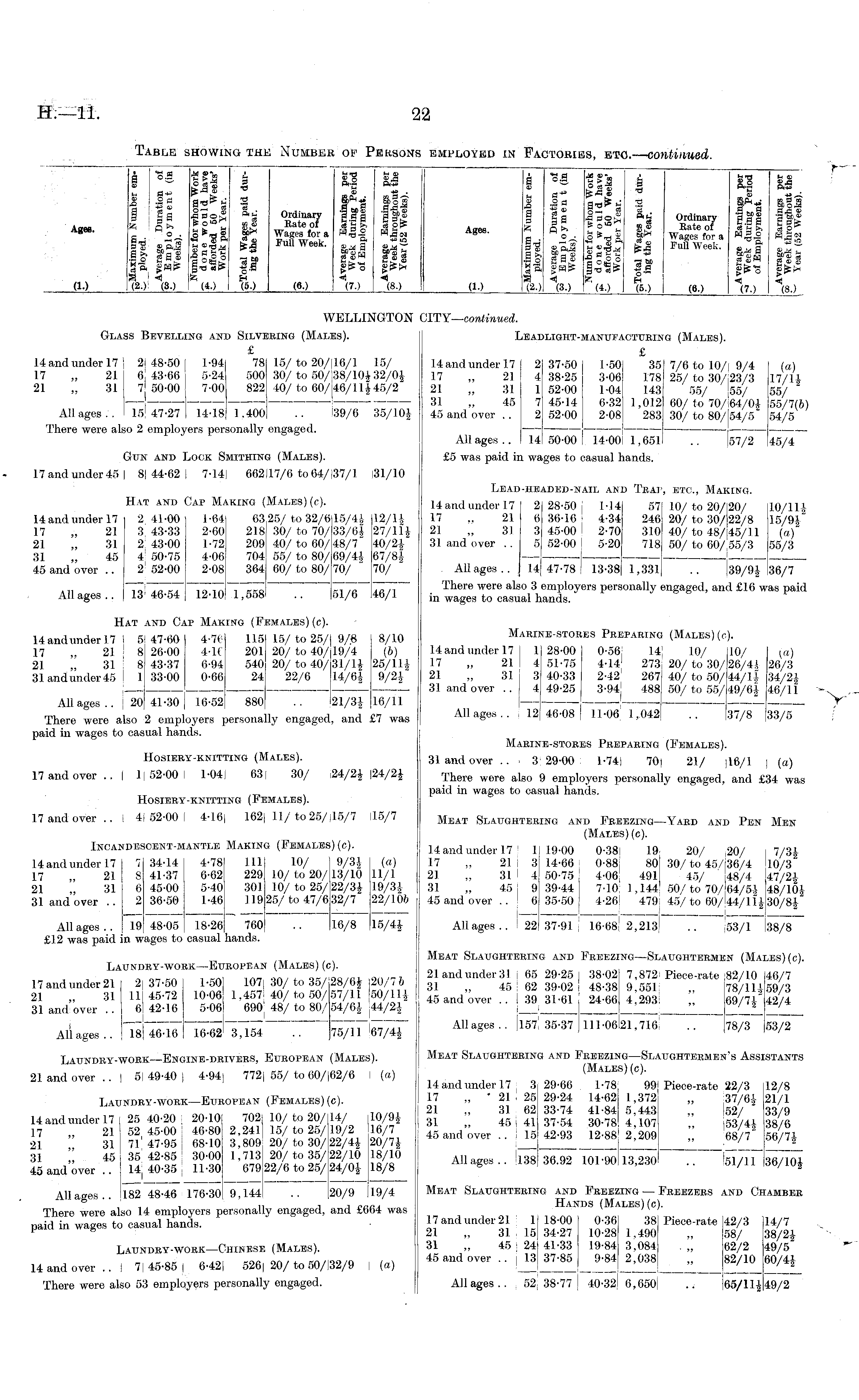 Agee. 1 ™s Or I ga s • °~ 0» RftrS l& gas ga «Wr* a 4 (2.) (3.) a-o^a o- $ g-oafe (4.) -H § si ft-H - H? 90 fes SB o — H (50 Ordinary Rate of Wages for a Full Week. *1 .S to a. £.se .6 is >> III life* (7.) -h 03 03 « lit .a ■So §!l 03 PC^ «£« HH IO cmSSo ts OS oo eS gfei-l Hi (8.) Ages. (10 a *-. 03 S3 a 3 ft 5 9 it? gft s (*■) "S3 0"" .2 0 -£ S3 *i P >» a?! gas JHr 4 (3.) m « a-0 fe s ~ o— s s . .p BOS ftt■S -gft s« IS'S-h &s a ts os> «.a ir, H (40 (5.) Ordinary Rate of Wages for a Pull Week. a&.» 0 „0 •33 CM03 S3 8 CO H. >-. f*3s Ms! CO Orgfec Hi (70 tn 93 & JS ft© en 0 *» 6f OJ4 S-0 s ■0 CMS S BH ss" gterr (1.) (6.) (6.) WELLINGTON CITY— continued. Glass Bevelling and Silvering (Males). Leadlight-manufacturing (Males). £ 14 and under 17] 2; 48-50 i 1-94 78 15/to 20/116/1 15/ 17 „ 21 | 6 43-66! 5-24 500 30/ to 50/ .38/10*32/0$ 21 „ 31 7 50-00; 7-00 822 40/to 60/46/11$45/2 Allages.. 15 1 47-27 ! 14-18 1,400 .. 39/6 35/10$ There were also 2 employers personally engaged. £ 14andunderl7 2 37-50 1-50] 35 7/6 to 10/ 9/4 (a) 17 „ 21 4 38-25 3-06' 178 25/to 30/23/3 17/1$ 21 „ 31 1 52-00 1-04 143 55/ 55/ 55/ 31 „ 45 7 45-14 6-32 1,012 60/to 70/64/0$ 55/7(6) 45 and over .. 2 52-00 2-08 283 30/ to 80/154/5" 54/5 All ages .. 14 50-00 ! 14-00 1,651 . . |s7/2 45/4 £5 was paid in wages to casual hands. Gun and Lock Smithing (Males). 17 and under 45 | 8] 44-62 ] 7-141 662117/6 to 64/137/1 131/10 Lead-headed-nail and Trap, etc., Making. Hat and Cap Making (Males) (c). Hand under 17 2 28-50' 1-14 57 10/to 20/20/ 10/11$ 17 „ 21 6 36-16 4-34 246 20/to 30/22/8 15/9$ 21 „ 31 3 45-00 2-70 310 40/to 48/45/11 (o) 31 and over .. 5 52-00 ; 5-20 718 50/ to 60/ 55/3 55/3 Allages.. 14 47-78; 13-38 1,331 .. J39/9$ 36/7 There were also 3 employers personally engaged, and £16 was paid in wages to casual hands. 14 and under 17 2 41-00 1-64 63,25/to 32/6 15/4$ 12/1$ 17 „ 21 3 43-33 2-60 218 30/to 70/33/6$ 27/11$ 21 „ 31 2 43-00 1-72 209 40/to 60/48/7 40/2$ 31 „ 45 4 50-75 4-06 704 55/ to 80/ 69/4$ 67/8i 45 and over .. 2' 52-00 2-08 364 60/ to 80/ 70/ 70/ Allages.. 13 46-54 12-10 1,558 .. 51/6 46/1 Hat and Cap Making (Females) (c). 14andunder17 5:47-60 4-76 115 15/ to 25/1 9/J8 8/10 17 „ 21 ( 8! 26-00 4-K 201 20/ to 40/19/4 (6) 21 „ 31 8 43-37 6-94 540 20/to 40/31/1$ 25/11$ 31 and under 45 I 1 33-00 0-66 24 22/6 14/6$ 9/2$ Allages.. [ 20 41-30 16-52 880 .. 21/3$ 16/11 There were also 2 employers personally engaged, and £7 was paid in wages to casual hands. Marine-stores Preparing (Males) (c). 14 and under 17] 1 28-00 0-56J 14] 10/ 10/ -a) 17 „ 21 4 51-75 4-H 1 273 20/ to 30/ 26/4J 26/3 21 „ 31 3 40-33 2-42 267( 40/ to 50/ 44/1$ 34/2$ 31 and over .. 4 49-25 3-94J 488 50/to 55/49/6$ 46/11 Allages.. , 12] 46-08 | 11-06.' 1,042! .. 37/8 33/5 r Marine-stores Preparing (Females). Hosiery-knitting (Males). Handover ..| 1 52-00 1-041 63; 30/ 24/2$ |24/2$ 31 and over.. 3 29-00: 1-741 70; 21/ 16/1 | (a) There were also 9 employers personally engaged, and £34 was paid in wages to casual hands. Hosiery-knitting (Females). Handover.. : 4:52-00; 4-16] 162] 1.1/to 25/15/7 115/7 Meat Slaughtering and Freezing—Yard and Pen Men (Males) (c). Incandescent-mantle Making (Females) (c). 14 and under 17; 7 34-14 4-78 111 10/ 9/3$ (a) 17 21 8 41-37 6-62 229 10/ to 20/13/10 11/1 21 „ 31 6 45-00 5-40 301 10/ to 25/ 22/3$ 19/3$ 31 and over.. 2 36-50 1-46 119 25/to 47/6 32/7 22/10ft All ages . . 19 48-05 18-26 760 .. 16/8 15/4$ £12 was paid in wages to casual hands. Hand under 17 1119-00 0-38; 19- 20/ ,20/ 7/3$ 17 „ 21 3 14-66 0-88 80( 30/ to 45/36/4 10/3 21 „ 31 4 50-75 4-06! 491 45/ (48/4 47/2$ 31 „ 45 9 39-44] 7-10, 1,144 ! 50/to 70/64/5$ 48/10$ 45 and over.. 6 35-50] 4-26 1 479 45/ to 60/44/11$ 30/8$ ( ; . i ; Allages.. 22 37-91 16-68(2,213! .. 53/1 138/8 Laundry-work—European (Males) (c). 17 and under 21 2; 37-50 1-501 107: 30/ to 35/ 28/6$ (20/7 b 21 31 ll! 45-72 10-06! 1,457 40/to 50/57/11 50/111 31 and'over .. 6! 42-16 5-06 690] 48/ to 80/ 54/6$ 44/2$ iUlages.. 18 ! 46-16 16-62 3,154 .. 75/11 67/4$ Meat Slaughtering and Freezing—Slaughtermen (Males) (c). 21 and under 31 : 65 29-25 38-021 7,872-Piece-rate ]82/10 46/7 31 „ 45 62 39-02 i 48-381 9,551 „ !78/ll$59/3 45 and over .. ! 39 31-61 24-66; 4,293 „ 69/7$ 42/4 Allages.. |l57i 35-37 111-06121,716 .. 78/3 53/2 Laundry-work—Engine-drivers, European (Males). 21 and over .. | 51 49-40 | 4-94) 772] 55/ to 60/62/6 I (a) Meat Slaughtering and Freezing—Slaughtermen's Assistants (Males) (c). Laundry-work—European (Females) (c). 14 and under 17 25 40-20 20-10 702; 10/to 20/14/ 10/9$ 17 21 ! 52 45-00 46-80 2,241! 15/to 25/19/2 .16/7 21 " 31 ! 71' 47-95 68-10 3,809 20/to 30/22/4$ 20/7$ 31 45 ! 35'42-85 30-00 1,713 20/to 35/22/10 18/10 45 and'over .. j 14J 40-35 j 11-30 679 22/6 to 25/24/0$ 18/8 Allages.. |l82 48-46 176-30 9,144 .. 20/9 19/4 There were also 14 employers personally engaged, and £664 was paid in wages to casual hands. 14 and under 17 3 29-66 1-78 99j Piece-rate 22/3 12/8 17 „ * 21 25 29-24 14-62 1,372 „ 37/6$ 21/1 21 ., 31 62 33-74 41-84 5,443 „ 152/ 33/9 31 „ 45 41 37-54 30-78 4,107 „ (53/4$ 38/6 45 and over .. 15 42-93 12-88] 2,209 „ 68/7 56/7$ ■ _ Allages.. !l38 36.92 101-90113,230 .. IS1/11 36/10$ Meat Slaughtering and Freezing — Freezers and Chamber Hands (Males) (c). 17 and under 21 1! 18-00 0-36 38 Piece-rate 42/3 14/7 21 „ 31 15! 34-27 10-28 1,490 „ 58/ 38/2$ 31 „ 45 ( 24j 41-33 19-84 3,084 . „ 62/2 49/5 45 and over .. ; 13(37-85 9-84 2,038( „ 82/10 60/4$ Allages.. 52, 38-77 1 40-32 6,650] .. (65/11$49/2 LauNdry-work—Chinese (Males). Handover.. I 71 45-85 j 6-42] 5261 20/ to 50/132/9 i (a) There were also 53 employers personally engaged.