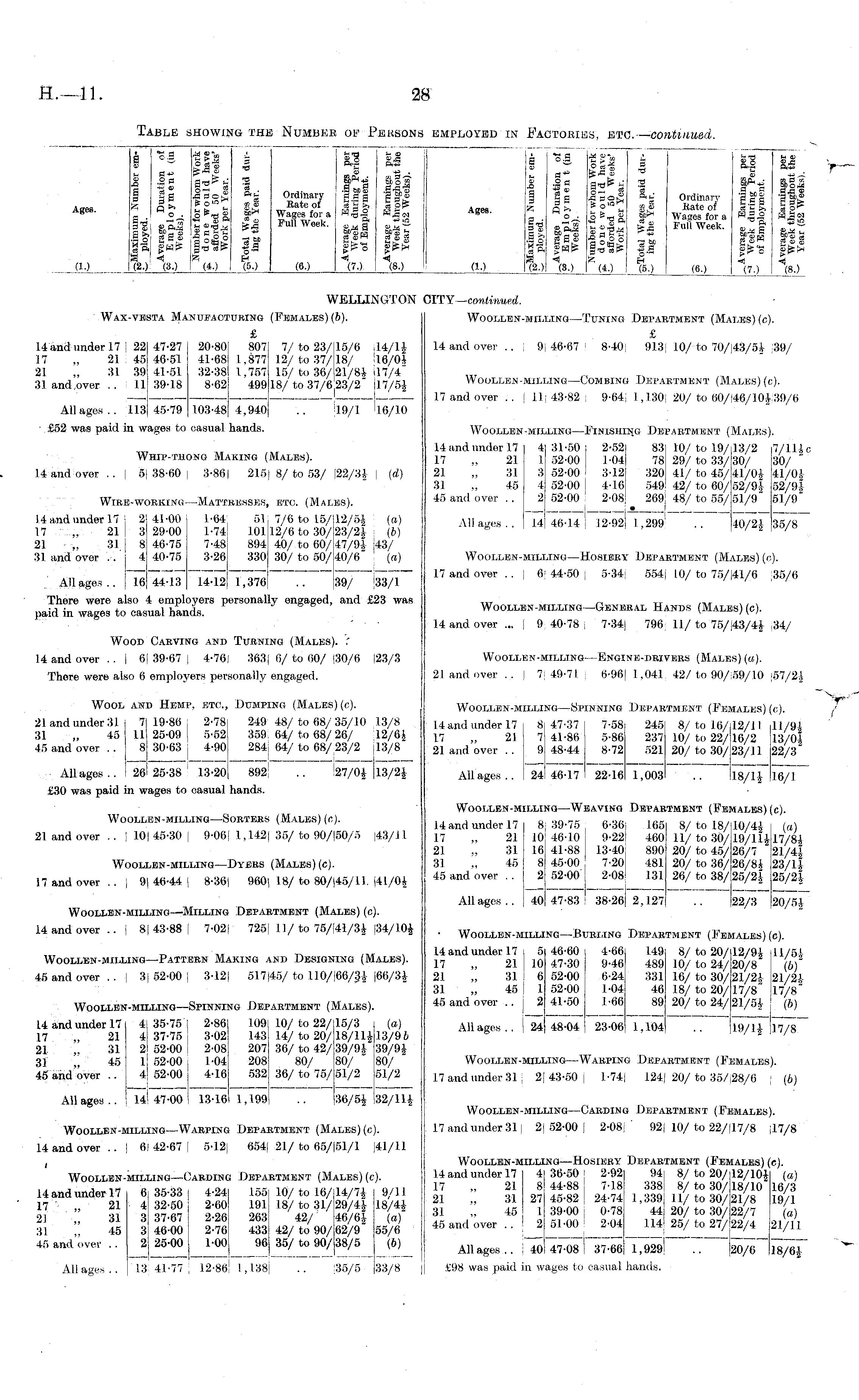 Ages. 0 C 0 tHp-S 8 Pss I j£ !p* 9 ■ °aS b% <g,o,5 is°>%oi .§§-, |s| %i&s gft fSf g-0^r* a ! 4 y, (20 (S.) (4-) 3 •a -0 'a ftt; a a£ a 0 #■0 93 ton £a o — H Ordinary Rate of Wages for a Full Week. Sil — 9 a*-** .9mS S3 B *h in gJ-'-o ■5, (7.). is ° —S HH . a: 0--V cl. o r2 9-0-S 3 SP5 5 5r HH Ii5 a« -. S£$ gr"W 4 (8.) Ages. 63 U 0* £ %a 0 30 * p i? S • — ll 8?l ,Eo & a s Ift gara -^ (2.) (3.) H H ft **" te - S3 90S •= o'°7 3' s Ts't %9&£ §T3 osif ir, (4.) 0 ■0 0 ir' Oil 03 ■£SS Si to $& H (5-) Ordinary .'Rate of Wases for a Full Week. if" avisos 6.9 = eS a. >. « 3 o 'ft 93 oj, a If II |r-« Hj (7.) 8,5 . |1S BS3 93 '3 cms Op H-0g OH ih . » o 5 a oh o gtejx ** > r (1.) (6.) (1.) (6.) WELLINGTON CITY— continued. Wax-vesta Manufacturing (Females) (6). Woollen-milling—Tuning Department (Males) (c). £ HandunderH ' 22 47-27 20-80 807 7/ to 23/15/6 44/1$ 17 „ 21 45 46-51 41-68 1,877 12/to 37/18/ 16/0$ 21 „ 31 39 41-51 32-38 1,757 15/ to 36/ 21/8* :17/4 31 Mid over .. 1139-18 8-62 499 18/to 37/6 23/2 ~ H/5$ Allages.. 113 45-79 103-48 4,940 .. jl9/l 116/10 ■ £52 was paid in wages to casual hands. £ 14 and over .. 9] 46-67 ; 8-40; 913; 10/ to 70/(43/5$ 39/ Woollen-milling—Combing Department (Males) (c). Handover . . ; 11 43-82 9-64 1,130 20/ to 60/46/10$ 39/6 Whip-thong Making (Males). Handover .. | 5! 38-60 3-86 j 215) 8/ to 53/ [22/3$ | (d) Woollen-milling—Finishing Department (Males). HandunderH 4 31-50, 2-52 83] 10/ to 19/13/2 7/ll$c 17 „ 21 1 52-00 I 1-04 78 29/to 33/30/ 30/ 21 „ 31 3 52-00 I 3-12 320 41/ to 45/ 41/0$ 41/0$ 31 „ 45 4 52-00 ! 4-16 549 42/ to 60/ 62/9$ 52/9$ 45 and over.. 2 52-00' 2-08 269 1 48/ to 55/ 51/9" 51/9 1 | A —! Allages.. 14 46-14 12-92; 1,299 .. 40/2$ 35/8 Wire-working—Mattresses, etc. (Males). HandunderH, 2 41-00 1-64 51; 7/6 to 15/12/5$ (a) 17 „ 21 i 3 29-00 1-74 101 12/6 to 30/ 23/2$ (b) 21 „ 31 i 8 46-75 7-48 894 40/ to 60/ 47/9$ (43/ 31 and over .-. j 4 40-75 3-26 330 30/to 50/40/6 (a) Allages.. I 16| 44-13 14-12 1,376 .. 39/ 33/1 There were also 4 employers personally engaged, and £23 was paid in wages to casual, hands. Woollen-milling—Hosiery Department (Males) (<■). 17 and over . . , 6 44-50 5-34 554| 1.0/ to 75/41/6 35/6 Woollen-milling—General Hands (Males) (c). 14 and over ... | 9 40-78 ; 7-34; 796 11/ to 75/43/4$ ,34/ Wood Carving and Turning (Males). 14 and over .. | 6| 39-67 j 4-76j 363| 6/ to 60/ ]30/6 123/3 Woollen-milling—Engine-drivers (Males) (a). 21 and over., j 7] 49-71 6-96) 1,041 42/ to 90/59/10 (57/2$ There were also 6 employers personally engaged. Wool and Hemp, etc., Oumping (Males) (c). -I 21 and under 31 7 19-86; 2-78; 249 48/to 68/35/10 13/8 31 „ 45 11 25-09 | 5-52 359 64/ to 68/ 26/ (12/6$ 45 and over .. 8 30-63 ; 4-90 284 64/ to 68/23/2 13/8 Allages.. 26 25-38 13-20 892! .. !27/0$ 13/2$ £30 was paid in wages to casual hands. Woollen-milling—Spinning Department (Females) (<;). Hand under 17 , 8 47-37 7-58 245 8/to 16/12/1 1 11/9$ 17 „ 21 7 41-86 5-86 237 10/ to 22/16/2 13/0$ 21 and over .. 9 48-44 8-72 521 20/to 30/23/11 22/3" Allages.. 24 46-17 22-1.6 1,003 .. 18/1$ 16/1 1 Woollen-milling—Sorters (Males) (c). 21 and over .. | 101 45-30 [ 9-06] 1,142] 35/ to 90/50/5 [43/11 Woollen-milling—Oyers (Males) (c). Woollen-milling—W t eavinq Department (Females) (c). Hand under 17 8] 39-75 6-36 165 8/to 18/10/4$ (a) 17 „ 21 10 46-10 9-22( 460 11/to 30/19/11$ 17/8$ 21 ,. 31 16 41-88 13-40] 890 20/to 45/26/7 21/4$ 31 „ 45 8 45-00 7-20 481 20/to 36/26/8$ 23/1$ 45 and over .. 2 52-00 : 2-08! 131 26/to 38/25/2$ 25/2$ Allages.. 40 47-83 38-26] 2,127 .. 22/3 20/5$ Handover.. ! 9] 46-44 ] 8-36| 960| 18/ to 80/|45/ll. [41/0$ Woollen-milling—Milling Department (Males) (c). Handover..; 8] 43-88 [ 7-02] 7261 11/ to 75/(41/3$ |34/10$ Woollen-milling—Burling Department (Females) (c). HandunderH 5 46-60 4-66 149 8/to 20/12/9$ [11/5$ 17 „ 21(10 47-30 9-46 489 10/to 24/20/8 j (b)~ 21 „ 31 ! 6 52-00 6-24 331 16/ to 30/ 21/2$ 21/2$ 31 „ 45 i 1 52-00 1-04 46 18/to 20/17/8 17/8 45 and over .. ! 2 41-50 1-66 89 20/to 24/21/5$ - (b) Allages.. 24 48-04 23-06 1,104 .. 19/1$ 117/8 Woollen-milling—Pattern Making and Oesigning (Males). 45 and over.. | 3] 52-00 j 3-12] 517|45/ to 110/66/3$ |66/3$ Woollen-milling—Spinning Department (Males). HandunderH 4:35-75: 2-86 109 10/ to 22/15/3 | (a) 17 „ 21' 4(37-75 3-02 143 14/to 20/18/11$ 13/9 <i 21 „ 31 2! 52-00 ! 2-08 207 36/ to 42/ 39/9$ 39/9$ 31 „ 45 1 52-00 . 1-04 208 80/ 80/ 80/ 45 and over.. 4; 52-00 j 4-16 532 36/to 75/51/2 51/2 Allages.. 141 47-00 I 13-16 1,199 .. 36/5$ 32/11$ Woollen-milling—Warping Department (Females). 1.7 and under 31 2(43-50 1-74) 124| 20/to 35/|28/6 (b) Woollen-milling—Warping Department (Males) (c). Handover..) 6142-67] 5-12) 654] 21/ to 65/51/1 (41/11 Woollen-milling—Carding Department (Females). 17 and under 31 2152-00] 2-08| ' 92; 10/ to 22/17/8 ,17/8 1 Woollen-milling—Carding Department (Males) (c). HandunderH 6 35-33; 4-24 155 10/to 16/14/7$ 9/1 1 17 „ 21 4 32-50 j 2-60 191 18/ to 31/ 29/4$ 18/4$ 21 '■„ 31 3 37-67 j 2-26 263 42/ 46/6$ (a) 31 „ 45 3 46-00 2-76 433 42/to 90/62/9 55/6 45 and over.. 2 25-00 j 1-00 96 35/to 90/38/5 (b) Allages.. 13 41-77 12-86! 1,138( .. 35/5 33/8 Woollen-milling—Hosiery Department (Females) (e). 14 and under 17 4 36-50: 2-92 94; 8/ to 20/12/10$ (a) 17 „ 21 8 44-88, 7-1.8 338] 8/to 30/18/10* 16/3 21 „ 31 27 45-82! 24-74 1,339; 11/to 30/21/8 19/1 31 ., 45 1 39-00 ! 0-78 44; 20/ to 30/ 22/7 (a) 45 and over.. ! 2 51-00 2-04 114 25/ to 27/22/4 21/11 Allages.. : 40 47-08 i 37-66 1,929! .. (20/6 18/6$ £98 was paid in wages to casual hands.