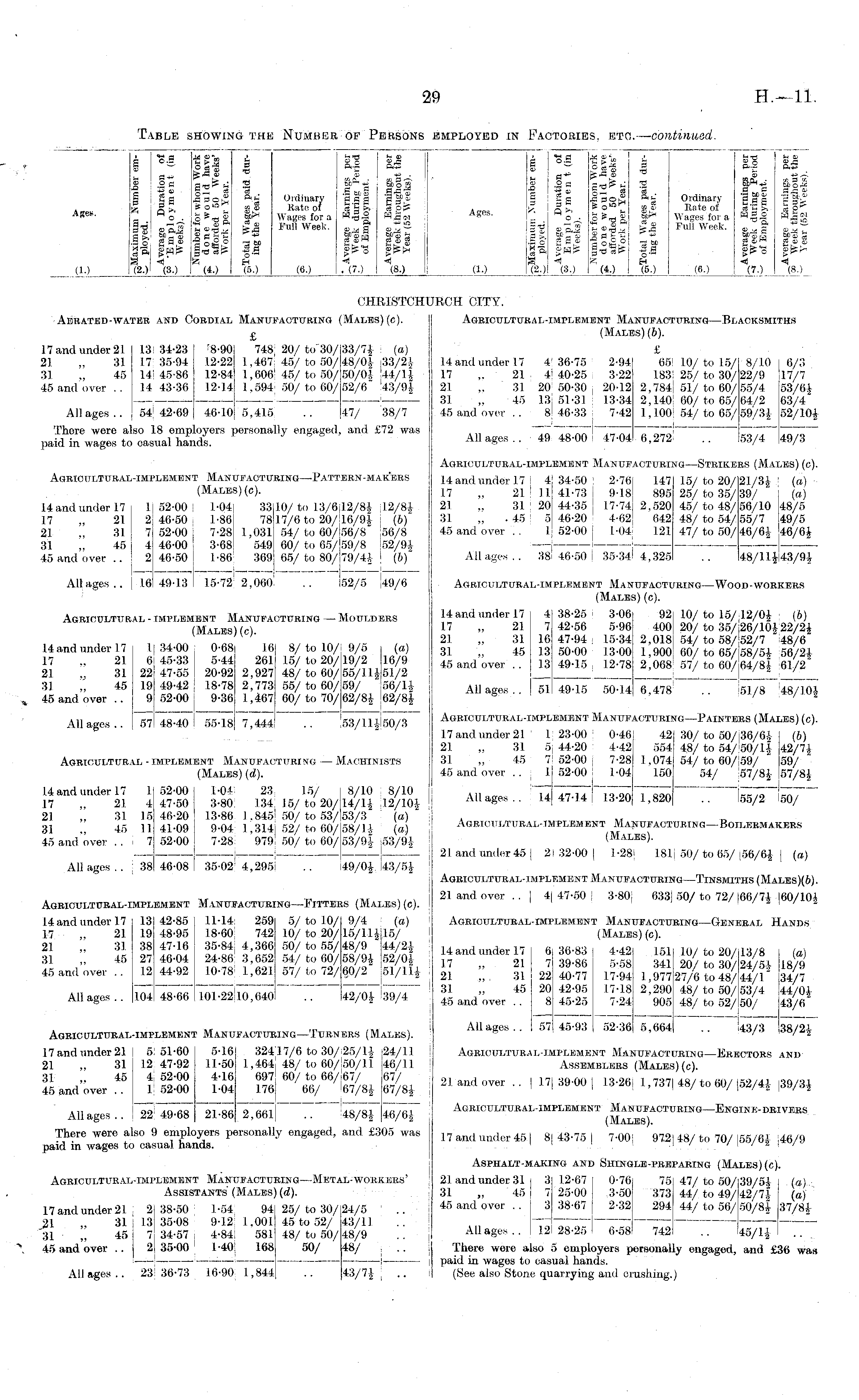 Aaes. AA 0 HH > S •S ■$% 3^£ I Is -p=sI K ll" ' f Z - aJ% &'ta, a-a gwp |.0^ra \4 ir, __ (3.) (4.) -5 •0 'a ftlH - a atS OS 03 *s 93 CM £ a 9 — £H (5.) I i. so 93 SO \ 91 r, ft-S ] as 0,1 . ' „3~ M-HH JQ. 3 bc g 0 S3 % Ordinary go g 'g g>» Rate of a b >, a o rWageofora H£<m full Week. „,. 3 «S iffl SSi gr-l? »r"> 4 4 (6.) ■ (70 (8-) Ages. i ! rH rD 9 ft StS is. 11 i wo "S3 0* .2 0 Sh CO |9 0 aS 'hi sss~- - B 0. (80 OS - -, O eS9% 3 >S3 S TS " > ■ - 9 TS r- rl .0 c-h a a . 0 aoS a,-- Ordinary * ° \Z S* Rate of c-rS T* Wages for a "»| B S£ Full Week. 3-0 ar- -g.H y, 1 h (4.) I (S.) (_) 9 &9haS a „e •9 CM, 0. S.BB a C r-. ft III giS'S Hi (70 U 93 133 AA ft*3 ■r B 9oS CM 93 OS ■= M " Z B<. a S a-s 's lSo-% 4 (80 (1.) OO CHRISTCH JRCH CITY. Aerated-water and Cordial Manufacturing (.Wales) (c). £ 17 and under 21 13:34-23 : 8-90 748 20/to'30/33/7$ (a) 21 „ 31 17 35-94 12-22 1,467 45/ to 50/ 48/01 ,33/2$ 31 „ 45 14 45-86 12-84 1,606 45/to 50/50/0$ [44/1$ 45 and over .. 14 43-36 1214 1,594 50/to 60/52/6 43/9$ Allages.. 54 ! 42-69 46-10 5,415 .. 47/ 38/7 There were also 18 employers personally engaged, and £72 was paid in wages to casual hands. Agricultural-implement Manueacturing—Blacksmiths (Males) (6). £ 14 and under 17 4 36-75 2-94 65! 10/ to 15/ 8/10 6/3 17 ,. 21 4: 40-25 3-22 183 25/to 30/22/9 17/7 21 .. 31 20 50-30, 20-12 2,784: 51/ to 60/ 55/4 53/6$ 31 „ 45 13:51-31 13-34 2,140! 60/ to 65/ 64/2 63/4 45 and over . . 8 1 46-33 ( 7-42 1,100 s 54/ to 65/59/3$ 52/10$ Allages.. 49! 48-00 1 47-04 6,272 .. 53/4 49/3 Agricultural-implement Manufacturing—Pattern-mak?ers (Males) (c). Agricultural-implement Manufacturing—Strikers (Males) (<;). HandunderH: 1] 52-00 1-04] 33 10/to 13/6|12/8$ |12/8$ 17 „ 21 2(46-50 1-86 7817/6 to 20/16/9$ : (6) 21 „ 31 I 7)52-00 7-28 1,031 54/ to 60/ 56/8 56/8 31 „ 45 41 46-00 I 3-68 549 60/ to 65/ 59/8 52/9$ 45 and over .. j 2 46-50 ( 1-86 369 65/ to 80/ 79/4$ ( (b) Allages.. ( 16l 49-13 : 15-72 2,060 .. 52/5 49/6 14 and under 17 [ 4 34-50: 2-76 147 15/to 20/21/3$ (a) 17 „ 21 11 41-73 9-18 895 25/to 35/39/ (a) 21 ,. 31! 20 44-35 j 17-74 2,520 45/to 48/56/10 48/5 31 „ .45 5 46-20 4-62 642 48/ to 54/ 55/7 49/5 45 and over .. 1 52-00! 1-04 121. 47/to 50/46/6$ (46/6$ Allages.. 381 46-50 I 35-34 4,325 .. 48/ll$!43/9$ Agricultural-implement Manufacturing—Wood-workers (Males) (c). Agricultural - implement Manufacturing — Moulders (Males) (c). HandunderH 4 38-25 3-06 92 10/to 15/12/0$ (b) 17 „ 21 7 42-56 5-96 400( 20/ to 35/26/10$ 22/2$ 21 „ 31 16 47-94. 15-34 2,018! 54/ to 58/52/7 " 48/6* 31 „ 45 13 50-00 13-00 1,900 ! 60/ to 65/ 58/5$ 56/2 J 45 and over .. 13 49-15 12-78 2,068! 57/ to 60/ 64/8| 61/2 Allages.. 51 49-15 50-14 6,478 : .. J51/8 (48/10$ HandunderH 1.1 34-00 0-68i 16] 8/to 10/ 9/5 1 (a) 17 ., 21 6i 45-33 5-44 261 15/to 20/19/2 16/9 21 .. 31 22 47-55! 20-92 2,927 48/to 60/55/11$51/2 31 „ 45 19 49-42' 18-78 2,773 55/to 60/59/ 56/1$ 45 and over .. 9 52-00; 9-36 1,467 60/ to 70/ 62/8$ 62/8$ Allages.. 57 48-40 55-18 7,444 .. 1.53/1 I i!50/3 Agricultural-implement Manufacturing—Painters (Males) (c). Agricultural - implement Manufacturing — Machinists (Males) (d). 17andunder21 123-00! 0-46 42 30/ to 50/36/6} (b) 21 „ 31 Si, 44-20 4-42 554 48/ to 54/50/1$ 42/7$ 31 „ 45 7:52-00, 7-28 1,074 54/to 60/;59/ 59/ 45 and over .. j li 52-00 : 1-04 150 54/ 57/8$ 57/8$ ( 1 1 ] j Allages.. HI 47-14 13-20 1,820 .. 55/2 150/ HandunderH 152-00! 1-04 23 15/ 8/10 8/10 17 „ 21 4 47-50 ! 3-80 134 15/ to 20/14/1$ 12/10$ 21 ., 31 15 46-20 13-86 J. 845 50/ to 53/53/3 (a) 31 „ 45 1141-09! 9-04 1,314 52/ to 60/58/1$ (a) 45 and over.. 7 52-00] 7-28 9791 50/to 60/53/9$ 53/9$ Allages.. j 38 46-08! 35-02 4,295 .. 49/0$ 43/5$ Agricultural-implement Manufacturing—Boilermakers (Males). 21 and under 45 | 21 32-00 ( 1-28] 181; 50/to 65/; 56/6$ j (a) Agricultural-implement Manufacturing—Fitters (Males) (c). HandunderH 13 42-85 11-14: 259 5/to 1.0/ 9/4 (a) 17 „ 21 19 48-95 18-60( 742 10/ to ,20/15/11$ 15/ 21 ,. 31 38 47-16 35-84 4,366 50/to 55/48/9 44/2$ 31 „ 45 27 46-04 24-86; 3,652 54/to 60/58/9$ 52/0$ 45 and over.. 12 44-92 10-78 1,621 57/to 72/60/2 51/11$ Allages.. 104 48-66 101-22!10,640 .. 42/0$ 1 39/4 Agricultural-implement Manufacturing—Tinsmiths (Males)(6). 21 and over . . j 4| 47-50 , 3-80, 633] 50/ to 72/ ]66/7$ |60/10$ Agricultural-implement Manufacturing—General Hands (Males) (c). HandunderH 6 36-83 4-42 151 10/to 20/13/8 (a) 17 „ 21 7 39-86 5-58 341 20/to 30/24/5$ 18/9 21 „, 31 22 40-77 17-94 1,977 27/6 to 48/44/1" 34/7 31 „ 45 20 42-95 17-18 2,290 48/to 50/53/4 44/0$ 45 and over.. 8 45-25 7-24 905 48/to 52/50/ 43/6" Allages.. 57 45-93 52-36 5,664 .. 43/3 38/2$ Agricultural-implement Manufacturing—Turners (Males). 17 and under 21 5 51-60 5-16 32417/6 to 30/25/1$ 24/11 21 „ 31 12 47-92 11-50 1 ,464! 48/to 60/150/11 46/11 31 „ 45 4 52-00 4-16 697j 60/ to 66/67/ 67/ 45 and over .. 1 52-00 1-04 176 66/ 67/8$ 67/8$ Allages.. 22 49-68 21-86 2,66l| .. 48/8$ 46/6$ There were also 9 employers personally engaged, and £305 was paid in wages to casual hands. Agricultural-implement Manufacturing—Erectors and Assemblers (Males) (c). 21 and over .. j J7|39-00| 13-26; 1,737| 48/ to 60/ (52/4$ [39/3$ Agricultural-implement Manufacturing—Engink-drivers (Males). 17 and under 45 | 8] 43-75 j 7-00] 97,2] 48/ to 70/ [55/6$ [46/9 Agricultural-implement Manufacturing—Metal-workers' Assistants (Males) (d). 17 and under 21 2; 38-50 1-54 94 25/to 30/24/5 21 „ 31; 13 35-08 9-12 1,001 45 to 52/ 43/11 31 „ 45 : 7 34-57 4-84: 581 48/ to 50/ 48/9 45 and over .. j 2 35-00 1-40 168 50/ 48/ Allages.. 23 36-73 16-90 1,844 .. 43/7$ j .. Asphalt-making and Shingle-preparing (Males) (c). 21 and under 31 3 12-67 0-76 75 47/to 50/39/51 (a) 31 „ 45 7 25-00 3-50 373 44/to 49/42/7$ (a) 45 and over . . 3 38-67 2-32 294 44/ to 56/ 50/8$ 37/8$ Allages.. 12 28-25 6-58 742 .. 45/1$ There were also 5 employers personally eng
