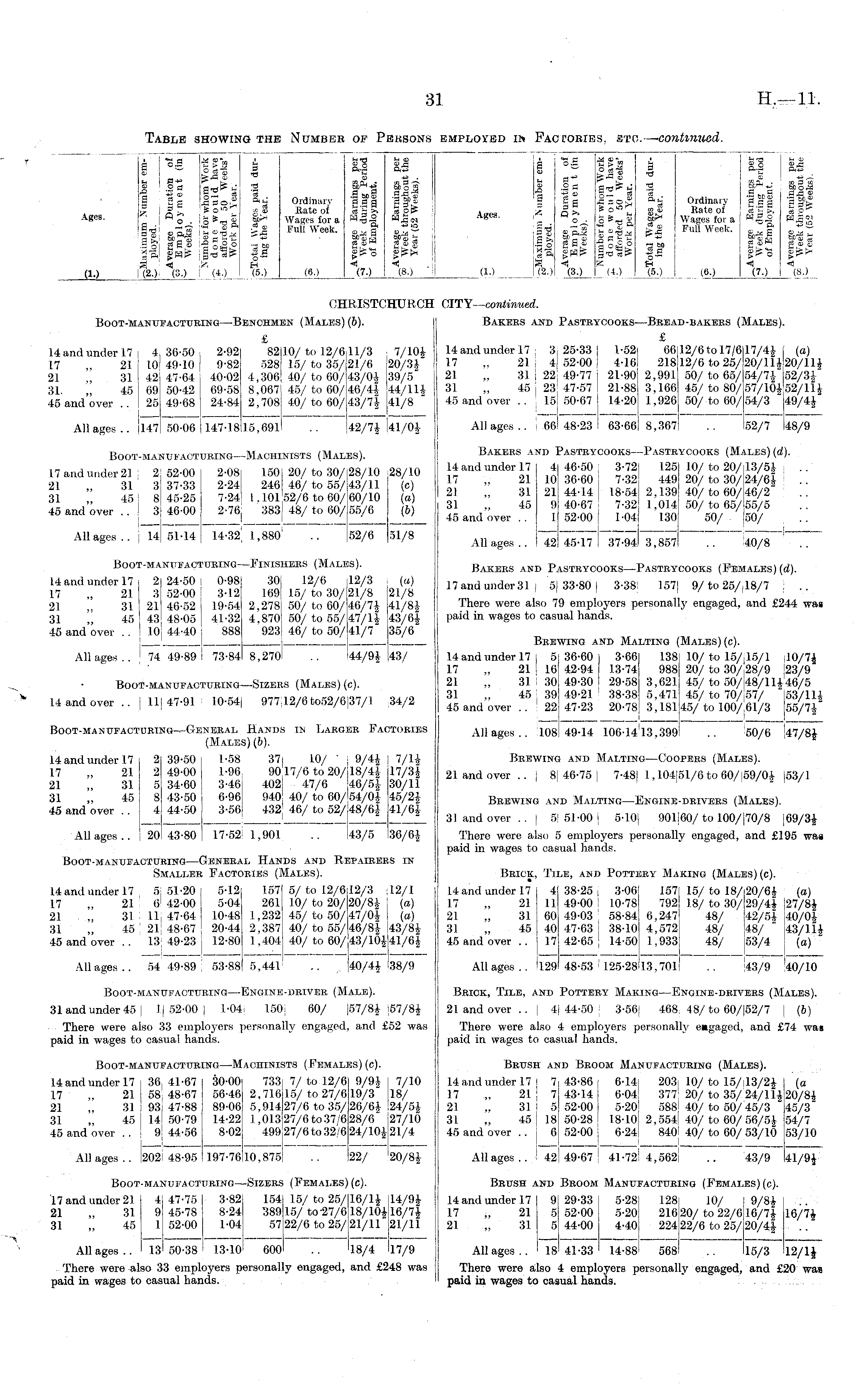 Ages. a o.9 -S $ a t, gHH 39-ag 1 |S §2^ * I A ~ HH fe £ il ™b% ISIvS 5 ft 1 gHt* g-0 cstf £ Hj ,h-h (2.) (3.) : (4.) 0 •a ■0 'a ftt! a a" fi 03 39St r! tit £ a o — H (50 Ordinary Hate of Wages for a Full Week. Is 00 tM-^HH .g»g g.g § O-H, 3.3 ° "0Q, © >H g a "3 8>-3 Hj (7.) -H Oi 9 j3 c 5> Hi (8.) "i *s Hi I *S [as | .2 0 BTS»tS S3 Sgi, S gg _g~ = £ a £ Ordinary 'Sgg ifjS — I"!" CO Til C -H.iZrH S_i -> "S A *®' * «?- s£& |* W«a a|| 1% St ift I sl* FullWeek - §*| |is •So gS« aSiS.o 3» g«> w go>o gU gr-r- |«?L4 |.9 gr-'S «r=>K 4 ir, H h) h) (10 (20 (3.) (4.) (5.) (0.) (7.) (8.) (1.) (6.) :*•: CHRISTCHURCI [TORCH CITY— continued. Boot-manufacturing—Benchmen (Males) (6). £ HandunderH 4 36-50 2-92 8210/to 12/6,11/3 , 7/10$ 17 „ 21 ( 10! 49-10 i 9-82 528 15/ to 35/ 21/6 20/3$ 21 ,. 311 42 47-64 40-02 4,306 40/ to 60/43/0$ 39/5 31. „ 45 1 69 50-42 69-58 8,067 45/to 60/46/4$ 44/11$ 45 and over .. ! 25 49-68 24-84 2,708 40/ to 60/43/7$ 41/8 [ Allages.. [147 50-06 147-1815,691 .. ! 42/7$ 41/0$ 7/10$ 20/3$ 39/5 14/11$ 11/8 41/0$ Bakers and Pastrycooks—Bbead-bakbrs (Males). £ Hand under 17 3,25-33! 1-52: 66 12/6 to 17/6 17/4$ (a) 17 „ 21 4 52-00 I 4-16 1 21812/6 to 25/20/ll$20/ll$ 21 „ 31 ! 22 ! 49-77 [ 21-90 2,991 50/to 65/54/7$ 52/3$ 31 „ 45 1 23 47-57 21-88 3,166 45/to 80/57/10$52/11$ 45 and over .. 15 50-67 j 14-20 1,926 50/to 60/54/3 49/4$ Allages.. I 66 48-23 63-66 8,367 .. 52/7 48/9 Boot-manufacturing—Machinists (Males). 17 and under 21 2 52-00 2-08 1501 20/ to 30/(28/10 28/10 21 „ 31 I 3 37-33 2-24 246 46/ to 55/143/11 (c) 31 „ 45 8 45-25 7-24 1,10152/6 to 60/60/10 (a) 45 and over . . 3 46-00 2-76' 383[ 48/ to 60/(55/6 (6) Allages.. ; 14 51-14 1 ,880 ; .. 52/6 51/8 28/10 w (a) (6) 51/8 Bakers and Pastrycooks—Pastrycooks (Males) (d). 14 and under 17 4 46-50 3-72 125 10/ to 20/ 13/5$ 17 „ 21 10 36-60 [ 7-32 449 20/to 30/24/6$ .. 21 „ 31 21 44-14 18-54 2,139 40/to 60/46/2 31 „ 45 9 40-67 7-32 1,014 50/to 65/55/5 45 and over .. 1 52-00: 1-04 130 50/ (50/ Allages.. 42 45-17 1 37-94 3,857 .. 40/8 < .. Boot-manufacturing—Finishers (Males). HandunderH 2 24-50; 0-98 301 12/6 12/3 (a) 17 „ 21 3 52-00 ! 3-12 169: 15/ to 30/ 21/8 21/8 21 „ 31 21 46-52 1 19-54 2,278! 50/ to 60/ 46/7$ 41/8$ 31 „ 45 43 48-05 j 41-32 4,870! 50/to 55/47/1$ 43/6$ 45 and over .. 10 44-40 j 888 923| 46/ to 50/ 41/7 35/6 Allages.. ( 74 49-89! 73-84 8,270l .. 44/9$ 43/ (a) 21/8 41/8$ 43/6$ 2f;/R Bakers and Pastrycooks—Pastrycooks (Females) (d). 17 and under 31 ; 5] 33-80 j 3-38 157| 9/to 25/18/7 There were also 79 employers personally engaged, and £244 was paid in wages to casual hands. Boot-manufacturing—Sizers (Males) (c). Handover .. | 11)47-91 10-54) 977)12/6to52/6(37/l 34/2 35/6 43/ 34/2 TORIES Brewing and Malting (Males) (c). 14 and under 17; 5 36-60] 3-66 138 10/to 15/15/1 40/7$ 17 „ 21 I 16 42-94 I 13-74 988 20/ to 30/-28/9 (23/9 21 „ 31 30 49-30! 29-58 3,621 45/ to 50/;48/ll$46/5 31 „ 45 ( 39 49-21 38-38 5,471 45/ to 70/57/ 53/11$ 45 and over .. ! 22 47-23 20-78 3,181 45/ to 100/61/3 55/7$ Allages.. 108 49-14 106-14 ! 13,399 .. 50/6 47/8$ Boot-manufacturing—General Hands in Larger Factories (Males) (6). HandunderH 2 39-50 1-58 37j 10/ * [ 9/4$ 7/1$ 17 „ 21 2 49-00 1-96 9017/6 to 20/18/4$ 17/3$ 21 „ 31 5 34-60 3-46 402 47/6 46/5$ 30/11 31 „ 45 8 43-50 6-96 940! 40/to 60/54/0$ 45/2$ 45 and over .. 4 44-50 3-56 432! 46/ to 52/ 48/6$ 41/6$ All ages .. ; 20 43-80 17-52 1,901 .. 43/5 36/6$ 7/1$ 17/3$ 30/11 Brewing and Malting—Coopers (Males). 21 and over.. | 8| 46-75 7-48J 1,104(51/6 to 60/59/0$ (53/1 45/2$ 41 /fii Brewing and Malting—Engine-drivers (Males). 41/64 36/6$ S IN 31 and over .. | 5' 51-00 j 5-lOi 901(60/ to 100/(70/8 [69/3$ There were also 5 employers personally engaged, and £195 waa paid in wages to casual hands. Boot-manufacturing—General Hands and Repairers in Smaller Factories (Males). S IN 12/1 (a) (a) 43/8$ 11/6$ 38/9 Brick, Tile, and Pottery Making (Males) (c). 14 and under 17 4 38-25 j 3-06 157 15/ to 18/20/6$ (o) 17 „ 21 11 49-00 10-78 792 18/to 30/29/4$ 27/8$ 21 „ 31 60 49-03 58-84 6,247 48/ 42/5$ 40/0$ 31 „ 45 40 47-63 j 38-10 4,572 48/ 48/ 43/11$ 45 and over.. 17 42-65! 14-50 1,933 48/ 53/4 (a) Allages.. ! 129 48-53 125-2813,701 .. 43/9 40/10 HandunderH 51 51-20 | 5-12 1571 5/ to 12/612/3 12/1 17 „ 21 6 1 42-00 ( 5-04 2611 10/to 20/20/8$ (a) 21 „ 31 11 47-64 10-48 1,232 45/ to 50/47/0$ (a) 31 „ 45 ! 2lj 48-67 \ 20-44 2,387 40/ to 55/ 46/8$ 43/8$ 45 and over.. 13j 49-23 12-80 1,404! 40/ to 60/43/10$ 41/6$ Allages.. 54 49-89 53-88 5,441 .. 40/4$ 1.38/9 Boot-manufacturing—Engine-driver (Male). Brick, Tile, and Pottery Making—Engine-drivers (Males). 31 and under 45 I 1(52-00! 1-04) 150 60/ [57/8$ [57/8$ There were also 33 employers personally engaged, and £52 was paid in wages to casual hands. 57/8$ 52 was 21 and over.. | 4; 44-50 3-56] 468, 48/to 60/(52/7 ( (6) There were also 4 employers personally e»gaged, and £74 was paid in wages to casual hands. Boot-manufacturing—Machinists (Females) (c). HandunderH 36,41-67 30-00 733 7/to 12/6 9/9$ 7/10 17 „ 21 58' 48-67 56-46 2,71615/to 27/619/3 18/ 21 „ 31 93,47-88 89-06 5,914 27/6 to 35/26/6$ 24/5$ 31 „ 45 14! 50-79 14-22 1,01327/6to37/628/6 27/10 45 and over.. 9:44-56 8-02 499 27/6 to 32/6 24/10$ 21/4 Allages.. |202i 48-95 197-7610,875 .. 22/ 20/8$ 7/10 18/ 24/5$ 27/10 21/4 20/8$ Brush and Broom Manufacturing (Males). Hand under 17] 7 43-86; 6-1-4 203; 10/to 15/; 13/2$ (a 17 „ 21 [ 7 43-14 I 6-04! 377 20/to 35/24/11$ 20/8$ 21 „ 31:5 52-00 1 5-20! 588i 40/ to 50/ 45/3 45/3 31 „ 45 I 18 50-28: 18-10; 2.554 40/to 60/56/5$ 54/7 45 and over .. 6 52-00 ( 6-24! 8401 40/ to 60/ 53/10 53/10 Allages.. 42 49-67 41-721 4,562! .. 43/9 41/9$ Boot-manufacturing—Sizers (Females) (c). 17 and under 21 4 47-75 3-82 154 15/to 25/16/1$ 14/9$ 21 „ 31 9 45-78 8-24 38915/to-27/618/10$ 16/7$ 31 „ 45 1 52-00 1-04 57 22/6 to 25/21/11 21/11 All ages .