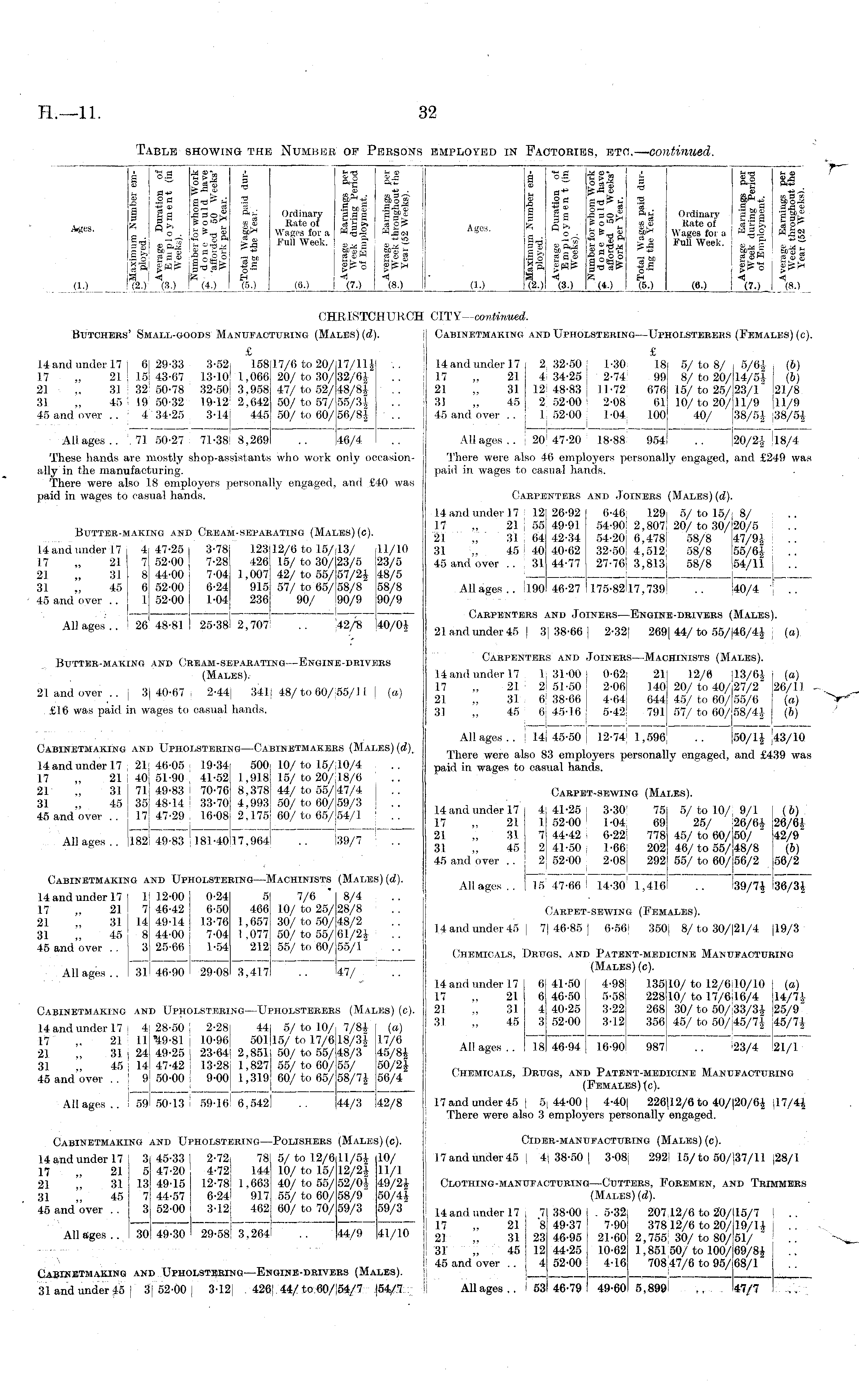 i *3 o * •-. i I fe-g I =3 S 0 — r, H.3S 0 , O.-0 30.91 90 P 5 OH -rt t-H r- \ Hhhtn OHH f- a S ' » * - £ 3a S | ft -g ] So J! f || SaoS ft »■ Ordinary if| |f| ,, I !> '° S S Kate of S'g R 3o=* Ages. * fio. %>■ Wages for a «,§,£ H >£ Full Week. ,2 s '•j-Sl gHr- j|«§r= |.9 gr-O f^U 3 1 4 £ H 4 4 (10 (20 (30 I (4.) (50 (6.) ! (70 (8.) ■ag'fs $£$ £ O— cj S3 BOt^i is £ —. so »i P aSa ■ ■-. SAihSos 0£*hS 00 eS9I (4.) 0 -d &■_■ &£ * 9 ~r- £ .s o — £H (5.) Ordinary Kate of Wages fov a Full Week. t-STS I - 33 9,3 0,5 ® \ hs ' ftp* <i as« e.99 s-fs ■ a '9 >, a 9> H.g.2 »|m III I"i OS Oi HH « CJ S < -4 (7.) (8.) I Ages. (!■) 9 "-S co r-t Cl"*" y, a >. 9 ■ £~ S -zi _. . tgg a Sip .So S 9 fi a'S. SHr* a 4 (ii.) (3.) OS ©"-, S et% is 1 * si S^st't IS** §S3 <$> ft (4.) I -5 '« ftrl •fi " Zi "r3 to 2 p H < 5 -> f- Ti £| 9 0 0 Ordinary '9 - p Rate of io tS ZS. Wages for a -33 Full Week. ; s „ E* agS (80 I "V) -H 9 VSS ft+3 $,■*'% Sst r •■z, tt - S g£ c3 9 pa ;; ua ~S « ?S 9 to (80 («o OHRIKTCHUKO'l CI r l' V— continued. Butchers' Small-goods Manufacturing (Males) (d). Cabin etmaking and Upholstering—Upholsterers (Females) (c). £ 14 and under 17 j 61 29-33 3-52, 158 17/6 to 20/17/11$ .. 17 „ 21 15 43-67 13-10 1,066 20/ to 30/32/6$ 21 ■- „ 31 32 50-78 32-50 3,958 47/to 52/48/8$ 31 .. 45 1 19 50-32 19-12 2.642 50/to 57/55/3$ 45 and over.. 4 34-25 3-14 445 50/to 60/56/8$ Allages.. .71 50-27 71-3818,269 .. 46/4 These hands are mostly shop-assistants who work only occasionally in the manufacturing. There were also 18 employers personally engaged, and £40 was paid in wages to casual hands. £ HandunderH 2 32-50, 1-30 18 5/to 8/ 5/6$ i (6) 17 „ 21 4134-25! 2-74 99 8/to 20/14/5$ (6) 21 „ 31 12! 48-83 11-72 676 15/to 25/23/1" 21/8 31 „ 45 2/52-00 2-08 61 10/ to 20/11/9 11/9 45 and over .. 1, 52-00 1-04 100J 40/ 38/5$ 38/5$ Allages.. j 20] 47-20 18-88 954! .. 20/2 J 18/4 There were also 46 employers personally engaged, and £249 was paid in wages to casual hands. Butter-m:aking and Cream-separating (Males) (c). HandunderH 4 47-25 i 3-78 12312/6 to 15/13/ 11/10 17 „ 21 7 52-00 7-28 426 15/to 30/23/5 123/5 21 „ 31 8 44-00 7-04 1,007 42/to 55/57/2$ 48/5 31 „ 45 6 52-00 6-24 915 57/ to 65/ 58/8" 58/8 45 and over .. 1 52-00 1-04 236 90/ 90/9 90/9 Allages.. i 26 1 48-81 25-38 2,707 .. 42/8 40/0$ Carpenters and Joiners (Males) (d). HandunderH 12 26-92 6-46 129; 5/to 15/, 8/ 17 „ 21 ; 55 49-91 54-90 2,807 20/ to 30/ 20/5 21 „ 31 : 64 42-34 54-20; 6,478i 58/8 47/9$ 31 ., 45 40 40-62 32-50! 4,512 : 58/8 55/6$ .. 45 and over . . 3144-77 27-76(3,813! 58/8 ,54/11 Allages.. !l90 46-27 175-82117,7391 .. 40/4 | .. Carpenters and Joiners—Engine-drivers (Males). 21 and under 45 [ 31 38-66 | 2-32| 269| 44/to 55/(46/4$ (a). Butter-making and Cream-separating—Engine-drivers (Males). 21 and over.. [ 3(40-67, 2-44J 341; 48/ to 60/55/11 I (a) £16 was paid in wages to casual hands. Carpenters and Joiners—Machinists (Males). HandunderH 1,31-00 0-62 21 12/6 |13/6$ i (a) 17 „ 21 2 51-50 2-06 140 20/to 40/27/2 26/11 21 „ 31 6' 38-66 4-64 644 45/ to 60/ 55/6 ( (a) "V 31 „ 45 6 45-16 5-42 791 57/to 60/58/4$ (6) Allages.. 14 45-50! 12-74' 1,596] .. 50/1$ J43/10 There were also 83 employers personally engaged, and £439 was paid in wages to casual hands. Cabinetmaking and Upholstering—Cabinetmakers (Males)(rf). 14 and under 17 211 46-05 19-34 500, 10/to 15/10/4 17 „ 21 40)51-90 41-52 1,918 15/ to 20/18/6 21 „ 31 71 49-83 70-76 8,378 44/ to 55/47/4 : .. 31 „ 45 35! 48-14 33-70 4,993 50/to 60/59/3 j .. 45 and over.. 17 47-29 16-08 2,175 60/to 65/54/1 ( [ 1 1 Allages.. 4821 49-83 ] 181-40 17,9641 .. 39/7 Carpet-sewing (Males). HandunderH 4; 41-25 i 3-30 75 5/to 10/ 9/1 (6) 17 „ 21 ll 52-00 ! 1-04 69 25/ 26/6$ 26/6$ 21 ., 31 7,44-42 6-22: 778 45/to 60/,50/ " 42/9" 31 „ 45 j 2 41-50 , 1-66: 202 46/to 55/(48/8 (6) 45 and over ,. 2 52-00 . 2-08 292 55/ to 60/(56/2 56/2 Allages.. '' 15 47-66 14-30 1 1,416 .. 39/7$ 36/3$ Cabinetmaking and Upholstering—Machinists (Males) (d). HandunderH: 1 12-00 0-24 5 7/6 8/4 17 „ 21 I 7 46-42 6-50 466 10/ to 25/ 28/8 21 „ 31.1 14 49-14 13-76 1,657 30/ to 50/48/2 31 „ 45 8 44-00 7-04 1,077 50/to 55/61/2$ 45 and over .. 3 25-66 1-54 212 55/to 60/55/1 Allages.. 31 46-90 29-08 3,417 .. 47/ Carpet-sewing (Females). 14 and under 45 | 7] 46-85 | 6-561 350] 8/ to 30/21/4 (19/3 Chemicals, Drugs, and Patent-medicine Manufacturing (Males) (c). Cabinetmaking and Upholstering—Upholsterers (Males) (c). HandunderH, 4 28-50 2-281 44 5/to 10/ 7/8$ (a) 17 „ 21 11 "49-81 ; 10-96 501 15/to 17/618/3$ 17/6 21 „ 31. | 24 49-25 23-64] 2,851 50/to 55/48/3 45/8$ 31 „ 45 14 47-42 13-28 1,827 55/to 60/55/ 50/2$ 45 and over .. 9(50-00 9-00 1,319 60/to 65/58/7$ 56/4 Allages.. 59' 50-13 59-16 1 6,542! .. 44/3 42/8 14 and under 17 6 41-50 4-98 135 10/to 12/6110/10 [ (a) 17 „ 21 6 46-50 5-58 22810/to 17/6:16/4 14/7$ 21 ., 31 4 40-25 3-22 268 30/ to 50/33/3$ 25/9 31 „ 45 3 52-00 3-12 356 45/ to 50/45/7$ 45/7$ Allages.. 18 46-94 16-90 987 .. '23/4 121/1 Chemicals, Drugs, and Patent-medicine Manufacturing (Females) (c). 17 and under 45 ; 5 44-00] 4-40) 226(12/6 to 40/20/6$ |17/4$ There were also 3 employers personally engaged. Cabinetmaking and Upholstering—Polishers (Males) (c). HandunderH; 3 45-33 2-72 78 5/to 12/611/5$ 10/ 17 „ 21 5 47-20 4-72 144 10/ to 15/12/2$ 11/1 21 , 31 13 49-15 12-78: 1,663 40/to 55/52/0$ 49/2$ 31 „ 45 7 44-57 6-24' 917 55/ to 60/ 58/9 50/4$ 45 and over.. 3 52-00 3-12 462 60/to 70/59/3 59/3 Allages.. 30 49-30 29-58! 3,264 1 .. 44/9 41/10 Cider-manufacturing (Males) (c). 17 and under 45 ] 4; 38-50 | 3-08; 292] 15/to 50/37/11 (28/1 Clothing-manufacturing—Cutters, Foremen, and Trimmers (Males) (d). HandunderH 7 38-00 .5-32 207 12/6 to 20/15/7 : .. 17 „ 21 8 49-37 7-90 37812/6 to 20/19/1$ j .. 21 „ 31 23 46-95 21-60 2,755! 30/to 80/51/ " 31 „ 45 12 44-25 10-62 1,851 50/to 100/