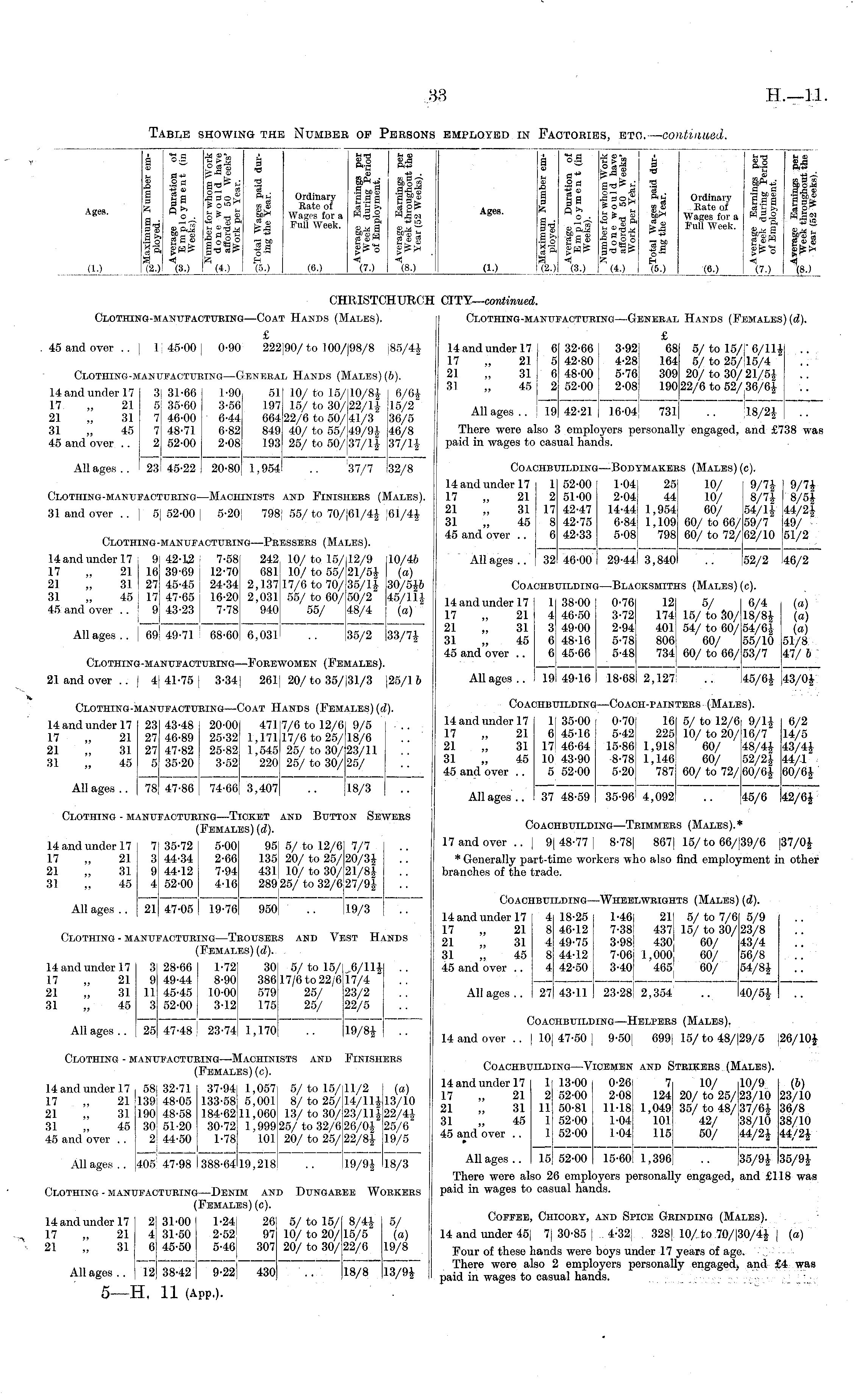 Ages. 03 .° fS 03 u £&9 a «S 11^8 § rjS -5 l gri Baa S-i s^t 0 o g, a,os S3 2 T2 -n |_9 I|| I Sgg go. SH? g-oaP a hj iz; (2.) (3.) (4.) 0 -0 ■0 'a fti-l a |£ *= 5 o "-* H (5.) Ordinary Bate of Wages for a Full Week. UtS a! 03 .S bog •29 9 a 9 >> r3s 0-3, SorS 9 ir-to (7.) M 03 %S1 tooB 3 too os o[S So'a cS <y ™ -h rT 03 <l (8.) Ages. 9 90 to OH St 9 0 ir, 1-3 3>, fft «-* +-* 03 Sri oi a JS g J" 03 9 CBS f-r 1 "A (3.) os o>m . BtS> tn S- -g -£- aoS it o" 5^ t- fe 0 -2*0 0. S3 Zo?* IPI Ej-0 est* ir, (4.) 3 TS -0 'a a,u a &£ OS to fe-fl hJ -2 to 3 (3 o ,rt H (5.) ft-2 chhS 9 _] r~ giB Ordinary |g| f§J Hate of a'C r-. a o Wages for a &%3 Sag Full Week. | *9 Jr!"I 4 (6.) (7.) tgj (1.) (6.) (10 CHRISTCHURCH CITY— continued. Clothing-manufacturing—Coat Hands (Males). Clothing -manufacturing—General Hands (Females) (d). £ 45 and over.. | 1(45-00] 0-90 222(90/ to 100/(98/8 [85/4$ Clothing-manufacturing—General Hands (Males) (b). 14 and under 17 3131-66 1-90 51 10/to 15/10/8$ | 6/6$ 17 „ 21 5135-60 3-56 197 15/ to 30/22/1$- 15/2 21 „ 31 7 46-00 6-44 664 22/6 to 50/41/3 136/5 31 „ 45 7 48-71 6-82 849 40/ to 55/ 49/9$ J46/8 45 and over .. 2 52-00 2-08 193 25/ to 50/ 37/1$ 37/1$ Allages.. 23 45-22 20-80 1,954 .. 37/7 :32/8 £ HandunderH 6 32-66 3-92 68 5/ to 15/" 6/11$ .. 17 „ 21 5 42-80 4-28 164 5/ to 25/15/4 21 „ 31 6 48-00 5-76 309 20/ to 30/ 21/5$ 31 „ 45 2 52-00 2-08 190 22/6 to 52/36/6$ All ages .. 19 42-21 16-04| 731 .. ! 18/2$ There were also 3 employers personally engaged, and £738 was paid in wages to casual hands. Clothing-manufacturing—Machinists and Finishers (Males). 31 and over . . | 5| 52-00 | 5-20( 798; 55/ to 70/(61/4$ [61/4$ Coachbuilding—Bodymakers (Males) (c). 14 and under 17 1 52-00 1-04 25 10/ 9/7$ 9/7$ 17 „ 21 2 51-00 2-04 44 10/ 8/7$ 8/5$ 21 „ 31 17 42-47 14-44 1,954 60/ 54/1$ 44/2$ 31 „ 45 8 42-75 6-84 1,109 60/to 66/59/7 49/ 45 and over .. 6 42-33 5-08 798 60/ to 72/ 62/10 51/2 Allages.. 32 46-00 29-44 3,840 .. 52/2 46/2 Clothing-manufacturing—Pressers (Males). 14 and under 17 9 42-12 7-58 242 10/to 15/12/9 10/46 17 „ 21 16 39-69 12-70 681 10/to 55/21/5$ (a) 21 „ 31 27 45-45 24-34 2,13717/6 to 70/35/1$ 30/5$6 31 „ 45 j 17 47-65 16-20 2,031 55/to 60/50/2 45/11$ 45 and over ..19 43-23 7-78 940 55/ 48/4 (a) ' Allages.. 69i 49-71 68-60 6,03l! .. 35/2 33/7$ Coachbuilding—Blacksmiths (Males) (c). 14 and under 17 1 38-00 0-76 12 5/ 6/4 (a) 17 „ 21 4 46-50 3-72 174 15/ to 30/18/8$ (a) 21 „ 31 3 49-00 2-94 401 54/ to 60/ 54/6$ (a) 31 „ 45 6 48-16 5-78 806 60/ 55/10 51/8 45 and over .. 6 45-66 5-48 734j 60/ to 66/ 53/7 47/ 5 Allages.. 19 49-16 18-68 2,127 ! .. 45/6$ 43/0$ Clothing-manufacturing—Forewomen (Females). 21 and over.. ( 4] 41-75 | 3-34[ 2611 20/ to 35/(31/3 (25/16 Clothing-manufacturing—Coat Hands (Females) (d). 14 and under 17 23 43-48 20-00 471 7/6 to 12/6 9/5 ... 17 „ 21 27 46-89 25-32 1,171 17/6 to 25/18/6 21 „ 31 27 47-82 25-82 1,545 25/to 30/23/11 31 „ 45 5 35-20 3-52 220 25/ to 30/ 25/ Allages.. 78 47-86 74-66 3,407 .. 18/3 Coachbuilding—Coach-painters (Males). HandunderH 1(35-00 0-70 16 5/to 12/6 9/1$ 6/2 17 „ 21 6 45-16 5-42 225 10/ to 20/16/7 14/5 21 „ 31 17! 46-64 15-86 1,918 60/ 48/4$ 43/4$ 31 „ 45 10 43-90 8-78 1,146 60/ 52/2$ 44/1 45 and over .. 5 52-00 5-20 787 60/ to 72/ 60/6$ 60/6$ Allages.. 37 48-59 35-96 4,092 .. 45/6 42/6$ Clothing - manufacturing—Ticket and Button Sewers (Females) (d). 14 and under 17 7 35-72 5-00 95 5/to 12/6 7/7 17 „ 21 3 44-34 2-66 135 20/to 25/20/3$ 21 „ 31 9 44-12 7-94 431 10/ to 30/21/8$ 31 „ 45 4 52-00 4-16 289 25/to 32/6 27/9$ Allages.. 21 47-05 19-76! 950 .. |l9/3 Coachbuilding—Trimmers (Males). * Handover..) 9| 48-77 | 8-78J 867| 15/to 66/(39/6 [37/0$ * Generally part-time workers who also find employment in other branches of the trade. Clothing - manufacturing—Trousers and Vest Hands (Females) (d). HandunderH 3 28-66 1-72 30 5/to 15/ 6/11$ .. 17 „ 21 9 49-44 8-90 38617/6 to 22/617/4 21 „ 31 11 45-45 10-00 579 25/ 23/2 31 „ 45 3 52-00 3-12 175 25/ 22/5 Allages.. 25 47-48,! 23-74 1,170 .. 19/8$ Coachbuilding—Wheelwrights (Males) (d). HandunderH 4 18-25 1-461 21] 5/to 7/6 5/9 17 „ 21 8 46-12 7-38: 437 15/ to 30/ 23/8 21 „ 31 4 49-75 3-98: 430 60/ 43/4 .. 31 „ 45 8 44-12 7-06] 1,000 60/ 56/8 45 and over .. 4 42-50 3-40 465J 60/ 54/8$ Allages.. 27 43-11 23-28! 2,354 .. 40/5$ COACHBUILDING —HELPERS (MALES). 14 and over .. | 10| 47-50 ] 9-50[ 699| 15/ to 48/(29/5 (26/10$ Clothing - manufacturing—Machinists and Finishers (Females) (c). 14 and under 17 , 58i 32-71 37-94 1,057 5/to 15/11/2 (a) 17 „ 21 439! 48-05 133-58 5,001 8/to 25/14/11$ 13/10 21 „ 31 190! 48-58 184-6211,060 13/ to 30/ 23/11$ 22/4$ 31 „ 45 30! 51-20 30-72 1,999 25/to 32/6 26/0$ 25/6 45 and over.. 244-50 1-78 101 20/to 25/22/8$ 19/5 iUlages.. 40547-98 388-6419,218 .. 19/9$ 18/3 Coachbuilding—Vicemen and Strikers (Males). HandunderH 1 13-00 0-26 7 10/ 10/9 (6) 17 „ 21 2 52-00 2-08 124 20/ to 25/ 23/10 23/10 21 „ 31 11 50-81 11-18 1,049 35/to 48/37/6$ 36/8 31 „ 45 1 52-00 1-04 101 42/ 38/10 38/10 45 and over .. 1 52-00 1-04 115 50/ 44/2$ 44/2$ Allages.. 15 52-00 15-60 1,396 .. 35/9$ 35/9$ There were also 26 employers personally engaged, and £118 was paid in wages to casual hands. Clothing - manufacturing—Denim and Dungaree Workers (Females) (c). Hand under 17 2 31-00 l-24[ 26 5/to 15/ 8/4$ 5/ 17 „ 21 4 31-50 2-52J 97 10/ to 20/15/5 (a) 21 „ 31 6 45-50 5-46 307 20/to 30/22/6 19/8 All ages . . 12 38-42 9-22J 430 . . 18/8 13/9$ Coffee, Chicory, and Spice Grinding (Males). 14 and under 45( 7[ 30-85 | . 4-32[ 328[ 10/ to 70/30/4$ | (a) Four of these hands were boys under 17 years of age. There were also 2 employers personally engaged, and £4 was paid in wages to casual hands. ...... .:.:,- .....!...