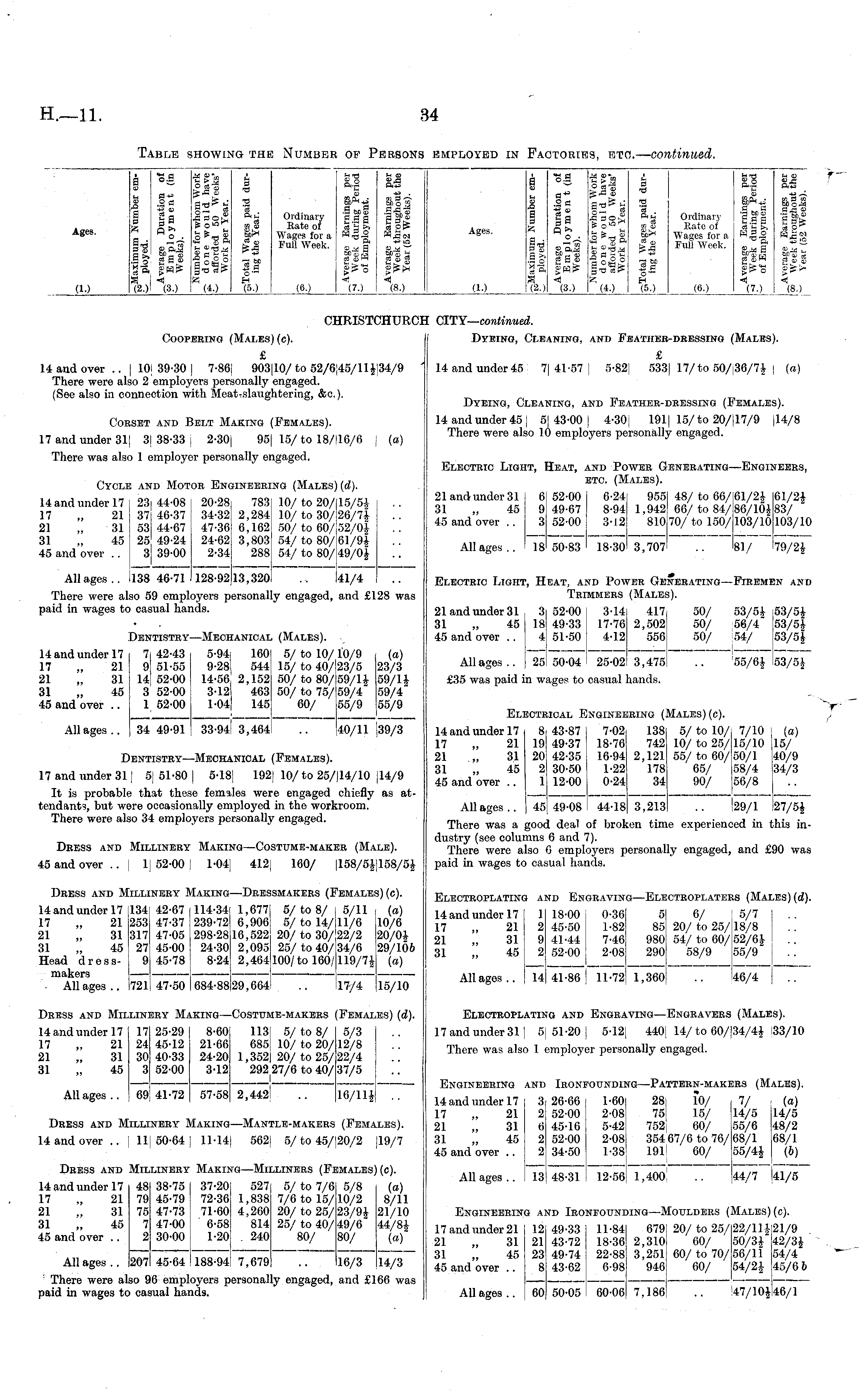 Ages. 9 =S a. I Sa rn Q rv a ■ .2-0-H M 0 o g,ft^ So g9S gft l«r= (2.) 1 (3.) •a ?■«> >S3 91 BTSH- tn n%9oS is o"=^ Ir tr IH s*St is ■o 5 o S3 0 0«3> g-oor (4.) i 0 0 "a Oh! co $ ooS bCH* a (j, (S-0 - HH a 9 Sao 9 o — Ordinary Bate of W*ages for a Full Week. £0 ftf 9mS e.sg ■"-■a if! I grt-S Hi (70 tn go 93 AOlt3 HH . HI 3 — so a a }Mo3 tS 3> a o!> 'AS™ HH IO 01 HJ — a oh a gr=!* (8.) a ~=9 «rs £ g'S %£ r " -HH >0"S " S3 HH^. | Ja s |,|| I sa IggiS *s °'' d j» a 7 1.1a iff II a*l isl* -M FullWeek - fraf sis H- S,H> S "r OS A- Hytrin 50 b. '-_ gOigfrrigflalS-g.g gtSo £ r 1 -" S ">f fc H Hj , H) (10 (2.) (3.) (4.) (5.) (6.) (7.) (8.) Ages. i M 9 0 r, i'g it? Sft s (2.) 0=9 0*' .2 0 O OniS gS.o H| (3.) ■Hgjj OH S-a** B 5- al S3 ®tsos ■° 5 8 o o 0 a rz (4.) 0 TS TS 'a ft ih Ordinary « o Rate of ■sMr* Wages for a S S Full Week. -* HH %■) (60 r|~i SdShJ a „« •a CHCOH 8.9 9 H9o ■° o. Ill 4 (7.) (10 (8.) (1.) CHRISTCHTJRC: CITY— continued. Coopering (Males) (c). Dyeing, Cleaning, and Feather-dressing (Males). £ 14 and over .. ( 10( 39-30 | 7-86] 903(10/ to 52/6j45/ll$[34/9 There were also 2 employers personally engaged. (See also in connection with Meat-slaughtering, &e.). £ 14 and under 45 7] 41-57 ) 5-82( 533] 17/ to 50/|36/7$ (re) Corset and Belt Making (Females). 17 and under 31 ( 3{ 38-33 ( 2-30J 95| 15/ to 18/116/6 | (a) Dyeing, Cleaning, and Feather-dressing (Females). 14 and under 45 | 51 43-00 | 4-30 191( 15/to 20/(17/9 (14/8 There were also 10 employers personally engaged. There was also 1 employer personally engaged. Cycle and Motor Engineering (Males) (d). HandunderH 23i 44-08 20-28 783 10/to 20/15/5$ 17 „ 21 37! 46-37 34-32 2,284 10/to 30/26/7$ 21 „ 31 53(44-67 47-36 6,162 50/to 60/52/0$ 31 „ 45 25 ! 49-24 24-62 3,803 54/to 80/61/9$ 45 and over .. 3 39-00 2-34 288 54/ to 80/ 49/0$ Allages.. 138 46-71 128-9213,320 ., 41/4 Electric Light, Heat, and Power Generating—Engineers, etc. (Males). 21andunder31 6 52-00 6-24; 955 48/to 66/61/2$ 61/2$ 31 „ 45 9 49-67 8-94 1,942 66/to 84/86/10$ 83/ 45 and over .. 3 52-00 3-12 810 70/to 150/103/10 103/10 Allages.. 18 50-83 18-30 3,707 .. 81/ 79/2$ Electric Light, Heat, and Power Generating—Firemen and Trimmers (Males). There were also 59 employers personally engaged, and £128 was paid in wages to casual hands. Dentistry—Mechanical (Males). HandunderH 7 42-43 5-94: 160 5/to 10/10/9 (a) 17 „ 21 9 51-55 9-28! 544 15/ to 40/ 23/5 23/3 21 „ 31 14 52-00 14-56! 2,152 50/to 80/59/1$ 59/1$ 31 „ 45 3 52-00 3-12 463 50/ to 75/ 59/4 59/4" 45 and over .. 1 52-00 1-04| 145 60/ 55/9 55/9 Allages.. 34 49-91 33-941 3,464 .. 40/11 1,39/3 21 and under 31 3 52-00 3-14i 417, 50/ 53/5$ 53/5$ 31 „ 45 18 49-33 17-76 2,502! 50/ 56/4 53/5$ 45 and over .. 4 51-50 4-12 556 50/ 54/ 53/5$ Allages.. 25 50-04 25-02 3,475 .. ! 55/6$ 53/5$ £35 was paid in wages to casual hands. Dentistry—Mechanical (Females). 17 and under 311 5J 51-80 | 5-18J 192j 10/ to 25/|14/10 |14/9 It is probable that these females were engaged chiefly as attendants, but were occasionally employed in the workroom. There were also 34 employers personally engaged. Electrical Engineering (Males) (c). HandunderH 8 43-87 7-02 138 5/to 10/: 7/10 i (a) 17 „ 21 19 49-37 18-76 742 10/ to 25/15/10 15/ 21 „ 31 20 42-35 16-94 2,121 55/to 60/50/1 40/9 31 „ 45 2 30-50 1-22 178 65/ 58/4 34/3 45 and over .. 1 12-00 0-24 34 90/ 56/8 Allages.. 45 49-08 44-18 3,213 .. |29/1 27/5$ There was a good deal of broken time experienced in this industry (see columns 6 and 7). There were also 6 employers personally engaged, and £90 was paid in wages to casual hands. Dress and Millinery Making—Costume-maker (Male). 45 and over .. | 1| 52-00 J 1-04| 412| 160/ (158/5$|158/5$ Dress and Millinery Making—Dressmakers (Females) (c). HandunderH 134 42-67 114-34 1,677 5/to 8/ 5/11 (a) 17 „ 21 253 47-37 239-72 6,906 5/to 14/11/6 10/6 21 „ 31 317 47-05 298-2816,522 20/to 30/22/2 20/0$ 31 „ 45 27 45-00 24-30 2,095 25/to 40/34/6 29/106 Head dress- 9 45-78 8-24 2,464 100/to 160/119/7$ (a) • Allages.. 721 47-50 684-8829,664 .. 17/4 15/10 [ILLI 134 253 317 27 9 Electroplating and Engraving—Electroplaters (Males) (ti). HandunderH 1 18-00 0-36 5 6/ 5/7 17 „ 21 2 45-50 1-82 85 20/ to 25/18/8 21 „ 31 9 41-44 7-46 980 54/ to 60/ 52/6$ 31 „ 45 2 52-00 2-08 290 58/9 55/9 Allages.. 14 41-86! H-72 1,360 .. 46/4 721 Dress and Millinery Making—Costume-makers (Females) (d). .LIN] Electroplating and Engraving—Engravers (Males). 17 and under 311 5| 51-20 ( 5-12| 440[ 14/to 60/|34/4$ 133/10 HandunderH 17 25-29 8-60 1131 5/to 8/ 5/3 17 „ 21 24 45-12 21-66 685! 10/ to 20/12/8 21 „ 31 30 40-33 24-20 1,352[ 20/to 25/22/4 31 „ 45 3 52-00 3-12 292 27/6 to 40/ 37/5 Allages.. 69 41-72 57-58 2,442! .. 16/11$ .. 17 24 30 3 There was also 1 employer personally engaged. Dress and Millinery Making—Mantle-makers (Females). Handover.. 11| 50-64 [ 11-14! 562[ 5/ to 45/(20/2 (19/7 69 [ILLL .LES). (19/7 Engineering and Ironfounding—Pattern-makers (Males). HandunderH 3 26-66 1-60 28, 10/ 7/ (a) 17 „ 21 2 52-00 2-08 75! 15/ 14/5 14/5 21 „ 31 6 45-16 5-42 752 60/ 55/6 48/2 31 „ 45 2 52-00 2-08 354 67/6 to 76/68/1 68/1 45 and over .. 2 34-50 1-38 191' 60/ 55/4$ (6) Allages.. 13 48-31 12-56 l,40o! .. 44/7 41/5 11| Dress and Millinery Making—Milliners (Females) (c). HandunderH 48 38-75 37-20 527 5/to 7/6 5/8 (re) 17 „ 21 79 45-79 72-36 1,838 7/6 to 15/10/2 8/11 21 „ 31 75 47-73 71-60 4,260 20/to 25/23/9$ 21/10 31 „ 45 7 47-00 6-58 814 25/ to 40/ 49/6 44/8$ 45 and over .. 2 30-00 1-20 . 240 80/ 80/ (re) Allages.. 207 45-64 188-94 7,679 .. 16/3 14/3 Mm >(-)• 48 79 75 7 2 (a) 8/11 21/10 44/8$ (a) Engineering and Ironfounding—Moulders (Males) (c). 17andunder21 12 49-33 11-84 679 20/to 25/22/11$21/9 . 21 „ 31 21 43-72 18-36 2,310 60/ 50/3$ 42/3$ 31 „ 45 23 49-74 22-88 3,251 60/to 70/56/11 54/4 45 and over .. 8 43-62 6-98 946 60/ 54/2$ 45/6 6 Allages.. 60 50-