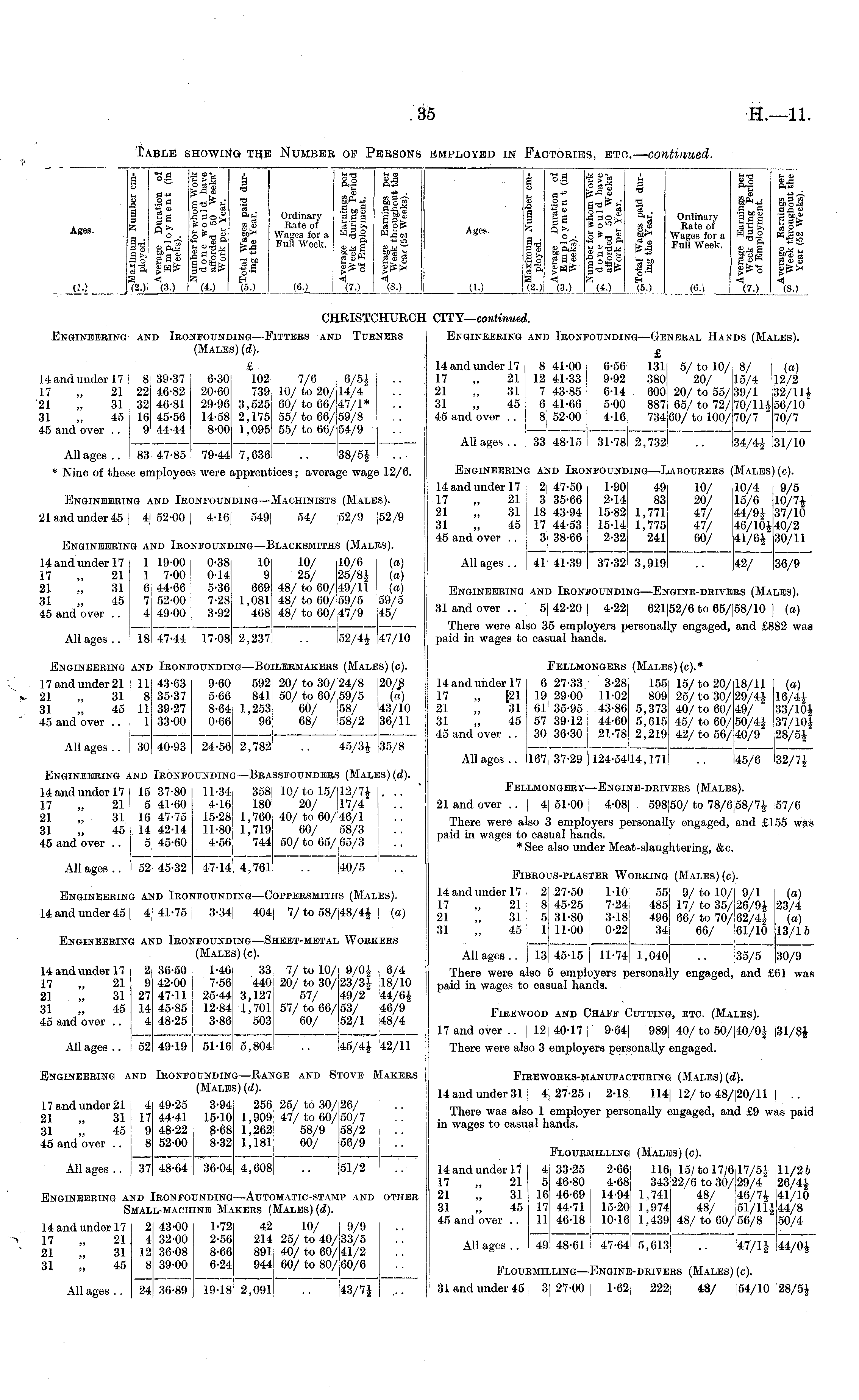 Ages. Oj 1 I 9 0 ir, I'd S o °=E §0 0 £ g a so Hi (3.) ■a $"* o ai§ =5-0 so 9-0 "* £ o- g ss aoS is o^** t- so-o OH S3 AA HH 13 * 2 o o r5 GO 3 -0 -0 "a 01 u a Sir* a ., te-0 - HH £ a o — (50 Ordinary Hate of Wages for a Full Week. t- -rt ftl 03 .9 M g g.9 9 a 0 >> ■ss33 '0-3, 8,-* 9 gr£o 4 (7.) 03 tool* .a-al. 6 too W-flOl hh. m S3 ■a'— CMS} i S£$ (8.) Ages. i u 93 SS a 0 r-H It ( 2 -) o9 o* .2 0 89 n ►> ° hO. g 9 s H| #g" a 12*1 fo§* s*-at 03 * ir, (40 H C-.r-' 03 ££ "* to EH Ordinary Kate of Wages for a Full Week. H ap^ 0 r„0 '9 tC 0H C.9 9 fi 0 - 1 &3° 111 gP-'S <l (7.) tn 90 90 aa 01+3 ass co ■9 ~cS ° Bit 19 8 l«s gO 90 gr=r4 (8.) a-) (8.) (10 (60 CHRISTCHURCH CITY— continued. Engineering and Ironfounding—Fitters and Turners (Males) (d). £ HandunderH! 8 39-37 6-30 102; 7/6 6/5$ 17 „ 21 22 46-82 20-60 739! 10/ to 20/114/4 21 „ 31 32 46-81 29-96 3,525 60/to 66/47/1* 31 „ 45 16 45-56 14-58 2,175 55/to 66/59/8 45 and over .. 9 44-44 8-00 1,095 55/to 66/54/9 . 1 Allages.. 83 47-85 79-44 7,636 .. 38/5$ Engineering and Ironfounding—General Hands (Males). £ 14 and under 17 i 8 41-00 6-56j 131 5/to 10/ 8/ (re) 17 „ 21 | 12 41-33 ! 9-92 380 20/ 15/4 12/2 21 „ 31 7 43-85 6-h! 600 20/to 55/39/1 32/1H 31 „ 45 : 6 41-66! 5-00! 887 65/to 72/70/11$ 56/10 45 and over .. j 8( 52-00 ( 4-16: 734 60/ to 100/ 70/7 70/7 Allages.. 33 : 48-15 i 31-78! 2,732 .. 34/4$ 31/10 * Nine of these employees were apprentices; average wage 12/6. Engineering and Ironfoundino —Machinists (Males). 21 and under 45 I 4) 52-00 4-16( 549( 54/ [52/9 [52/9 Engineering and Ironfounding—Labourers (Males) (c). 14 and under 17- 2:47-50 1-90 49 10/ 10/4 9/5 17 „ 21 3[ 35-66 2-14 83 20/ 15/6 10/7$ 21 „ 31 ( 18 43-94 15-82 1,771 47/ 44/9$ 37/10 31 „ 45 ! 17 44-53 15-14 1,775 47/ 46/10$40/2 45 and over .. 3 38-66 2-32 241 60/ 41/6$ 30/11 Allages.. j 4l! 41-39 37-32 3,919 .. 42/ 36/9 Engineering and Ironfounding—Blacksmiths (Males). HandunderH 1 19-00 0-38 10 10/ 10/6 (re) 17 „ 21 1 7-00 0-14 9 25/ 25/8$ (re) 21 „ 31 6 44-66 5-36 669 48/to 60/49/11 (re) 31 „ 45 7 52-00 7-28 1,081 48/to 60/59/5 59/5 45 and over .. 4 49-00 3-92 468 48/ to 60/ 47/9 45/ Allages.. ! 18 47-44 17-08 2,237 .. 52/4$ 47/10 Engineering and Ironfounding—Engine-drivers (Males). 31 and over .. | 5| 42-20 | 4-22[ 621(52/6 to 65/|58/10 | (re) There were also 35 employers personally engaged, and £882 was paid in wages to casual hands. Engineering and Ironfounding—Boilermakers (Males) (c). 17 and under 21 I 11 43-63 9-60: 592[ 20/to 30/24/8 20/8 21 „ 31 ! 8 35-37 5-66; 841 50/ to 60/59/5 (re) 31 „ 45 I 11 39-27 8-64; 1,253 60/ 58/ 43/10 45 and over .. [ 1 33-00 0-66 96; 68/ 58/2 36/11 Allages.. 30 40-93 24-56; 2,782 .. 45/3$ 35/8 Fellmongers (Males) (c).* HandunderH 6 27-33 3-28 155 15/to 20/18/11 (a) 17 „ [21 19 29-00 11-02 809 25/to 30/29/4$ 16/4* 21 „ 31 61 ! 35-95 43-86 5,373 40/to 60/49/ 33/10$ 31 „ 45 57 39-12 44-60 5,615 45/to 60/50/4$ 37/101 45 and over .. 30 36-30; 21-78 2,219 42/to 56/40/9 28/5$" Allages.. 167, 37-29 |l24-54!l4,171 .. 45/6 32/7$ Engineering and Ironfounding—Brassfounders (Males) (ci!). HandunderH I 15 37-80 11-34, 358! 10/to 15/12/7$ . .. 17 „ 21 5 41-60 4-16 180 20/ 17/4 21 „ 31 16 47-75 15-28 1,760 40/ to 60/ 46/1 31 „ 45 14 42-14 11-80 1,719 60/ 58/3 45 and over .. 5. 45-60 4-56 i 744 50/ to 65/ 65/3 Allages.. 152 45-32 47-14; 4,761 .. 40/5 Fellmongery—Engine-drivers (Males). 21 and over .. | 4| 51-00 j 4-08] 598(50/ to 78/6(58/7$ [57/6 There were also 3 employers personally engaged, and £155 was paid in wages to casual hands. * See also under Meat-slaughtering, &c. Engineering and Ironfounding—Coppersmiths (Males). 14 and under 45 I 4)41-75) 3-34( 404| 7/ to 58/48/4$ [ (a) Engineering and Ironfounding—Sheet-metal Workers (Males) (c). Fibrous-plaster Working (Males) (c). 14 and under 17 2[ 27-50 l-10j 55[ 9/to 10/ 9/1 (re) 17 „ 21 8 45-25 ; 7-24 485 17/ to 35/ 26/9$ 23/4 21 „ 31 5 31-80, 3-18 496 66/to 70/62/4$ (re) 31 „ 45 1 11-00! 0-22 34! 66/ 61/10 13/16 i , ! , , , Allages.. 13 45-15 j 11-74 1,040: .. 35/5 30/9 There were also 5 employers personally engaged, and £61 was paid in wages to casual hands. HandunderH 2 36-50 1-46 33. 7/to 10/ 9/0$ , 6/4 17 „ 21 9 42-00 7-56 440, 20/ to 30/ 23/3$ 18/10 21 „ 31 27 47-11 : 25-44 3,127 57/ 49/2 44/6$ 31 „ 45 14 45-85' 12-84 1,701 57/to 66/53/ 46/9 45 and over .. 4 48-25 | 3-86 503 60/ 52/1 48/4 Allages.. 52 49-19! 51.16 5,804 .. 45/4$ 42/11 2 9 27 14 4 Firewood and Chaff Cutting, etc. (Males). 17 and over .. | 12 40-17 ( 9-64( 989] 40/ to 50/|40/0$ j31/8$ There were also 3 employers personally engaged. Engineering and Ironfounding—Range and Stove Makers (Males) (d). 17 and under 21 4 49-25 3-94[ 256 25/to 30/26/ [ .. 21 „ 31 [ 17 44-41 ( 15-10 1,909 ; 47/ to 60/50/7 31 „ 45 9 48-22! 8-68 1,262 58/9 58/2 45 and over .. 8 52-00 8-32 1,181 60/ 56/9 Allages.. 37 48-64 36-04 4,608! .. 51/2 Fireworks-manufacturing (Males) (d). 14 and under 311 4(27-25: 2-18; 114j 12/ to 48/(20/11 j .. There was also 1 employer personally engaged, and £9 was paid in wages to casual hands. Engineering and Ironfounding—Automatic-stamp and other Small-machine Makers (Males) (d). 14 and under 17 2 43-00 1-72 42 10/ [9/9 17 „ 21 4 32-00 2-56 214 25/ to 40/33/5 21 „ 31 12 36-08 8-66 891 40/ to 60/41/2 31 „ 45 8 39-00 6-24 944 60/ to 80/60/6 Allages.. 24 36-89 19-18 2,091 .. J43/7$ ... D IA1 Flourmilling (Males) (c). Hand under 17 4 33-25, 2-66, 116, 15/to 17/6,17/5$ 11/2 6 17 „ 21 5 46-80 ; 4-68 34322/6 to 30/!29/4" 26/4$ 21 „ 31 16 46-69 ( 14-94) l,74l! 48/ 46/7$ 41/10 31 „ 45 17 44-71 15-20 1,974! 48/ ,51/11$ 44/8 45 and over.. 11 46-18 I 10-16 1,439 48/to 60/56/8 50/4 Allages.. 49 48-61 ! 47-641 5,613J .. 47/1$ 44/0$ Flourmilling—Engine-drivers (Males) (c). 31 and under 45 3| 27-00 ] 1-62; 222; 48/ [54/10 |28/5$