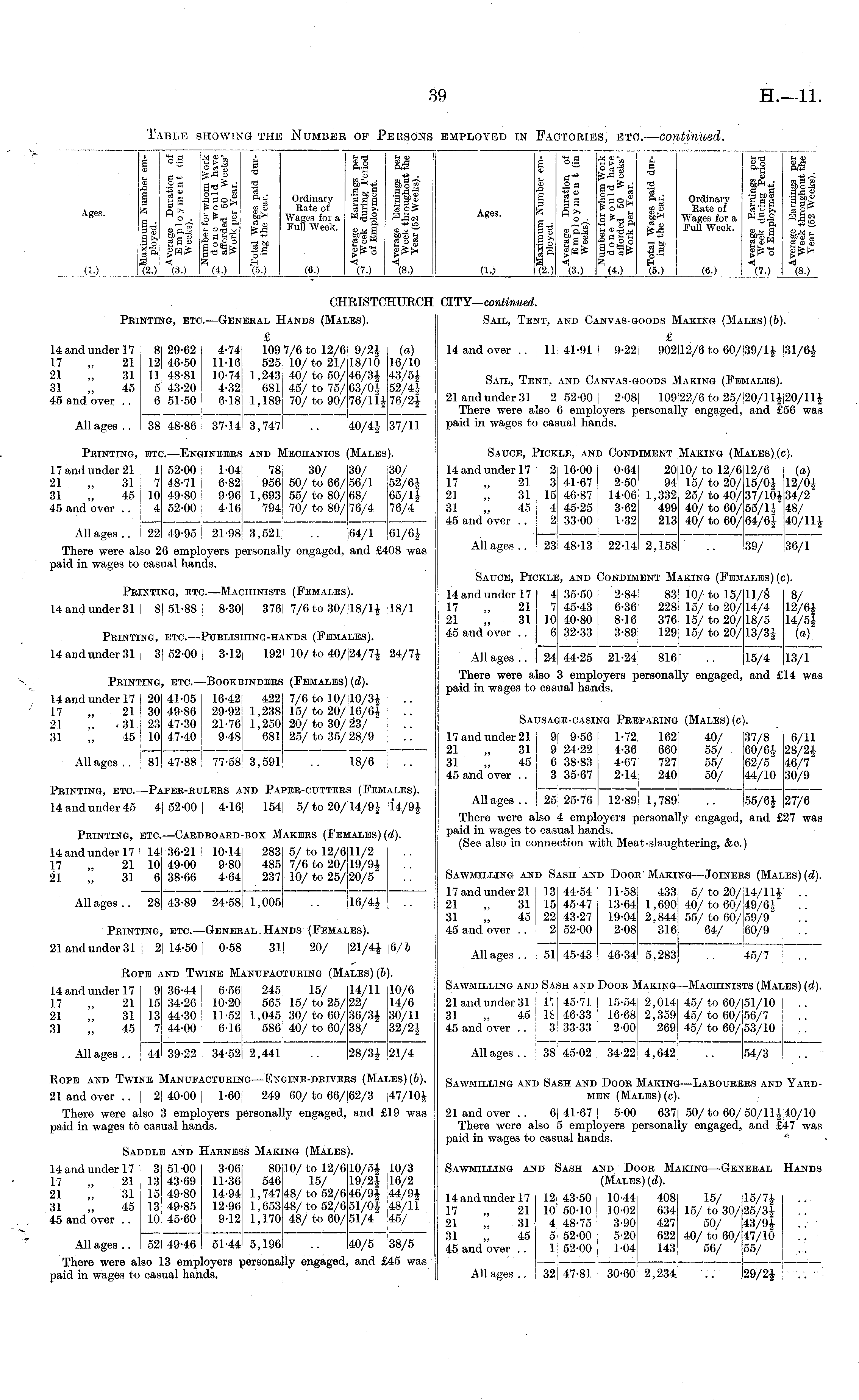 Ages. <1.) _ f_, fl •+-* Oi O cj ■S ■+» 9 § Sa a b too te o"? 9« -HH aS o p,3 ■S3 * e - « ft' gHP S, ( H| (2Q ! (3.) ■ars p oi-_ 9*0* £ SS AOkL 3*%t ■° 5 o o %*%* te (4.) 3 •d A-J OS &y & tO ferfi ■SS to £ fl o ,pH %■) Ordinary Kate of Wages for a Full Week. ft.2 M-<HH ScmS S3 B eo'b >> B3 O ft &* 9 |r='S Hi (7.) 00 HH ftS lint S a£ OS C> lO h eg$ 4 (8.) Ages. a 9 u o S3 s fl ft 3 9 j& ■ss 0" .2 a 9 0 a* B o . SftS' ft M (-z gHr" 4 (3.) ffSto a.TSH9 AA is ~pn£. a °<9t£ §■0 carte fl ftr-' r? 03 SS to *B Ordinary Kate of Wages for a Full Week. ft f-3 ts 9 •~S &0 03 B.9 8 OS _ >3 «=Jr| HI ft -T ». (7.) . r-l 03 03 £3 rsn fl "m flrCj 03 a 9^ *Ss 111 gr*^ (8.) (8.) (1.) (80 (4.) CHRISTCHTJRCI CITY— continued. Printing, etc. —General Hands (Males). Sail, Tent, and Canvas-goods Making (Males) (b). £ HandunderH 8(29-62 4-74 109 7/6 to 12/6 9/2* (a) 17 ,. 21 12! 46-50 11-16 525 10/ to 21/18/10 16/10 21 „ 31 ll! 48-81 10-74 1,243 40/ to 50/46/3$ 43/5$ 31 „ 45 5 43-20 4-32 681 45/ to 75/ 63/0* 52/4$ 45 and over .. 6 ; 51-50 ; 6-18; 1,189 70/ to 90/ 76/11$ 76/2$ Allages.. 38 1 48-86 i 37-1413,747 .. 40/4$ 37/11 £ 14 and over ..! 11: 41-91 ! 9-22; 902112/6 to 60/39/1$ 131/6$ Sail, Tent, and Canvas-goods Making (Females). 21 and under 31 2| 52-00 [ 2-08J 109(22/6 to 25/(20/ll$|20/ll$ There were also 6 employers personally engaged, and £56 was paid in wages to casual hands. Printing, etc.—Engineers and Mechanics (Males). 17 and under 21 | 1 52-00 1-04 78 30/ 30/ [30/ 21 „ 31 7 48-71 6-82 956 50/to 66/56/1 52/6$ 31 „ 45; 10 49-80 9-96 1,693 55/to 80/68/ 65/1$ 45 and over .. 4 52-00 4-16 794 70/ to 80/ 76/4 76/4 Allages.. 22 49-95 j 21-98 3,521 .. 64/1 61/6$ Sauce, Pickle, and Condiment Making (Males) (c). 14 and under 17 2 16-00 [ 0-64 20 10/to 12/6 12/6 (a) 17 „ 21 3 41-67 ' 2-50 94 15/ to 20/15/0* 1.2/0* 21 „ 31 15 46-87! 14-06 1,332 25/ to 40/ 37/10$ 34/2" 31 „ 45 : 4! 45-25 3-62 499 40/ to 60/ 55/1* 48/ 45 and over .. ' 2(33-00 1-32 213 40/to 60/64/6$ 40/11$ Allages.. | 23] 48-13 ! 22-14 2,158 .. 39/ 36/1 There were also 26 employers personally engaged, and £408 was paid in wages to casual hands. Printing, etc.—Machinists (Females). 14andunder31 8(51-88 8-30| 376! 7/6to 30/|I8/l$ '18/1 Printing, etc. —Publishing-hands (Females). Sauce, Pickle, and Condiment Making (Females) (c). HandunderH 4 35-50 2-84 83 10/to 15/11/8 8/ 17 „ 21 7 45-43 ; 6-36 228 15/ to 20/14/4 12/6* 21 „ 31 10 40-80 ! 8-16 376 15/ to 20/18/5 14/5$ 45 and over .. 6 32-33 3-89 129 15/to 20/13/3$ (a) Allages.. 24 44-25 21-24 816' .. 15/4 13/1 There were also 3 employers personally engaged, and £14 was paid in wages to casual hands. 14 and under 31 | 3(52-00) 3-12( 192[ 10/ to 40/24/7$ |24/7$ Printing, etc. —Bookbinders (Females) (d). HandunderH ! 20 41-05 16-42 422 7/6 to 10/10/3$ : .. 17 „ 21 : 30 49-86 29-92 1,238 15/ to 20/ 16/6$ .. 21 ,. -31:23 47-30 21-76 1,250 20/to 30/23/ 31 „ 45:10 47-40 9-48 681 25/to 35/28/9 : .. Allages.. 81 47-88' 77-58 ! 3,591 .. 18/6 | .. Sausage-casing Preparing (Males) (c). Printing, etc.—Paper-rulers and Paper-cutters (Females). 14 and under 45 I 4) 52-00 | 4-16| 154-1 5/ to 20/14/9$ (14/9$ 17 and under 21 ! 9 9-56 1-72 162[ 40/ 37/8 6/11 21 „ 31 j 9 24-22 4-36 660 55/ 60/6$ 28/2$ 31 „ 45 ( 6 38-83 4-67 727: 55/ 62/5 46/7 45 and over .. [ 3 35-67 2-14 240! 50/ 44/10 30/9 Allages.. ! 25 25-76 12-89; 1,789! .. 55/6$ 27/6 There were also 4 employers personally engaged, and £27 was paid in wages to casual hands. (See also in connection with Meat-slaughtering, &c.) Printing, etc.—Cardboard-box Makers (Females) (d). HandunderH 14 36-21 10-14 283 5/to 12/6(11/2 17 „ 21 10 49-00 9-80 485 7/6 to 20/49/9$ 21 „ 31 6 38-66 , 4-64 237 10/ to 25/;20/5 Allages.. 28 43-89! 24-58 1,005 .. :16/4$ Sawmilling and Sash and Door'Making—Joiners (Males) (d). 17 and under 21 13 44-54 11-58 433 5/to 20/14/11$ .. 21 „ 31 15 45-47 13-64 1,690 40/to 60/49/6* 31 „ 45 22 43-27 19-04 2,844 55/to 60/59/9" 45 and over . . 2 52-00 2-08 316 64/ 60/9 Allages.. 51 45-43 46-34 5,283 .. 45/7 Printing, etc. —General . Hands (Females). 21andunder31 2| 14-50 | 0-58J 31! 20/ |21/4$ ;6/6 Rope and Twine Manufacturing (Males) (6). HandunderH 9 36-44 6-56 245 15/ 14/11 10/6 17 „ 21 15 34-26 10-20 565 15/to 25/22/ 14/6 21 „ 31 13 44-30 11-52 1,045 30/to 60/36/3$ 30/11 31 „ 45 7 44-00 6-16 586 40/ to 60/ 38/ 32/2$ Sawmilling and Sash and Boor Making—Machinists (Males) (d). 21andunder31 V, 45-71! 15-54 2,014 45/to 60/(51/10 | .. 31 „ 45 ! li 46-33 , 16-68 2,359 45/ to 60/56/7 ! .. 45 and over .. ! 3 33-33 I 2-00 269 45/ to 60/ 53/10 \ .. Allages.. 38 45-02 34-22 4,642 .. 54/3 | .. * Allages.. ' 44 39-22 34-52 2,441 .. 28/3$ 21/4 Rope and Twine Manufacturing—Engine-drivers (Males) (6). 21 and over .. J 2| 40-00 ( 1-60; 249| 60/ to 66/(62/3 (47/10$ There were also 3 employers personally engaged, and £19 was paid in wages to casual hands. Sawmilling and Sash and Door Making—Labourers and Yardmen (Males) (c). 21 and over.. 6141-67; 5-00| 637| 50/to 60/|50/11$|40/10 There were also 5 employers personally engaged, and £47 was paid in wages to casual hands. Saddle and Harness Making (Males). 14 and under 17 3 51-00 3-06 80 10/to 12/6 10/5$ 10/3 17 „ 21 13 43-69 11-36 546 15/ 19/2* '16/2 21 „ 31 15 49-80 14-94 1,747 48/to 52/6 46/9$ 44/9* 31 „ 45 13 49-85 12-96 1,65348/ to 52/651/0$ 48/11 45 and over.. 10.45-60 9-12 1,170 48/to 60/51/4 45/ Allages.. 52149-46 51-44 5,196 .. 40/5 38/5 There were also 13 employers personally engaged, and £45 was paid in wages to casual hands. Sawmilling and Sash and Door Making—General Hands (Males) (d). HandunderH 12 43-50 10-44 408 15/ 15/7$ 17 „ 21 10 50-10 10-02 634 15/ to 30/ 25/3* 21 „ 31 4 48-75 3-90 427 50/ 43/9* 31 „ 45 5 52-00 5-20 622 40/ to 60/47/10 45 and over .. 1 52-00 1-04 143 56/ 55/ Allages... 32 47-81 30-60 2,234 .. 29/2$ ..'
