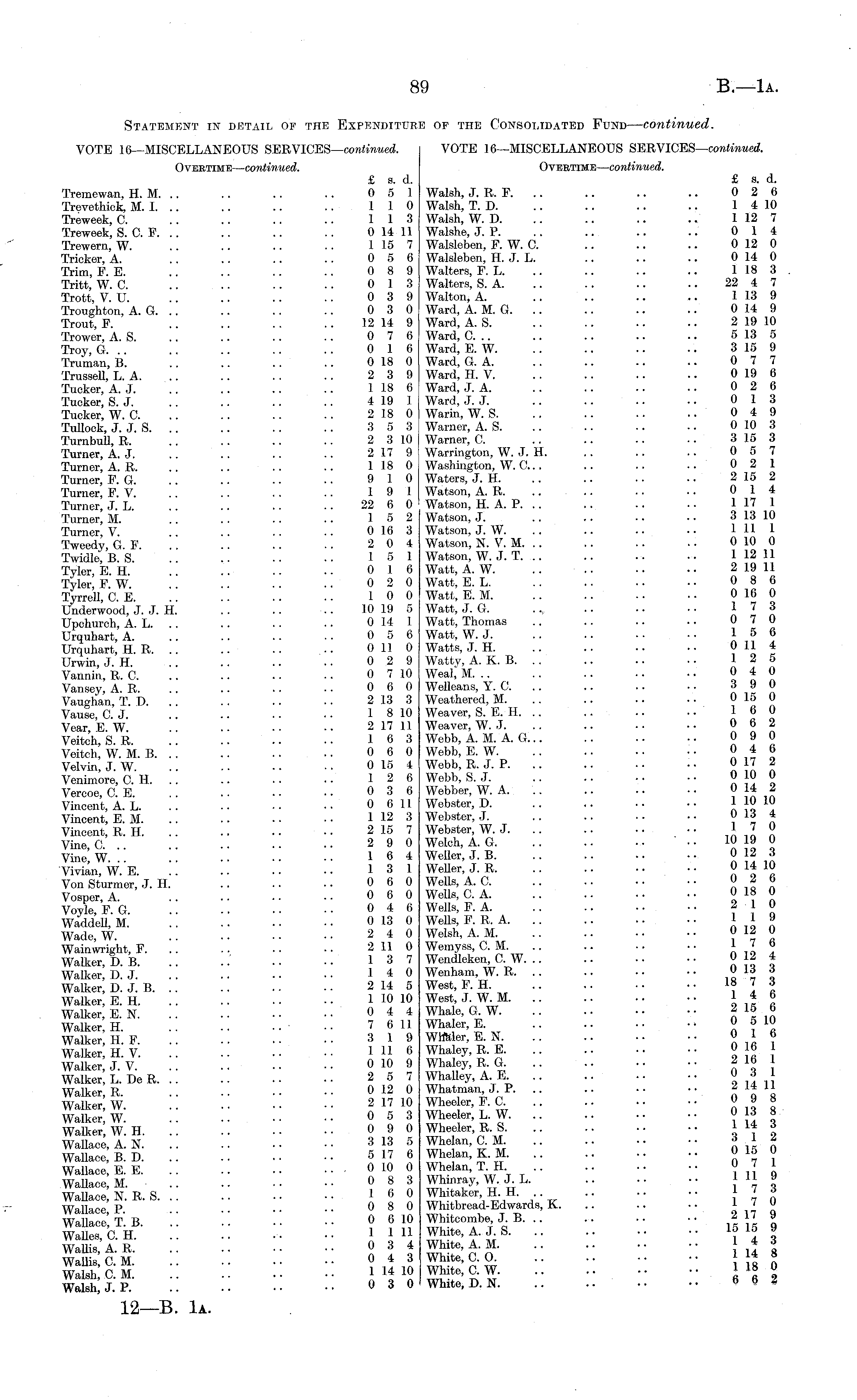 Statement in detain of the Expenditure of the Consolidated Fund — continued. VOTE 16—MISCELLANEOUS SERVlCES— continued. VOTE 16—MISCELLANEOUS SERVlCES— continued. Overtime— continued. Overtime — continued. £ s. d. £ s. d. Tremewan, H. M. .. .. .. .. 0 5 1 Walsh, J. R. F. .. .. .. .. 0 2 6 Trevethick, M. I. .. .. .. .. 110 Walsh, T. D. .. .. .. .. 1 410 Treweek, C. .. .. .. .. 113 Walsh, W. D. .. .. .. .. 112 7 Treweek, S. C. F. .. .. .. .. 0 14 11 Walshe, J. P. .. .. .. .. 0 14 Trewern, W. .. .. .. .. 115 7 Walsleben, F. W. C. .. .. .. 012 0 Tricker, A. .. .. .. .. 0 5 6 Walsleben, H. J. L. .. .. .. 014 0 Trim F. E. . .. . . .. 0 8 9 Walters, F. L. .. .. .. .. 118 3 Tritt, W. C. .. .. .. .. 0 13 Walters, S. A. .. .. .. .. 22 4 7 Trott, V. U. .. .. .. .. 0 3 9 Walton, A. .. .. .. .. 113 9 Troughton, A. G. .. .. .. .. 0 3 0 Ward, A. M. G. .. .. .. .. 0 14 9 Trout, F. .. .. 12 14 9 Ward, A. S. .. .. .. .. 219 10 Trower, A. S. .. .. .. .. 0 7 6 Ward, C. .. .. .. .. .. 513 5 Troy G .. .. ..016 Ward, E. W. .. .. .. •. 315 9 Truman, B. . .. .. .. 018 0 Ward, G. A. .. .. .. .. 0 7 7 Trussell, L. A. .. .. .. .. 2 3 9 Ward, H. V. .. .. .. .. 019 6 Tucker, A. J 1 18 6 Ward, J. A 0 2 6 Tucker, S. J. .. .. .. .. 419 1 Ward, J. J. .. .. .. .. 0 13 Tucker, W. C. .. .. .. .. 2 18 0 Warm, W. S. .. .. .. .. 049 Tullock, J. J. S. .. .. .. .. 3 5 3 Warner, A. S. .. .. .. .. 010 3 Tumbull, R. . . .. .. 2 310 Warner, C. .. .. .. .. 315 3 Turner, A. J. .. .. .. .. 217 9 Warrington, W. J. H. .. .. .. 0 5 7 Turner A R . .. .. 1 18 0 Washington, W. C... .. .. .. 0 2 1 Turner, F. G. .. ..910 Waters, J. H. .. .. .. .. 215 2 Turner, F. V. .. .. .. .. 19 1 Watson, A. R. .. .. .. •. 0 14 Turner, J. L. .. .. . . .. 22 6 0 Watson, H. A. P. .. .. .. • - 117 1 Turner M. . . .. .. 15 2 Watson, J. .. .. .. .. 313 10 Turner, V. .. .. .. 016 3 Watson, J. W. .. .. .. •• 111 1 Tweedy G F .. ..204 Watson, N. V. M. .. .. .. .. 010 0 Twidle B S .. .. .. 15 1 Watson, W. J. T. .. .. .. .. 112 11 Tyler, E. H. 0 16 Watt, A. W. .. 2 19 11 Tyler, F. W. .. . . .. .. 0 2 0 Watt, E. L. .. .. .. • ■ 0 8 6 Tyrrell C E .. .. .. 10 0 Watt, E. M. .. .. .. • - 016 0 Underwood, J. J. H 10 19 5 Watt, J. G 1 7 3 Unchurch, A. L. .. .. .. 014 1 Watt, Thomas .. .. .. • • 0 7 0 Urquhart, A 0 5 6 Watt, W. J 15 6 Urquhart, H. R .. .. 0 1] 0 Watts, J. H 0 11 4 Urwin, J. H 0 2 9 Watty, A. K. B 12 5 Vannin, R. C 0 7 10 Weal, M 0 4 0 Vansey, A. R 0 6 0 Welleans, Y. C 3 9 0 Vaughan, T.I) 2 13 3 Weathered, M '? Vause C J .. 1 810 Weaver, S. E. H. .. .. .. • • 16 0 Year E W .. .. •• 217 11 Weaver, W. J. .. .. ■• •■ 0 6 2 VeitcVs.R. " 16 3 Webb, A. M. A. G 0 9 0 Veitch, W. M. B 0 6 0 Webb, E. W 0 4 6 Velvin, J. W 0 15 4 Webb, R. J. P 0 17 2 Venimore, C. H 12 6 Webb, S. J 0 10 0 Vercoe, C.E 0 3 6 Webber, W. A. 0 14 2 Vincent, A. L 0 6 11 Webster, D 110 10 Vincent, E. M 1 12 3 Webster, J 0 13 4 Vincent, R. H 2 15 7 Webster, W. J ' Vine, C 2 9 0 Welch, A. G ' .. 10 19 0 Vine, W 16 4 Weller, J. B 0 12 3 Vivian, W. E 13 1 Weller, J. R 0 14 10 Yon Stunner, J. H 0 6 0 Wells, A. C 0 2 6 Vosper, A. 0 6 0 Wells, C. A. .. 0 18 0 Voyle, F. G 0 4 6 Wells, F. A 2-10 Waddell, M 0 13 0 Wells, F. R. A 119 Wade, W. 2 4 0 Welsh, A. M 0 12 0 Wainwright, F 2 11 0 Wemyss, C. M 1 7 b Walker, D. B " .. ■■ 13 7 Wendleken, C. W 0 12 4 Walker, D.J 14 0 Wenham, W. R 0 13 3 Walker, D.J. B 2 14 5 West, F. H Walker, E. H 110 10 West, J. W. M 14 6 Walker E.N 0 4 4 Whale, G. W 2 15 6 Walker, H •• 7 6 11 Whaler, E 0 5 10 Walker, H. F 3 19 WHaler, E. N 0 16 Walker, H. V 11l 6 Whaley, R. E 0 16 1 Walker, J. V 0 10 9 Whaley, R. G. 2 16 Walker, L. De R 2 5 7 Whalley, A. E 0 3 1 Walker, R 0 12 0 Whatman, J. P 2 14 11 Walker W . • 217 10 Wheeler, F. C. .. .. • • • ■ 0 9 8 W ak ; w : :: :: :: :: o» a wh ee ier, L .w :: j Walker W. H 0 9 0 Wheeler, R. S " Wallace, A. N 3 13 5 Whelan, C. M 3 12 Wallace B. D 5 17 6 Whelan, K. M 0 15 0 Wallace E E .. . 0 10 0 Whelan, T. H 0 7 1 wKm. :: :: :: :: o8 3 whinr ay ,w.J w L 119 Wallace, N. R. S 16 0 Whitaker H H 17 3 Wallace P..080 Whitbread-Edwards, K. .. .. ■ • 1 " JJ WaUaceTß '.'. '.'. ■■ 06 10 Whitcombe, J. B 27 9 WaUes C H " •• 1 1U White, A. J. S 15 15 9 wSaI: :: :: :: ..034 1* 3 Wallis CM .. ..043 White, CO. .. .. • • • • ]■ J* » ECM " •. 1 14 10 White, C. W 1 18 0 :: :: :: :: o3 0 ::•■«■•!