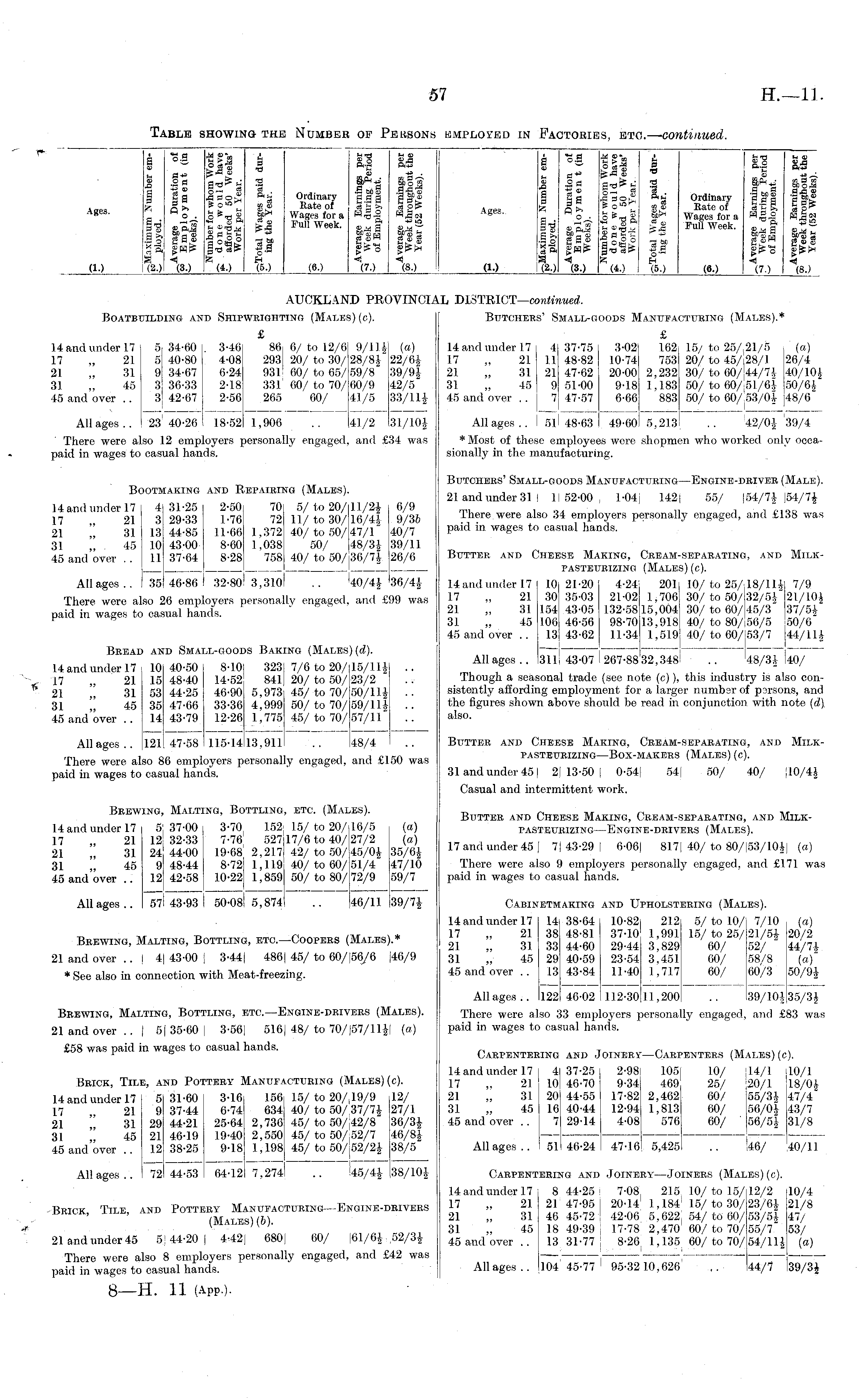 Ages. s °-B 9 rH A+ 3 Or O [- 1 li a- fl? - g r-J ""I .0 •So gas Sa gHP (8.) (3.) o S-8 •5 rl 0H a-o-*-j !?§£ £ fl - 0 ~ o o g-fl (8(> & (4.) rH .2 '3 ft&: m Sot* 88 to ferO. I-" SS to £ a o — Ordinary Kate of Wages for a full Week. ft'g _ 9 aft-* 3 CMOS' S3B Si§ ■°a cfSH giSo Hi (7.) *-j 03 ft5 m fl — 2?2J3 H-fl a. asps -r-> IO to » % 85 9 _ gist* Hi (8.) I Ages. (1.) i £ a a y, I'd B 00 B "•> ■B-3 3ft (2. ss .2 fl 1! a >> Sft--c?sS rH '- , rT M (3.) Ti r- '"t P co-iS *■*£ . In Re Iii r,T) C0H> y, (4.) u fl -d '3 ft* at * at* 31 (5.) Ordinary Kate of Wages for a Full Week. H c „„ a ■B bC OH g.e p H *§a 111 ir-V Hi (7.) rH Oi 03 .A ft+S tn fl w bfiO-ift flrfl « ■fl bo 03 -8 £ W -r=<g (1-) (6.) (6.) AUCKLAND PROVINCI. L DISTRICT— continued. Boatbuilding and Shipwrighting (Males) (c). Butchers' Small-goods Manueacturing (Males).* £ HandunderH I 5 34-60. 3-46 861 6/to 12/6 9/11$ (a) 17 „ 21 5 40-80 4-08 293 20/ to 30/ 28/8$ 22/6$ 21 „ 319 34-67 6-24 931 60/ to 65/ 59/8 39/9$ 31 „ 45 3 36-33 2-18 331 60/to 70/60/9 42/5 45 and over .. 3 42-67 j 2-56 265 60/ 41/5 33/11$ Allages.. ! 23' 40-26 i 18-52 1,906 .. 41/2 31/10$ £ HandunderH 4 37-75 3-02 162 15/ to 25/21/5 (a) 17 „ 21 11 48-82 10-74 753 20/ to 45/28/1 26/4 21 „ 31 21 47-62 20-00 2,232 30/ to 60/44/7$ 40/10.J 31 „ 45 9 51-00 9-18 1,183 50/ to 60/ 51/6$ 50/6$ 45 and over . . 7 47-57 6-66 883 50/ to 60/ 53/0$ 48/6 Allages.. 51.148-63 49-60 5,213 .. 42/0$ 39/4 * Most of these employees were shopmen who worked only occasionally in the manufacturing. There were also 12 employers personally engaged, and £34 was paid in wages to casual hands. Bootmaking and Repairing (Males). 14 and under 17 4 31-25 2-50 70 5/to 20/11/2$ 6/9 17 „ 21 3 29-33 1-76 72 11/ to 30/16/4$ 9/36 21 „ 31 13 44-85 11-66 1,372 40/to 50/47/1 40/7 31 „ 45 10 43-00 8-60 1,038 50/ 48/3$ 39/11 45 and over .. 11 37-64 8-28 758 40/to 50/36/7$ 26/6 Allages.. 35 46-86 32-80:3,310 .. '40/4$ 36/4$ There were also 26 employers personally engaged, and £99 was paid in wages to casual hands. Butchers' Small-goods Manufacturing—Engine-driver (Male). 21 and under 31 1 1:52-00 1-04J 142; 55/ 154/7$ (54/7$ There were also 34 employers personally engaged, and £138 was paid in wages to casual hands. Bread and Small-goods Baking (Males) (d). HandunderH 10 40-50 8-10 3231 7/6 to 20/15/11$ .. 17 „ 21 15 48-40 14-52 84l| 20/ to 50/ 23/2 21 „ 31 53 44-25 46-90 5,973 45/to 70/50/11$ .. 31 „ 45 35 47-66 33-36 4,999 50/to 70/59/11$ .. 45 and over.. 14 43-79 12-26 1,775 45/to 70/57/11 Allages.. 121 47-58 115-1413,911 .. 48/4 Butter and Cheese Making, Cream-separating, and Milkpasteurizing (Males) (c). HandunderH 10 21-20 4-24 201, 10/to 25/18/11$ 7/9 17 „ 21 30 35-03 21-02 1,706! 30/to 50/32/5$ 21/10$ 21 „ 31 154 43-05 132-5815,004] 30/ to 60/;45/3 37/5$ 31 „ 45 106 46-56 98-7013,918 40/ to 80/56/5 50/6 45 and over.. 13 43-62 11-34 1,519 40/to 60/53/7 44/11$ Allages.. 311 43-07 I 267-88 32,348: .. '48/3$ 40/ Though a seasonal trade (see note (c)), this industry is also consistently affording employment for a larger numbsr of parsons, and the figures shown above should be read in conjunction with note (d\ also. There were also 86 employers personally engaged, and £150 was paid in wages to casual hands. Butter and Cheese Making, Cream-separating, and Milk-pasteurizing—Box-makers (Males) (c). 31 and under 45 ( 2| 13-50 | 0-54| 54] 50/ 40/ [10/4$ Casual and intermittent work. Brewing, Malting, Bottling, etc. (Males). HandunderH 5:37-00; 3-70, 152; 15/ to 20/46/5 (a) 17 „ 21 12 32-33 7-76 52717/6 to 40/:27/2 (a) 21 „ 31 24 44-00 19-68' 2,217 42/to 50/45/0$ 35/6$ 31 „ 45 9 48-44 8-72 1,119 40/to 60/51/4 47/10 45 and over .. 12 42-58 10-22 1,859 50/to 80/72/9 59/7 Allages.. 57 43-93 50-08 5,874 .. 46/11 39/7$ Butter and Cheese Making, Cream-separating, and Milk-pasteurizing—Engine-drivers (Males). 17andunder45| 7| 43-29 [ 6-06] 817( 40/to 80/|53/10$| (a) There were also 9 employers personally engaged, and £171 was paid in wages to casual hands. Brewing, Malting, Bottling, etc.—Coopers (Males).* 21 and over .. | 4| 43-00 ! 3-441 486| 45/ to 60/|56/6 |46/9 * See also in connection with Meat-freezing. Cabinetmaking and Upholstering (Males). HandunderH 14 38-64 10-82 212 5/to 10/ 7/10 (a) 17 „ 21 38 48-81 37-10 1,991 15/to 25/21/5$ 20/2 21 „ 31 33 44-60 29-44 3,829 60/ 52/ 44/7$ 31 „■ 45 29 40-59 23-54 3,451 00/ 58/8 (a) 45 and over .. 13 43-84 11-40 1,717 60/ 60/3 50/9$ Allages.. 122 46-02 112-30 11,200 .. 39/10$ 35/3$ There were also 33 employers personally engaged, and £83 was paid in wages to casual hands. Brewing, Malting, Bottling, etc.—Engine-drivers (Males). 21 and over.. I 51 35-60 I 3-56| 516| 48/ to 70/|57/ll$l (a) £58 was paid in wages to casual hands. Carpentering and Joinery—Carpenters (Males) (c). HandunderH ( 4 37-25 2-98 105 10/ (14/1 il0/l 17 „ 21 10 46-70 9-34 469 25/ 20/1 18/0$ 21 „ 31 20 44-55 17-82 2,462 60/ 55/3$ 47/4 31 „ 45 16 40-44 12-94 1,813 60/ 56/0$ 43/7 45 and over .. 7 29-14 4-08 576 60/ 56/5$ 31/8 Allages.. 51 46-24 47-16 5,425 .. 146/ 40/11 Brick, Tile, and Pottery Manufacturing (Males) (c). HandunderH 5 31-60 3-16 156 15/ to 20/.19/9 12/ 17 „ 21 9 37-44 6-74 634 40/ to 50/37/7$ 27/1 21 31 29 44-21 25-64 2,736 45/to 50/J42/8 36/3$ 31 „ 45 21 46-19 19-40 2,550 45/to 50/,52/ 7 46/8$ 45 and over .. 12 38-25 9-18 1,198 45/to 50/;52/2$ 38/5 Allages.. 72 44-53 64-12 7,274 .. 45/4$ 38/10$ Brick Tile, and Pottery Manufacturing—Engine-drivers (Males) (b). 21andunder45 5 44-20! 4-42j 680) 60/ [61/6$, ,52/3$ There were also 8 employers personally engaged, and £42 was paid in wages to casual hands. Carpentering and Joinery—Joiners (Males) (c). 14 and under 17 8 44-25; 7-08 215 10/ to 15/ 1.2/2 10/4 17 „ 21 21 47-95 | 20-14 1,184 ; 15/ to 30/ 23/6$ 21/8 21 „ 31 46 45-72! 42-06 5,622! 54/to 60/53/5$ 47/ 31 „ 45 18 49-39 17-78 2,470 60/to 70/55/7 53/ 45 and over .. 13 31-