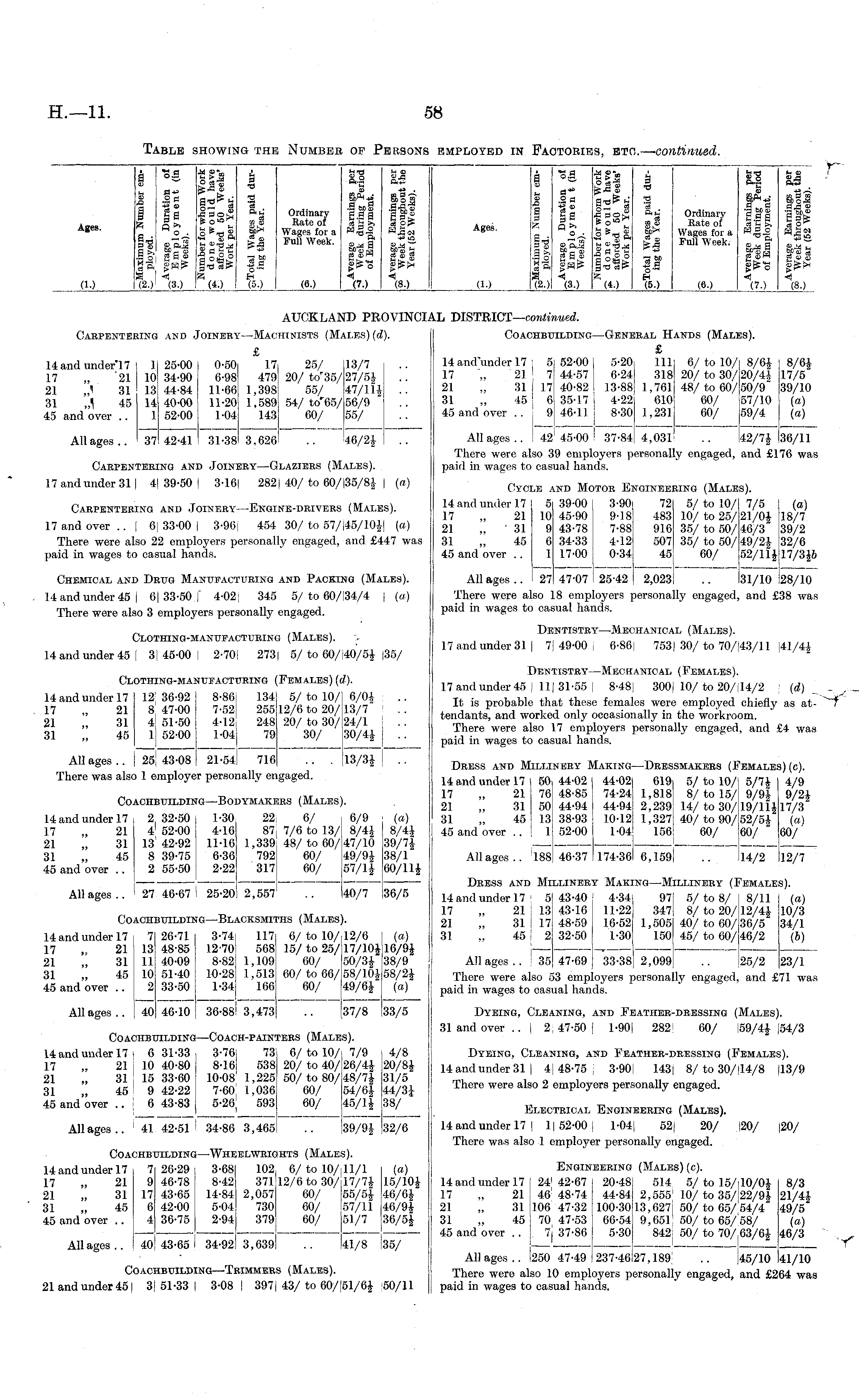 Ages. a 03 M S3 ft Is a fla' I I (2.)' °iS Ohh 3 a || Q 2-s irHS CO B fi oo trj 333 ,^HHH4 (3.) Sp ,gr!j 3 V £ SaoS rO»^ IS'S-a a°«t§ §-0 esC9 ir, a TS 2 'cS ft (4 01 s S>£ =8 co si to £ a 1-L Ordinary Hate of Wages for a Full Week. ftl 03 SrHHri .a M § B.ga as h >> ft 111 ■Br-*-(7.) En 9 a-S ■a . as39S ■a SJ «.fl<N HH ITS IH" — S£$ gr=rHi (8.) Ages. a a. M a. -D a a ft I'd 5 9 s >> '3 ft 4i S3 a* .2 fl ■Si sa to e o ?5 A 03 %&& (3.) f & is Sfl"HH^OO a 0, flfe y (4.) I '3 fttOS SrS -Sr3 - HH 93 cm S a o — n (5.) Ordinary Rate of Wages for a Full Week. ftl - 9 SPHhJ ■B bC 03 e.sa m3s c a 00 oh a CM9S£ os am Hi (7.) In OH as &ts S-fl s I l[S 3 2 "rfl-nO 9 j£ t_ S-SrH Hi (8.) (10 (60 (10 <«■) AUCKLAND PROVINC] IVINCI. 3.L DISTRICT— continued. Carpentering and Joinery—Machinists (Males) (d). 1. Coachbuilding—General Hands (Males). x £ HandunderH, 5 52-00 | 5-20 111 6/ to 10/| 8/6$ 8/6$ 17 „ 21 ; 7 44-57 6-24 318 20/ to 30/20/4$ 17/5 21 „ 31 j 17 40-82 13-88 1,761 48/to 60/(50/9 39/10 31 „ 45 ! 6 35-17 4-22 610 60/ 57/10 (a) 45 and over ..'9 46-11 \ 8-30 1,231 60/ 59/4 (a) Allages.. I 42'45-00 ' 37-84 4,031 .. 42/7$ 36/11 There were also 39 employers personally engaged, and £176 was paid in wages to casual hands. Handunder'H 1 25-00 0-50 17 25/ 13/7 17 „ 21 10 34-90 6-98 479 20/to r 35/27/5$ 21 „1 31 13 44-84 11-66 1,398 55/ 47/11$ .. 31 „\ 45 14 40-00 11-20 1,589 54/ to'65/56/9 45 and over .. 1 52-00 1-04 143 60/ 55/ Allages.. 37 42-41 31-38 3.626 .. 46/2$ Carpentering and Joinery—Glaziers (Males). 17andunder31| 4| 39-50 | 3-161 2821 40/ to 60/135/8$ | (a) Cycle and Motor Engineering (Males). 14 and under 17 5 39-00 3-90 72 5/to 10/ 7/5 (a) 17 „ 21 10 45-90 9-18 483 10/to 25/21/0$ 18/7 21 „ 31 9 43-78 7-88 916 35/ to 50/ 46/3 39/2 31 „ 45 6 34-33 4-12 507 35/ to 50/ 49/2$ 32/6 45 and over.. 1 17-00 0-34 45 60/ 52/11$ 17/3$i All ages .. 27 47-07 25-42 2,023 .. 31/10 28/10 There were also 18 employers personally engaged, and £38 was paid in wages to casual hands. Carpentering and Joinery—Engine-drivers (Males). Handover.. [ 6| 33-00 I 3-96; 454 30/to 57/|45/10$j (a) There were also 22 employers personally engaged, and £447 was paid in wages to casual hands. Chemical and Drug Manufacturing and Packing (Males). 14 and under 45 | 6(33-50 1 4-02; 345 5/to 60/134/4 j (o) There were also 3 employers personally engaged. Clothing-manufacturing (Males). 14 and under 45 [ 31 45-00 I 2-70! 2731 5/ to 60/(40/5$ 135/ Dentistry—Mechanical (Males). 17 and under 31 | 7) 49-00 i 6-86 753| 30/ to 70/143/11 |41/4$ Clothing-manufacturing (Females) (d). HandunderH 12*36-92 8-86 134 5/ to 10/ 6/0$ .. 17 „ 21 8 47-00 7-52 25512/6 to 20/13/7 21 „ 31 4- 51-50 4-12 248 20/ to 30/ 24/1 : .. 31 „ 45 1 52-00 1-04 79 30/ 30/4$ i .. All ages .. | 25[ 43-08 21-54 716 ... 13/3$ \ .. There was also 1 employer personally engaged. Dentistry—Mechanical (Females). 17 and under 45 ( 11(31-55 ( 8-48J 300( 10/to 20/; 14/2 (d)_ It is probable that these females were employed chiefly as attendants, and worked only occasionally in the workroom. There were also 17 employers personally engaged, and £4 was paid in wages to casual hands. Coachbuilding—Bodymakers (Males). HandunderH 2,32-50 1-30 22 6/ 6/9 (a) 17 „ 21 4 1 52-00 4-16 87, 7/6 to 13/ 8/4$ 8/4$ 21 „ 31 13'42-92 11-16 1,339, 48/to 60/47/10 39/7$ 31 „ 45 8 39-75 6-36 792 60/ 49/9$ 38/1 45 and over .. 2 55-50 2-22 317 60/ 57/1$ 60/11$ Allages.. 27 46-67 25-20 2,557 .. 40/7 36/5 (a) 8/4$ 39/7$ 38/1 60/11$ 36/5 Dress and Millinery Making—Dressmakers (Females) (c). HandunderH 50 44-02 j 44-02 619, 5/to 10/ 5/7$ 4/9 17 „ 21 76 48-85 74-24 1,818 8/to 15/ 9/9$ 9/2$ 21 „ 31 50 44-94 44-94 2,239J 14/to 30/19/11$ 17/3 31 „ 45 13 38-93 10-12 1,327} 40/to 90/52/5$ (a) 45 and over .. 1 52-00 1-04 156; 60/ 60/ 60/ Allages.. 188 46-37 174-36 6,159J .. 14/2 12/7 Coachbuilding—Blacksmiths (Males). HandunderH 7 26-71 3-74 117 6/to 10/12/6 (a) 17 „ 21 13 48-85 12-70 568 15/ to 25/17/10$ 16/9$ 21 „ 31 11 40-09 8-82 1,109 60/ 50/3$ 38/9 31 „ 45 10 51-40 10-28 1,513 60/to 66/58/10$ 58/2$ 45 and over .. 2 33-50 1-34 166 60/ 49/6$ (a) Allages.. I 40 46-10 36-88 1 3,473 .. [37/8 33/5 (a) 16/9$ 38/9 58/2$ (a) Dress and Millinery Making—Millinery (Females). HandunderH 5 43-40! 4-341 97 5/to 8/ 8/11 (a) 17 „ 21 : 13 43-16 11-22 347 8/ to 20/12/4$ 10/3 21 „ 31 17 48-59 16-52 1,505 40/to 60/36/5 34/1 31 „ 45 2 32-50 1-30 150 45/to 60/46/2 (o) Allages.. 35 47-69 33-38 2,099 .. 25/2 23/1 There were also 53 employers personally engaged, and £71 was paid in wages to casual hands. 33/5 Dyeing, Cleaning, and Feather-dressing (Males). 31 and over ..12 47-50 [ 1-90! 282 ! 60/ |59/4$ (54/3 Coachbuilding—Coach-painters (Males). HandunderH: 6 31-33 3-761 73 6/to 10/ 7/9 4/8 17 „ 21 10 40-80 8-16 538 20/ to 40/ 26/4$ 20/8$ 21 „ 31 15 33-60 10-08 1,225 50/to 80/48/7$ 31/5 31 „ 45 9 42-22 7-60' 1,036 60/ 54/6$ 44/3$ 45 and over .. 6 43-83 5-26J 593 60/ 45/1$ 38/ Allages.. ' 41 42-51 I 34-86 3,465 .. 39/9$ 32/6 4/8 20/8$ 31/5 44/3$ 38/ Dyeing, Cleaning, and Feather-dressing (Females). 14 and under 31 | 4(48-75, 3-901 143| 8/ to 30/(14/8 |13/9 There were also 2 employers personally engaged. 32/6 Electrical Engineering (Males). 14 and under 17 ( 1| 52-00 [ l-04[ 52( 20/ 120/ |20/ There was also 1 employer personally engaged. Coachbuilding—Wheelwrights (Males). HandunderH 7 26-29 3-68 102 6/ to 10/;11/1 (a) 17 „ 21 9 46-78 8-42 371 12/6 to 30/:17/7$ 15/10$ 21 „ 31 17 43-65 14-84 2,057 60/ 55/5$ 46/6$ 31 „ 45 6 42-00 5-04 730 60/ 157/11 46/9$ 45 and over .. 4 36-75 2-94 379 60/ 151/7 36/5$ (a) 15/10$ 46/6$ 46/9$ 36/5$ Engineering (Males) (c). 14 and under 17 24 1 42-67 ! 20-48 514 5/to 15/;10/0$ 8/3 17 „ 21 46 1 48-74 44-84 2,555 10/ to 35/ 22/9$ 21/4$ 21 „ 31 106 47-32 100-30 13,627: 50/to 65/54/4 49/5 31 „ 45 | 70 47-53 66-54 9,651 50/to 65/58/ (a) 45 and over .. I, 7 37-86 5-30 842: 50/ to 70/,63/6$ 