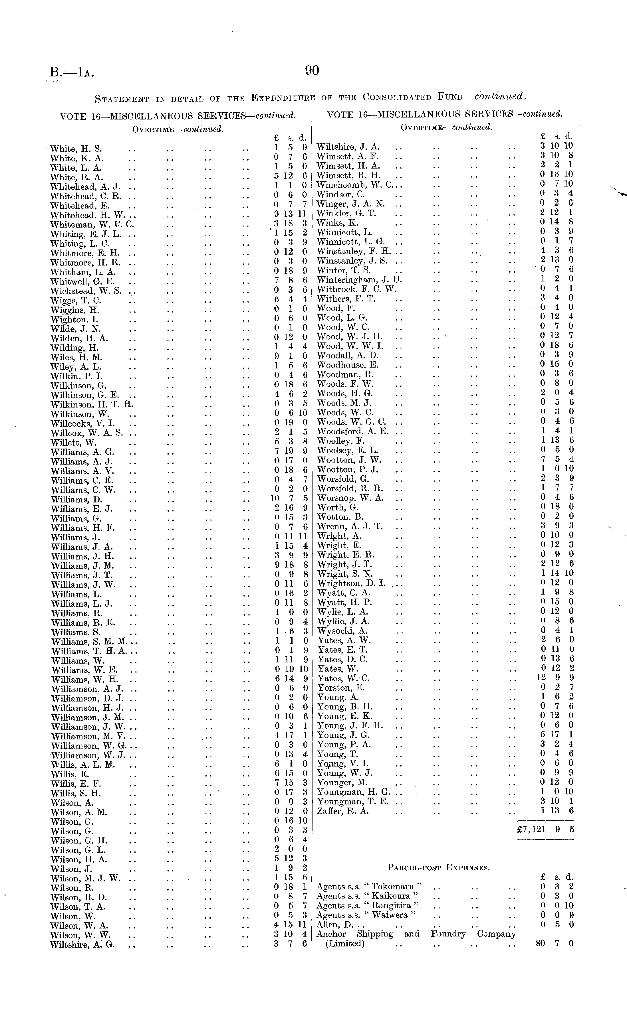 Statement in detail of the Expenditure of the Consolidated Fund — continued. VOTE 16—MISCELLANEOUS SEEVlCES— continued. \ VOTE 16—MISCELLANEOUS SERVlCES— continued. Overtime— continued. Overtime— continued. £ s. d. £ s. d. White H S .. ..159 Wiltshire, J. A 3 10 10 White' X A .. .. .. 0 7 6 Wimsett, A. F. .. .. .. .. 310 8 White' LA .. .. .. .. 150 Wimsett, H. A. .. .. .. .. 2 2 1 White R A .. .. .. .. 512 6 Wimsett, R. H. .. .. .. . . 016 10 Whitehead, A. J. .. .. .. .. 110 Winchcomb, W. C... .. .. .. 0 710 Whitehead, C. R. .. .. .. •. 0 6 0 Windsor, C. .. .. .. .. 0 3 4 Whitehead, E 0 7 7 Winger, J. A. N 0 2 6 Whitehead, H. W 9 13 11 Winkler, G. T 2 12 1 Whiteman, W. F. C. .. .. .. 3 18 3 Winks, K. .. .. .. " .. 0 14 8 Whiting, E. J. L. .. .. .. .. '115 2 Winnioott, L. .. .. .. -. 03 9 Whitino- LC .. .. .. .. 039 Winnicott, L. G. .. .. .. .. 0 17 Whitmore, E. H. .. 0 12 0 Winstanley, F. H .. 4 3 6 Whitmore, H. R. .. .. .. .. 0 3 0 Winstanley, J. S. .. .. .. .. 213 0 Whitham, L. A 0 18 9 Winter, T. S. .. 0 7 6 Whitwell, G. E. .. .. .. .. 7 8 6 Winteringham, J. U. .. .. .. 12 0 Wickstead, W. S 0 3 6 Witbrock, F. C. W. 0 4 1 Wises TC. .. .. .. .. 6 4 4 Withers, F. T. .. .. .. .. 3 4 0 Wiggins, H 0 10 Wood,F. 040 Wighton, 1 0 6 0; Wood, L. G 0 12 4 Wilde, J. N 0 10! Wood, W. C 070 Wilden, H. A 0 12 0 Wood, W. J. H .. .. 0 12 7 Wilding H .. .. . . 14 4 Wood, W. W. I. .. .. .. ... 018 6 Wiles, H. M 9 10 Woodall, A. D 0 3 9 Wiley, A. L. .. .. .. .. 15 6! Woodhouse, E. .. .. .. 015 0 Wilkin PI .. .. .. 0 4 6 Woodman, R. .. .. .. .. 0 3 6 Wilkinson, G 0 18 6 Woods, F. W 0 8 0 Wilkinson, G. E. .. .. .. .. 4 6 2 Woods, H. G. .. .. .. .. 2 0 4 Wilkinson, H. T. H. .. .. .. 0 3 5; Woods, M. J. .. .. .. .. 056 Wilkinson W. .. .. .. .. 0 610 Woods, W. C. .. .. .. .. 0 3 0 Willcocks, V. I. .. .. .. .. 019 0 Woods, W. G. C. . . .. .. .. 0 4 6 Willcox WAS... .. .. .. 215 Woodsford, A. E. .. .. .. .. 14 1 Willett, W. 5 3 8 Woolley, F 1 13 6 Williams, A. G. .. .. .. 719 9 Woolsey, E. L. .. .. .. .. 0 5 0 Williams, A. J. .. .. .. .. 017 0 I Wootton, J. W. .. .. .. .. 7 5 4 Williams, A. V. .. .. .. 018 6 Wootton, P. J. .. .. .. .. 1 010 Williams, C. E. .. .. .. 0 4 7 Worsfold, G. .. .. .. .. 2 3 9 Williams, C. W. .. .. .. .. 0 2 0 Worsfold, R. H. .. .. .. .. 17 7 Williams D. .. .. .. .. 10 7 5 Worsnop, W. A. .. .. .. .. 0 4 6 Williams, E. J. .. .. .. .. 216 9 Worth, G. .. .. .. .. 018 0 Williams, G. .. .. .. .. 015 3 Wotton, B. .. .. .. .. 0 2 0 Williams, H. F 0 7 6 Wrenn, A. J. T 3 9 3 Williams, J. .. .. .. .. 0 1111 Wright, A. .. .. .. .. 0 10 0 Williams, J. A. .. .. .. .. 115 4 Wright, E. .. .. .. .. 012 3 Williams, J. H 3 9 9' Wright, E. R 090 WiUiams, J. M. .. .. .. 918 8 Wright, J. T. .. .. .. .. 212 6 Williams, J. T. .. .. .. .. 0 9 8 Wright, S. N. .. .. .. .. 114 10 Williams, J. W. .. .. .. .. 011 6 Wrightson, D. I. .. .. .. .. 012 0 Williams, L. .. .. .. .. 016 2 Wyatt, C. A. .. .. .. .. 19 8 WiUiams, L. J. .. .. .. ■• 011 8 Wyatt, H. P. .. .. .. .. 015 0 Williams, R. .. .. .. .. 10 0 Wylie, L. A. .. .. .. .. 012 0 Williams, R. E. ... .. .. .. 0 9 4 Wyllie, J. A. .. .. .. .. 0 8 6 Williams, S. .. .. .. .. 1-63! Wysocki, A. .. .. .. .. 041 Williams, S. M. M. .. .. .. .. 110 Yates, A. W. .. .. .. .. 2 6 0 Williams, T. H. A. .. .. .. .. 0 19 Yates, E. T. .. .. .. .. 0 11 0 Williams, W 1 11 9 Yates, D. C 0 13 6 Williams, W. E. .. .. .. .. 019 10 Yates, W. .. .. .. .. 012 2 Williams, W. H. .. .. .. .. 6 14 9 Yates, W. C. .. .. .. .. 12 9 9 Williamson, A. J. .. .. .. .. 0 6 0 Yorston, E. .. .. .. .. 0 2 7 Williamson, D. J. .. .. .. .. 0 2 0 Young, A. .. .. .. .. 16 2 Williamson, H. J. .. .. .. .. 0 6 0 Young, B. H. .. .. .. .. 0 7 6 Williamson, J. M. .. .. .. .. 010 6 Young, E. K. .. .. .. .. 012 0 Williamson, J. W. .. .. .. .. 0 3 1 Young, J. F. H. .. .. .. .. 0 6 0 Williamson, M. V. .. .. .. .. 417 1 Young, J. G. .. .. .. .. 517 1 Williamson, W. G. .. .. .. .. 0 3 0 Young, P. A. .. .. .. .. 3 2 4 Williamson, W. J. .. .. .. . • 013 4 Young, T. .. .. .. .. 0 4 6 Willis, A. L. M. .. .. .. .. 6 10 Yqung, V. I. .. .. .. .. 0 6 0 Willis, E. .. .. .. .. 615 0 Young, W. J. .. .. .. .. 0 9 9 Willis, E. F. .. .. .. .. 715 3 Younger, M. .. .. .. .. 012 0 Willis, S. H. .. .. .. .. 017 3 Youngman, H. G. .. .. .. .. 1 010 Wilson, A. .. .. .. .. 0 0 3 Youngman, T. E. .. .. .. .. 310 1 Wilson, A. M. .. .. .. .. 012 0 Zaffer, R. A. .. .. .. .. 113 6 Wilson, G. .. .. .. .. 016 10 Wilson, G. .. .. .. .. 0 3 3 £7,121 9 5 Wilson, G. H. .. .. .. .. 0 6 4 Wilson, G. L. .. .. .. .. 2 0 0 Wilson, H. A. .. .. .. .. 512 3 Wilson, J. .. .. .. .. 19 2 Parcel-post Expenses. Wilson! M. J. W. .. .. .. 115 6 £ s. d. Wilson, R. .. .. .. .. 018 1 Agents s.s. " Tokomaru" .. .. .. 0 3 2 Wilson, R. D. .. .. • ■ .. 0 8 7 Agents s.s. " Kaikoura" .. .. 0 3 0 Wilson, T. A. .. .. .. . . 0 5 7 Agents s.s. " Rangitira " .. .. .. 0 010 Wilson W .. .. .. •• 053 Agents s.s. " Waiwera" .. .. .. 0 0 9 Wilson'W. A. .. .. .. .. 415 11 Allen, D. .. .. .. .. .. 05 0 Wilson, W. W. .. .. .. .. 310 4 Anchor Shipping and Foundry Company Wiltshire, A. G. .. .. .. .. 3 7 6 (Limited) .. .. .. .. 80 7 0