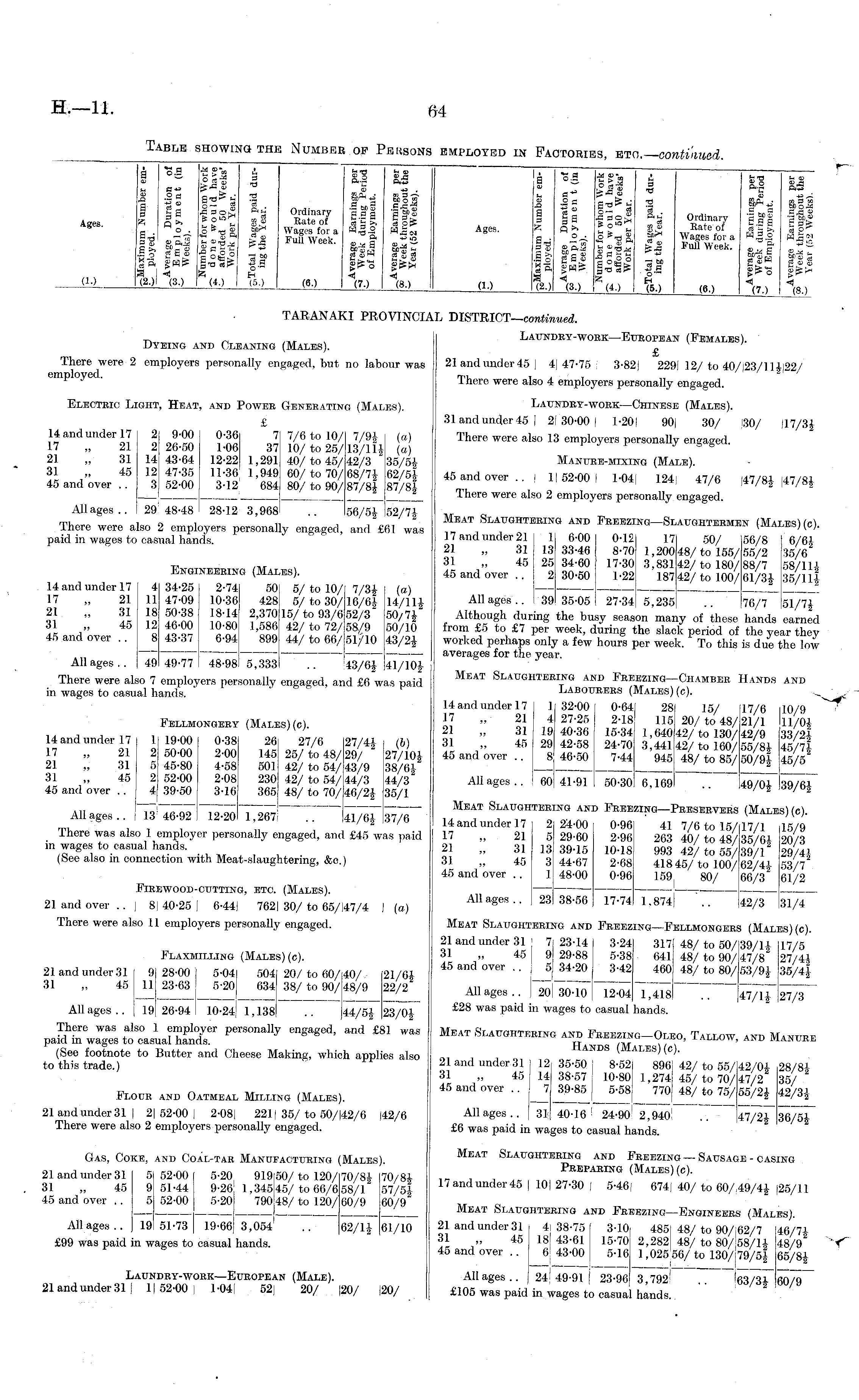 Ages. £3 °_- OH t- Chh 5 .2fl 1 32 s 5 a r3 Q ->. s • °~ 2 o a ft-^ a >> r.I fl S3 .fl O £ fl 93 gp, SSr a l -5 (2.)i (3.) ■a s« 111 r*>fl OH J,' SooS So'"** _**& sS'g-a ■o SS 9 fl r-J S3 OS f> r5 (4.) 3 TJ .2 'S PriJ es a, J fl o"~Eh (5.) Ordinary Rate of Wages for a Full Week. &*•* .5 bD o S3 3 eS " >, m3 3 rt a. *H gr=-3 (-. 03 03 rftt3 Zi\3SZ Ail §|| (SO? «£« HH IO OH JH g.. s S Hi (8.) Ages. (1.) § S3 ft fltj fl .§& ga a (2.) S3 \fg- S .2= ET3 r£>H11 lflo| »ft-g «^-s CO fl oj -° _" O o |lSr- I__Et Hi !*; (3.) (4.) S3 An li* co m H9S3 Sh CM £ a o—' E-i (5.) Ordinary Bate of Wages for a Full Week. is"9 ts 90 Br-HH-e.a I m 3 s sis >--o Hi (7.) 03 _! en d"« |f 0 | S fl--CO Wnflg sis sss gr-r-Hi (8.) r— (1.) (6.) (6.) TARANAKIPROVINCL X DISTRICT— continued. Dyeing and Cleaning (Males). Laundry-work—European (Females). There were 2 employers personally engaged, but no labour was employed. £ 21 and under 45 ; 4| 47-75 3-82| 229! 12/ to 40/i23/ll$|22/ There were also 4 employers personally engaged. Electric Light, Heat, and Power Generating (Males). Laundry-work—Chinese (Males). £ 31 and under 45 | 2! 30-00 I 1-201 90( 30/ |30/ 117/3$ HandunderH 2 9-00 0-36 7 7/6 to 10/ 7/9$ (a) 17 „ 21 2 26-50 1-06 37 10/to 25/13/11$ (a) 21 „ 31 14 43-64 12-22 1,291 40/to 45/42/3 35/5$ 3 1 „ 45 12 47-35 11-36 1,949 60/to 70/68/7$ 62/5$ 45 and over .. 3 52-00 3-12 684 80/ to 90/ 87/8$ 87/8$ Allages.. I 29! 48-48 28-12 3,968 .. 56/5$ 152/7$ There were also 13 employers personally engaged. Manure-mixing (Male). 45 and over.. I 1152-00! l-04[ 124; 47/6 |47/8$l47/8$ There were also 2 employers personally engaged. There were also 2 employers personally engaged, and £61 was paid in wages to casual hands. Engineering (Males). 14 and under 17 4 34-25 2-74 50 5/ to 10/1 7/3$ (a) 17 „ 21 11 47-09 10-36 428 5/to 30/16/6$ 14/11$ 21 „ 31 18 50-38 18-14 2,37015/to 93/6 52/3 50/7$ 31 „ 45 12 46-00 10-80 1,586 42/ to 72/ ! 58/9 50/10 45 and over . . 8 43-37 6-94 899 44/ to 66/151/10 43/2$ Allages.. 49 49-77 48-98 5,333 .. 43/6$ 41/10$ There were also 7 employers personally engaged, and £6 was paid in wages to casual hands. Meat Slaughtering and Freezing—Slaughtermen (Males) (c). 17 and under 21 j 1 6-00 0-12 17 50/ 56/8 6/61 21 .. 31 | 13 33-46 8-70 1,200 48/to 155/55/2 35/6 31 i. 45 125 34-60 17-30 3,83142/ to 180/ 88/7 58/11$ 45 and over .. ; 2 30-50 1-22 187 42/to 100/61/3$ 35/11$ Allages.. 39 35-05 27-34 5,235 .. 76/7~51/7$ Although during the busy season many of these hands earned from £5 to £7 per week, during the slack period of the year they worked perhaps only a few hours per week. To this is due the low averages for the year. Fellmongery (Males) (c). 14 and under 17 ; 1 19-00 0-38 26 27/6 27/4$ lb) H „ 21 2 50-00 2-00 145 25/to 48/29/ 27/10$ 21 „ 31 5 45-80 4-58 501 42/ to 54/ 43/9 38/6$ 31 „ 45 2 52-00 2-08 230 ! 42/ to 54/ 44/3 44/3 45 and over.. 4 39-50 3-16 365 48/to 70/46/2$ 35/1 Allages.. | 13 1 46-92 12-20 1,267; .. 41/6$ 37/6 There was also 1 employer personally engaged, and £45 was paid in wages to casual hands. (See also in connection with Meat-slaughtering, &c.) Meat Slaughtering and Freezing—Chamber Hands and Labourers (Males) (c). 14 and under 17 | 1 32-00 0-64 28 15/ 17/6 |10/9 17 - 21 | 4 27-25 2-18 115 20/to 48/21/1 Ill/Ol 21 „ 31 ; 19 40-36 15-34 1,640 42/to 130/42/9 33/2! 31 „ 45 29 42-58 24-70 3,44142/to 160/55/8$ 45/7$ 45 and over .. 8 46-50 7-44 945 48/ to 85/ 50/9$ 45/5 Allages.. 60 41-91 50-30 6.169 .. 49/0$ 39/6$~ Meat Slaughtering and Freezing—Preservers (Males) (c). 14 and under 17 2 24-00 0-96 41 7/6 to 15/17/1 15/9 17 » 21 5 29-60 2-96 263 40/ to 48/ 35/6$ 20/3 21 ss 31 13 39-15 10-18 993 42/to 55/39/1 29/4] 31 » 45 3 44-67 2-68 418 45/to 100/62/4$ 53/7 45 and over . . 1 48-00 0-96 159 80/ 66/3 61/2 Allages.. 23 38-56 17-74 l,874l '.. 42/3 31/4~ Firewood-cutting, etc. (Males). 21 and over .. | 8| 40-25 | 6-44) 7621 30/ to 65/147/4 I (a) There were also 11 employers personally engaged. Flaxmilling (Males) (c). 21 and under 31 I 9 28-00 1 5-04 504 20/to 60/40/ 21/6$ 31 „ 45 j 11 23-63 , 5-20 634 38/to 90/48/9 22/2 Allages.. | 19 26-94 1 10-24 1,138 .. 44/5$ 23/0$ There was also 1 employer personally engaged, and £81 was paid in wages to casual hands. (See footnote to Butter and Cheese Making, which applies also to this trade.) Meat Slaughtering and Freezing—Fellmongers (Males) (c). 21 and under 31 ' 7(23-14 3-24 317 48/ to 50/ 39/1$ 17/5 31 >• 45 9 29-88 5-38 641 48/ to 90/ 47/8 27/4J 45 and over . . 5| 34-20 3-42 460 48/ to 80/ 53/9$ 35/4$ Allages.. 20 3010 12-04 1,418 .. 47/1$ 27/3~ £28 was paid in wages to casual hands. Meat Slaughtering and Freezing—Oleo, Tallow, and Manure Hands (Males) (c). 21 and under 31 | 12 35-50 1 8-521 896! 42/ to 55/ 42/0$ 28/84 31 .. « 14 38-57' 10-80 1,274! 45/to 70/47/2 35/ 45 and over .. , 7, 39-85 j 5-58 77o| 48/ to 75/55/2$ 42/3$ Allages.. I 31; 40-16 24-902,940! .. 47/2$~36/5$~ £6 was paid in wages to casual hands. Flour and Oatmeal Milling (Males). 21 and under 31 | 2 j 52-00 | 2-08; 2211 35/ to 50/142/6 142/6 There were also 2 employers personally engaged. Gas, Coke, and Coal-tar Manufacturing (Males). 21 and under 31 5 52-00 5-20 919(50/ to 120/70/8$ 70/8$ 31 „ 45 9 51-44 9-26 1,345 45/to 66/6 58/1 57/5$ 45 and over . . 5 52-00 5-20 790 48/ to 120/ 60/9 60/9 Allages.. 19 51-73 19-66 3.054 1 .. 62/1$ 61/10 £99 was paid in wages to casual hands. Meat Slaughtering and Freezing —Sausage-casing Preparing (Males) (c). 17 and under 45 j 10] 27-30 | 5-46[ 674| 40/ to 60/49/4$ [25/11 Meat Slaughtering and Freezing—Engineers (Males). 21 and under 31 4] 38-75 3-10 485: 48/to 90/62/7 46/7' 31 „ 45 18: 43-61 15-70 2,282 48/to 80/58/1$ 48/9* 45 and over.. 6; 43-00 5-16 1,025 56/to 130/;79/5$ 65/8$ Allages.. 24,49-91! 23-96 3,792 .. 'm/S^GO/iT' £105 was paid in wages to casual hands. Laundry-work—European (Male). 21 and under 31 | 11 52-00 i 1-041 52) 20/ |20/ 120/