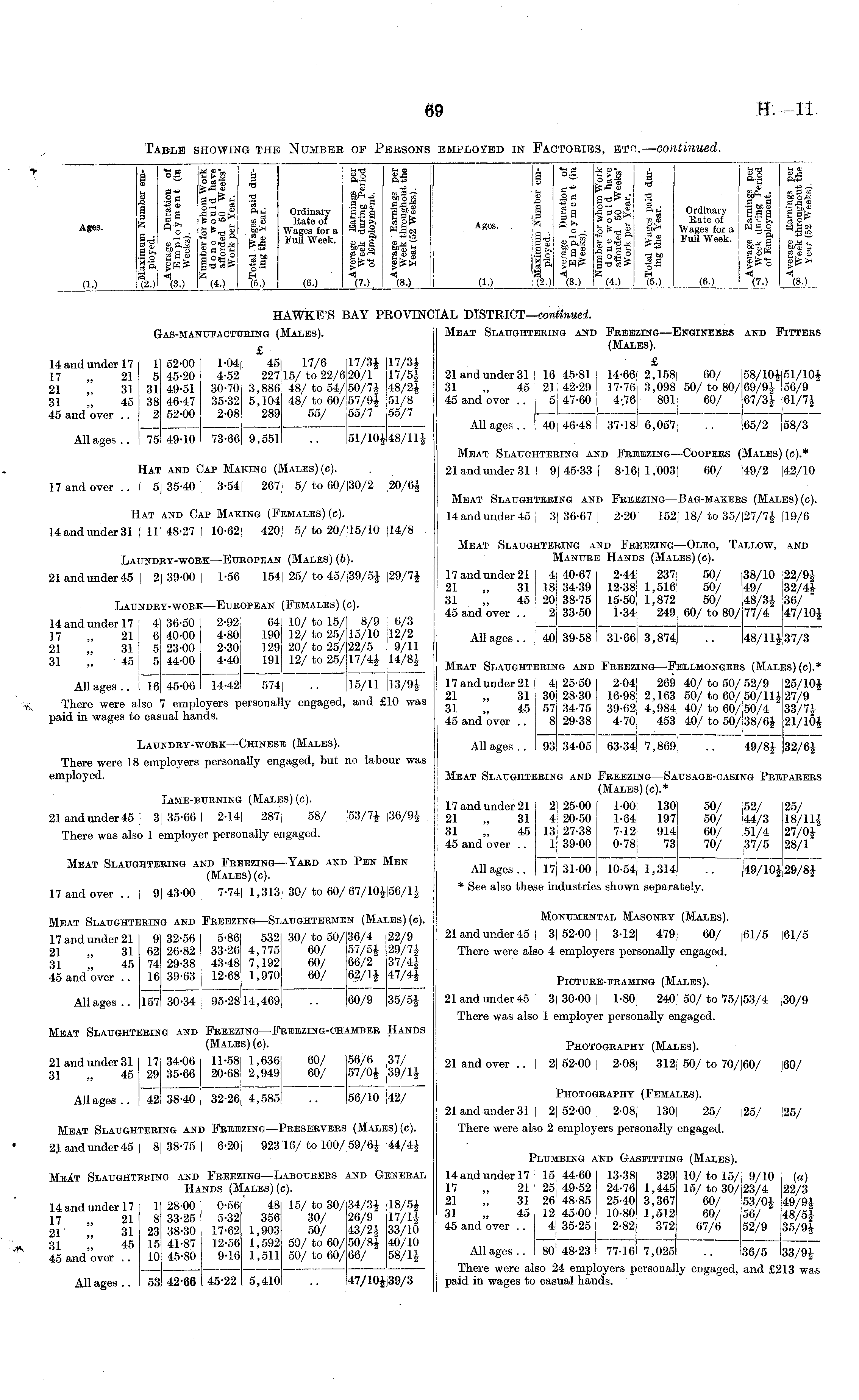 Ages. a °- 9 9 o pj a '■§* 3 Bfl a • .2flrO co flo £iO,os 9 Sa, °P A, 03 .So gB« gfl, gHr= a 1 4 (2.)! (3.) ■3 >"" P es it }S-fl o S-O-" 1 ti O-" * ■fl fl°iS is o>°^ — tr IH o J--? -°5oc3 r, (*■) a _ flu-l Six rt OH Us ■a to £a o "* %.) %si ts 03 a w>g Ordinary fl fl a Rate of a '§ >> Wages for a _ ■§ Full Week. „,. a gt?(6.) *"(7.) 03% A% til CO OP-f-HflCM HH IO o>_ — CMiT, In ££$ gr-Jrl Hj (80 Ages. a o OH a y, H I- __ ss Sa Ofl.3 ga| SJHP 4 (80 _ 8> _ l|o ** te . 12 P S -fl fl©_t! -S '° A -- a.-__i y a.) £ _• rs Ail „ m oi sx fi o -33S3 HH -3 bo ,§ fl o — %.) Ordinary ltate of Wages for a V ull Week. 03 §&** ■3 tU0<D S.5S *H O r_ _ hs 4 (7.) fc- 03 03 r* co S «" MlOrflrfl 9 '5 3-5 *- Sr> |_3 fl M 0. M , . to ; - £«)■) gft-X 4 (80 (10 (1.) (6.) HAWKE'S BAY PROVHSP _L DISTRICT— continued. Gas-manueacturing (Males). Meat Slaughtering and Freezing—Engineers and Fitters (Males). £ Hand under 17 1 152-00 l-04[ 45| 17/6 17/3$ 17/3$ 17 „ 21 5 45-20 4-52 22715/to 22/620/1 17/5$ 21 „ 31 3149-51 30-70' 3,886 48/to 54/50/7$ 48/2$ 31 „ 45 38 46-47 35-321 5,104 48/to 60/57/9$ 51/8 45 and over .. 2 52-00 2-08 ! 289 55/ 55/7 55/7 Allages.. 75 49-10 73-66] 9,551 .. 51/10$48/11$ £ 21 and under 31 I 16 45-81 ] 14-66 2,158 60/ 58/10$ 51/10* 31 „ 45i 21 42-29! 17-76 3,098! 50/to 80/69/9$ 56/9 45 and over .. 5 47-60 1 4-76 801! 60/ 67/3$ 61/7$ Allages.. 40 46-48 1 37-18 6,057| .. 65/2 58/3 Hat and Cap Making (Males) (c). 17 and over .. I 5] 35-40 | 3-54! 267J 5/ to 60/(30/2 (20/6$ Meat Slaughtering and Freezing—Coopers (Males) (c).* 21 and under 31 i 9(45-33] 8-16(1,003] 60/ [49/2 [42/10 Hat and Cap Making (Females) (c). 14andunder31 | 11| 48-27 | 10-621 420| 5/ to 20/|15/10 (14/8 Meat Slaughtering and Freezing—Bag-makers (Males) (c). 14 and under 45] 3] 36-67 I 2-20] 162] 18/ to 35/(27/7$- (19/6 Laundry-work—European (Males) (6). 21 and under 45 ] 2| 39-00 [ 1-56 154] 25/to 45/|39/5$ f29/7$ Meat Slaughtering and Freezing—Oleo, Tallow, and Manure Hands (Males) (c). 17 and under 21 4 40-67 2-44 237; 50/ 38/10 22/9$ 21 „ 31 18 34-39 12-38 1,516 50/ 49/ ,32/4$ 31 „ 45 20 38-75 15-50 1,872 50/ 48/3$ ! 36/ 45 and over .. 2 33-50 1-34 249 60/ to 80/ 77/4 47/10$ Allages.. 40S 39-58 31-66 3,874 .. 48/ll$37/3 4 18 20 2 Laundry-work—European (Females) (c). 14 and under 17: 4 36-50 2-92: 64 10/to 15/ 8/9 6/3 17 „ 21 : 6 40-00 4-801 190 12/ to 25/15/10 12/2 21 „ 31 5 23-00 2-30 129 20/to 25/22/5 9/11 31 „ '45 5 44-00 4-40; 191 12/ to 25/17/4$ 14/8$ Allages.. .16 45-06 14-42! 574 .. 1.5/11 13/9$ There were also 7 employers personally engaged, and £10 was paid in wages to casual hands. Meat Slaughtering and Freezing—Fellmongers (Males) (c).* 17 and under 21 4| 25-50 2-04] 269 40/to 50/52/9 25/10$ 21 „ 31 30 28-30 16-98 2,163] 50/to 60/50/11$ 27/9 31 „ 45 57 34-75 39-62 4,984 40/ to 60/50/4 33/7$ 45 and over .. 8 29-38 4-70 453 40/ to 50/.38/6$ 21/10$ Allages.. 93 34-05 63-34 7,869 .. ]49/8$ 32/6$ ' I 40! Laundry-work—Chinese (Males). There were 18 employers personally engaged, but no labour was employed. Meat Slaughtering and Freezing—Sausage-casing Preparers (Males) (c).* 17 and under 21 2 25-00 1-00 130 50/ 52/ 25/ 21 „ 31 4 20-50 1-64 197 50/ 44/3 18/11-5 31 „ 45 13 27-38 7-12 914 60/ 51/4 27/0$" 45 and over .. 1 39-00 0-78 73 70/ 37/5 28/1 Allages.. 17 31-00 10-54 1,314 .. 49/10$29/8$ * See also these industries shown separately. LlME-BURNING (MALES) (c). 21andunder45l 3(36-66 1 2-HJ 287! 58/ |53/7$ |36/9$ There was also 1 employer personally engaged. Meat Slaughtering and Freezing—Yard and Pen Men (Males) (c). Handover .. | 9)43-00] 7-74] 1,313| 30/ to 60/[67/10$j56/l$ Meat Slaughtering and Freezing—Slaughtermen (Males) (c). Monumental Masonry (Males). 21 and under 45 ] 3(52-00] 3-12] 479] 60/ ]61/5 J61/5 17 and under 21 9 32-56 5-86 532 30/ to 50/|36/4 22/9 21 , 31 62 26-82 33-26 4,775 60/ ]57/5$ 29/7$ 31 „ 45 74 29-38 43-48 7,192 60/ 66/2 37/4$ 45 and over.. 16 39-63 12-68 1,970 60/ 62/1$ 47/4$ Allages.. 157 30-34 95-2814,469 .. 60/9 35/5$ There were also 4 employers personally engaged. Picture-framing (Males). 21 and under 45 j 3)30-00] 1-80] 240! 50/ to 75/|53/4 j30/9 Meat Slaughtering and Freezing—Freezing-chamber Hands (Males) (c). 21 and under 31 17 34-06] 11-58 1,636 60/ 56/6 37/ 31 „ 45 29 35-66 I 20-68 2,949 60/ 57/0$ 39/1$ Allages.. 42 38-40 I 32-26 4,585 .. 56/10 [42/ There was also 1 employer personally engaged. Photography (Males). 21 and over .. I 2] 52-00 [ 2-08| 312] 50/ to 70/(60/ |60/ Photography (Females). Meat Slaughtering and Freezing—Preservers (Males) (c). 21 and under 45 | 8] 38-75 j 6-20] 923(16/ to 100/]59/6$ |44/4$ 21 and under 31 j 2) 52-00 1 2-08J 130] 25/ |25/ (25/ There were also 2 employers personally engaged. Meat Slaughtering and Freezing—Labourers and General Hands (Males) (c). HandunderH 1 28-00] 0-56' 48 15/to 30/34/3$ 18/5$ 17 21 8 33-25 5-32 356 30/ 26/9 17/1$ 21 " 31 23 38-30 17-62 1,903 50/ 43/2$ 33/10 31 45 15 41-87 12-56 1,592 50/ to 60/ 50/8$ 40/10 45 and'over .. 10 45-80 9-16 1,511 50/to 60/66/ 58/1$ Allages.. 53 42-66 45-22 5,410 .. 47/10$39/3 Plumbing and Gaspitting (Males). HandunderH 15 44-60 13-38 329 10/to 15/ 9/10 («) 17 „ 21 25 49-52 24-76 1,445 15/ to 30/23/4 22/3 21 „ 31 26 48-85 25-40 3,367 60/ ! 53/0$ 49/9* 31 „ 45 12 45-00 10-80 1,512 60/ 56/ 48/5$ 45 and over .. 4 35-25 2-82 372 67/6 52/9 35/9$ Allages.. 80 48-23 77-16 7,025 .. :36/5 33/9$ There were also 24 employers personally engaged, and £213 was paid in wages to casual hands.