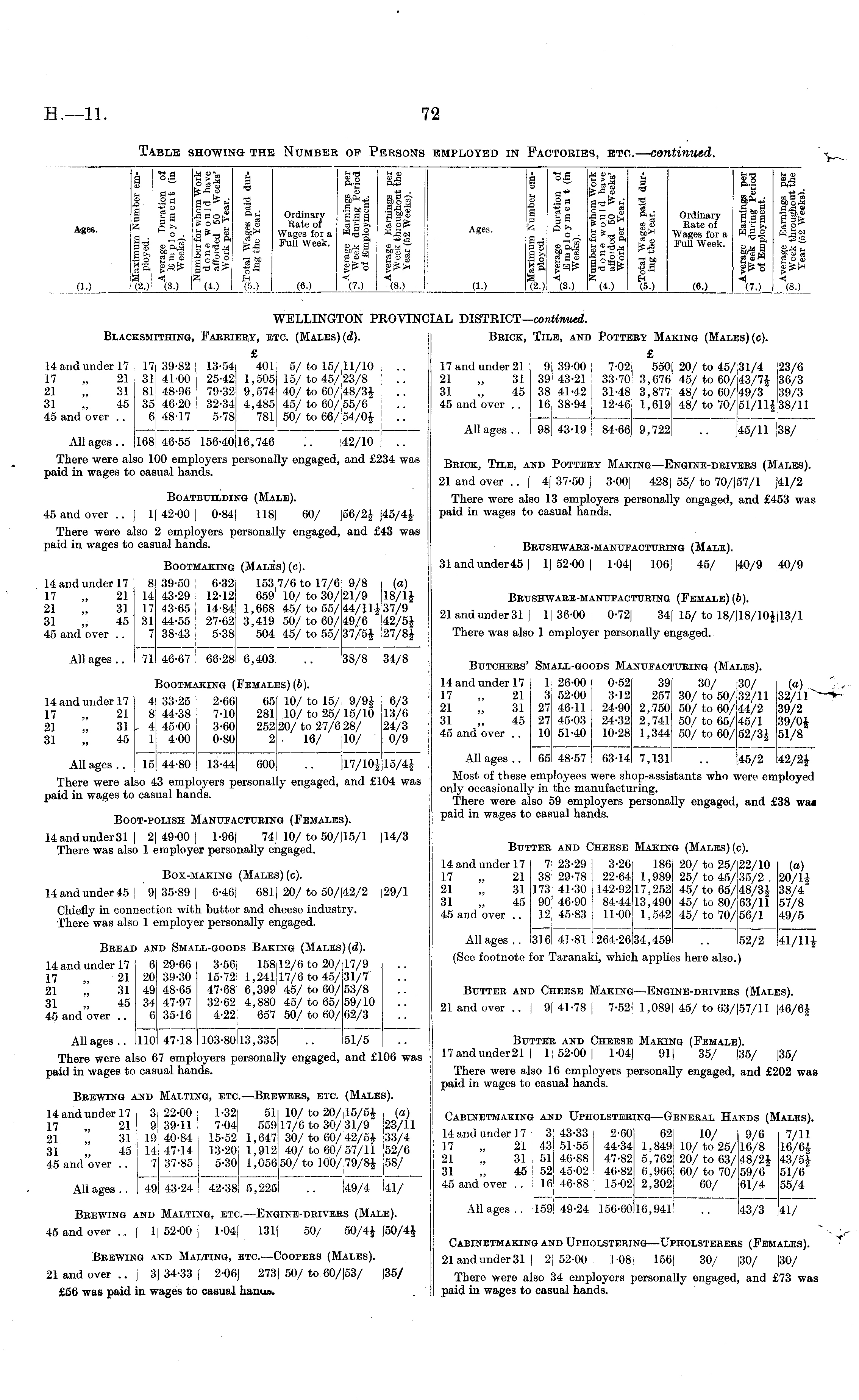A-ges. (1.) a °S Up : ah. gag £ .2 fl fl ts h- ti 93 AH 00 A " CO y. 3>, iso'° fH fi S" IH ft g fl • °~ £ V. t 3-0 0o3 So' gSo -egoo r, f Hj y (20 ! (3.) (4.) rH 3 ■fl •zi „ ftrJ w L t * S 0-S-fl r— -3 60 £ fl Q .-H H (5.) Ordinary Itate of Wages for a !ull Week. Kg 9 CM^HH .3,0 S g.sa OS fl >, gb-'S Hj (7.) fit mMc, : ■** m III gr*** 4 (80 Ages. (1-) a 03 S3 B a ft S-; fllu II r, (2.) o.9 c* SB 3h O Is Pr-fli-M cfgS r- *" _ ?Hr 4 (3.) 03 " M O^ SSlr> (H SS flo£J |-fl c0l> y (40 3 •a S P.IH 03 OS OH 93 CM S a o — H (5.) Ordinary Kate of Wages for a Full Week. ts SS _ sShh all B.aa gflV =3 fl r". CO O'' S*s*s S-sIhh Hj Hj (7.) (8.) (6.) (6.) WELLINGTON PROVINI !IAL DISTRICT— continued. Blacksmithing, Farriery, etc. (Males) (d). £ HandunderH 17i 39-82 j 13-54 401 5/ to 15/ill/10 17 „ 21 31 41-00 25-42 1,505 15/ to 45/23/8 21 „ 31 81] 48-96 79-32 9,574 40/to 60/48/3$ 31 „ 45 35 46-20 | 32-34 4,485 45/to 60/55/6 45 and over .. o, 48-17 ] 5-78 781 50/ to 66/54/0$ All ages .. 168] 46-55 ' 156-40 16,746 .. ]42/10 | .. Brick, Tile, and Pottery Making (Males) (c). £ 17 and under 21 9 39-00: 7-02 550 20/to 45/31/4 23/6 21 „ 31 39 43-21' 33-70 3,676 45/to 60/43/7$ 36/3 31 „ 45 38 41-42 ; 31-48 3,877 48/to 60/49/3 39/3 45 and over .. 16 38-94 j 12-46 1,619 48/to 70/51/11$ 38/11 Allages.. 98 43-19 84-66 9,722 .. 45/11 38/ There were also 100 employers personally engaged, and £234 was paid in wages to casual hands. Boatbuilding (Male). 45 and over..] 1| 42-00 | 0-84| 118) 60/ |56/2$ |45/4$ There were also 2 employers personally engaged, and £43 was paid in wages to casual hands. Brick, Tile, and Pottery Making—Engine-drivers (Males). 21 and over .. | 4| 37-50 J 3-00] 428] 55/ to 70/(57/1 J41/2 There were also 13 employers personally engaged, and £453 was paid in wages to casual hands. Brushw are -manufacturing (Male). Bootmaking (Males) (c). 14 and under 17 8 39-50 6-32 153,7/6 to 17/6 9/8 i (a) 17 „ 21 14 43-29 12-12] 659] 10/to 30/21/9 !l8/l$ 21 „ 31 17 43-65 14-84! 1,668 45/to 55/44/11$ 37/9 31 „ 45 31 44-55 27-62 3,419 50/to 60/49/6 |42/5$ 45 and over .. 7 38-43 5-38 504 45/ to 55/ 37/5$ !27/8$ Allages.. 71 46-67 66-28 6,403 ! .. 38/8 34/8 31andunder45| 1| 52-00 ] 1-04| 106) 45/ |40/9 40/9 S 14 17 31 7 Brushw are-manufacturing (Female) (6). 21andunder31 | 1| 36-00 0-72| 34] 15/ to 18/|18/10$|13/1 There was also 1 employer personally engaged. Bootmaking (Females) (b). HandunderH 4 33-25 1 2-66 65 10/ to 15/. 9/9$ 6/3 17 „ 21 8 44-38 : 7-10 281 10/ to 25/15/10 13/6 21 „ 31 ,. 4 45-00 3-60 252 20/ to 27/6 28/ 24/3 31 „ 45 1 4-00 0-80 2 - 16/ ,10/ 0/9 Allages.. 15 44-80 13-44 600 .. |l7/10$ 15/4$ There were also 43 employers personally engaged, and £104 was paid in wages to casual hands. 71 Butchers' Small-goods Manufacturing (Males). 14 and under 17 ] 1 26-00 0-52 39 30/ 30/ (a) 17 „ 21 3 52-00 3-12 257 30/to 50/32/11 32/ir~"»21 „ 31 27 46-11 24-90 2,750 50/to 60/44/2 39/2 31 „ 45 27 45-03 24-32 2,741 50/to 65/45/1 39/0$ 45 and over .. 10 51-40 10-28 1,344 50/to 60/52/3$ 51/8 Allages.. 65 48-57 63-14 7,131 .. 45/2 42/2$ Most of these employees were shop-assistants who were employed only occasionally in the manufacturing. There were also 59 employers personally engaged, and £38 waa paid in wages to casual hands. Boot-polish Manufacturing (Females). 14 and under 31 | 21 49-00 | 1-96) 74) 10/to 50/|15/l |14/3 There was also 1 employer personally engaged. Butter and Cheese Making (Males) (c). 14 and under 17 7 23-29 3-26 186 20/ to 25/22/10 (a) 17 „ 21 38 29-78 22-64 1,989 25/ to 45/ 35/2 . 20/1$ 21 „ 31 173 41-30 142-9217,252 45/to 65/48/3$ 38/4 31 „ 45 90 46-90 84-4413,490 45/to 80/63/11 57/8 45 and over .. 12 45-83 11-00 1,542 45/to 70/56/1 49/5 Allages.. 316 41-81 264-26 34,459 .. 52/2 41/11$ (See footnote for Taranaki, which applies here also.) Box-making (Males) (c). 14andunder45 | 9] 35-89 | 6-46] 681| 20/ to 50/|42/2 |29/1 Chiefly in connection with butter and cheese industry. There was also 1 employer personally engaged. Bread and Small-goods Baking (Males) (d). 14 and under 17 6 29-66 3-56 158 12/6 to 20/17/9 17 „ 21 20 39-30 15-72 1,24117/6 to 45/31/7 21 „ 31 49 48-65 47-68 6,399 45/to 60/53/8 31 „ 45 34 47-97 32-62 4,880 45/ to 65/ 59/10 45 and over .. 6 35-16 4-22 657 50/ to 60/ 62/3 Allages.. 110 47-18 103-8013,335 .. 51/5 There were also 67 employers personally engaged, and £106 was paid in wages to casual hands. Butter and Cheese Making—Engine-drivers (Males). 21 and over.. ! 9] 41-78 | 7-52| 1,089| 45/ to 63/|57/ll ]46/6$ Butter, and Cheese Making (Female). 17andunder21 | lj 52-00 | 1-04| 91| 35/ |35/ |35/ There were also 16 employers personally engaged, and £202 was paid in wages to casual hands. Brewing and Malting, etc. —Brewers, etc. (Males). HandunderH 3 22-00 1-32 5110/10 20/15/5$: (a) 17 „ 21 9 39-11 7-04 55917/6 to 30/31/9 23/11 21 „ 31 19 40-84 15-52 1,647 30/to 60/42/5* 33/4 31 „ 45 14 47-14 13-20 1,912 40/ to 60/57/11 52/6 45 and over .. 7 37-85 5-30 1,056 50/to 100/79/8$ 58/ Allages.. 49 43-24 42-38 5,225 .. J49/4 41/ Cabinetmaking and Upholstering—General Hands (Males). 14 and under 17 j 3] 43-33 2-60 62 10/ 9/6 7/11 17 „ 21 ] 43 51-55 44-34 1,849 10/to 25/16/8 16/6$ 21 „ 31! 51 46-88 47-82 5,762 20/to 63/48/2$ 43/5$ 31 „ 45! 52 45-02 ! 46-82 6,966 60/to 70/59/6 51/6" 45 and over .. : 16 1 46-88 i 15-02 60/ 61/4 55/4 Allages.. 159J 49-24 ! 156-6016,944 .. |43/3 41/ Brewing and Malting, etc. —Engine-drivers (Male). 45 and over .. | 1] 52-00 | 1-04| 131| 50/ 50/4$ (50/4$ Cabinetmaking and Upholstering—Upholsterers (Females). 21andunder31 | 2| 52-00 1-08| 156| 30/ |30/ |30/ There were also 34 employers personally engaged, and £73 was paid in wages to casual hands. Brewing and Malting, etc.—Coopers (Males). 21 and over .. J 3| 34-33 | 2-06) 273| 50/ to 60/|53/ (35/ £56 was paid in wages to casual hanuo.