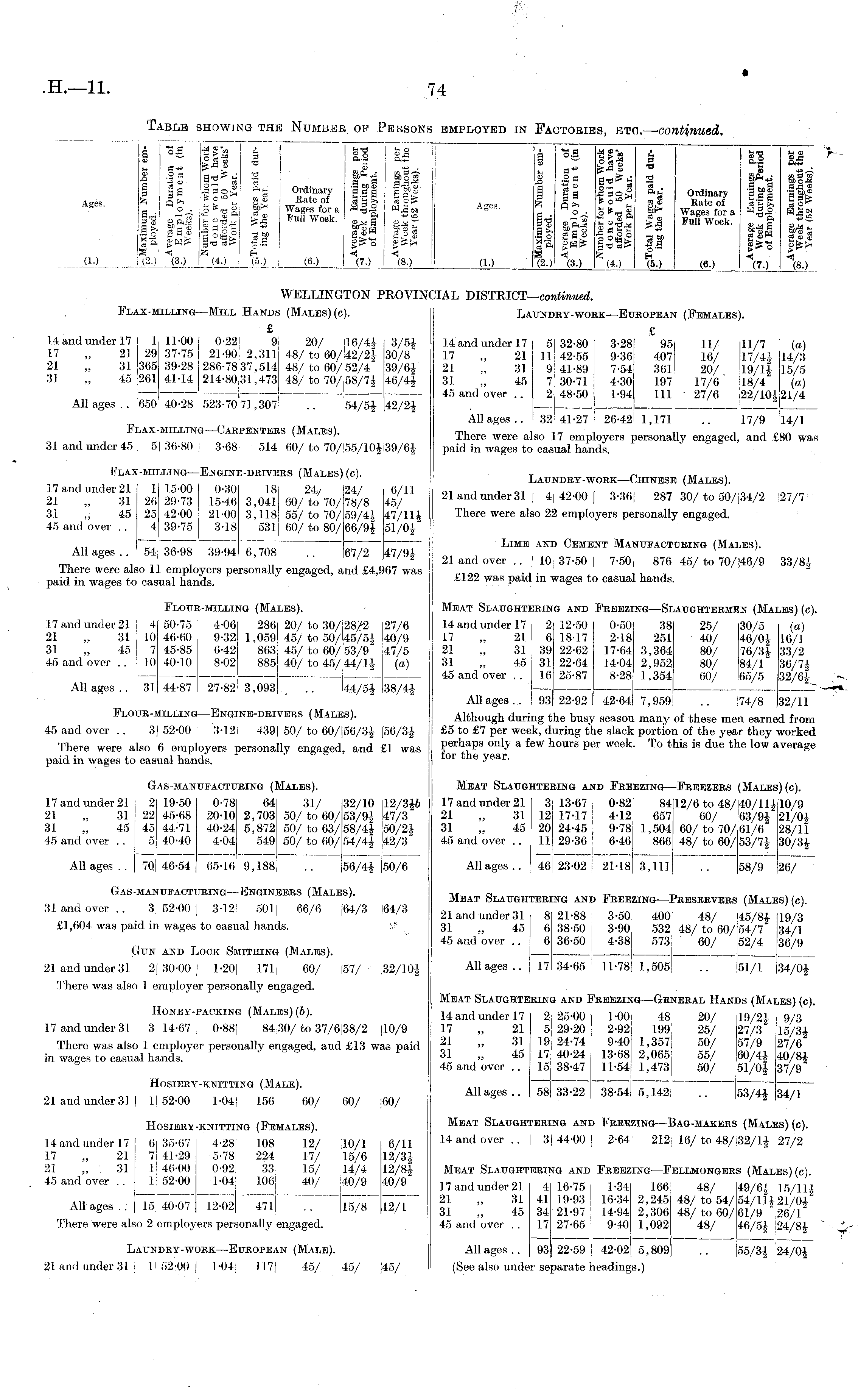 Ages. a o§ 9 r5 q >> fl -! °~ 3 -fl a, ~SS "h H gal cofl- gmsz S Hj i (20 (3.) 3S P "/j fill ifSS OH §2* £*%& 'SSSSpss •a SS 3 o S os 9t£ 3-d COry, (4.) a ! ■zi ft JJ [ Ordinary _ 9 i Rate of to>* Wages for a _\ S Full 'Week. '3 £P H (5.) (6.) HI I II a* ag-j •SmS .a-fl-2 g.aa Sa£ CO fl >, c0 Ot> A +Jio 03 M 3 9 JoA ""* CS 03 " (d o OS g&O »ir Hj Hj (7.) (8.) Ages. 90 HH £ a B y lis Jj& S (2.) S3 fl-^ O p sa a<* ° aS 00 p.H S 3fi 4 (3.) o*r» O m3S £ 2 co r*- S BTsfe £ o— rt to^ .S^rH a-Sfl gfJ Sr' (40 a -fl "c0 . a. tn Ordinary g o Rate of tsffrs Wages for a gjjj Full Week. £ fl O"" (SO (6.) c 9 fl fl ■« too m n %i Si-Sri OS roW |r-"S Hj (70 Ih SO 90X3 air? = -fl s Sflfc 0! P H |S CM-93 « 4 (8.) (1.) (1.) WELLINGTON PROVINi TAL DISTRICT— continued. Flax-milling—Mill Hands (Males) (c). Laundry-work—European (Females). £ 14 and under 17 1 11-00 0-22 9 20/ 116/4* 3/5$ 17 „ 21 29 37-75 21-90 2,311 48/ to 60/142/21 30/8 21 „ 31 365 39-28 286-7837,514 48/to 60/J52/4" 39/6$ 31 „ 45 261 41-14 214-80 31,473 48/ to 70/58/7$ 46/4$ Allages.. 650 40-28 523-70 71,307 ! .. 54/5$ 42/2$ £ 14 and under 17 5] 32-80 3-28 95 11/ 11/7 ] (a) 17 ,. 21 111 42-55 9-36 407 16/ 17/4$ 14/3 21 „ 31 9 41-89 7-54 361 20/ 19/1$ 15/5 31 „ 45 7 30-71 i 4-30 197 17/6 '18/4" (a) 45 and over.. 2 48-50; 1-94 111 27/6 !22/10$21/4 Allages.. 32 41-27: 26-42 1,171 .. 17/9 14/1 There were also 17 employers personally engaged, and £80 was paid in wages to casual hands. Flax-milling—Carpenters (Males). 31 and under 45 51 36-80 j 3-68, 514 60/ to 70/|55/10$i39/6$ Flax-milling—Engine-drivers (Males) (c). 17 and under 21 1 15-00 0-30 18 24/ 124/ 6/11 21 „ 31 26 29-73 15-46 3,041 60/to 70/78/8 45/ 31 „ 45 25 42-00 21-00 3,118 55/to 70/59/4$ 47/11$ 45 and over .. 4 39-75 3-18 531 60/ to 80/ 66/9$ 51/0$' Allages.. 54 36-98 39-94 6,708 .. 67/2 47/9$ There were also 11 employers personally engaged, and £4,967 was paid in wages to casual hands. Laundry-work—Chinese (Males). 21 and under 31 i 4] 42-00 ( 3-36] 287; 30/ to 50/34/2 27/7 There were also 22 employers personally engaged. Lime and Cement Manufacturing (Males). 21 and over . . | 10] 37-50 | 7-50| 876 45/ to 70/|46/9 33/8$ £122 was paid in wages to casual hands. Flour-milling (Males). 17 and under 21 ! 4 50-75 4-06 286 20/to 30/28/2 27/6 21 „ 31 ! 10 46-60 9-32 1,059 45/to 50/45/5$ 40/9 31 „ 45 7 45-85 6-42 863 45/ to 60/ 53/9 47/5 45 and over .. 10 40-10 8-02 885 40/ to 45/ 44/1$ (a) Allages.. 3.1 44-87 27-82 1 3,093 .. 44/5$ 38/4$ Meat Slaughtering and Freezing—Slaughtermen (Males) (c). HandunderH 2 12-50 0-50 38 25/ 30/5 (a) H „ 21 6 18-17 2-18 251 40/ 46/0$ 16/1 21 „ 31 39 22-62 17-64 3,364 80/ 76/3$ 33/2 31 „ 45 31 22-64 14-04 2,952 80/ 84/1 36/7$ 45 and over.. 16 25-87 8-28 1,354 60/ 65/5 32/6$ Allages.. 93 22-92 42-64 7,959] .. 74/8 32/11 Although during the busy season many of these men earned from £5 to £7 per week, during the slack portion of the year they worked perhaps only a few hours per week. To this is due the low average for the year. Flour-milling—Engine-drivers (Males). 45 and over.. 3152-00 3-l2i 439] 50/ to 60/56/3$ (56/3$ There were also 6 employers personally engaged, and £1 was paid in wages to casual hands. Gas-manufacturing (Males). 17 and under 21 ; 2 19-50 0-78 64 31/ 32/10 12/3$6 21 „ 31 i 22 45-68 20-1.0 2,703 50/to 60/53/9$ 47/3 31 „ 45 45 44-71 40-24 5,872 50/ to 63/ 58/4* 50/2$ 45 and over .. 5 40-40 4-04 549 50/ to 60/ 54/4$ 42/3 Allages.. 70 46-54 65-16 9,188 .. 56/4$ 50/6 Meat Slaughtering and Freezing—Freezers (Males) (c). 17 and under 21 3 13-67: 0-82 84 12/6 to 48/40/11$ 10/9 21 „ 31 12 17-17 ] 4-12 657 60/ 63/9$ 21/0* 31 „ 45 20 24-45] 9-78 1,504 60/to 70/61/6 28/11 45 and over .. 11 29-36! 6-46 866 48/to 60/53/7$ 30/3$ Allages.. 23-02 j 21-18 3,111 .. 58/9 26/ GAS-MANUFACTURING—ENGINEERS (MALES). 31 and over.. 3 52-00] 3-12 501] 66/6 J64/3 164/3 £1,604 was paid in wages to casual hands. Meat Slaughtering and Freezing—Preservers (Males) (c). 21 and under 31 ; 8 21-88 3-50 400 48/ 45/8$ 19/3 31 „ 45 | 6 38-50 ] 3-90 532 48/ to 60/ 54/7 34/1 45 and over .. I 6 36-50 I 4-38 573 60/ 52/4 36/9 Allages.. i 17 34-65 11-78! 1,505 .. 51/1 34/0$ Gun and Look Smithing (Males). 21 and under 31 2] 30-00 | 1-20] 171] 60/ |57/ 32/10$ There was also 1 employer personally engaged. Meat Slaughtering and Freezing—General Hands (Males) (c). 14 and under 17 2,25-00 1-00 48 20/ 19/2$ 9/3 17 „ 21 5 29-20 2-92 199! 25/ 27/3' 15/3$ 21 „ 31 19 24-74 9-40 1,357! 50/ 57/9 27/6 31 „ 45 17 40-24 13-68 2,065. 55/ 60/4$ 40/8$ 45 and over.. 15 38-47 11-54 1,473 50/ 51/0$ 37/9 Allages.. 58 33-22 38-54] 5,142] .. 53/4$ 34/1 Honey -packing (Males) (b). 17 and under 31 3 14-67 0-88] 84 30/to 37/6]38/2 [10/9 There was also 1 employer personally engaged, and £13 was paid in wages to casual hands. Hosiery-knitting (Male). 21 and under 31 | 11 52-00 104; 156 60/ 60/ [60/ Hosiery-knitting (Females). HandunderH 6; 35-67 4-28 108 12/ 10/1 6/11 17 „ 21 7! 41-29 5-78 224 17/ 15/6 12/3$ 21 „ 31 1 46-00 0-92 33 15/ 14/4 12/8$ 45 and over.. 1; 52-00 1-04 106 40/ 40/9 40/9 All ages .. 15 40-07 12-02 471 .. 15/8 12/1 Meat Slaughtering and Freezing—Bag-makers (Males) (c). 14 and over .. ] 3] 44-00 1 2-64 212 16/ to 48/32/1$ 27/2 Meat Slaughtering and Freezing—Fellmongers (Males) (c). 17 and under 21 4 16-75 I 1-34 166 48/ 49/6$ 15/11$ 21 „ 31 41 19-93 j 16-34 2,245 48/to 54/54/ll* ! 21/0'" 31 „ 45 34 21-97 14-94 2,306 48/to 60/61/9 * 26/1 45 and over .. 17 27-65 9-40 1,092 48/ 46/5$ 24/8$ Allages.. 93 22-59] 42-02] 5,809 .. 55/3$ 24/OJ (See also under separate headings.) There were also 2 employers personally engaged. Laundry-work—European (Male). 21 and under 31 11 52-00 | 1-04 117| 45/ 45/ (45/