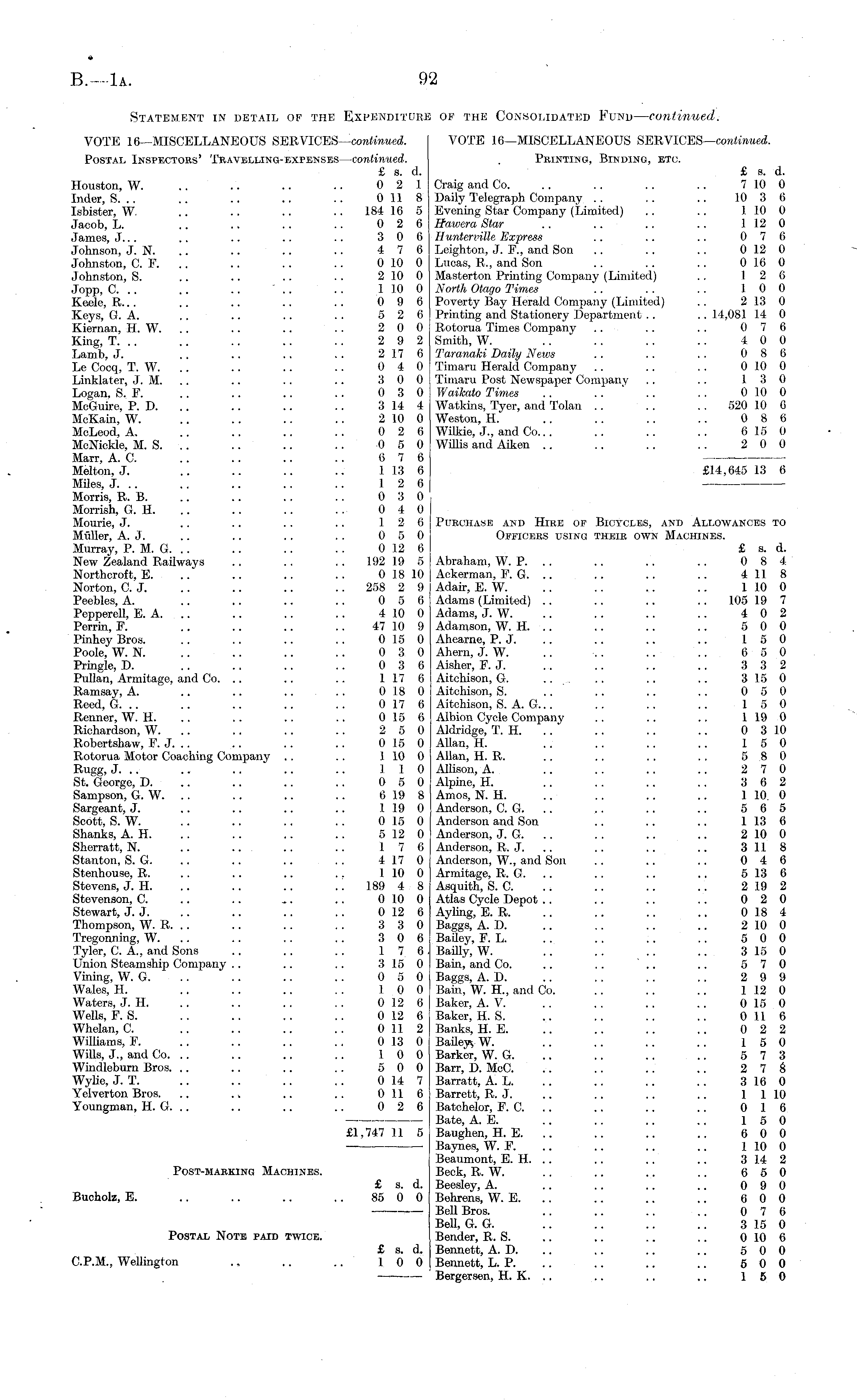 Statement in detail of the Expenditure of the Consolidated Fund — continued. VOTE 16—MISCELLANEOUS SERVlCES— continued. VOTE 16—MISCELLANEOUS SERVlCES—continued. Postal Inspectors' Travelling-expenses— continued. Printing, Binding, etc. £ s. d. £ s. d. Houston, W. .. .. .. .. 0 2 1 Craig and Co. .. .. .. .. 710 0 Inder, S. .. .. .. .. .. Oil 8 Daily Telegraph Company .. .. .. 10 3 6 Isbister, W. .. .. .. 184 16 5 Evening Star Company (Limited) .. .. 110 0 Jacob, L. .. .. .. .. 0 2 6 Sawera Star .. .. .. .. 1 12 0 James, J. .. .. .. .. .. 3 0 6 Hunterville Express .. .. .. 0 7 6 Johnson, J. N. .. .. .. 4 7 6 Leighton, J. F., and Son .. .. .. 012 0 Johnston, C. F. .. .. .. .. 010 0 Lucas, R., and Son .. .. .. 016 0 Johnston, S. .. .. .. .. 210 0 Masterton Printing Company (Limited) .. 1 2 0 Jopp, C. .. .. .. .. .. 110 0 North Otago Times .. .. .. 10 0 Keele, R... .. .. .. 0 9 6 Poverty Bay Herald Company (Limited) .. 213 0 Keys, G. A. .. .. .. . . 5 2 6 Printing and Stationery Department .. .. 14,081 14 0 Kiernan, H. W. .. .. .. . • 2 0 0 Rotorua Times Company .. . . . . 0 7 6 King, T. .. .. .. .. .. 2 9 2 Smith, W. .. .. .. .. 4 0 0 Lamb, J. .. .. .. . . 217 6 Taranaki Daily News .. .. .. 0 8 6 Le Cocq, T. W. .. .. .. .. 0 4 0 Timaru Herald Company .. .. .. 010 0 Linklater, J. M. .. .. .. 3 0 0 Timaru Post Newspaper Company .. .. 13 0 Logan, S. F. .. .. .. .. 0 3 0 Waikato Times .. .. .. .. 010 0 MoGuire, P. D. .. .. .. 314 4 Watkins, Tyer, and Tolan .. .. .. 520 10 6 MoKain, W. .. .. .. .. 210 0 Weston, H. .. .. .. .. 0 8 6 McLeod, A. .. .. .. .. 0 2 6 Wilkie, J., and C 0... ~ .. .. 6 15 0 MoNiokle, M. S. .. .. .. .. 0 5 0 Willis and Aiken .. .. .. .. 2 0 0 Marr, A. C. .. .. .. .. 6 7 6 Melton, J. .. .. .. .. 1 13 6 £14,645 13 6 Miles, J. .. .. .. .. .. 12 6 Morris, R. B. .. .. .. .. 0 3 0 Morrish, G. H. .. .. .. . . 0 4 0 Mourie, J. .. .. .. .. 12 6 Purchase and Hire of Bicycles, and Allowances to Muller, A. J. .. .. .. . . 0 5 0 Officers using their own Machines. Murray, P. M. G. ........ 0 12 6 £ s. d. New Zealand Railways .. .. .. 192 19 5 Abraham, W. P. .. .. .. .. 0 8 4 Northcroft, E. .. .. .. .. 0 18 10 Aokerman, F. G. .. .. .. .. 4 11 8 Norton, C. J. .. .. .. .. 258 2 9 | Adair, E. W. .. .. .. .. 110 0 Peebles, A. .. .. .. .. 0 5 6 Adams (Limited) .. .. .. 105 19 7 Pepperell, E. A. .. .. .. .. 410 0 Adams, J. W. .. .. .. .. 4 0 2 Perrin, F. .. .. .. .. 47 10 9 Adamson, W. H. .. .. .. .. 5 0 0 Pinhey Bros. .. .. .. .. 015 0 Ahearne, P. J. .. .. .. .. 15 0 Poole, W. N. .. .. .. .. 0 3 0 Ahem, J. W. .. .. .. .. 6 5 0 Pringle, D. .. .. .. .. 0 3 6 Aisher, F. J. .. .. .. .. 3 3 2 Pullan, Armitage, and Co. .. .. .. 1 17 6 Aitchison, G. .. . .. .. .. 3 15 0 Ramsay, A. .. .. .... 018 0 Aitchison, S. .. .. .. .. 050 Reed, G. .. .. .. .. .. 0 17 6 Aitchison, S. A. G... .. .. .. 15 0 Renner, W. H. .. .. .. .. 015 6 Albion Cycle Company .. .. .. 1 19 0 Richardson, W. .. .. .. .. 2 5 0 Aldridge, T. H. . . .. .. .. 0 310 Robertshaw, F. J. .. .. .. .. 015 0 Allan, H. .. .. .. .. 15 0 Rotorua Motor Coaching Company .. .. 110 0 Allan, H. R. .. .. .. .. 5 8 0 Rugg, J. .. .. .. .. .. 110 Allison, A. .. .. .. .. 2 7 0 St. George, D. .. .. .. .. 0 5 0 Alpine, H. .. .. .. .. 3 6 2 Sampson, G. W. .. .. .. .. 619 8 Amos, N. H. .. .. .. .. 1 10. 0 Sargeant, J. .. .. .. .. 119 0 Anderson, C. G. .. .. .. .. 5 6 5 Scott, S. W. . . .. .. .. 0 15 0 Anderson and Son .. .. .. 1 13 6 Shanks, A. H. .. .. .. .. 512 0 Anderson, J. G. .. .. .. .. 210 0 Sherratt, N. .. .. .. .. 17 6 Anderson, R. J. .. .. .. .. 311 8 Stanton, S. G. .. .. .. .. 4 17 0 Anderson, W., and Son .. .. .. 0 4 6 Stenhouse, R. .. .. .. .. 110 0 Armitage, R. G. .. .. .. .. 513 6 Stevens, J. H. .. .. .. 189 4 8 Asquith, S. C. .. .. .. .. 219 2 Stevenson, C. .. .. .. .. 010 0 Atlas Cycle Depot .. .. .. .. 0 2 0 Stewart, J. J. .. .. .. .. 012 6 Ayling, E. R. .. .. .. .. 018 4 Thompson, W. R. .. .. . . .. 3 3 0 Baggs, A. D. .. .. .. .. 210 0 Tregonning, W. .. .. .. .. 3 0 6 Bailey, F. L. .. .. .. .. 5 0 0 Tyler, C. A., and Sons .. . . .. 17 6. Bailly, W. .. .. .. .. 315 0 Union Steamship Company .. .. .. 3 15 0 Bain, and Co. .. .. .. .. 570 Vining, W. G. .. .. .. .. 0 5 0 Baggs, A. D. .. .. .. .. 2 9 9 Wales, H. .. .. .. .. 10 0 Bain, W. H., and Co. .. .. .. 112 0 Waters, J. H. .. .. .. .. 012 6 Baker, A. V. .. .. .. .. 015 0 Wells, F. S. .. .. .. .. 0 12 6 Baker, H. S. .. .. .. .. 0 11 6 Whelan, C. .. .. .. .. 0 11 2 Banks, H. E. .. .. .. .. 0 2 2 Williams, F. .. .. .. .. 013 0 Bailey, W. .. .. .. .. 15 0 Wills, J., and Co. .. .. .. .. 10 0 Barker, W. G. .. .. .. .. 5 7 3 Windleburn Bros. .. .. .. .. 5 0 0 Barr, D. McC. .. .. .. .. 2 7 $ Wylie, J. T. .. .. .. .. 014 7 Barratt, A. L. .. .. .. .. 316 0 Yelverton Bros. .. .. .. .. 011 6 Barrett, R. J. .. .. .. .. 1 110 Youngman, H. G. .. .. .. .. 0 2 6 Batchelor, F. C. .. .. .. .. 0 16 Bate, A. E. .. .. .. .. 15 0 £1,747 11 5 Baughen, H. E. .. .. .. .. 6 0 0 Baynes, W. F. .. .. .. .. 110 0 Beaumont, E. H. .. .. .. .. 3 14 2 Post-marking Machines. Beck, R. W. .. .. .. .. 6 5 0 £ s. d. Beesley, A. .. .. .. .. 0 9 0 Bucholz, E. .. .. .. .. 85 0 0 Behrens, W. E. .. .. .. .. 6 0 0 Bell Bros. .. .. .. .. 0 7 6 Bell, G. G. .. .. .. .. 3 15 0 Postal Note paid twice. Bender, R. S. .. .. .. .. 010 6 £ s. d. Bennett, A. D. .. .. .. .. 5 0 0 C.P.M., Wellington .. .. .. 10 0 Bennett, L. P. .. .. .. 5 0 0 — Bergersen, H. K. .. .. .. .. 15 0
