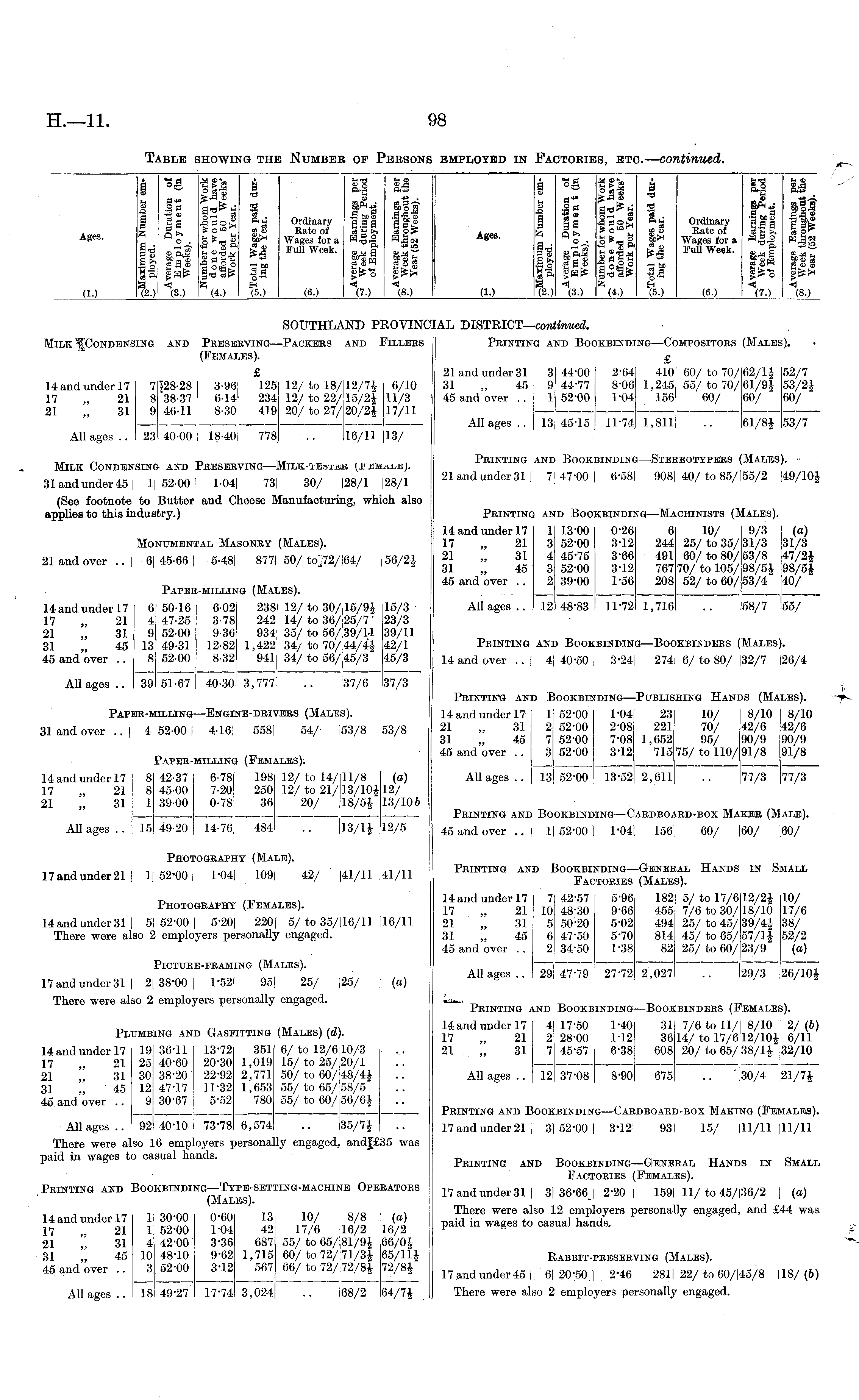 Ages. a °S o IH flH 3 i) .2 a 1 |a rH fl>> fl • .2~ 2 -a .. ~i 01 a o o ft^ 8 §i Sa S -so: £ e so 8ft gsi* a hi (2.) (3.) rt\f'3 ■ess* tH ts iS £ t ft is °-"P3S ■a 5 ° 3 a C| flfe-§-a aft y (4.) 3 •a 'cO ftlHcO &£ r=| 39 o — H <r.O Ordinary Rate of Wages for a Full Week. •hit) s| _ 9 SPHhh; SsmS B.a a a s ■» m3 p 9 __ _ efim £&S 4 (7.) -H _ lis m «s OfS H-> U5 "»__ w MTo _ ."■ s o-SrH H| (8.) Ages. a 03 rH 0. S3 B & I id a >- vs gft B (20 Org a* Sa ss sE °a-3. no a.a M r70 ca a o IH -a. 4 (3.) rM 9 " M ** te ■ 3**1 tn tti&iJ a °**te g-a es> y (4.) a •e '"* . ft tn Ordinary g o Rate of «»* Wages (or a £ £ FuU Week. "3 to £ Pi o'~ %■) (6J ■_ Br,^A „ a •B tM03 E.aa ei H >! III H| (7.) IH CD 93 JH ftS alt Bafe cS 2 H -flS |ia JtSfS Hi (8.) (10 (6.) (1.) SOUTHLAND PROVING AL DISTRICT— continued. Milk If Condensing and Preserving —Packers and Fillers (Females). £ HandunderH 7128-28 3-96: 125 12/to 18/12/7$ 6/10 17 „ 21 8 38-37 6-14 234 12/to 22/15/2$ 11/3 21 „ 31 9 46-11 8-30 419 20/to 27/20/2$ 17/11 Allages.. 23I40-00 18-4ol 778 .. 16/11 13/ Printing and Bookbinding—Compositors (Males). £ 21 and under 31 3 44-00 2'64 410 60/to 70/62/1$ 52/7 31 „ 45 9 44-77 8-06 1,245 55/ to 70/ 61/9* 53/2$ 45 and over .. 1 52-00 1'04 156 60/ 60/ 60/ Allages.. j 13 45-15 11-74 1,811 .. 61/8$ 53/7 Milk Condensing and Preserving—Milk-tei5tek (JjumaihE). 31andunder45| 1| 52-00 ( 1-04| 73) 30/ (28/1 (28/1 (See footnote to Butter and Cheese Manufacturing, which also applies to this industry.) Printing and Bookbinding—Stereotypers (Males). 21 and under 31 I 7(47-00) 6-581 908) 40/to 85/155/2 49/10$ Printing and Bookbinding—Machinists (Males). Monumental Masonry (Males). 21 and over.. I 6| 45-66 | 5-481 877| 50/to"_72/|64/ (56/2$ HandunderH 1 13-00 0-26 6 10/ 9/3 (a) 17 „ 21 3 52-00 3-12 244 25/ to 35/ 31/3 31/3 21 „ 31 4 45-75 3-66 491 60/ to 80/ 53/8 47/2$ 31 „ 45 3 52-00 3-12 767 70/ to 105/ 98/5$ 98/5$ 45 and over .. 2 39-00 1-56 208 52/to 60/53/4 40/ Allages.. 12 48-83 11*72 1,716 .. 58/7 55/ Paper-milling (Males). HandunderH 6 50-16 6-02 238: 12/to 30/15/9$ 15/3 17 „ 21 4 47-25 3-78 242 14/to 36/25/7 23/3 21 „ 31 9 52-00 9-36 934 35/to 56/39/11 39/11 31 „ 45 13 49-31 12-82 1,422 34/ to 70/ 44/4$ 42/1 45 and over.. 8 52-00 8-32 941 34/to 56/45/3 45/3 Allages.. 39 51-67 40-30 3,777 .. 37/6 37/3 Printing and Bookbinding—Bookbinders (Males). 14 and over .. ( 4[ 40-50 I 3-24] 274: 6/ to 80/ |32/7 (26/4 Paper-milling—-Engine-drivers (Males). 31 and over .. | 4) 52-00 I 4-16; 558) 54/ 153/8 )53/8 Printing and Bookbinding—Publishing Hands (Males). HandunderH 1 52'00 1'04 23 10/ 8/10 8/10 21 „ 31 2 52-00 2-08 221 70/ 42/6 42/6 31 „ 45 7 52-00 7-08 1,652 95/ 90/9 90/9 45 and over .. 3 52-00 3T2 715 75/to 110/91/8 91/8 Allages.. 13 52-00 13'52 2,611 .. 77/3 77/3 ~T^-Paper-milling (Females). HandunderH 8 42-37 6-78 198 12/to 14/11/8 (a) 17 „ 21 8 45-00 7-20 250 12/ to 21/13/10$ 12/ 21 „ 31 1 39-00 0-78 36 20/ 18/5$ 13/106 All ages .. 15 49-20 14-76 484 .. 13/1$ 12/5 Printing and Bookbinding—Cardboard-box Maker (Male). 45 and over ..( 1(52-00) 1*04) 156] 60/ (60/ (60/ Photography (Male). Printing and Bookbinding—General Hands in Small Factories (Males). 14 and under 17 7 42-57 5'96 182 5/to 17/6 12/2$ 10/ 17 „ 21 10 48-30 9-66 455 7/6 to 30/18/10 17/6 21 „ 31 5 50-20 5-02 494 25/ to 45/ 39/4$ 38/ 31 „ 45 6 47-50 5'70 814 45/to 65/57/1$ 52/2 45 and over .. 2 34-50 1-38 82 25/to 60/23/9 (a) Allages.. 29 47-79 27'72 2,027 .. 29/3 26/10$ 17 and under 21 I lj 52*00 j 1-041 109! 42/ ' |41/11 141/11 Photography (Females). 14andunder31 I 5) 52-00 j 5-201 220| 5/ to 35/116/11 (16/11 There were also 2 employers personally engaged. PlCTURE-ERAMING (MALES). 17 and under 31 I 2| 38-00 j 1-52| 95( 25/ (25/ | (a) There were also 2 employers personally engaged. Plumbing and Gaseitting (Males) (d). HandunderH 19 36-11 13-72 351 6/to 12/6.10/3 17 „ 21 25 40-60 20-30 1,019 15/ to 25/20/1 21 „ 31 30 38-20 22-92 2,771 50/to 60/(48/4$ 31 „ 45 12 47-17 11-32 1,653 55/ to 65/58/5 45 and over .. 9 30-67 5'52 780 55/ to 60/56/6$ Allages.. 92 40-10 73-78 6,574 .. 135/7$ There were also 16 employers personally engaged, andj[£35 was paid in wages to casual hands. Printing and Bookbinding—Bookbinders (Females). HandunderH 4 17*50 1-40 31 7/6 to 11/ 8/10 2/(6) 17 „ 21 2 28-00 1-12 3614/to 17/612/10$ 6/11 21 „ 31 7 45-57 6-38 608 20/to 65/38/1$ 32/10 All ages .. 12 37'08 8-90 675 .. 30/4 21/7$ Printing and Bookbinding—Cardboard-box Making (Females). 17andunder21 ( 3| 52-00 | 3-12 1 93j 15/ 111/11)11/11 Printing and Bookbinding—Type-setting-machine Operators (Males). Printing and Bookbinding—General Hands in Small Factories (Females). 17 and under 31 ( 3| 36-66J 2-20 | 159| 11/to 45/|36/2 | (a) There were also 12 employers personally engaged, and £44 was paid in wages to casual hands. HandunderH 1 30-00 0-60 13 10/ | 8/8 (a) 17 21 1 52-00 1-04 42 17/6 16/2 16/2 21 31 4 42-00 3-36 687 55/ to 65/81/9$ 66/0$ 31 „ 45 10 48-10 9-62 1,715 60/ to 72/71/3$ 65/11$ 45 and over .. 3 52-00 3-12 567 66/ to 72/j72/8$ 72/8$ Allages.. 18 49-27 17-74 3,024 .. 168/2 64/7$ Rabbit-preserving (Males). 17andunder45l 6[ 20*50.| 2*46( 281 ( 22/to 60/(45/8 (18/(6) There were also 2 employers personally engaged.