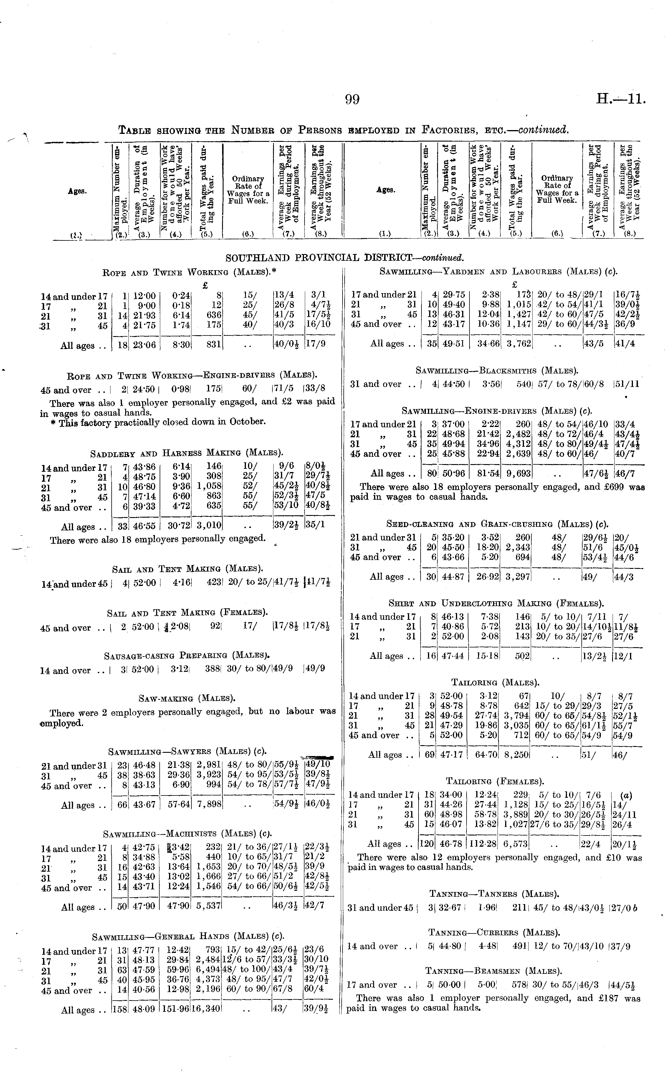 Ages. 9 is §-5 § ga a- fi °- al* o ftlS S & a a? So, 1 smi* "3 : "»S (20 (30 ■§!-> i° 2 90 terfl 93 0TJ-* ti ih Be £ 3 -gft iS ®T3M a°«f? y (4.) i TI "e0 ft hi* Ordinary •! Rate of -Hfl-" 1 Wages for a £ £ Full Week. -*HH 93 CM £ a o — %■) (6.) M _ tS O .3mS e.sa *A III |irh! (70 rH _ aSZ •*» to fl •—■> •Ifs SSr *> US 00 M — 5Po S co on a IH O Sir*!* 4 (8.) Ages. i S3 I r, sfS3 o Sft 1, S3 a* Se ■ss sE H H k Hi (3.) •a >'- H. -H J* S £ toS3 "-fl-M y (4.) S si si „ arts d r? 9 r*5 ■3! CM £ a o — (5.) q — 9 Onlinary a 11 Rate of io 'a sa, Wages for a m a o Full Week. „ v g* M orS co ism (60 I "V) rH 03 A# tn 73 tn •■=: %oi 03 9^ 03 t_ toSo | oS'Hh'iAH > 4 (8.) (J.) (10 SOUTHLAND PROVING [AL DISTRICT— continued. Rope and Twine Working (Males).* Sawmilling—Yardmen and Labourers (Males) (c). £ HandunderH 1 12-00 0-24 8 15/ 13/4 3/1 17 „ 21 1 9-00 0-18 12 25/ 26/8 4/7$ 21 „ 31 14 21-93 6-14 636 45/ 41/5 17/5$ 31 „ 45 4 21-75 1-74 175 40/ 40/3 16/10 All ages .. 18 23'06 8-30 831 .. 40/0$ 17/9 £ 17 and under 21 4 29-75 2-38 173 20/ to 48/29/1 16/7$ 21 „ 31 10 49-40 9-88 1,015 .42/to 54/41/1 39/0$ 31 „ 45 13 46-31 12-04 1,427 42/to 60/47/5 42/2$ 45 and over .. 12 43-17 10-36 1,147 29/to 60/44/3$ 36/9 Allages.. 35 49-51 34-66 3,762 .. J43/5 41/4 Rope and Twine Working—Engine-drivers (Males). 45 and over..! 2' 24*60 | 0-98) 1751 60/ |71/5 (33/8 There was also 1 employer personally engaged, and £2 was paid in wages to casual hands. * This factory practically closed down in October. Sawmilling—Blacksmiths (Males). 31 and over .. | 4] 44-50 I 3-56) 5401 57/ to 78/160/8 [51/11 Sawmilling—Engine-drivers (Males) (c). 17 and under 21 337-00 2-22 260 48/to 54/46/10 33/4 21 „ 31 221 48-68 21-42 2,482 48/to 72/46/4 43/4$ 31 „ 45 35 49-94 34-96 4,312 48/to 80/49/4$ 47/4$ 45 and over .. 25 45-88 22'94 2,639 48/to 60/46/ 40/7 Saddlery and Harness Making (Males). HandunderH 7 43-86 6-14 146 10/ 9/6 8/0$ 17 21 4 48-75 3-90 308 25/ 31/7 29/7$ 21 31 10 46-80 9-36 1,058 52/ 45/2$ 40/8$ 31 45 7 47-14 6-60 863 55/ 52/3$ 47/5 45 and over .. 6 39'33 4-72 635 55/ 53/10 40/8$ Allages.. 33 46-55 30-721 3,010 .. 39/2$ 35/1 Allages.. 80 50*96 81-54 9,693 .. 47/6$ !46/7 There were also 18 employers personally engaged, and £699 was paid in wages to casual hands. There were also 18 employers personally engaged. Seed-cleaning and Grain-crushing (Males) (c). 21 and under 31 5 35-20 3-52 260 48/ 29/6$ 20/ 31 „ 45 20 45-50 18-20 2,343 48/ 51/6 45/0$ 45 and over .. 6 43-66 5-20 694 48/ 53/4$ 44/6 Allages.. 30 44-87 26-92 3,297 .. 49/ 44/3 Sail and Tent Making (Males). 14>ndunder45 | 4| 52-00 I 4161 4231 20/ to 25/41/7$ {11/7$ Sail and Tent Making (Females). 45 and over.. | 2 52*00 l|2-08( 92, 17/ (17/8$ (17/8$ Shirt and Underclothing Making (Females). HandunderH 8 46-13 7-38 146 5/to 10/ 7/11 7/ 17 „ 21 7 40-86 5-72 213 10/to 20/14/10$ 11/8$ 21 „ 31 2 5200 2-08 .143 20/ to 35/ 27/6 27/6 Allages.. 16 47-44 15-18 502 •• 13/2$ 12/1 Sausage-casing Preparing (Males). 14 and over .. I 31 52-00 | 3*12 388; 30/ to 80/149/9 )49/9 Tailoring (Males). Saw-making (Males). 14 and under 17 3 52-00 3-12 67 10/ 8/7 8/7 17 „ 21 9 48-78 8-78 642 15/ to 29/ 29/3 27/5 21 „ 31 28 49-54 27-74 3,794 60/to 65/54/8$ 52/1$ 31 „ 45 21 47-29 19-86 3,035 60/to 65/61/1$ 55/7 45 and over .. 5 5200 5-20 712 60/ to 65/54/9 54/9 Allages.. 69 47-17 64-70 8,250 .. Isi/ 46/ There were 2 employers personally engaged, but no labour was employed. Sawmilling—Sawyers (Males) (c). 21 and under 31 23 46-48 21-38 2,981 48/ to 80/ 58/9$ 49/10 31 45 38 38-63 29-36 3,923 54/to 95/53/5$ 39/8$ 45 and over .. 8 43-13 6-90 994 54/ to 78/ 57/7$ 47/9$ Allages.. 66 43-67 57-64 7,898 .. 54/9$ 46/0$ Tailoring (Females). 14 and under 17 18 3400 12-24 229 5/to 10/ 7/6 (a) 17 „ 21 31 44-26 27-44 1,128 15/to 25/16/5$ 14/ 21 „ 31 60 48-98 58-78 3.889 20/to 30/26/5$ 24/11 31 „ 45 15 4607 13-82 1,027 27/6 to 35/29/8$ 26/4 Allages.. 120 46-78 112-28 6,573 .. 22/4 20/1$ There were also 12 employers personally engaged, and £10 was paid in wages to casual hands. Sawmilling—Machinists (Males) (c). HandunderH 4 42-75 |3'42 232 21/to 36/27/1$ 22/3$ 17 21 8 34-88 5*58 440 10/ to 65/ 31/7 21/2 21 " 31 16 42-63 13-64 1,653 20/to 70/48/5$ 39/9 31 45 15 43-40 13-02 1,666 27/to 66/51/2 42/8$ 45 and'over .. 14 43-71 12-24 1,546 54/to 66/50/6$ 42/5$ Allages.. 50 47-90 47*90 5,537 .. 46/3$ 42/7 Tanning—Tanners (Males). 31andunder45| 3(32-67 1 I 96 2111 45/to 48/43/0$ 127/0 6 Sawmilling—General Hands (Males) (c). HandunderH 13 47-77 12-42 793 15/to 42/25/6$ 23/6 17 21 31 4813 29-84 2,48412/6 to 57/33/3$ 30/10 21 31 63 47-59 59-96 6,49448/ to 100/43/4 39/7$ 31 ' 45 40 45-95 36-76 4,373 48/to 95/47/7 42/0$ 45 and over .. 14 40-56 12-98 2,196 60/to 90/67/8 60/4 Allages.. 158 4809 151-9616,340 .. 43/ 39/9$ MILI Tanning—Curriers (Males). 14 and over .. I 5| 44-80 | 4-48J 491j 12/ to 70/(43/10 137/9 13 31 63 40 14 Tanning—Beamsmen (Males). 17 and over .. I 5) 50-00 I 500) 578) 30/ to 55/(46/3 144/5$ There was also 1 employer personally engaged, and £187 was paid in wages to casual hands. 158