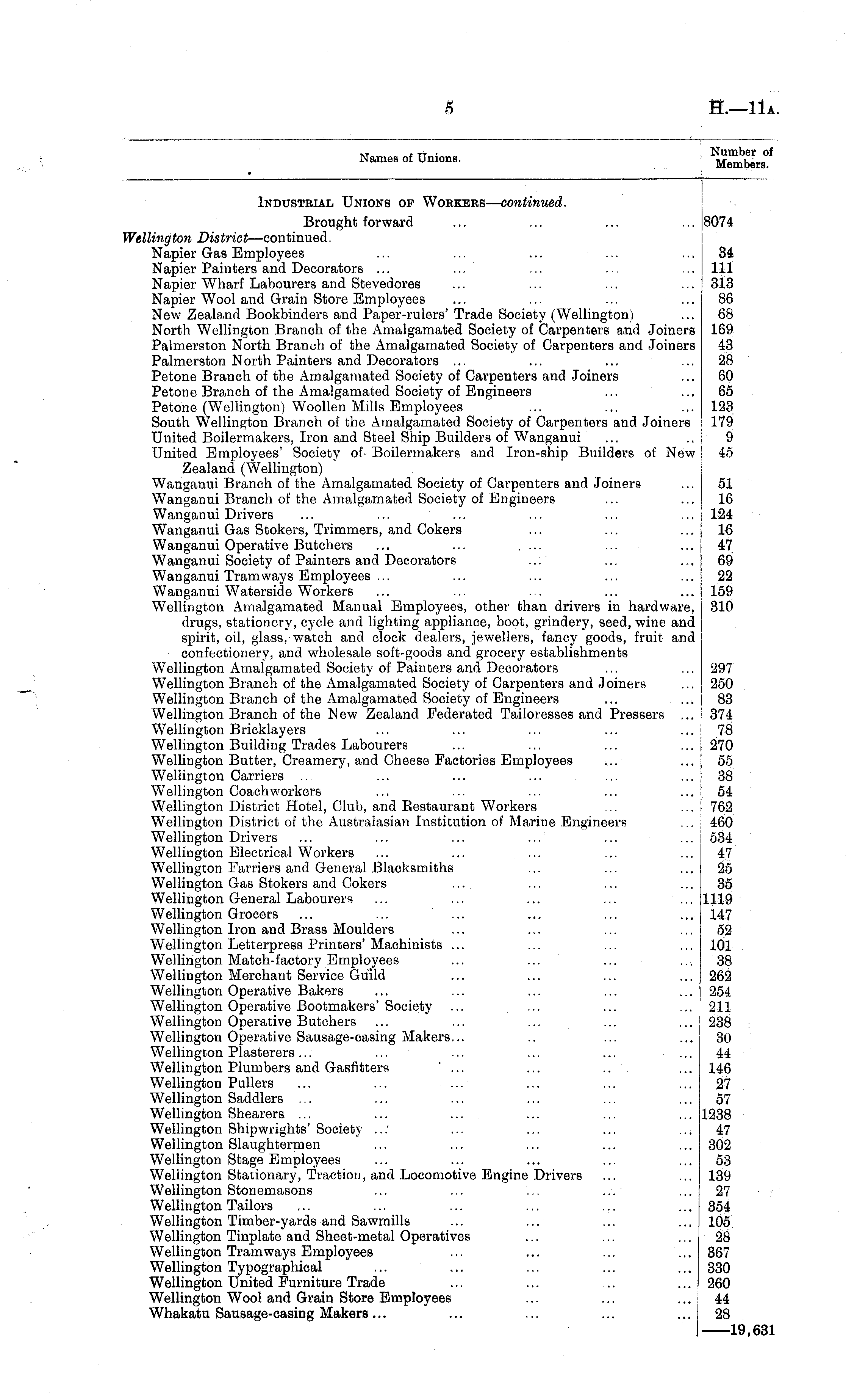 Names of Unions. I Number oi Members. Industrial Unions of Workers— continued. Brought forward 'ellington District —continued. Napier Gas Employees Napier Painters and Decorators ... Napier Wharf Labourers and Stevedores Napier Wool and Grain Store Employees New Zeala.nd Bookbinders and Paper-rulers' Trade Society (Wellington) North Wellington Branch of the Amalgamated Society of Carpenters and Joiners Palmerston North Branch of the Amalgamated Society of Carpenters and Joiners Palmerston North Painters and Decorators ... Petone Branch of the Amalgamated Society of Carpenters and Joiners Petone Branch of the Amalgamated Society of Engineers Petone (Wellington) Woollen Mills Employees South Wellington Branch of the Amalgamated Society of Carpenters and Joiners United Boilermakers, Iron and Steel Ship Builders of Wanganui United Employees' Society of- Boilermakers and Iron-ship Builders of New Zealand (Wellington) Wanganui Branch of the Amalgamated Society of Carpenters and Joiners Wanganui Branch of the Amalgamated Society of Engineers Wanganui Drivers Wanganui Gas Stokers, Trimmers, and Cokers Wanganui Operative Butchers ... ... .... Wanganui Society of Painters and Decorators Wanganui Tram ways .Employees Wanganui Waterside Workers Wellington Amalgamated Manual Employees, other than drivers in hardware, drugs, stationery, cycle and lighting appliance, boot, grindery, seed, wine and spirit, oil, glass, watch and clock dealers, jewellers, fancy goods, fruit and confectionery, and wholesale soft-goods and grocery establishments Wellington Amalgamated Society of Painters and Decorators Wellington Branch of the Amalgamated Society of Carpenters and Joiners Wellington Branch of the Amalgamated Society of Engineers ... ... Wellington Branch of the N ew Zealand Federated Tailoresses and Pressers ... Wellington Bricklayers Wellington Building Trades Labourers Wellington Butter, Creamery, and Cheese Factories Employees Wellington Carriers Wellington Coach workers Wellington District Hotel, Club, and Restaurant Workers Wellington District of the Australasian Institution of Marine Engineers Wellington Drivers Wellington Electrical Workers Wellington Farriers and General Blacksmiths Wellington Gas Stokers and Cokers Wellington General Labourers Wellington Grocers Wellington Iron and Brass Moulders Wellington Letterpress Printers' Machinists ... Wellington Match-factory Employees Wellington Merchant Service Guild Wellington Operative Bakers Wellington Operative Bootmakers'Society Wellington Operative Butchers Wellington Operative Sausage-casing Makers... Wellington Plasterers... Wellington Plumbers and Gasfitters "... Wellington Pullers Wellington Saddlers ... Wellington Shearers ... ... .... Wellington Shipwrights' Society ...' Wellington Slaughtermen Wellington Stage Employees Wellington Stationary, Traction, and Locomotive Engine Drivers Wellington Stonemasons ... ... ... ... Wellington Tailors Wellington Timber-yards and Sawmills Wellington Tinplate and Sheet-metal Operatives Wellington Tramways Employees Wellington Typographical Wellington United Furniture Trade Wellington Wool and Grain Store Employees Whakatu Sausage-easing Makers... 8074 34 111 313 86 68 169 43 28 60 65 123 179 9 45 51 16 124 16 47 69 22 159 310 297 250 83 374 78 270 55 38 54 762 460 534 47 25 35 1119 147 52 101 38 262 254 211 238 : 30 44 146 27 57 1238 47 302 53 139 27 354 105 28 367 330 260 44 28 19,631
