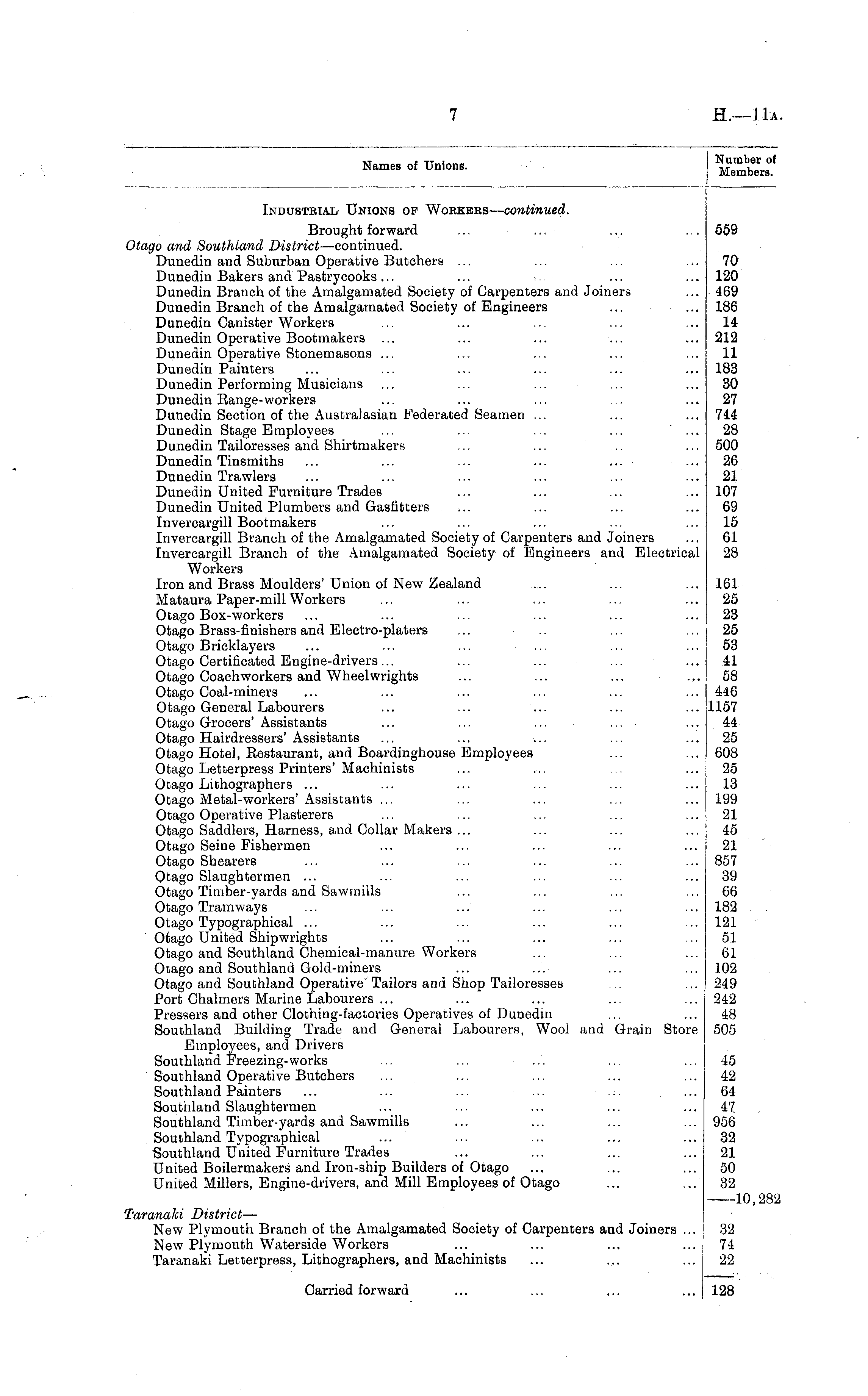 Names of Unions. Number ol Members. Industrial Unions of Workers— continued. Brought forward ... ... Otago and Southland District —continued. Dunedin and Suburban Operative Butchers ... Dunedin Bakers and Pastrycooks ... Dunedin Branch of the Amalgamated Society of Carpenters and Joiners Dunedin Branch of the Amalgamated Society of Engineers Dunedin Canister Workers Dunedin Operative Bootmakers ... Dunedin Operative Stonemasons ... Dunedin Painters Dunedin Performing Musicians Dunedin Range-workers Dunedin Section of the Australasian Federated Seamen ... Dunedin Stage Employees ... ... . . ... ... Dunedin Tailoresses and Shirtmakers Dunedin Tinsmiths ... ... ... ... ... Dunedin Trawlers Dunedin United Furniture Trades Dunedin United Plumbers and Gasfitters Invercargill Bootmakers Invercargill Branch of the Amalgamated Society of Carpenters and Joiners Invercargill Branch of the Amalgamated Society of Engineers and Electrical Workers Iron and Brass Moulders' Union of New Zealand Mataura Paper-mill Workers Otago Box-workers Otago Brass-finishers and Electro-platers Otago Bricklayers Otago Certificated Engine-drivers... Otago Coachworkers and Wheelwrights Otago Coal-miners ... ... ... ... ... Otago General Labourers Otago Grocers' Assistants ... ... ... ... Otago Hairdressers'Assistants Otago Hotel, Bestaurant, and Boardinghouse Employees Otago Letterpress Printers' Machinists Otago Lithographers ... Otago Metal-workers' Assistants ... Otago Operative Plasterers Otago Saddlers, Harness, and Collar Makers ... Otago Seine Fishermen ... ... ... Otago Shearers Otago Slaughtermen ... Otago Timber-yards and Sawmills Otago Tramways Otago Typographical ... Otago United Shipwrights Otago and Southland Chemical-manure Workers Otago and Southland Gold-miners Otago and Southland Operative Tailors and Shop Tailoresses Port Chalmers Marine Labourers ... Pressers and other Clothing-factories Operatives of Dunedin Southland Building Trade and General Labourers, Wool and Grain Store Employees, and Drivers Southland Freezing-works Southland Operative Butchers Southland Painters ... ... ... ... ... Southland Slaughtermen Southland Timber-yards and Sawmills Southland Typographical ... Southland United Furniture Trades United Boilermakers and Iron-ship Builders of Otago United Millers, Engine-drivers, and Mill Employees of Otago 559 70 120 469 186 14 212 11 183 30 27 744 28 500 26 21 107 69 15 61 28 161 25 23 25 53 41 58 446 1157 44 25 608 25 13 199 21 45 21 857 39 66 182 121 51 61 102 249 242 48 505 45 42 64 47 956 32 21 50 32 10,282 Taranaki District — New Plymouth Branch of the Amalgamated Society of Carpenters and Joiners ... New Plymouth Waterside Workers Taranaki Letterpress, Lithographers, and Machinists 32 74 22 Carried forward 128