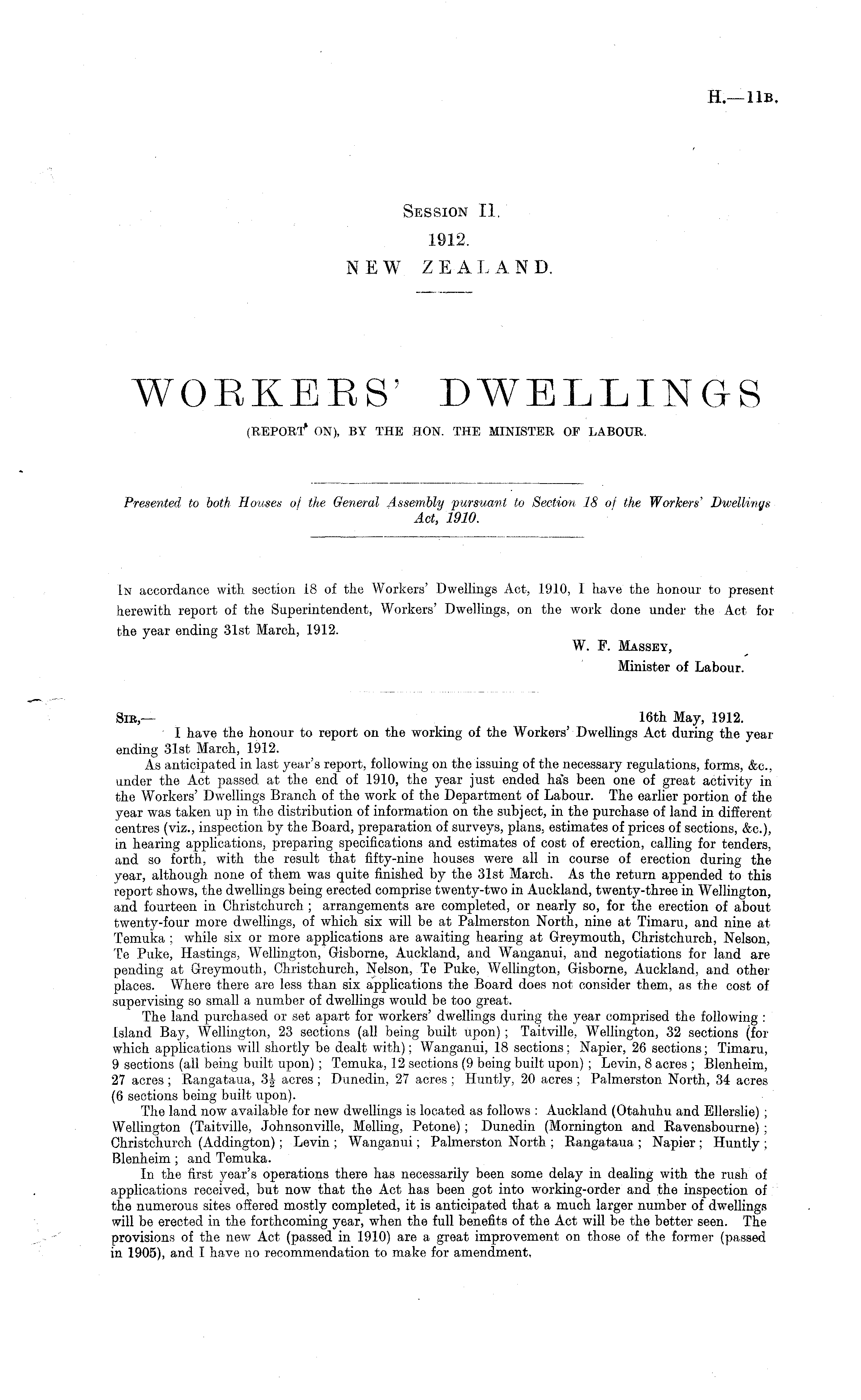 In accordance with section 18 of the Workers' Dwellings Act, 1910, I have the honour to present herewith report of the Superintendent, Workers' Dwellings, on the work done under the Act for the year ending 31st March, 1912. W. F. Massey, Minister of Labour.