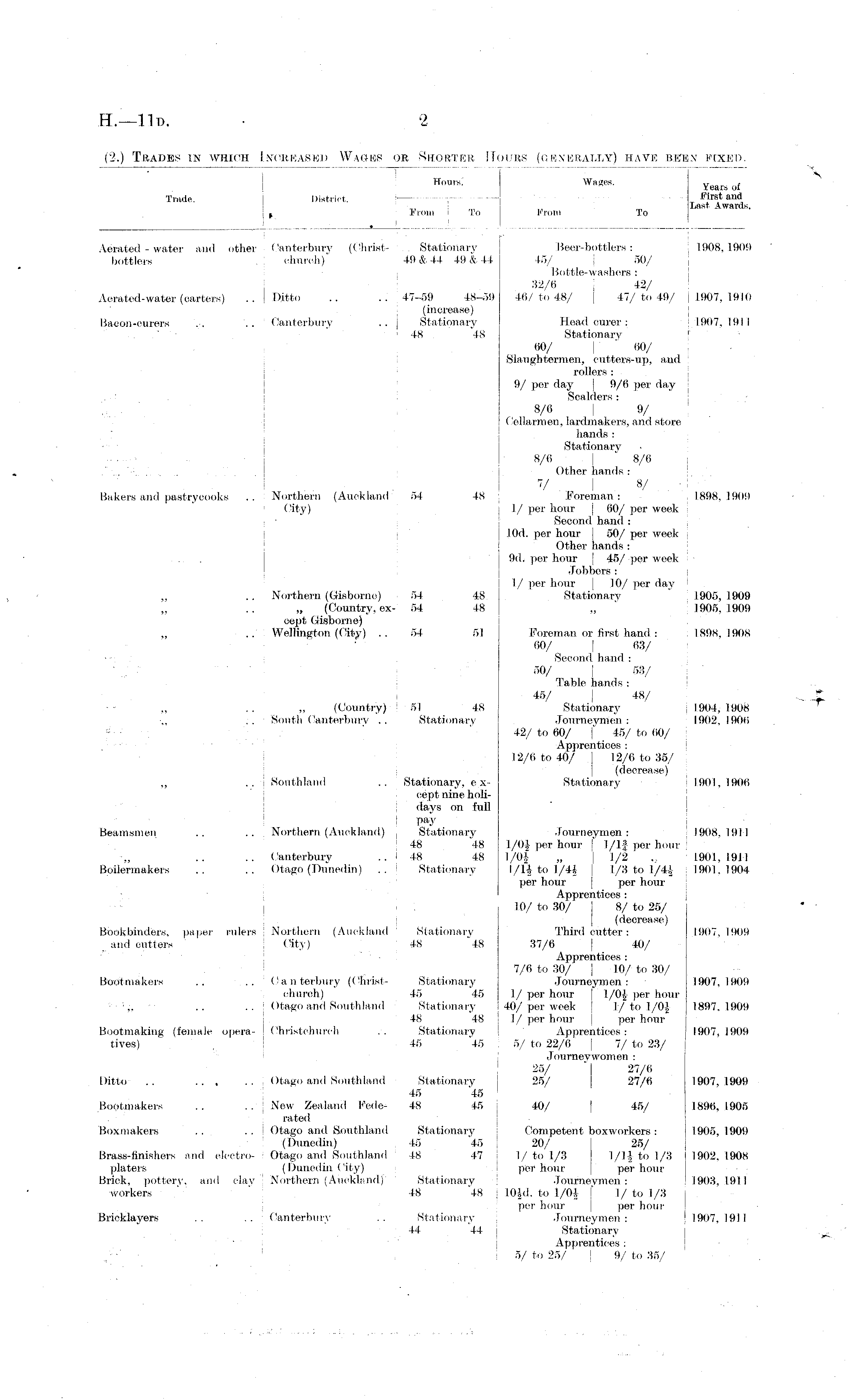 Hours. Trade. District. Wages. , r i First and Last Awards. From To ! f From ■ To '_ • i Aerated - water and cither Canterbury (Christ- Stationary bottlers church)' 49 & 44 49 & 44 I Beer-bottlers : 1908, 1909 45/ 50/ Bottle-washers : 32/6 42/ 40/ to 48/ 47/ to 49/ | 1907, 1910 Aerated-water (carters) .. | Ditto .. .. 47-59 48-59 (increase) Baoon-eurers ... .. Canterbury .. j Stationary 48 "48 Head curer : 1907. 191 i Stationary 60/ 60/ Slaughtermen, eutters-up, and rollers : 9/ per day 9/6 per day Scalders: 8/6 I 9/ 1 Cellarmen, larcbnakers, and store hands: Stationary 8/6 8/6 Other hands : ! V I 8/ Foreman : 1898, 1909 I / per hour j 60/ per week Second hand : 10d. per hour | 50/ per week Other hands : 9d. per hour I 45/ per week -Toboers : 1/ per hour 10/ per day Stationary 1905, 1909 1905, 1909 ■ . ...... Bakers and pastrycooks . . Northern (Auckland 54 48 City) „ .. Northern (Gisborne) 54 48 ,, „ (Country, ex- 54 48 cept Gisborne) .. Wellington (City) .. 54 51 . . ,, (Country) 51 48 ,, . . South Canterbury .. Stationary Foreman or first hand : 1898, 1908 60/ [ 63/ Second, hand : 50/ j 53/ Table hands : 45/ 48/ Stationary j 1904, 1908 Journeymen : 1902, 1906 42/ to 60/ I 45/ to 60/ Apprentices : 12/6 to 40/ 12/6 to 35/ (decrease) Stationary 1901, 1906 -r ,, .. J Southland .. Stationary, e xj cept nine holidays on full ! p a y Beamsmen .. .. Northern (Auckland) , Stationary 48 '48 ■-„ .. .. Canterbury .. i 48 48 Boilermakers .. .. Otago (Dunedin) .. ; Stationary • j Journeymen : ' 1908, 1911 J/OJ per hour [ 1/lf per hour l/0i „ I 1/2 ,. 1901, I9J1 1/1+ to l/4i 1/3 to 1/44 I 1901, 1904 per hour per hour Apprentices : 10/ to 30/ 8/ to 25/ (decrease) Third cutter : 1907, 1909 37/6 40/ Apprentices : 7/6 to 30/ 10/ to 30/ Journeymen: 1907,1909 1/ per hoar [ l/0| per hour 40/ per week 1/ to 1/0$ 1897, 1909 1/ per hour per hour Apprentices: 1907,1909 5/ to 22/6 I 7/ to 23/ Journeywomen : 25/ 27/6 25/ 27/6 1907, 1909 • I ! '■ Bookbinders, paper rulers : Northern (Auckland Stationary and cutters City) 48 "48 Bootmakers ., .. Canterbury (Christ- Stationary church) ' 45 45 I •■■,. .. .. : Otago and Southland Stationary 48 '48 J Bootmaking (female opera- | Christehureh .. Stationary tives) 45 45 Ditto .. ... . . Otago and Southland Stationary 45 45 Bootmakers .. . . ; New Zealand h'ede- 48 45 rated Boxniakers . . . . Otago and Southland Stationary (Dunedin) 45 45 Brass-finishers and electro- Otago and Southland 48 47 platers (Dunedin City) Brick, pot (cry. and clay Northern (Auckland) Stationary workers 48 48 40/ [ 45/ I 1896, 1905 Competent boxworkers : i 1905, 1909 20/ 25/ 1/ to 1/3 I/I] to 1/3 j 1902. 1908 per hour , per hour Journeymen: 1903, 1.911 lOJd. to I/O* I 1/ to 1/3 per hour per hour Journeymen : ! 1907, 1911 Stationary Apprentices : 5/ to 25/ J 9/ to 35/ Bricklayers .. .. Canterbury .. Stationary 44 44