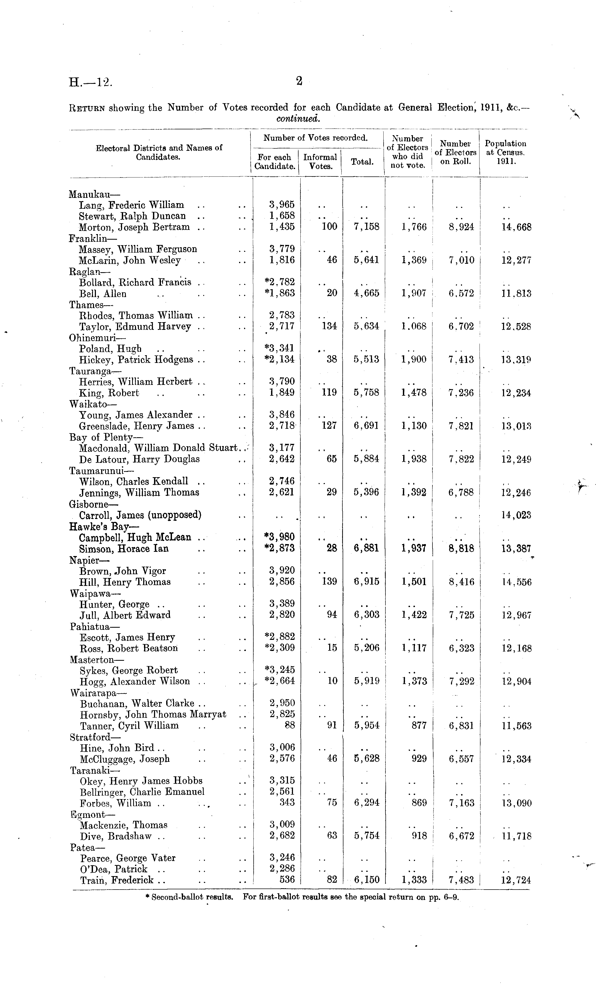 Electoral Districts and Names of Candidates. Number of Votes reco For each Informal Candidate. Votes. uml ier o: ;es recon orded. Total. I Number of Electors I who did 1 not vote. I Number of Electors on Roll. Population at Census. 1911. Manukau— Lang, Frederic William Stewart, Ralph Duncan Morton, Joseph Bertram Franklin — Massey, William Ferguson McLarin, John Wesley Raglan — Bollard, Richard Francis Bell, Allen Thames— Rhodes, Thomas William Taylor, Edmund Harvey Ohinemuri — Poland, Hugh Hickey, Patrick Hodgens Tauranga — Herries, William Herbert ... King, Robert Waikato — Young, James Alexander Greenslade, Henry James Bay of Plenty — Macdonald, William Donald Stuart.. De Latour, Harry Douglas Taumarunui— Wilson, Charles Kendall Jennings, William Thomas Gisborne— Carroll, James (unopposed) Hawke's BayCampbell, Hugh McLean Simson, Horace Ian Napier— Brown, John Vigor Hill, Henry Thomas Waipawa — Hunter, George Jull, Albert Edward Pahiatua — Escott, James Henry Ross, Robert Beatson Masterton — Sykes, George Robert Hogg, Alexander Wilson Wairarapa— Buchanan, Walter Clarke Hornsby, John Thomas Marryat Tanner, Cyril William Stratford — Hine, John Bird McCluggage, Joseph Taranaki— Okey, Henry James Hobbs Bellringer, Charlie Emanuel Forbes, William Egmont— Mackenzie, Thomas Dive, Bradshaw Patea — Pearce, George Vater O'Dea, Patrick Train, Frederick 3,965 1,658 1,435 3,779 1,816 *2.782 *1,863 2,783 2,717 *3,341 *2,134 3,790 1,849 3,846 2,718 3,177 2,642 2,746 2,621 *3,980 *2,873 100 46 20 134 38 119 127 65 29 7,158 5,641 4,665 5,634 5,513 5,758 6,691 5^884 5,396 61881 1,766 1,369 1,907 1.068 1,900 1,478 1,130 1,938 1,392 1,937 8,924 7,010 6.572 6.702 7,413 j 7.236 7,821 I 7,822 j 6,788 I i 8^818 14.668 12,277 11.813 12.528 13.319 • 12,234 13,013 12,249 12,246 14,023 13,387 28 3,920 2,856 ! 139 6,915 1,501 I 8,416 I j 14.556 3,389 2,820 94 6,303 1,422 7,725 12,967 *2,882 *2,309 15 5,206 1,117 6,323 12,168 *3,245 *2,664 10 5,919 1,373 7,292 i 12,904 2,950 2,825 88 5,954 877 6,831 11,563 91 3,006 2,576 46 5,628 929 6,557 12,334 3,315 2,561 343 6,294 869 7,163 | 13,090 75 3,009 2,682 63 5,754 918 6,672 j , 11,718 3,246 2,286 536 82 6,150 1,333 7,483 I 12,724 * Second-ballot results. Foi first-ballot results see the special roturn on pp. 6-9.