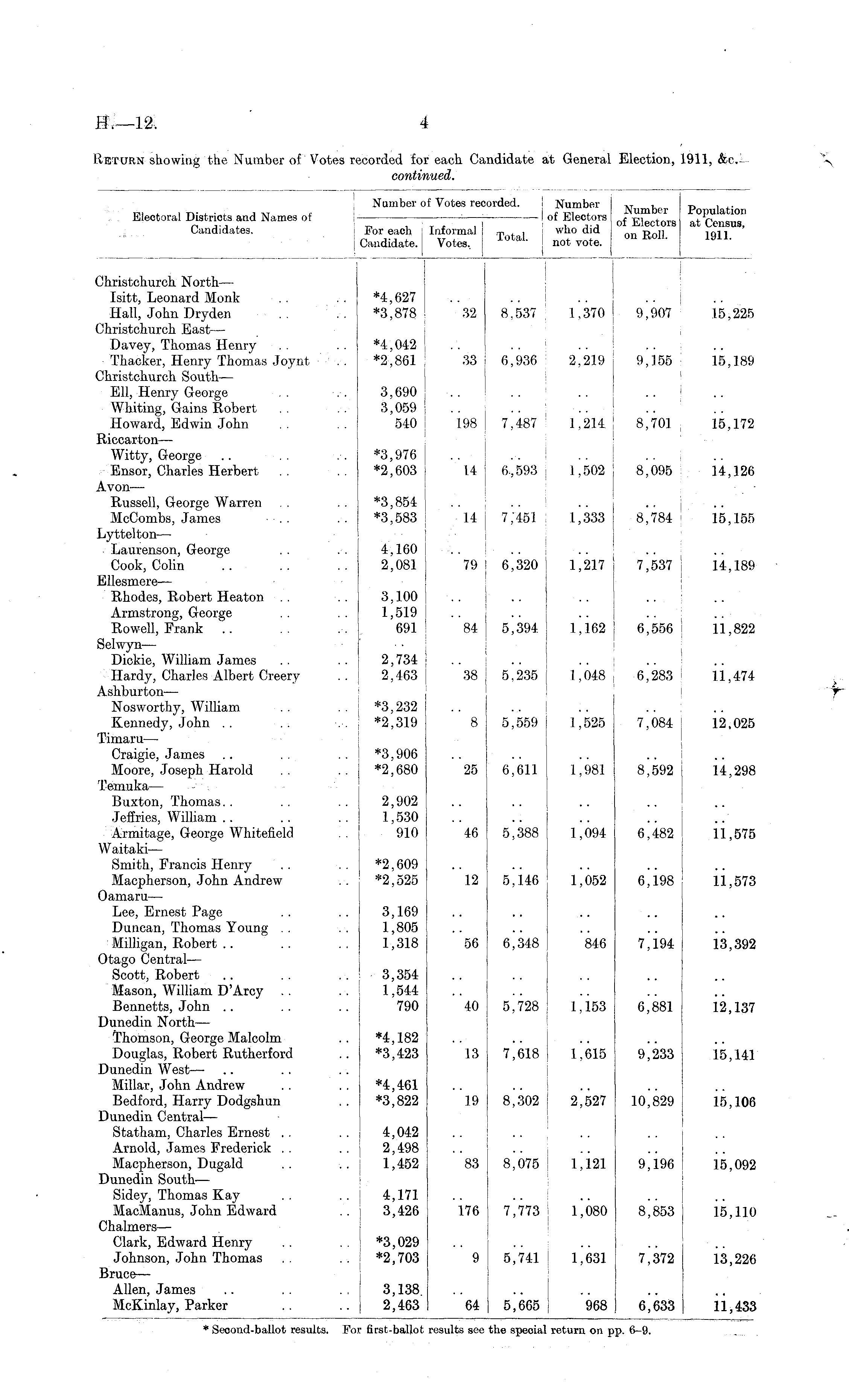 urn ier o ;es recon j Num ! ler Number Population Electoral Districts and Names of Candidates. For each Informal j m . , Candidate. Votes, - [ of Elector! who did not vote. _J of Electors on Roll. at Census, 1911. i I Christchurch North — Isitt, Leonard Monk Hall, John Dryden Christchurch East — Davey, Thomas Henry Thacker, Henry Thomas Joynt Christchurch South — Ell, Henry George Whiting, Gains Robert Howard, Edwin John Riccarton — Witty, George .. Ensor, Charles Herbert *4,627 *3,878 32 8.537 *4,042 .. *2,861 j 33 6,936 3,690 3,059 540 198 ! 7,487 | *3,976 *2,603 14 6., 593 *4,627 *3,878 *4,042 *2-,861 32 33 8,537 6,936 7 1,370 5 2,219 7 ! 1,214 3 : 1,502 1,370 2,219 9,907 9,155 15,225 15,189 3,690 3,059 540 198 8,701 15,172 7,487 1,214 *3,976 *2,603 I 14 6., 593 1,502 8,095 14,126 Avon — Russell, George Warren McCombs, James Lyttelton — Laurenson, George Cook, Colin EUesmere — Rhodes, Robert Heaton Armstrong, George Rowell, Frank Selwyn — Dickie, William James Hardy, Charles Albert Creery Ashburton — Nosworthy, William Kennedy, John . . . ■. Timaru — Craigie, James Moore, Joseph Harold Temuka — - ■ -. • Buxton, Thomas.. Jeffries, William Armitage, George Whitefield Waitaki — Smith, Francis Henry Macpherson, John Andrew Oamaru — Lee, Ernest Page Duncan, Thomas Young . . Milligan, Robert Otago Central— Scott, Robert Mason, William D'Arcy Bennetts, John Dunedin North — Thomson, George Malcolm Douglas, Robert Rutherford Dunedin West— Millar, John Andrew Bedford, Harry Dodgshun Dunedin Central — Statham, Charles Ernest . . Arnold, James Frederick . . Macpherson, Dugald Dunedin South — Sidey, Thomas Kay MacManus, John Edward Chalmers— Clark, Edward Henry Johnson, John Thomas *3,854 j .. *3,583 ! 14 7,451 4,160 I •-"-.. 2,081 i 79 6,320 3,100 j .. 1,519 I .. 691 j 84 ; 5,394 2,734 .. 2,463 I 38 I 5,235 i *3,232 *2,319 8 5,559 *3,906 *2,680 25 6,611 2,902 1,530 910 46 5,388 *2,609 *2,525 12 5,146 3,169 1,805 1,318 56 6,34c: 3,354 1,544 790 40 5,72£ *4,182 *3,423 13 7,618 *4,461 *3,822 19 j 8,305 4,042 2,498 1,452 83 8,071 4,171 3,426 176 7,77J *3,029 *2,703 9 5,741 *3,854 *3,583 4,160 2,081 3,100 1,519 691 2,734 2,463 *3,232 *2,319 *3,906 *2,680 2,902 1,530 910 *2,609 *2,525 • 14 79 84 38 8 25 46 12 7,451 6,320 i j 5,394 j 5,235 j 5,559 6,611 5,388 5,146 1 1,333 0 i 1,217 j 4 j 1,162 5 : 1,04? 9 1,526 1 1,981 8 1,094 6 1,052 8 84t 8 l,Wc 8 1,61E 2 | 2,521 5 | 1,121 3 j 1,08( 1 | 1,631 1,333 1,217 1,162 1,048 1,525 1,981 1,094 1,052 8,784 7,537 6,556 i 6,283 i 7,084 8,592 6,482 6,198 15,155 14,189 11,822 11,474 12,025 14,298 11,575 11,573 3,169 1,805 1,318 6,348 846 7,194 13,392 56 3,354 1,544 790 5,728 1,153 6,881 12,137 40 *4,182 *3,423 13 7,618 1,615 9,233 15,141 *4,461 *3,822 19 8,302 | 2,527 10^829 15,106 4,042 2,498 1,452 8,075 1,121 9,196 15,092 83 I 4,171 3,426 176 7,773 1,080 8,853 | 15,110 *3,029 *2,703 9 5,741 1,631 7,372 13,226 BruceAllen, James McKinlay, Parker 3,138 2,463 64 5,66!: 3,138 2,463 5,665 I 5 i m 968 6,633 li,433 64 * Seoond-ballot results. For first-ballot results see the s] soial return on i. 6-9.