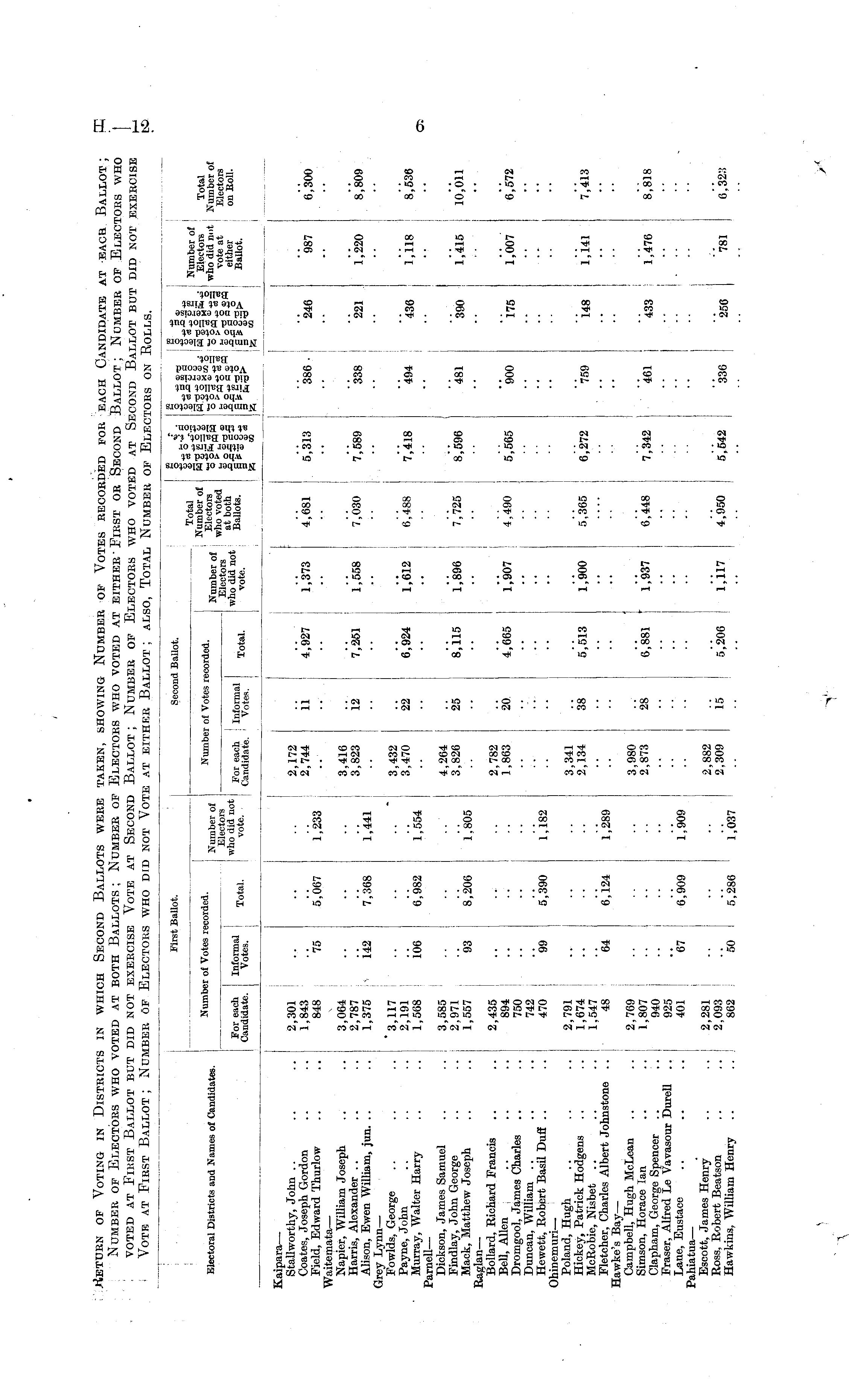 RETURN of Voting in Districts in which Second Ballots were taken, showing Number of Votes recorded for each Candidate at each Ballot; Number of Electors who voted at both Ballots; Number of Electors who voted at either First or Second Ballot; Number of Electors who voted at First Ballot but did not exercise Vote at Second Ballot; Number of Electors who voted at Second Ballot but did not exercise Vote at First Ballot; Number of Electors who did not Vote at either Ballot; also, Total Number of Electors on Rolls.