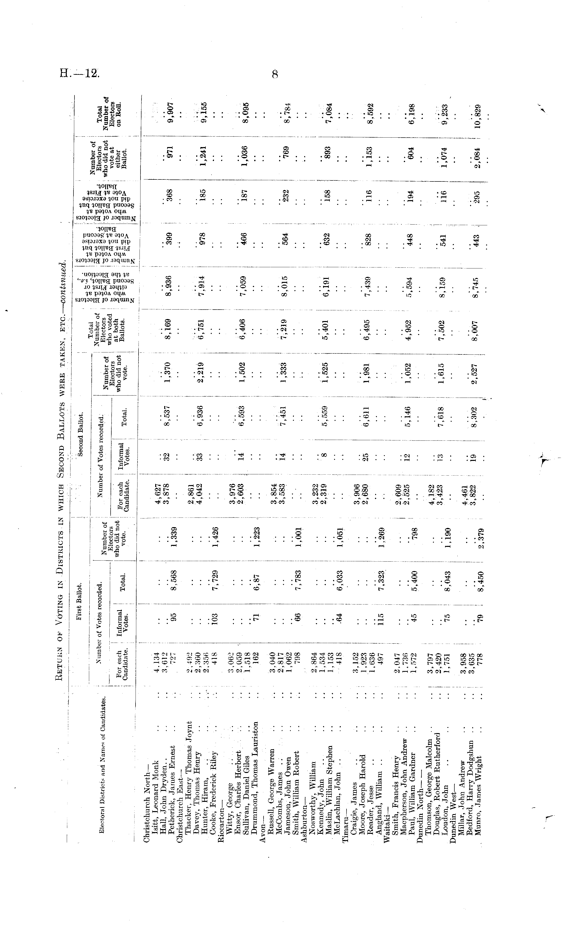 First Ballot. j Second BaUot. i J „• . g «, „ -g *„ Etecto™, District, and Names of Candidates. of Votes recorded. Number of Votes recorded. fc I ?|I|| "|| §4* «|| ||| *£& of ; Electors : fc : Electors I wh t Vl ea si * is2 « S4 S " S ffl vote at Electors —... ■ • .. ! ! I ! to » A, <& m I ! I • : I i I 1 - -7 ■ ! First Ballot. Second Ballot. Number of Christchurch North — Isitt, Leonard Monk .. .. 4,134 .. .. 4 627 Hall, John Dryden. 3,612 .. "' . '" 3*878 32 8*537 > 1,310 8*169 8*936 '399 . '368 *971 9*907 Petherick, James Ernest .. .. 727 95 8,568 1,339 ' aya ! Aoa y/1 9,907 Christchurch East — '' • ' Thacker. Henry Thomas .loynt . . 2 492 2 861 huS,^ Henry :.: ;: |;1 ;; '■'; ' 4 | 042 33 936 2^219 fa* 7^ 4 '9 78 i 85 i'ki 9 ;i 5 5 Cooke, Frederick Riley .. .-. 418 103 7,729 1,426 Riccarton — ••■■••.... Witty, George .. 3,062 .. .. .. 3,976 Ensor. Charles Herbert . -.-. , 2.059 2 603 li « kc& lino a At\a n' A™ ",„„ " ■" •• ■ Sullivan, Daniel Giles .. .. 1*518 .. .. \[ " i ' 9 1,5 ° 2 6,4 ° 6 7 ' 059 466 ! 187 i' 036 8,095 Drummond, Thomas Lauriston .. 162 71 6,87 1,223 • '.'. Avon — '-'■•■•••••■.. Russell, George Warren .. .. 3,040 .. .. ... 3,854 McCombs, James .. .. .. 2.817 a nm ii n im i'ooo 4>'A 1n o'A.r ' l„ Jameson, John Owen .. 1*062 .' "' '' " ' ' ,333 7 ' 219 ! 8 ' 015 564 232 769 8.784 Smith, William Robert .. .. 798 66 7.783 ijoOl '.'■.' Ashburton — •••■•■••.. Nosworthy, William .. .. 2,864 3 232 j MaZfwSn Stephen V. V. \ \'J& \\ V. \\ '* *** **» * 6^191 632 '*« » 7*084 McLachlan, John .. .. .. 418 .64 6,033 1,051 .. " Timaru — Craigie, James .. .. ..3,152 .. .. 3 906 fe J S hHarold 1;S :: :: 2:680 25 6;6n i;981 6:495 ' 828 : »* i-fr s;*. -Angland, William .. .. .. 497 115 7,323 1,269 Waitaki — Smith, Francis Henry .. .. 2,047 .. .. 2.609 i Macpherson, John Andrew .. ... 1 736 9 k9K \o s 'jis i Arto a kze> ~'l„, Paul, William Gardner .. .. 1,512 *45 sjioO *798 | ' I ' ' 952 5 ' 594 448 ! 194 *»* S. 1^ Dunedin North ■••••••-.. Thomson, George Malcolm .. .. 3,797 .. .. 4 182 Douglas, Robert Rutherford .. 2 420 i-? ,'b,o leic .'r™ „';_„ Loudon, John 75 8*043 1*190 ' ! ' 6 5 8 ' 159 541 116 "- 074 9 > 233 Dunedin West — • • . .. Millar, John Andrew .. 3,958 .. 4 461 , :: %i % k *m *:™ 3 : 822 ™ 8;302 , 2:527 8; ° 07 8; ™ ' 443 ' 295 2^ 4 io; 8 2 9 I '