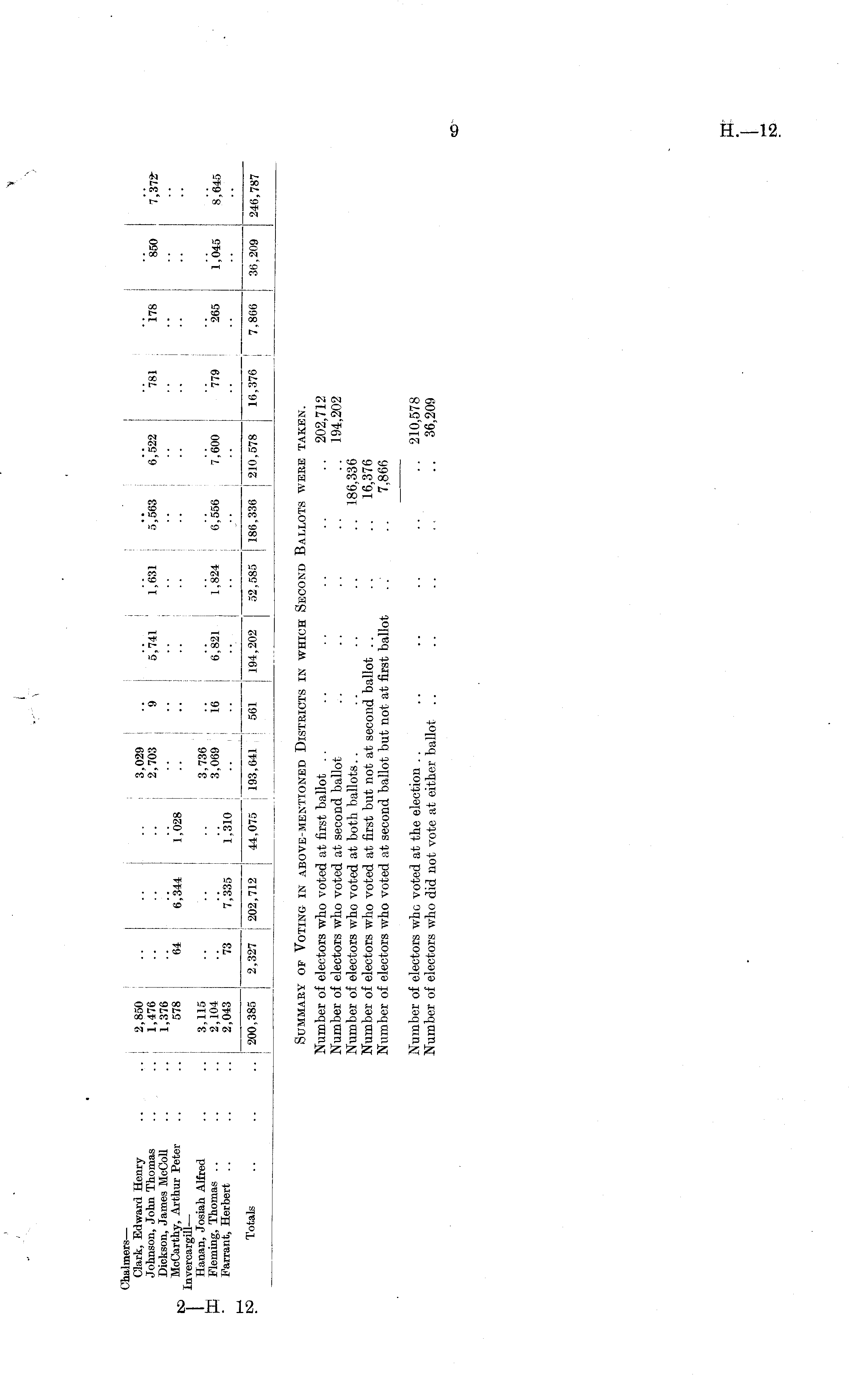 Summary op Voting in above-mentioned Districts in which Second Ballots were taken. Number of electors who voted at first ballot .. .. .. .. .. .. 202,712 Number of electors who voted at second ballot .. . . .. .. .. 194,202 Number of electors who voted at both ballots.. .. .. .. .. 186,336 Number of electors who voted at first but not at second ballot .. .. .. 16,376 Number of electors who voted at second ballot but not at first ballot ..' .. 7,866 Number of electors who voted at the election .. .. .. .. .. .. 210,578 Number of electors who did not vote at either ballot .. .. .. . . .. 36,209