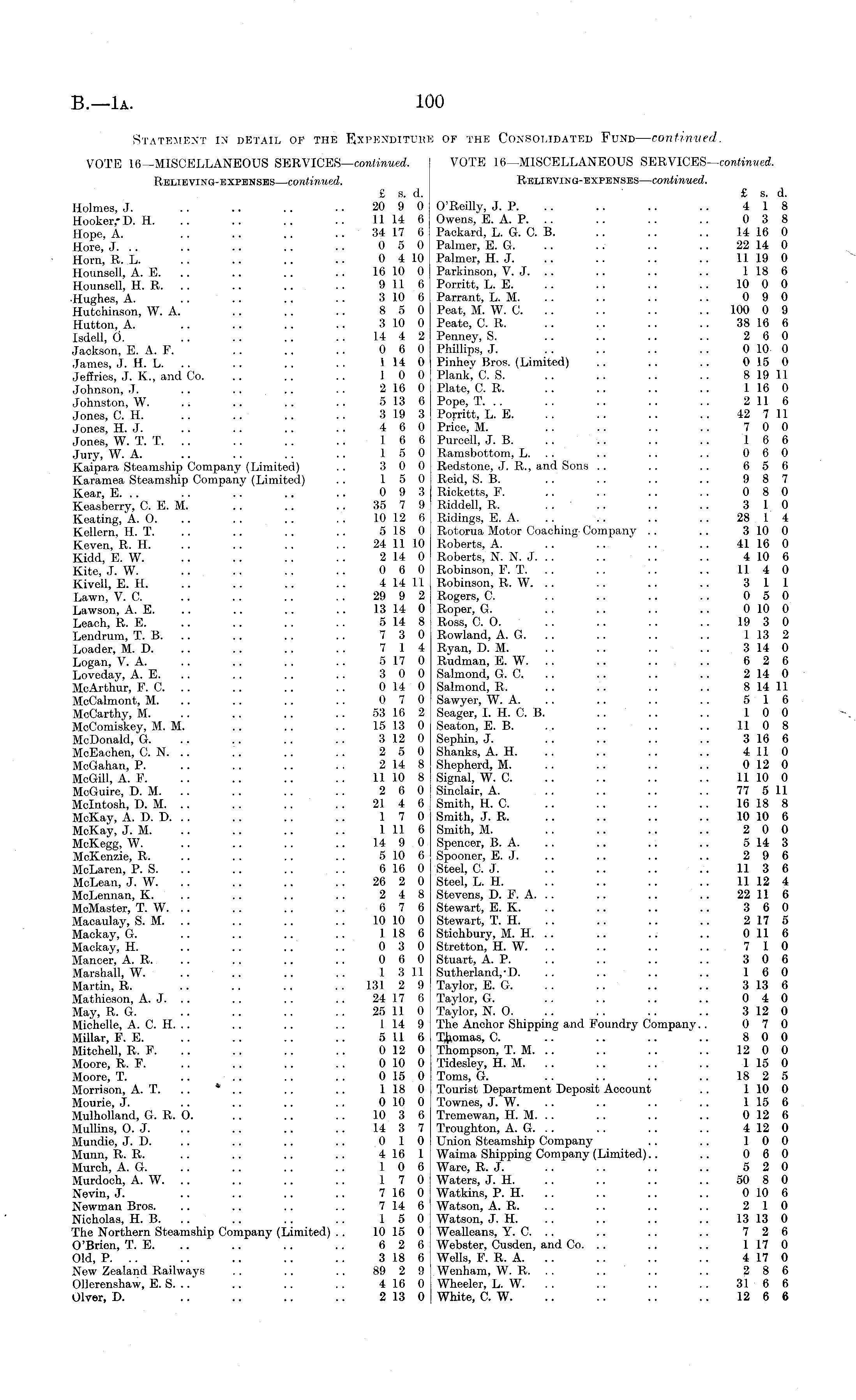 Statement in detail of the Expenditure of the Consolidated Fund — continued. VOTE 16—MISCELLANEOUS SERVlCES— continued. VOTE 16—MISCELLANEOUS SERVlCES— continued. Relieving-expenses— continued. Relievino-expenses— continued. £ s. d. £ s. d. Holmes, J. .. .. .. .. 20 9 0 O'Reilly, J. P. . . .. .. .. 4 18 Hooker," D. H. .. .. .. .. 11 14 6 Owens, E. A. P. .. .. .. .. 0 3 8 Hope, A. . . .. .. .. 34 17 6 Packard, L. G. C. B. .. .. .. 14 16 0 Hore, J. .. .. .. .. .. 0 5 0 Palmer, E. G. .. .. .. .. 22 14 0 Horn, R. L. .. .. .. .. 0 4 10 Palmer, H. J. .. .. .. .. 11 19 0 Hounsell, A. E. .. .. .. .. 16 10 0 Parkinson, V. J. .. .. .. .. 118 6 Hounsell, H. R. .. .. .. .. 911 6 Porritt, L. E. .. .. .. .. 10 0 0 ■Hughes, A. .. .. .. .. 310 6 Parrant, L. M. .. .. .. .. 0 9 0 Sutchinson, W. A. 8 5 0 Peat, M. W. C .. 100 0 9 Hutton, A. .. .. .. .. 3 10 0 Peate, C. R. .. .. .. .. 38 16 6 Isdell, O. .. .. .. ■■ 14 4 2 Penney, S. .. .. .. .. 2 6 0 Jackson, E. A. F. .. .. .. 0 6 0 Phillips, J. .. .. .. .. 010 0 James, J. H. L. .. .. .. .. 1 14 0 Pinhey Bros. (Limited) .. .. .. 015 0 Jeffries, J. X., and Co. .. .. .. 10 0 Plank, C. S. .. .. .. .. 8 19 11 Johnson, J. .. .. .. .. 216 0 Plate, C. R. .. .. .. .. 116 0 Johnston, W. .. .. .. .. 5 13 6 Pope, T. . . .. .. .. .. 2 11 6 Jones, C. H. .. .. .. .. 3 19 3 Porritt, L. E. .. .. .. .. 42 7 11 Jones, H. J. .. .. .. .. 4 6 0 Price, M. .. .. .. .. 7 0 0 Jones, W. T. T. .. . . .. .. 16 6 Purcell, J. B. .. .. .. .. 16 6 Jury, W. A. .. . . .. .. 15 0 Ramsbottom, L. .. .. .. .. 0 6 0 Kaipara Steamship Company (Limited) .. 3 0 0 Redstone, J. R., and Sons .. .. .. 6 5 6 Karamoa Steamship Company (Limited) . . 15 0 Reid, S. B. .. . . .. .. 9 8 7 Kear, E. .. .. .. .. .. 0 9 3 Ricketts, F. .. . . .. .. 0 8 0 Keasberry, C. E. M. .. .. .. 35 7 9 Riddell, R. .. .. .. .. 3 10 Keating, A. O. .. .. .. .. 10 12 6 Ridings, E. A. .. .. .. . . 28 1 4 Kellern, H. T. .. .. .. .. 5 18 0 Rotorua Motor Coaching Company .. .. 3 10 0 Keven, R. H. .. .. .. .. 24 11 10 Roberts, A. .. .. .. .. 41 16 0 Kidd, E. W. .. .. .. .. 214 0 Roberts, N. N. J. .. .. .. .. 410 6 Kite, J. W. .. .. .. .. 0 6 0 Robinson, F. T. .. .. .. .. 11 4 0 Kivell, E. H. .. .. .. .. 4 14 11 Robinson, R. W. .. .. .. .. 3 11 Lawn, V. C. .. .. .. .. 29 9 2 Rogers, C. .. .. .. .. 0 5 0 Lawson, A. E. .. .. .. .. 13 14 0 Roper, G. .. .. .. .. 010 0 Leach, R. E. .. .. .. .. 514 8 Ross, CO. . . .. .. .. 19 3 0 Lendrum, T. B. .. .. .. .. 7 3 0 Rowland, A. G. . . .. .. .. 1 13 2 Loader, M. D. .. .. .. .. 7 14 Ryan, D. M. . . .. .. .. 3 14 0 Logan, V. A. .. .. .. .. 517 0 Rudman, E. W. .. .. .. .. 6 2 6 Loveday, A. E. .. .. .. .. 3 0 0 Salmond, G. C. .. .. .. .. 214 0 McArthur, F. C. .. .. .. .. 0 14 0 Salmond, R. .. .. .. .. 814 11 McCalmont, M. .. .. .. .. 0 7 0 Sawyer, W. A. .. .. .. .. 5 16 McCarthy, M. .. .. .. .. 53 16 2 Seager, I. H. C. B. .. .. .. 10 0 McComiskey, M. M. .. .. .. 15 13 0 Seaton, E. B. ... .. .. .. 11 0 8 McDonald, G. .. .. .. .. 312 0 Sephin, J. .. .. .. .. 316 6 McEachen, C. N. .. .. .. .. 2 5 0 Shanks, A. H. .. .. .. .. 4 11 0 McGahan, P. .. .. .. .. 214 8 Shepherd, M. .. .. .. .. 012 0 McGill, A. F. .. .. .. .. 11 10 8 Signal, W. C. .. .. .. .. 11 10 0 McGuire, D. M. .. .. .. .. 2 6 0 Sinclair, A. .. .. .. .. 77 511 Melntosh, D. M. .. .. .. .. 21 4 6 Smith, H. C. .. .. .. .. 16 18 8 McKay, A. D. D. .. .. .. .. 17 0 Smith, J. R. .. .. .. .. 10 10 6 McKay, J. M. .. .. .. .. 1 11 6 Smith, M. .. .. .. .. 2 0 0 McKegg, W. .. .. .. .. 14 9 0 Spencer, B. A. .. .. .. .. 514 3 McKenzie, R. .. .. .. .. 510 6 Spooner, E. J. .. .. .. .. 2 9 6 McLaren, P. S. .. .. .. .. 616 0 Steel, C. J. .. .. .. .. 11 3 6 McLean, J. W. .. .. .. 26 2 0 Steel, L. H. .. .. .. .. 11 12 4 McLennan, K. .. .. .. .. 2 4 8 Stevens, D. F. A. .. .. .. .. 22 11 6 McMaster, T. W. .. .. .. .. 6 7 6 Stewart, E. K. .. .. .. .. 3 6 0 Macaulay, S. M. .. .. .. .. 10 10 0 Stewart, T. H. .. .. .. .. 217 5 Mackay, G. .. .. .. .. 1 18 6 Stichbury, M. H. .. .. .. .. 0 11 6 Mackay, H. .. .. .. .. 0 3 0 Stretton, H. W. . . .. .. ..710 Mancer, A. R. .. .. .. .. 0 6 0 Stuart, A. P. . . .. .. .. 3 0 6 Marshall, W. .. .. .. .. 1 3 11 Sutherland, D. .. .. .. .. 16 0 Martin, R. .. .. .. 131 2 9 Taylor, E. G. .. .. .. .. 313 6 Mathioson, A. J. .. .. .. .. 24 17 6 Taylor, G. .. .. .. .. 0 4 0 May, R. G. .. .. .. .. 25 11 0 Taylor, N. O. .. .. .. .. 3 12 0 Michelle, A. C. H. .. .. .. .. 1 14 9 The Anchor Shipping and Foundry Company.. 0 7 0 Millar, F. E. .. .. .. .. 511 6 Thomas, C. .. .. .. .. 8 0 0 Mitchell, R. F. .. .. .. .. 0 12 0 Thompson, T. M. .. .. .. .. 12 0 0 Moore, R. F. .. .. .. .. 0 10 0 Tidesley, H. M. .. .. .. .. 1 15 0 Moore, T. .. .. .. .. 015 0 Toms, G. .. .. .. .. 18 2 5 Morrison, A. T. .. * .. .. .. 118 0 Tourist Department Deposit Account .. 110 0 Mourie, J. .. .. .. .. 010 0 Townes, J. W. .. .. .. .. 115 6 Mulholland, G. R. O. .. .. .. 10 3 6 Tremewan, H. M. .. .. .. .. 012 6 Mullins, O. J. .. .. .. .. 14 3 7 Troughton, A. G. .. .. .. .. 412 0 Mundie, J. D. .. .. .. .. 0 10 Union Steamship Company .. .. 10 0 Munn, R. R. .. .. .. .. 4 16 1 Waima Shipping Company (Limited).. .. 0 6 0 Murch, A. G. .. .. .. .. 10 6 Ware, R. J. .. .. .. .. 5 2 0 Murdoch, A. W. .. .. .. .. 17 0 Waters, J. H. .. .. .. .. 50 8 0 Nevin, J. .. .. .. .. 716 0 Watkins, P. H. .. .. .. .. 010 6 Newman Bros. .. .. .. .. 7 14 6 Watson, A. R. .. .. .. .. 2 10 Nicholas, H. B. .. .. .. .. 15 0 Watson, J. H. .. .. .. .. 13 13 0 The Northern Steamship Company (Limited) . . 10 15 0 Wealleans, Y. C. .. .. .. .. 7 2 6 O'Brien, T. E. .. .. .. .. 6 2 6 Webster, Cusden, and Co. .. .. .. 117 0 Old, P. .. .. .. .. .. 318 6 Wells, F. R. A. .. .. .. .. 417 0 New Zealand Railways .. .. .. 89 2 9 Wenham, W. R. .. .. .. .. 2 8 6 Ollerenshaw, E. S. .. .. .. .. 416 0 Wheeler, L. W. .. .. .. .. 316 6 Olver, D. .. .. .. .. 213 0 White, C. W. .. .. .. .. 12 6 6