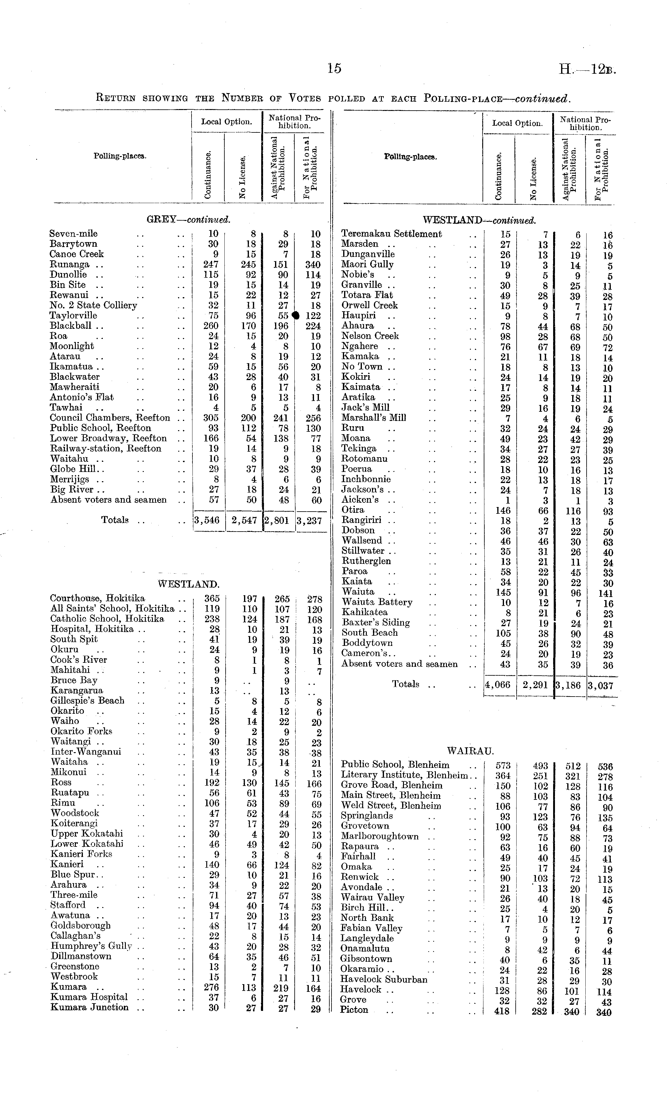 Polling-places. Local as 1 a a a 0 o )ption. as a o as 3 O te Nation hibi "a a . 2 a S.o te| 1n3 a o ■r o. a Oj 00 HH lal Proition. a a a o o te te% rH WESTLAND—confer tued. Teremakau Settlement .. 15 Marsden .. .. .. 27 Dunganville .. .. 26 Maori Gully .. 7. 19 Noble's .. .. .. 9 Granville .. .. . . 30 Totara Flat .. .. 49 Orwell Creek . . .. 15 Haupiri .. .. . . 9 Ahaura .. .. . . 78 Nelson Creek . . . . 98 Ngahere .. .. . . 76 Kamaka .. .. , . 21 No Town .. .. . . 18 Kokiri .. .. .. 24 Kaimata .7 .. .. 17 Aratika .. .. . . 25 Jack's Mill .. .. 29 Marshall's Mill .. .. 7 Ruru .. .. . . 32 Moana .. .. .. 49 Tekinga .. . . . . 34 Rotomanu . . .. 28 Poerua .. .. .. 18 Inchbonnie . . .. 22 Jackson's . . . . .. 24 Aicken's .. . . . . 1 Otira .. . . . . 146 Rangiriri . . . . .. 18 Dobson .. . . .. 36 Wallsend .. .. . . 46 Stillwater .. . . . . 35 Rutherglen .. . . 13 Paroa . . .. . . 58 Kaiata .. .. . . 34 Waiuta .. .. . . 145 Waiuta Battery . . .. 10 Kahikatea . . . . 8 Baxter's Siding .. . . 27 South Beach . . . . 105 Boddytown .. . . 45 Cameron's.. .. . . 24 Absent voters and seamen . . 43 1 13 13 3 5 8 28 9 8 44 28 67 11 8 14 8 9 16 4 24 23 27 22 10 13 7 3 66 2 37 46 31 21 22 20 91 12 21 19 38 26 20 35 6 22 1.9 14 9 25 39 7 7 68 68 69 18 13 19 14 18 19 6 24 42 27 23 16 18 18 1 116 13 22 30 26 11 45 22 96 7 6 24 90 32 19 39 16 16 19 5 5 11 28 17 10 50 50 72 14 10 20 11 II 24 5 29 29 39 25 13 17 13 50 63 40 24 33 30 141 16 23 21 48 39 23 36 Totals .. ..4,066 2,291 3,186 3,037 WAIRAU. 493 251 102 103 77 123 63 75 16 40 17 103 ' 13 40 4 10 5 9 42 6 22 28 86 32 282 512 321 128 83 86 76 94 88 60 45 24 72 20 18 20 12 7 9 6 35 16 29 101 27 340 ! Public School, Blenheim .. 573 Literary Institute, Blenheim.. 364 Grove Road, Blenheim .. 150 Main. Street, Blenheim .. 88 Weld Street, Blenheim . . 106 Springlands .. . . 93 Grovetown .. . . 100 Marlboroughtown .. .. 92 Rapaura .. .. . . 63 Fairhall .. .. . . 49 Omaka .. .. .. 25 Renwick .. . . . . 90 Avondale .. .. . . 21 Wairau Valley .. .. 26 Birch Hill.. . . .. 25 ! North Bank . . .. 17 j F'abian Valley . . .. I 7 | Langleydale .. .. 9 Onamalutu . . . . ! 8 Gibsontown . . .. j 40 Okaramio .. .. .. j 24 Havelock Suburban .. 31 Havelock .. . . .. 128 Grove . . .. 32 Picton .. .. .. 418 536 278 116 104 90 135 64 73 19 41 19 113 15 45 5 17 6 9 44 11 28 30 114 43 340