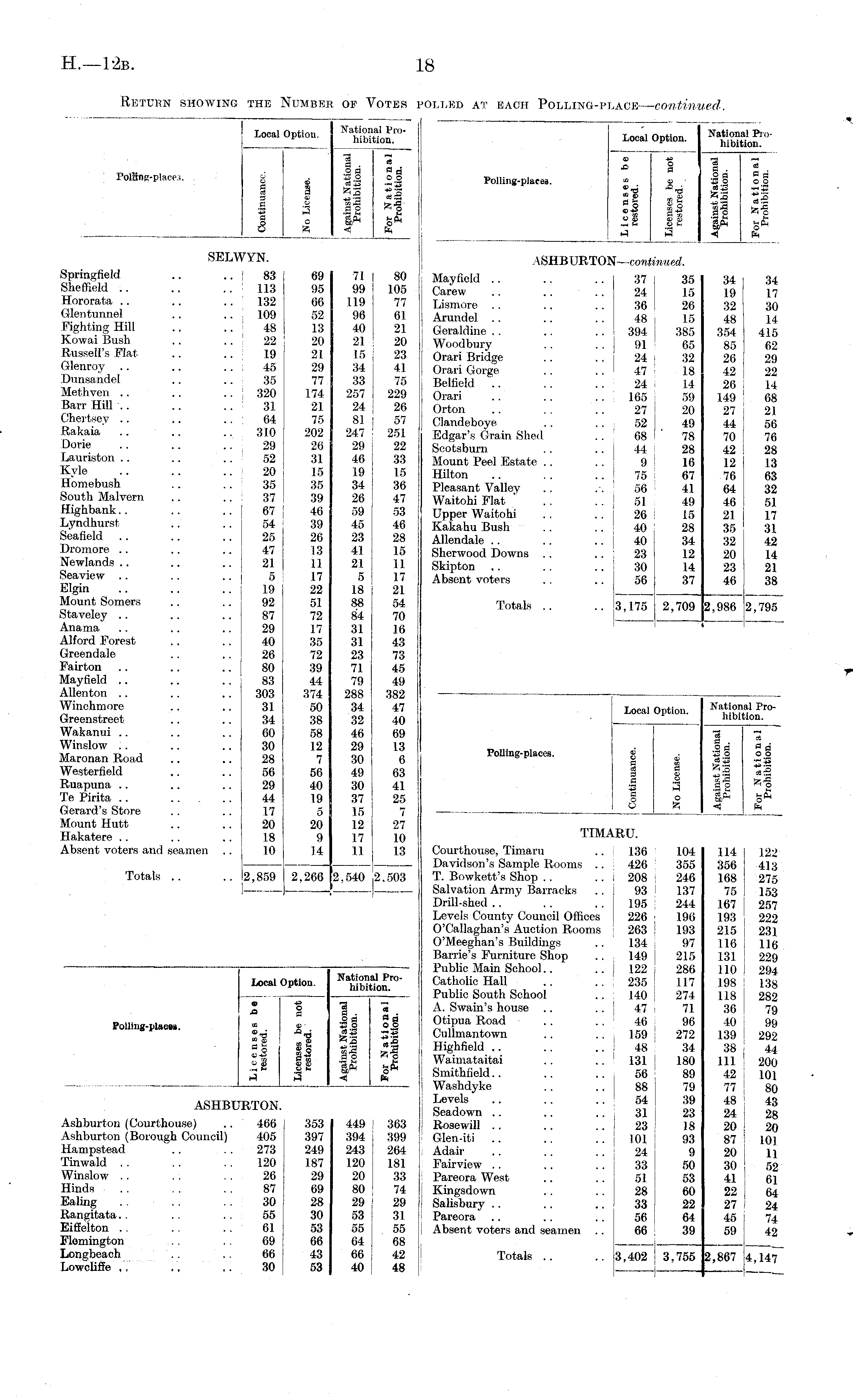 PoiSng-places. Local d o G B G 8 Option. as 3 a as cs 3 O te Nation! hibi. n .© G tes «a •3? a a. <! al Plotion. a te! PR SELWYN. Springfield Sheffield .. Hororata Glen tunnel Fighting Hill Kowai Bush Russell's Flat Glenroy Dunsandel Methven Barr Hill Chertsey Rakaia Dorie Lauriston Kyle Homebush South Malvern Highbank Lyndhurst Seafield Dromore Newlands Seaview Elgin Mount Somers Staveley Anama Alford F'orest Greendale Fairton Mayfield Allenton Winchmore Greenstreet Wakanui Winslow Maronan Road Westerfield Ruapuna Te Pirita Gerard's Store Mount Hutt Hakatere Absent voters and seamen .. ! 83 113 .. 132 .. [ 109 .. ; 48 .. 22 19 45 .. j 35 .. ! 320 ..I 31 .. I 64 .. j 310 .. ; 29 .. 52 .. 20 35 37 67 54 25 47 21 5 19 92 87 29 40 26 80 83 303 31 34 60 30 28 56 29 44 17 20 18 i .. 10 69 95 66 52 13 20 21 29 77 174 21 75 202 26 31 15 35 39 46 39 26 13 11 17 22 51 72 17 35 72 39 44 374 50 38 58 12 7 56 40 19 5 20 9 14 71 99 119 96 40 21 15 34 33 257 24 81 247 29 46 19 34 26 59 ! 45 23 41 21 5 18 88 84 31 31 23 71 79 288 34 32 46 29 30 49 30 37 15 12 17 11 80 105 77 61 21 20 23 41 75 229 26 57 251 22 33 15 36 47 53 46 28 15 11 17 21 54 70 16 43 73 45 49 382 47 40 69 13 6 63 41 25 7 27 10 13 Totals .. .. 2,859 2,266 2,540 2,503 Local Option. National Prohibition. Polling-place*. « . a t - S cc as ■ •■a ■"•a as g as " o So ,i£ S£ ►r 3 *CD a . .2 a r o te| J 8 ac" Cr i% PR .- as .is 0ASHBURTON. Ashburton (Courthouse) .. 466 Ashburton (Borough Council) 405 Hampstead .. . . 273 Tinwald . . 120 Winslow . . . . . . 26 Hinds . . .. .. 87 Ealing .. .. .. 30 Rangitata. . .. .. 55 Eiffelton .. .. .. 61 Flemington . . .. 69 Longbeach .. .. 66 Lowcliffe ,. "',"', ,. 30 353 397 249 187 29 69 28 30 53 66 43 53 449 394 243 120 20 80 29 53 55 64 66 40 363 399 264 181 33 74 29 31 55 68 42 48