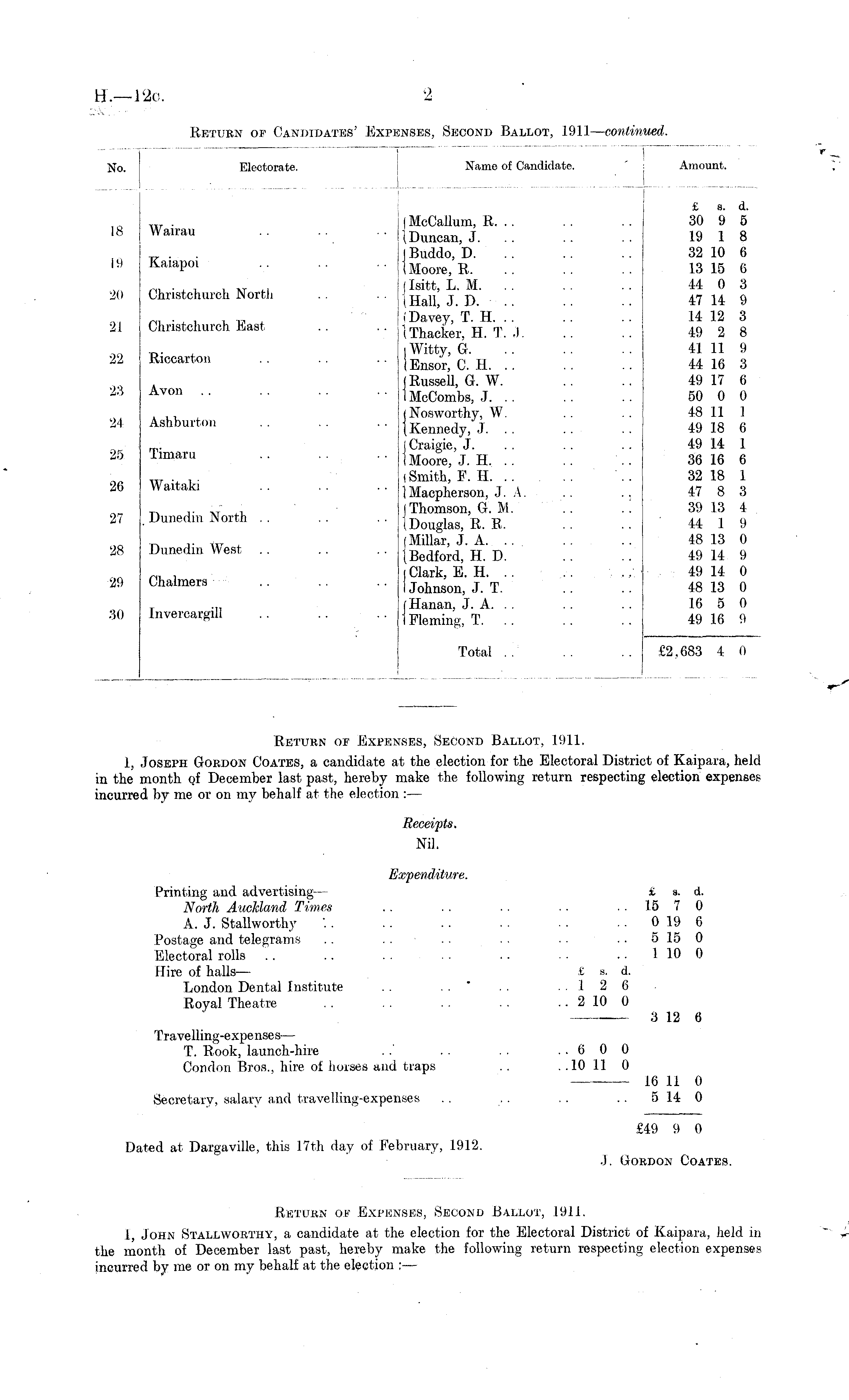 Return of Expenses, Second Ballot, 1911. 1, Joseph Gordon Coates, a candidate at the election for the Electoral District of Kaipara, held in the month of December last past, hereby make the following return respecting election expenses incurred by me or on my behalf at the election : — Receipts. Nil. Expenditure. Printing and advertising— £ s. d. North Auckland Times .. .. .. .. ..1570 A. J. Stallworthy '.. .. .. .. •. .. 019 6 Postage and telegrams .. .. .. . . .. 515 0 Electoral rolls .. .. .. .. .. .. 1 10 0 Hire of halls— £ s. d. London Dental Institute . . . . . . ..126 Royal Theatre .. .. 2 10 0 3 12 6 Travelling-expenses — T. Rook, launch-hire ..' .. .. ..600 Condon Bros., hire of horses and traps . . . .10 11 0 16 11 0 Secretary, salary and travelling-expenses .. . . . . 514 0 £49 9 0 Dated at Dargaville, this 17th day of February, 1912. J. Gordon Coates.