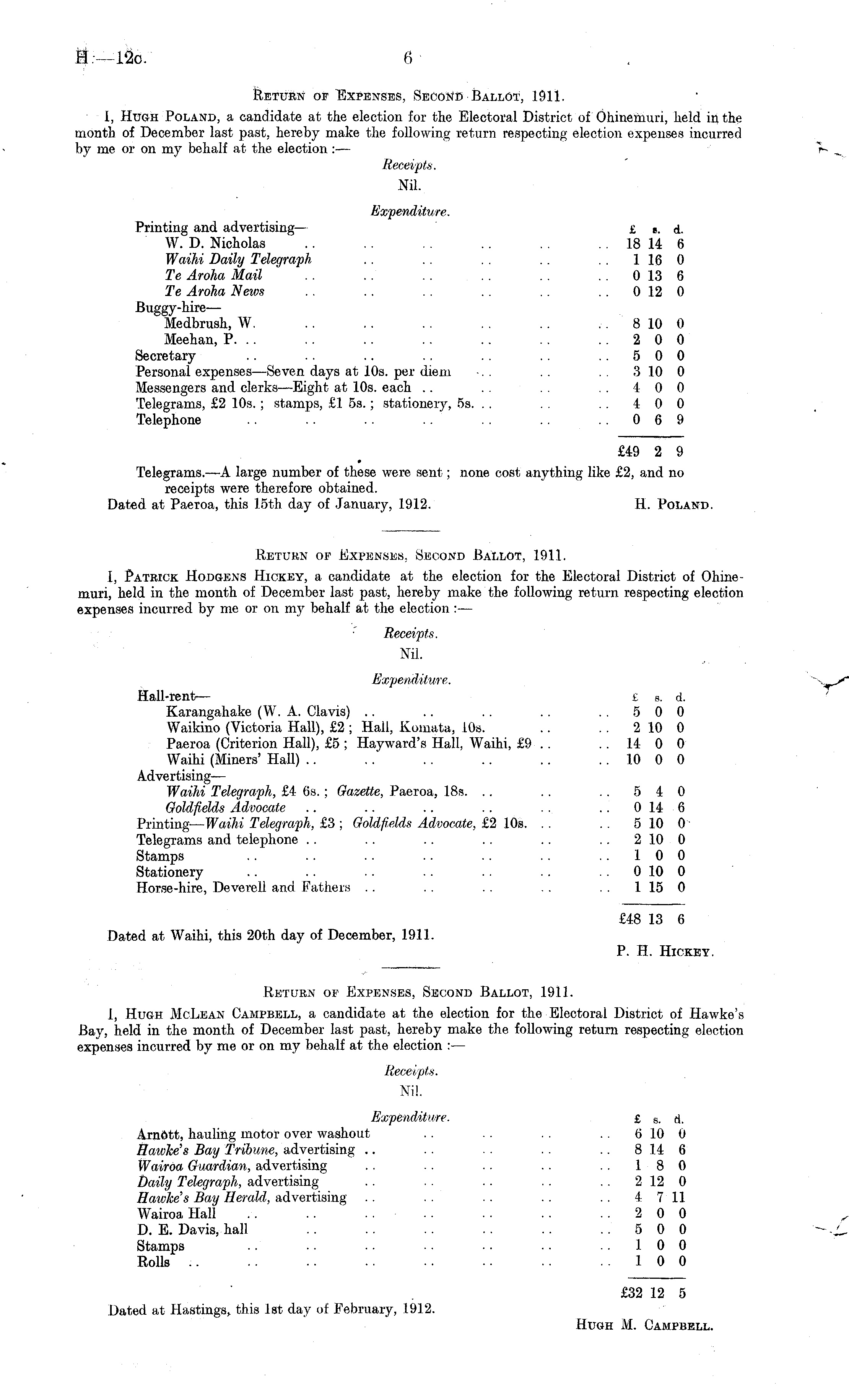 Return or Expenses, Second Ballot, 1911. 1, Hugh Poland, a candidate at the election for the Electoral District of Ohinemuri, held in the month of December last past, hereby make the following return respecting election expenses incurred by me or on my behalf at the election :■ — Receipts. Nil. Expenditure. Printing and advertising— £ c . d. W. D. Nicholas .. .. .. .. .. .. 18 14 6 Waihi Daily Telegraph .. .. . . .. .. 1160 Te Aroha Mail .. .. .. .. .. 013 6 Te Aroha News .. .. .. .. .. 012 0 Buggy-hire— Medbrush, W. .. .. .. . . .. 810 0 Meehan, P. .. .. .. .. .. .. ..200 Secretary .. .. .. .. .. .. ..500 Personal expenses —Seven days at 10s. per diem ■. . .. . . 310 0 Messengers and clerks —Eight at 10s. each .. .. .. ..400 Telegrams, £2 10s.; stamps, £1 55.; stationery, ss. .. .. .. 4 0 0 Telephone .. .. .. .. .. .. ..069 £49 2 9 Telegrams.—A large number of these were sent; none cost anything like £2, and no receipts were therefore obtained. Dated at Paeroa, this 15th day of January, 1912. H. Poland.