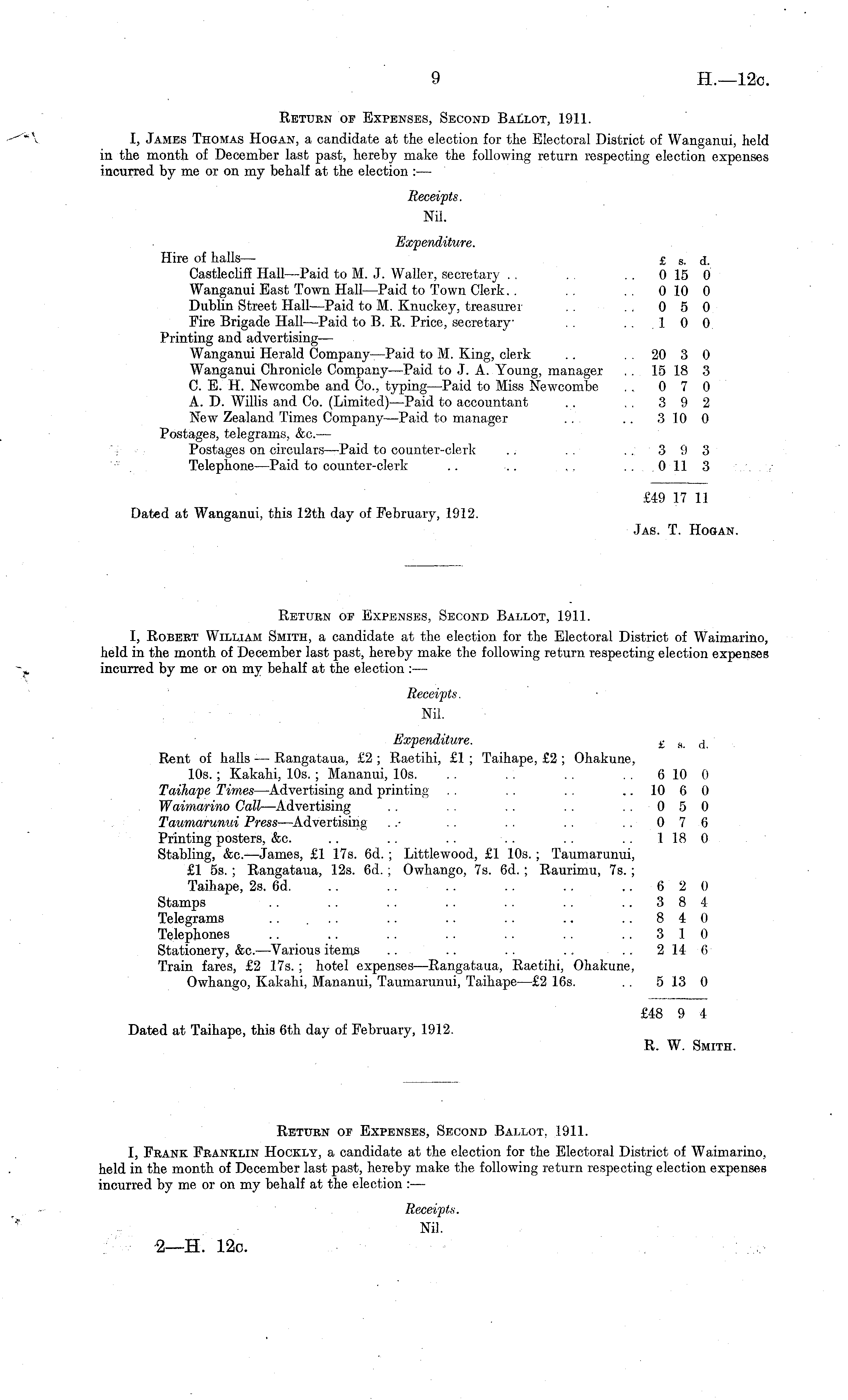 Return of Expenses, Second Ballot, 1911. I, James Thomas Hogan, a candidate at the election for the Electoral District of Wanganui, held in the month of December last past, hereby make the following return respecting election expenses incurred by me or on my behalf at the election : — Receipts. Nil. Expenditure. Hire of halls — £ s . J, Castleclifi Hall —Paid to M. J. Waller, secretary . . . . .. 015 0 Wanganui East Town Hall—Paid to Town Clerk.. .. .. 010 0 Dublin Street Hall—Paid to M. Kmickey, treasurer . . . , 0 5 0 Fire Brigade Hall—Paid to B. R. Price, secretary . . ..100 Printing and advertising — Wanganui Herald Company—Paid to M. King, clerk .. . . 20 3 0 Wanganui Chronicle Company—Paid to J. A. Young, manager . . 15 18 3 C. E. H. Newcombe and Co., typing —Paid to Miss Newcombe . . 0 7 0 A. D. Willis and Co. (Limited) —Paid to accountant .. .. 3 9 2 New Zealand Times Company—Paid to manager .. .. 3 10 0 Postages, telegrams, &c. — ■'■■'■ Postages on circulars—Paid to counter-clerk .. . . ..393 Telephone—Paid to counter-clerk .. .. .. 011 3 \\ : : £49 17 11 Dated at Wanganui, this 12th day of February, 1912. J as. T. Hogan.