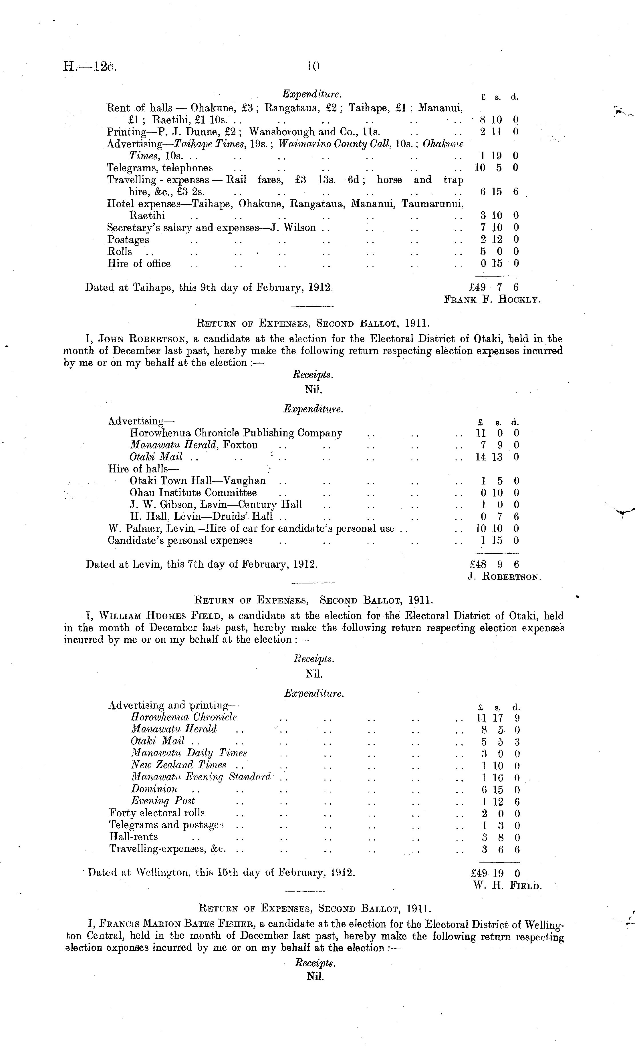 Return of Expenses, Second Ballot, 1911. I, William Hughes Field, a candidate at the election for the Electoral District of Otaki, held in the month of December last past, hereby make the following return respecting election expenses incurred by me or on my behalf at the election : — Receipts. Nil. Expenditure. Advertising and printing— £ s . d. Horowhenua Chronicle .. .. .. . . 11 17 9 Manawatu Herald .. . . . . . . .. ..850 Otaki Mail . . .. . . . . .. . . ..553 Manawatu Daily Times . . .. . . .. ..300 Neiv Zealand Times .. .. .. .. .. 1 10 0 Manawatu Evening Standard . . . . . . .. ... 11C 0 ■ Dominion .. .. .. .. .. .. Ql5 0 Evening Post .. .. . . . . . . 112 6 Forty electoral rolls .. .. .. .. .. ..200 Telegrams and postages .. .. .. .. .. ..130 Hall-rents .. .. .. .. .. .. ..380 Travelling-expenses, &c. . . . . .. . . .. ..366 Dated at Wellington, this 15th day of February, 1912. £49 19 0 W. H. Field. Return of Expenses, Second Ballot, 191 j. I, Francis Marion Bates Fisher, a candidate at the election for the Electoral District of Wellington Central, held in the month of December last past, hereby make the following return respecting election expenses incurred by me or on my behalf at the election :— Receipts. Nil.