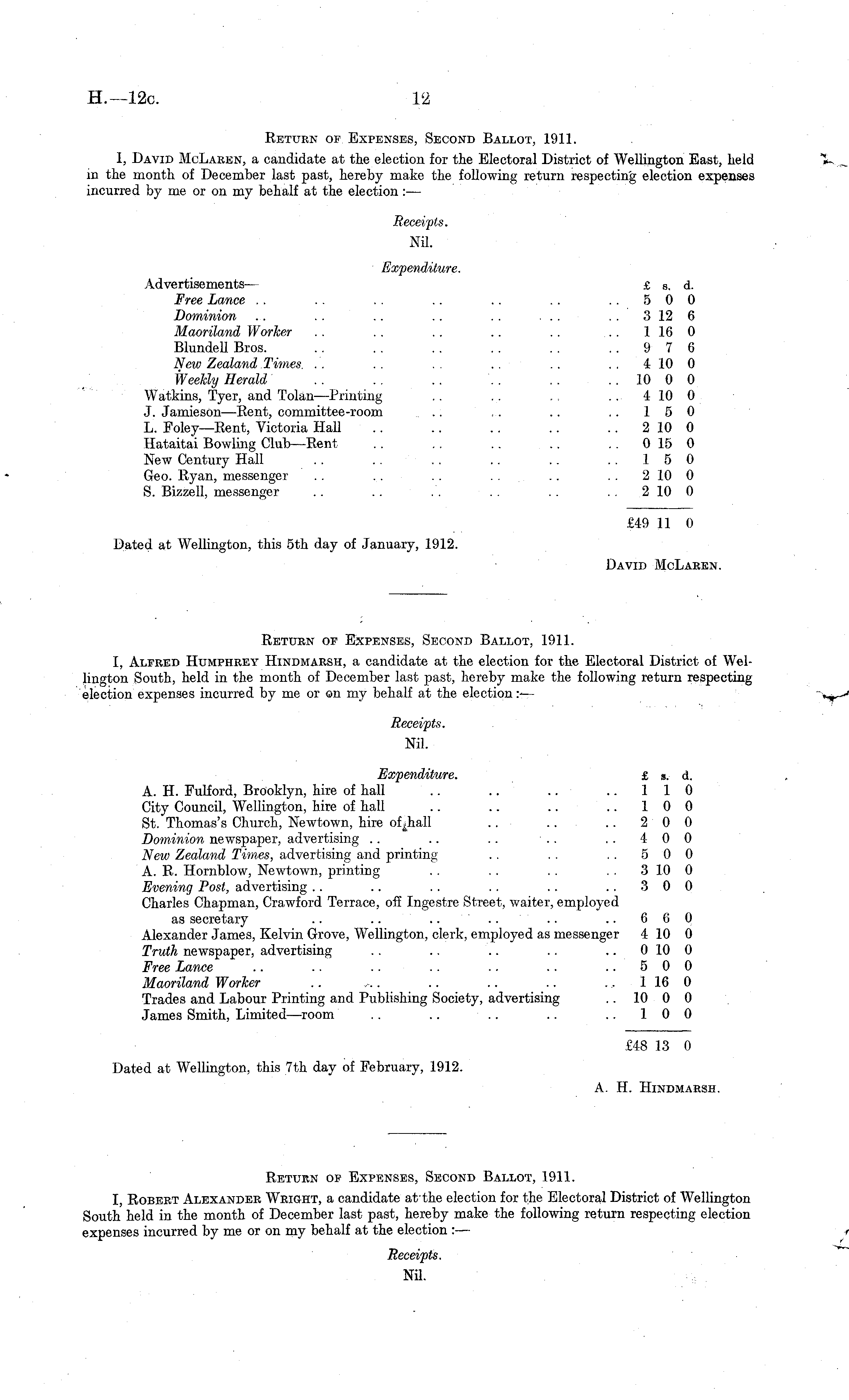 Return of Expenses, Second Ballot, 1911. I, Alfred Humphrey Hindmarsh, a candidate at the election for the Electoral District of Wellington South, held in the month of December last past, hereby make the following return respecting election expenses incurred by me or en my behalf at the election :— Receipts. Nil. Expenditure. £ s. d. A. H. Fulford, Brooklyn, hire of hall .. .. .. ..110 City Council, Wellington, hire of hall .. .. .. ..100 St. Thomas's Church, Newtown, hire .. .. .. 2 0 0 Dominion newspaper, advertising .. .. .. ■.. ..400 New Zealand Times, advertising and printing . . .. . . 5 0 0 A. R. Hornblow, Newtown, printing . . . . . . 310 0 Evening Post, advertising .. .. .. .. .. ..300 Charles Chapman, Crawford Terrace, off Ingestre Street, waiter, employed as secretary .. .. .. .. .. ..660 Alexander James, Kelvin Grove, Wellington, clerk, employed as messenger 410 0 Truth newspaper, advertising .. .. .. .. 010 0 Free Lance .. .. .. .. .. .. ..500 Maoriland Worker .. ... .. .. .. ... 1 16 0 Trades and Labour Printing and Publishing Society, advertising 10 0 0 James Smith, Limited —room .. .. .. .. ..100 £48 13 0 Dated at Wellington, this 7th day of February, 1912. A. H. Hindmarsh.
