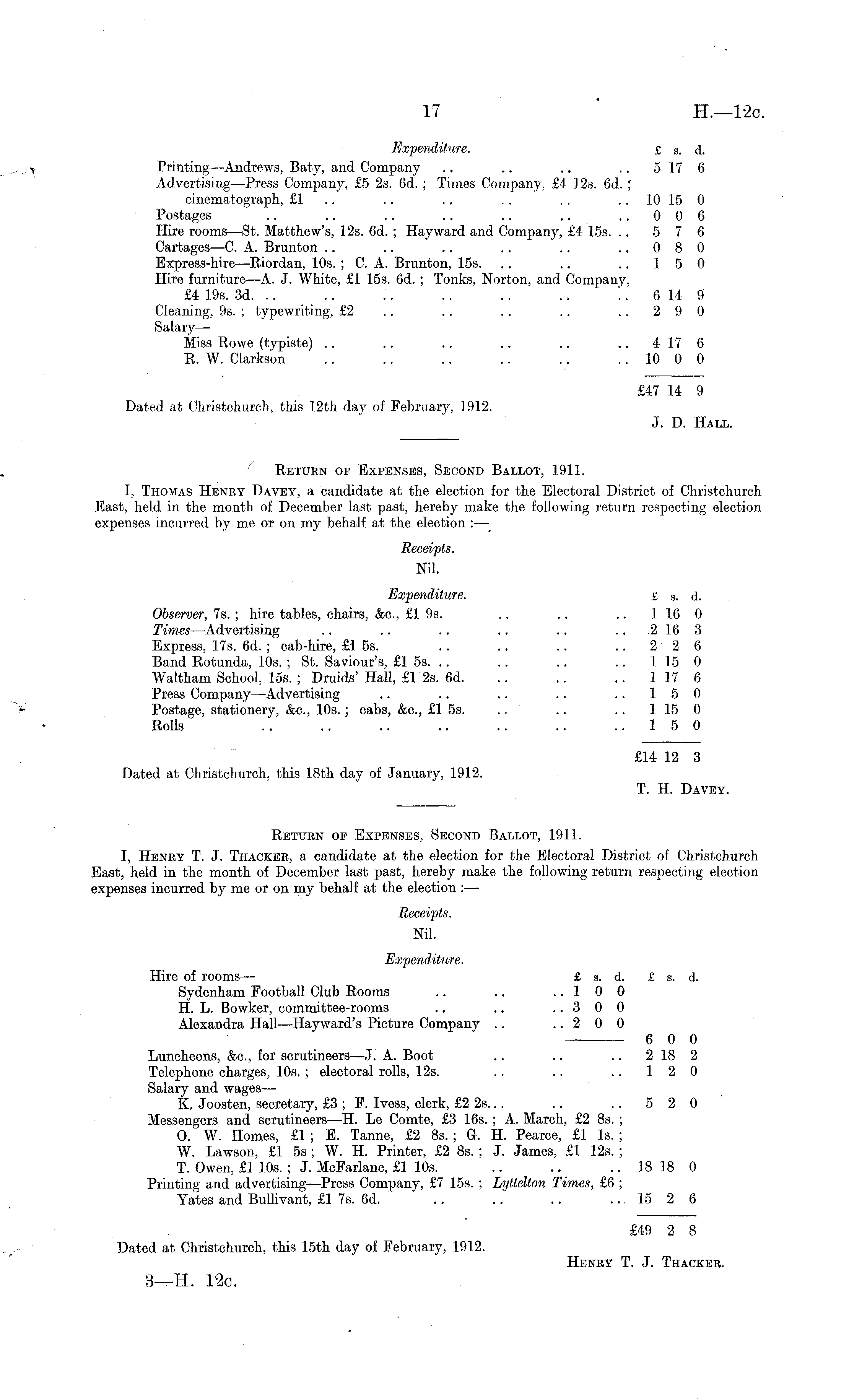 Return op Expenses, Second Ballot, 1911. I, Thomas Henry Davey, a candidate at the election for the Electoral District of Christchurch East, held in the month of December last past, hereby make the following return respecting election expenses incurred by me or on my behalf at the election : — Receipts. Nil. Expenditure. £ s. d. Observer, 7s. ; hire tables, chairs, &c, £1 9s. .. .. .. 116 0 Times —Advertising .. .. .. .. .. 2 16 3 Express, 17s. 6d. ; cab-hire, £1 ss. .. .. .. ..226 Band Rotunda, 10s. ; St. Saviour's, £1 ss. .. .. .. .. 1 15 0 Waltham School, 15s. ; Druids' Hall, £1 2s. 6d. .. .. . . 117 6 Press Company—Advertising .. .. .. .. ..150 Postage, stationery, &c, 10s.; cabs, &c, £1 ss. .. .. .. 115 0 Rolls .. .. .. .. .. .. ..150 £14 12 3 Dated at Christchurch, this 18th day of January, 1912. T. H. Davey.