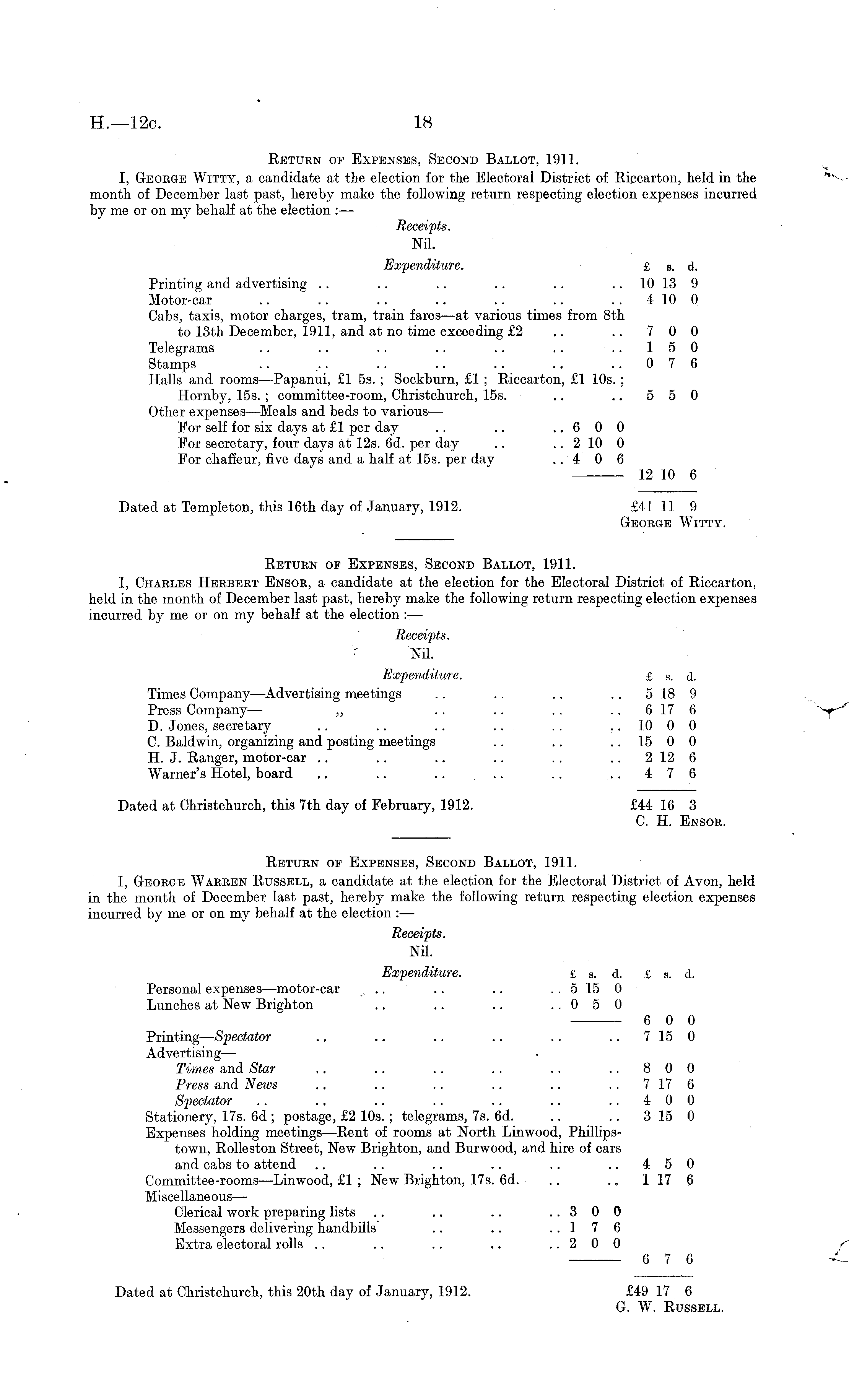 Return of Expenses, Second Ballot, 1911. I, George Warren Russell, a candidate at the election for the Electoral District of Avon, held in the month of December last past, hereby make the following return respecting election expenses incurred by me or on my behalf at the election : — Receipts. Nil. Expenditure. £ s. d. £ s. d. Personal expenses —motor-car .. .. .. . . 515 0 Lunches at New Brighton .. .. .. ..050 6 0 0 Printing — Spectator .. .. .. .. .. 7 15 0 Advertising — Times and Star .. .. .. .. .. ..800 Press and News .. .. .. .. .. 7 17 6 Spectator .. .. .. .. .. .. ..400 Stationery, 17s. 6d ; postage, £2 10s.; telegrams, 7s. 6d. .. .. 3 15 0 Expenses holding meetings —Rent of rooms at North Linwood, Phillipstown, Rolleston Street, New Brighton, and Burwood, and hire of cars and cabs to attend .. .. .. .. .. ..450 Committee-rooms —Linwood, £1 ; New Brighton, 17s. 6d. .. .. 117 6 Miscellaneous — Clerical work preparing lists .. .. .. ..300 Messengers delivering handbills .. .. ..176 Extra electoral rolls .. .. .. .. ..200 6 7 6 Dated at Christchurch, this 20th day of January, 1912. £49 17 6 G. W. Russell.