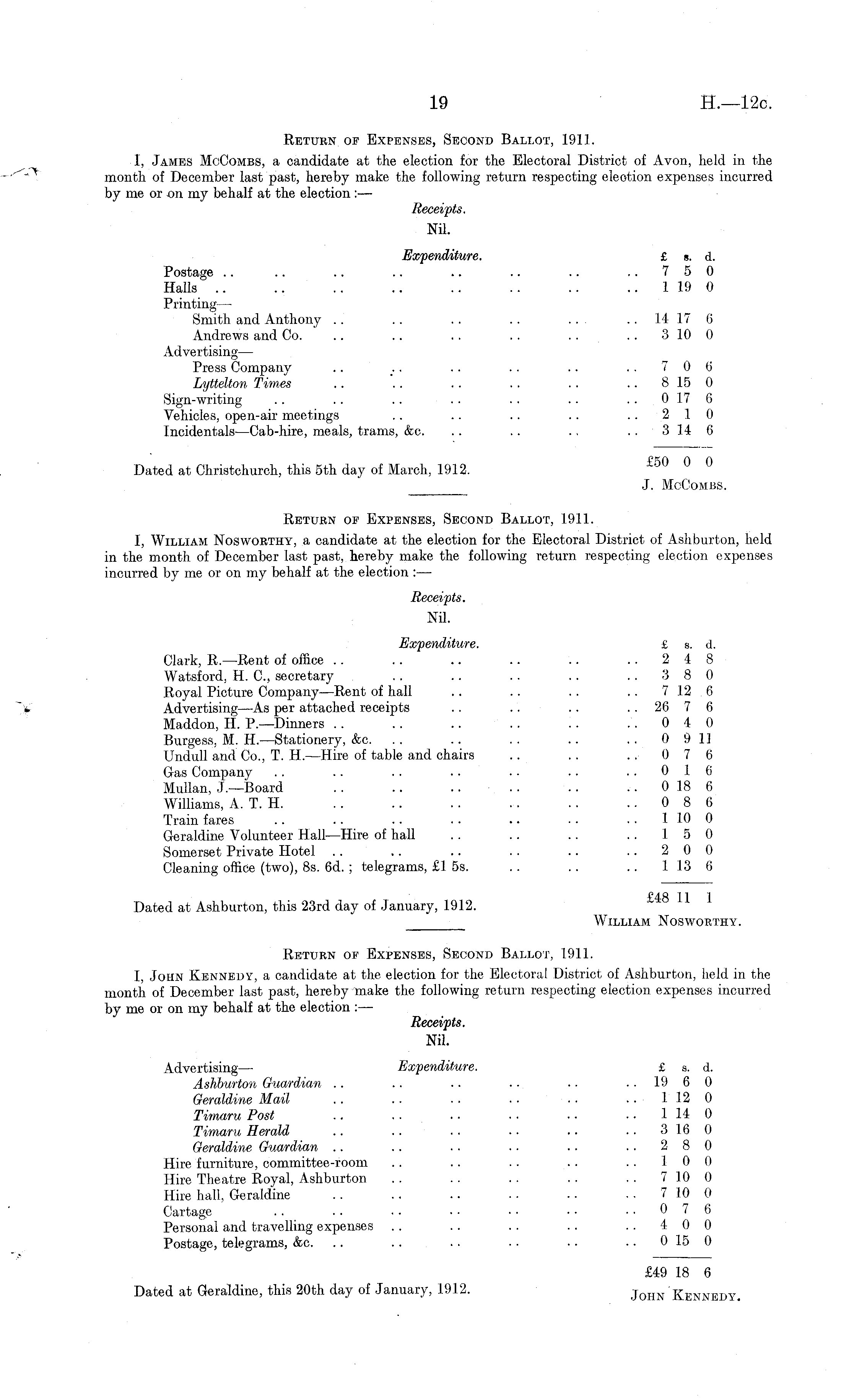 Return of Expenses, Second Ballot, 1911. I, James McCombs, a candidate at the election for the Electoral District of Avon, held in the month of December last past, hereby make the following return respecting election expenses incurred by me or on my behalf at the election : — Receipts. Nil. Expenditure. £ s. d. Postage .. .. .. .. .. .. .. ..750 Halls .. .. .. .. .. .. .. .. 1 19 0 Printing — Smith and Anthony . . . . . . . . ... 14 17 G Andrews and Co. .. .. .. .. .. 310 0 Advertising — Press Company .. .. . . .. . . ..706 Lyttelton Times .. . . .. . . . . 815 0 Sign-writing .. .. .. . . . . .. 017 G Vehicles, open-air meetings .. .. .. .. ..210 Incidentals —Cab-hire, meals, trams, &c. .. .. .. 3 14 6 Dated at Christchurch, this sth day of March, 1912. J. MoCombs.
