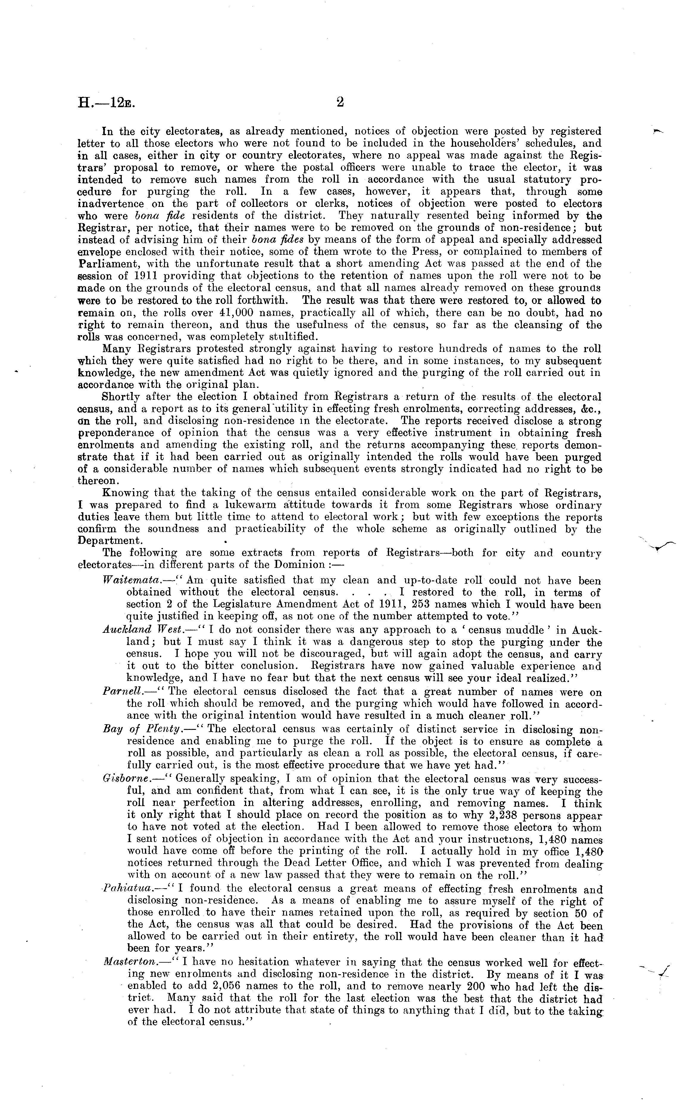 In the city electorates, as already mentioned, notices of objection were posted by registered letter to all those electors who were not found to be included in the householders' schedules, and in all cases, either in city or country electorates, where no appeal was made against the Registrars' proposal to remove, or where the postal officers were unable to trace the elector, it was intended to remove such names from the roll in accordance with the usual statutory procedure for purging the roll. In a few cases, however, it appears that, through some inadvertence on the part of collectors or clerks, notices of objection were posted to electors who were bona fide residents of the district. They naturally resented being informed by the Registrar, per notice, that their names were to be removed on the grounds of non-residence; but instead of advising him of their bona fides by means of the form of appeal and specially addressed envelope enclosed with their notice, some of them wrote to the Press, or complained to members of Parliament, with the unfortunate result that a short amending Act was passed at the end of the session of 1911 providing that objections to the retention of names upon the roll were not to be made on the grounds of the electoral census, and that all names already removed on these grounds were to be restored to the roll forthwith. The result was that there were restored to, or allowed to remain on, the rolls over 41,000 names, practically all of which, there can be no doubt, had no right to remain thereon, and thus the usefulness of the census, so far as the cleansing of the rolls was concerned, was completely stultified. Many Registrars protested strongly against having to restore hundreds of names to the roll which they were quite satisfied had no right to be there, and in some instances, to my subsequent knowledge, the new amendment Act was quietly ignored and the purging of the roll carried out in accordance with the original plan. Shortly after the election I obtained from Registrars a return of the results of the electoral census, and a report as to its generalutility in effecting fresh enrolments, correcting addresses, &c, on the roll, and disclosing non-residence in the electorate. The reports received disclose a strong preponderance of opinion that the census was a very effective instrument in obtaining fresh enrolments and amending the existing roll, and the returns accompanying these reports demonstrate that if it had been carried out as originally intended the rolls would have been purged of a considerable number of names which subsequent events strongly indicated had no right to be thereon. Knowing that the taking of the census entailed considerable work on the part of Registrars, I was prepared to find a lukewarm attitude towards it from some Registrars whose ordinary duties leave them but little time to attend to electoral w r ork; but with few exceptions the reports confirm the soundness and practicability of the whole scheme as originally outlined by the Department. The following are some extracts from reports of Registrars—both for city and country electorates —in different parts of the Dominion : — Waitemata. — " Am quite satisfied that my clean and up-to-date roll could not have been obtained without the electoral census. ... I restored to the roll, in terms of section 2 of the Legislature Amendment Act of 1911, 253 names which I would have been quite justified in keeping off, as not one of the number attempted to vote." Auckland West. —" I do not consider there was any approach to a ' census muddle ' in Auckland ; but I must say I think it was a dangerous step to stop the purging under the census. I hope you will not be discouraged, but will again adopt the census, and carry it out to the bitter conclusion. Registrars have now gained valuable experience and knowledge, and I have no fear but that the next census will see your ideal realized." Parnell. —" The electoral census disclosed the fact that a great number of names were on the roll which should be removed, and the purging which would have followed in accordance with the original intention would have resulted in a much cleaner roll." Bay of Plenty. —" The electoral census was certainly of distinct service in disclosing nonresidence and enabling me to purge the roll. If the object is to ensure as complete a roll as possible, and particularly as clean a roll as possible, the electoral census, if carefully carried out, is the most effective procedure that we have yet had." Gisborne. —" Generally speaking, I am of opinion that the electoral census was very successful, and am confident that, from what I can see, it is the only true way of keeping the roll near perfection in altering addresses, enrolling, and removing names. I think it only right that I should place on record the position as to why 2,238 persons appear to have not voted at the election. Had I been allowed to remove those electors to whom I sent notices of objection in accordance with the Act and your instructions, 1,480 names would have come off before the printing of the roll. I actually hold in my office 1,480' notices returned through the Dead Letter Office, and which I was prevented from dealing with on account of a new law passed that they were to remain on the roll." Pahiatua. —'"' I found the electoral census a great means of effecting fresh enrolments and disclosing non-residence. As a means of enabling me to assure myself of the right of those enrolled to have their names retained upon the roll, as required by section 50 of the Act, the census was all that could be desired. Had the provisions of the Act been allowed to be carried out in their entirety, the roll would have been cleaner than it had been for years." Masterton. —" I have no hesitation whatever in saying that the census worked well for effecting new enrolments and disclosing non-residence in the district. By means of it I was - enabled to add 2,05