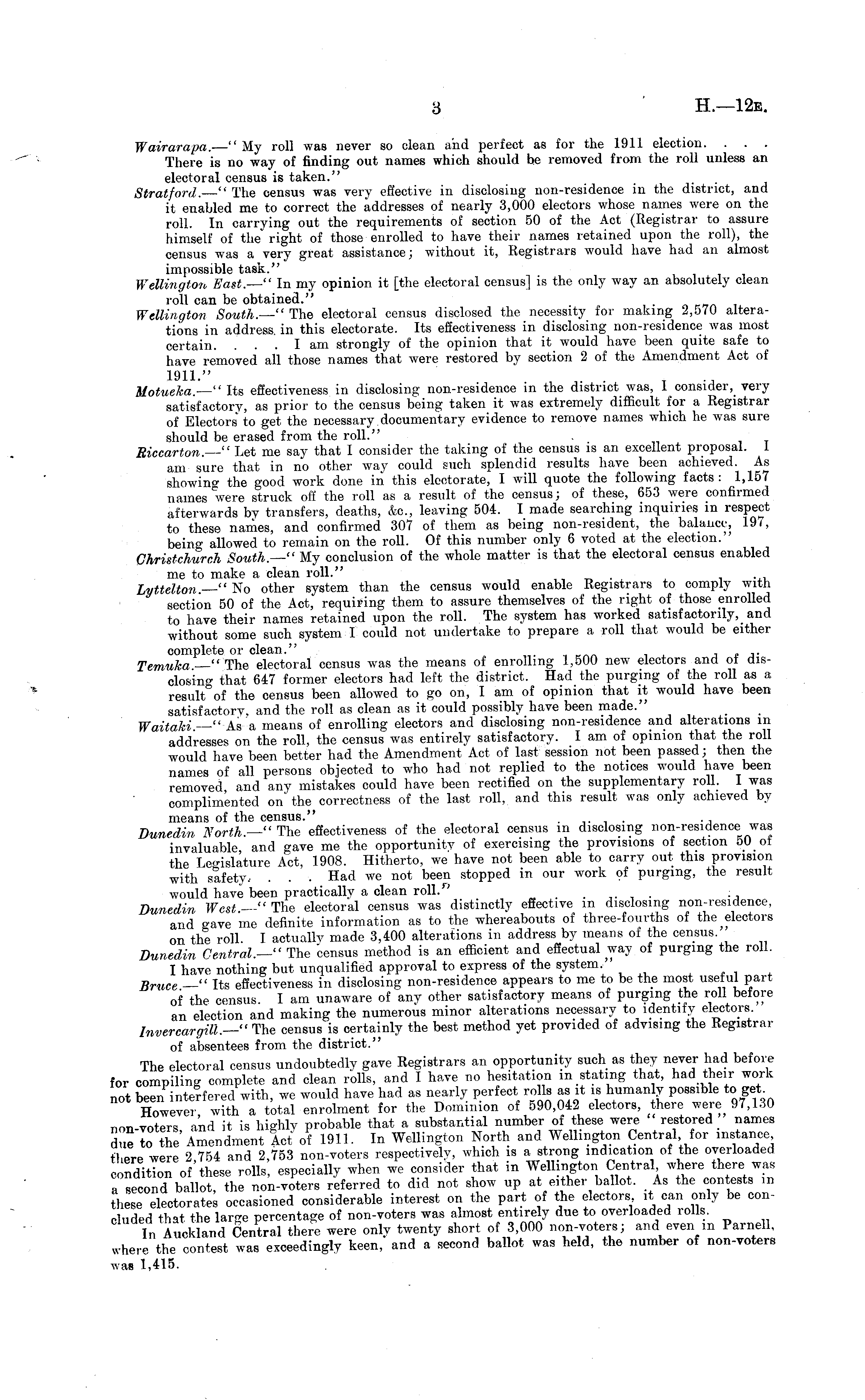 Wairarapa. —" My roll was never so clean and perfect as for the 1911 election. .. . There is no way of finding out names which should be removed from the roll unless an electoral census is taken." Stratford. —" The census was very effective in disclosing non-residence in the district, and it enabled me to correct the addresses of nearly 3,000 electors whose names were on the roll. In carrying out the requirements of section 50 of the Act (Registrar to assure himself of the right of those enrolled to have their names retained upon the roll), the census was a very great assistance; without it, Registrars would have had an almost impossible task." Wellington East.—" In my opinion it [the electoral census] is the only way an absolutely clean roll can be obtained." Wellington South.—" The electoral census disclosed the necessity for making 2,570 alterations in address, in this electorate. Its effectiveness in disclosing non-residence was most certain. . . . I am strongly of the opinion that it would have been quite safe to have removed all those names that were restored by section 2 of the Amendment Act of 1911." Motueka. —" Its effectiveness in disclosing non-residence m the district was, 1 very satisfactory, as prior to the census being taken it was extremely difficult for a Registrar of Electors* to get the necessary documentary evidence to remove names which he was sure should be erased from the roll." Riccarton.—" Let me say that I consider the taking of the census is an excellent proposal. I am sure that in no other way could such splendid results have been achieved. As showino- the good work done in this electorate, I wall quote the following facts: 1,157 names were struck off the roll as a result of the census; of these, 653 were confirmed afterwards by transfers, deaths, &c, leaving 504. I made searching inquiries in respect to these names, and confirmed 307 of them as being non-resident, the balance, 197, being allowed to remain on the roll. Of this number only 6 voted at the election." Christchurch South.—" My conclusion of the whole matter is that the electoral census enabled me to make a clean roll." Lyttelton.—" No other system than the census would enable Registrars to comply with section 50 of the Act, requiring them to assure themselves of the right of those enrolled to have their names retained upon the roll. The system has worked and without some such system I could not undertake to prepare a roll that would be either complete or clean." Temuka —" The electoral census was the means of enrolling 1,500 new electors and of disclosing that 647 former electors had left the district. Had the purging of the roll as a result of the census been allowed to go on, I am of opinion that it would have been satisfactory and the roll as clean as it could possibly have been made." Waitaki —" As a means of enrolling electors and disclosing non-residence and alterations in addresses on the roll, the census was entirely satisfactory. lam of opinion that the roll would have been better had the Amendment Act of last session not been passed; then the names of all persons objected to who had not replied to the notices would have been removed and any mistakes could have been rectified on the supplementary roll. I was complimented on the correctness of the last roll, and this result was only achieved by means of the census." , Dunedin North —" The effectiveness of the electoral census in disclosing non-residence was invaluable and gave me the opportunity of exercising the provisions of section 50 of the Legislature Act, 1908. Hitherto, we have not been able to carry out this provision with safety.- . . . Had we not been stopped in our work of purging, the result would have been practically a clean roll/' , • Dunedin West —" The electoral census was distinctly effective m disclosing non-residence, and gave me definite information as to the whereabouts of three-fourths of the electors on the roll. I actuallv made 3,400 alterations in address by means of the census. Dunedin Central.—" The census method is an efficient and effectual way of purging the roll. I have nothing but unqualified approval to express of the system." Brnce _<< Its effectiveness in disclosing non-residence appears to me to be the most useful part of the census lam unaware of any other satisfactory means of purging the roll before an election and making the numerous minor alterations necessary to identify electors. Invercargill.—" The census is certainly the best method yet provided of advising the Registrar of absentees from the district." The electoral census undoubtedly gave Registrars an opportunity such as they never had before for compiling complete and clean rolls, and I have no hesitation in stating that, had their work not been interfered with, we would have had as nearly perfect rolls as it is humanly possible to get. However with a total enrolment for the Dominion of 590,042 electors, there were 97,130 non-voters a'nd it is highly probable that a substantial number of these were restored names due to the' Amendment Act of 1911. In Wellington North and Wellington Central for instance there were 2 754 and 2,753 non-voters respectively, which is a strong indication of the overloaded condition of'these rolls, especially when we consider that in Wellington Central where there was a second ballot, the non-voters referred to did not show up at either ballot. As the contests in these electorates occasioned considerable interest on the part of the electors it can only be concluded that the large percentage of non-voters was almost entirely due to overloaded rolls. In Auckland Central there were only twenty short of 3,000 non-voters; and even m Parnell, where the contest was exceedingly keen, and a second ballot was held, the number of non-voters was 1,415.