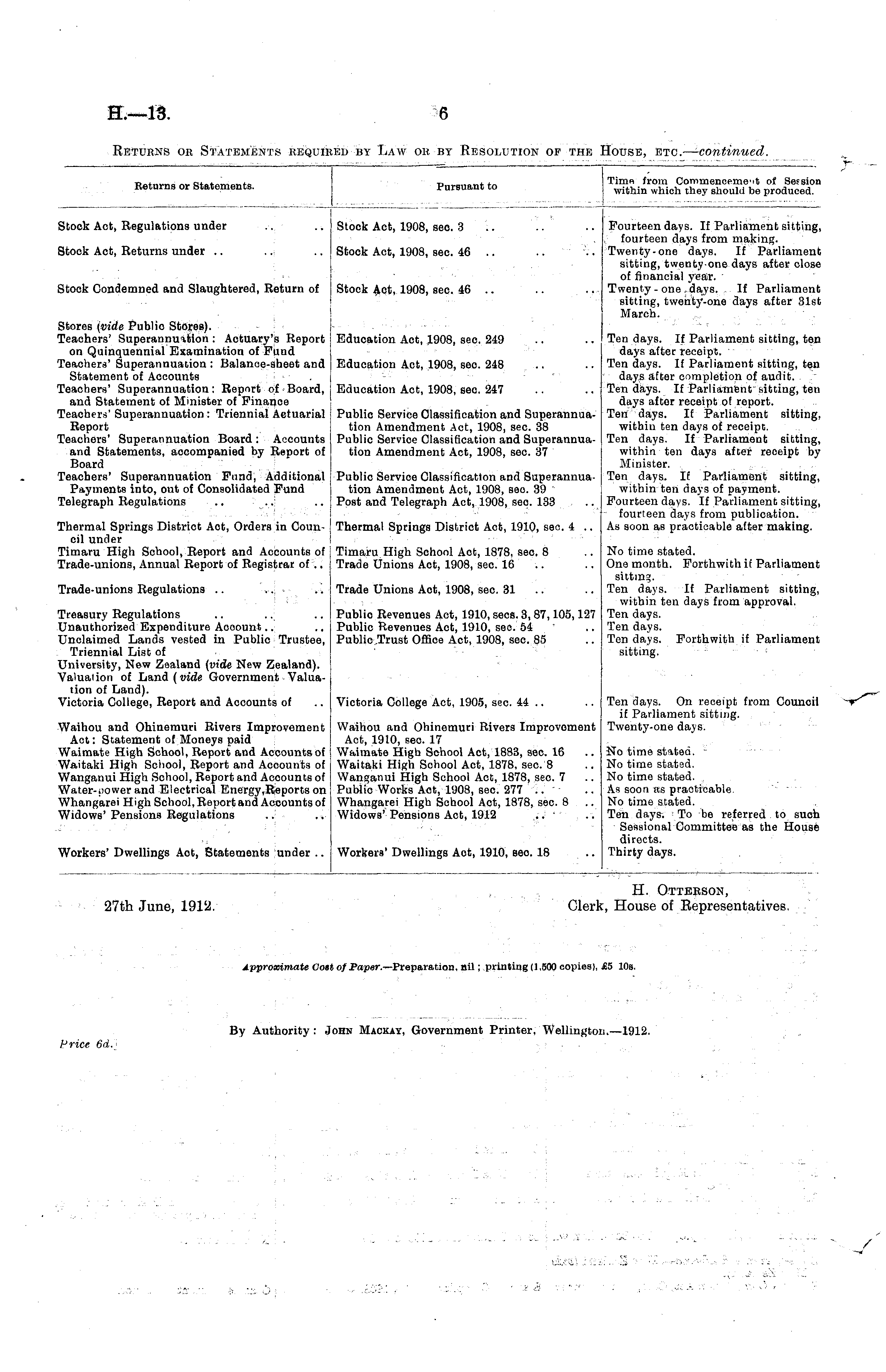 Returns or Statements. Pursuant to Hme from Commencement of Sessioi within which they should be produced. Stock Act, Regulations under Stock Act, 1908, seo. 3 Fourteen days. If Parliament sitting, fourteen days from making. Twenty-one days. If Parliament sitting, twenty-one days after close of financial year. Twenty - one .days. If Parliament sitting, twenty-one days after 31st March. Stock Act, Returns under Stock Act, 1908, sec. 46 .. Stock Condemned and Slaughtered, Return of Stook Act, 1908, sec. 46 .. Stores (vide Publio Stores). Teachers' Superannuation : Actuary's Report on Quinquennial Examination of Fund Teachers' Superannuation : Balance-sheet and Statement of Aocounts Teachers' Superannuation: Report of Board, and Statement of Minister of Finanoe Teachers' Superannuation: Triennial Actuarial Report Teachers' Superannuation Board: Accounts and Statements, accompanied by Report of Board Teachers' Superannuation Fund, Additional Payments into, out of Consolidated Fund Telegraph Regulations Education Act, 1908, sec. 249 Education Act, 1908, sec. 248 Education Act, 1908, sec 247 Public Service Classification and Superannuation Amendment Act, 1908, sec. 38 Public Service Classification and Superannuation Amendment Act, 1908, sec 37 Ten days. If Parliament sitting, ten days after receipt. Ten days. If Parliament sitting, ten days after completion of audit. Teu days. If Parliament sitting, ten days after receipt of report. Ten days. If Parliament sitting, within ten days of receipt. Ten days. If Parliament sitting, within ten days after reoeipt by Minister. Ten days. If Parliament sitting, within ten days of payment. Fourteen days. If Parliament sitting, fourteen days from publication. As soon as practicable after making. Public Service Classification and Superannuation Amendment Act, 1908, sec. 39 Post and Telegraph Act, 1908, seo. 133 ... Thermal Springs District Aot, Orders in Council under Timaru High School, Report and Accounts of Trade-unions, Annual Report of Registrar of .. Thermal Springs District Act, 1910, sec. 4 .. Trade-unions Regulations .. .... ■ Timaru High School Act, 1878, seo. 8 Trade Unions Act, 1908, sec. 16 Trade Unions Aot, 1908, sec. 31 Publio Revenues Act, 1910, sees. 3, 87,105,127 Public Revenues Act, 1910, seo. 54 Public Trust Office Act, 1908, sec. 85 No time stated. One month. Forthwith if Parliament sitting. Ten days. If Parliament sitting, within ten days from approval. Ten days. Ten days. Ten days. Forthwith if Parliament sitting. Treasury Regulations Unauthorized Expenditure Acoount.. Unclaimed Lands vested in Public Trustee, Triennial List of University, New Zealand (vide New Zealand). Valuation of iiani (vide Government Valuation of Land). Victoria College, Report and Accounts of Victoria College Act, 1905, sec. 44 .. Ten days. On receipt from Council if Parliament sitting. Twenty-one days. Waihou and Ohinemuri Rivers Improvement Act: Statement of Moneys paid Waimate High School, Report and Accounts of Waitaki High School, Report and Accounts of Wanganui High School, Report and Acoounts of Water-uower and Electrical Energy .Reports on Whangarei High School, Report and Accounts of Widows'Pensions Regulations .. Waihou and Ohinemuri Rivers Improvement Act, 1910, sec 17 Waimate High School Aot, 1883, sec. 16 Waitaki High School Act, 1878, seo. 8 Wanganui High School Act, 1878, sec. 7 Public Works Act, 1908, sec. 277 .. Whangarei High School Act, 1878, sec. 8 Widows'Pensions Act, 1912 No time stated. - No time stated. No time stated. , As soon as practicable. No time stated. Ten days. ; To be referred to such Sessional Committee as the House directs. Thirty days. Workers' Dwellings Aot, Statements under .. Workers' Dwellings Act, 1910, seo. 18