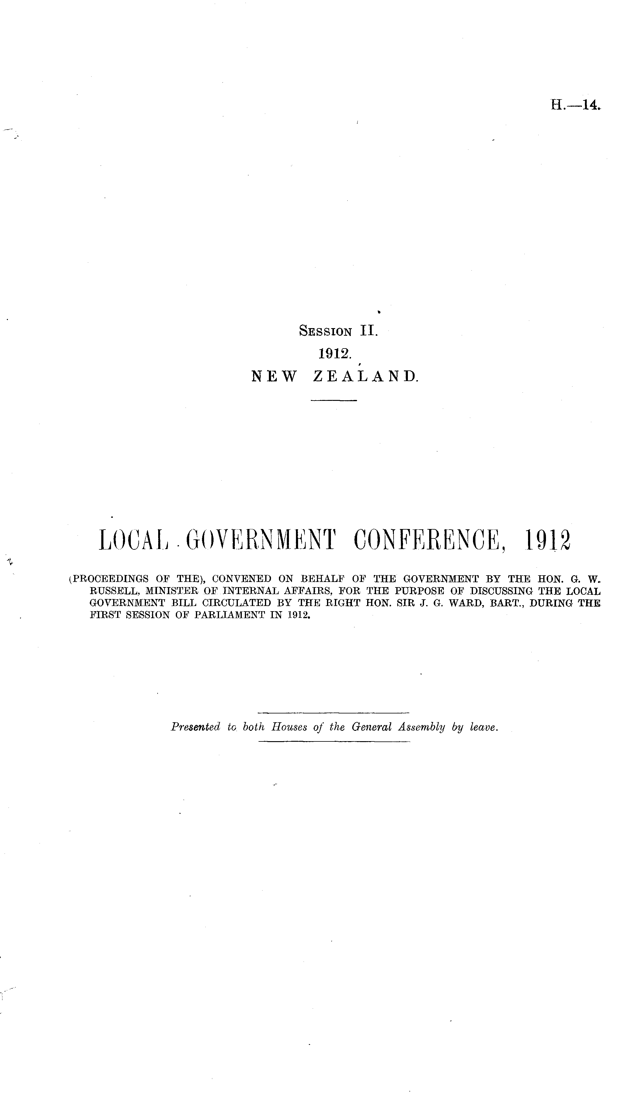 LOCAL GOVERNMENT CONFERENCE, 1912 (PROCEEDINGS OF THE), CONVENED ON BEHALF OF THE GOVERNMENT BY THE HON. G. W. RUSSELL, MINISTER OF INTERNAL AFFAIRS, FOR THE PURPOSE OF DISCUSSING THE LOCAL GOVERNMENT BILL CIRCULATED BY THE RIGHT HON. SIR J. G. WARD, BART., DURING THE FIRST SESSION OF PARLIAMENT IN 1912.