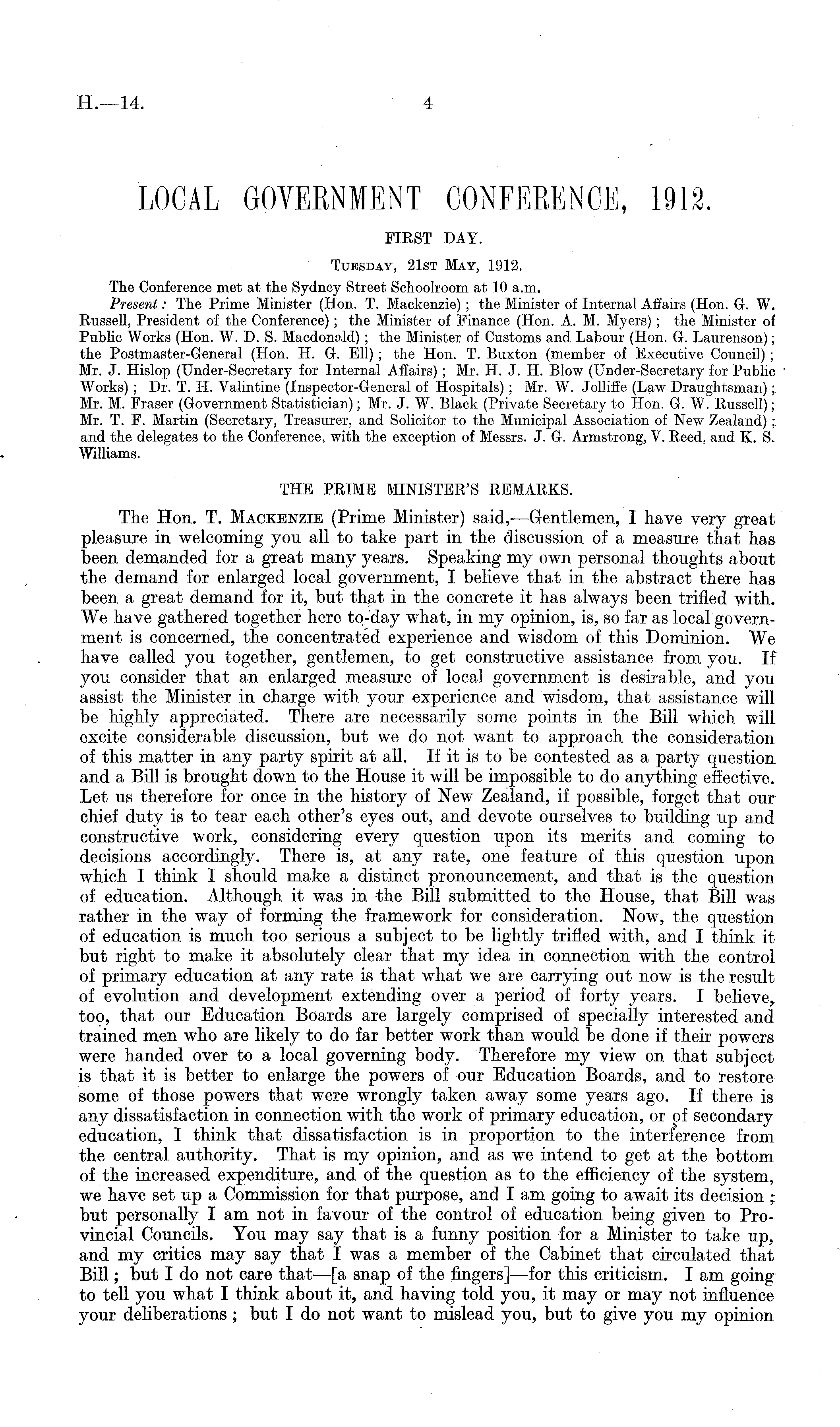 LOCAL GOVERNMENT CONFERENCE, 1912. FIRST DAY. Tuesday, 21st May, 1912. The Conference met at the Sydney Street Schoolroom at 10 a.m. Present: The Prime Minister (Hon. T. Mackenzie) ; the Minister of Internal Affairs (Hon. G. W. Russell, President of the Conference); the Minister of Finance (Hon. A. M. Myers) ; the Minister of Public Works (Hon. W. D. S. Macdonald) ; the Minister of Customs and Labour (Hon. G. Laurenson); the Postmaster-General (Hon. H. G. Ell) ; the Hon. T. Buxton (member of Executive Council) ; Mr. J. Hislop (Under-Secretary for Internal Affairs) ; Mr. H. J. H. Blow (Under-Secretary for Public Works) ; Dr. T. H. Valintine (Inspector-General of Hospitals) ; Mr. W. Jolliffe (Law Draughtsman) - r Mr. M. Fraser (Government Statistician); Mr. J. W. Black (Private Secretary to Hon. G. W. Russell); Mr. T. F. Martin (Secretary, Treasurer, and Solicitor to the Municipal Association of New Zealand) ; and the delegates to the Conference, with the exception of Messrs. J. G. Armstrong, V. Reed, and K. S. Williams. THE PRIME MINISTER'S REMARKS. The Hon. T. Mackenzie (Prime Minister) said,- —Gentlemen, I have very great pleasure in welcoming you all to take part in the discussion of a measure that has been demanded for a great many years. Speaking my own personal thoughts about the demand for enlarged local government, I believe that in the abstract there has been a great demand for it, but that in the concrete it has always been trifled with. We have gathered together here to-day what, in my opinion, is, so far as local government is concerned, the concentrated experience and wisdom of this Dominion. We have called you together, gentlemen, to get constructive assistance from you. If you consider that an enlarged measure of local government is desirable, and you assist the Minister in charge with your experience and wisdom, that assistance will be highly appreciated. There are necessarily some points in the Bill which will excite considerable discussion, but we do not want to approach the consideration of this matter in any party spirit at all. If it is to be contested as a party question and a Bill is brought down to the House it will be impossible to do anything effective. Let us therefore for once in the history of New Zealand, if possible, forget that our chief duty is to tear each other's eyes out, and devote ourselves to building up and constructive work, considering every question upon its merits and coming to decisions accordingly. There is, at any rate, one feature of this question upon which I think I should make a distinct pronouncement, and that is the question of education. Although it was in the Bill submitted to the House, that Bill was rather in the way of forming the framework for consideration. Now, the question of education is much too serious a subject to be lightly trifled with, and I think it but right to make it absolutely clear that my idea in connection with the control of primary education at any rate is that what we are carrying out now is the result of evolution and development extending over a period of forty years. I believe, too, that our Education Boards are largely comprised of specially interested and trained men who are likely to do far better work than would be done if their powers were handed over to a local governing body. Therefore my view on that subject is that it is better to enlarge the powers of our Education Boards, and to restore some of those powers that were wrongly taken away some years ago. If there is any dissatisfaction in connection with the work of primary education, or of secondary education, I think that dissatisfaction is in proportion to the interference from the central authority. That is my opinion, and as we intend to get at the bottom of the increased expenditure, and of the question as to the efficiency of the system, we have set up a Commission for that purpose, and I am going to await its decision ; but personally I am not in favour of the control of education being given to Provincial Councils. You may say that is a funny position for a Minister to take up, and my critics may say that I was a member of the Cabinet that circulated that Bill; but Ido not care that—[a snap of the fingers] —for this criticism. lam going to tell you what I think about it, and having told you, it may or may not influence your deliberations; but Ido not want to mislead you, but to give you my opinion
