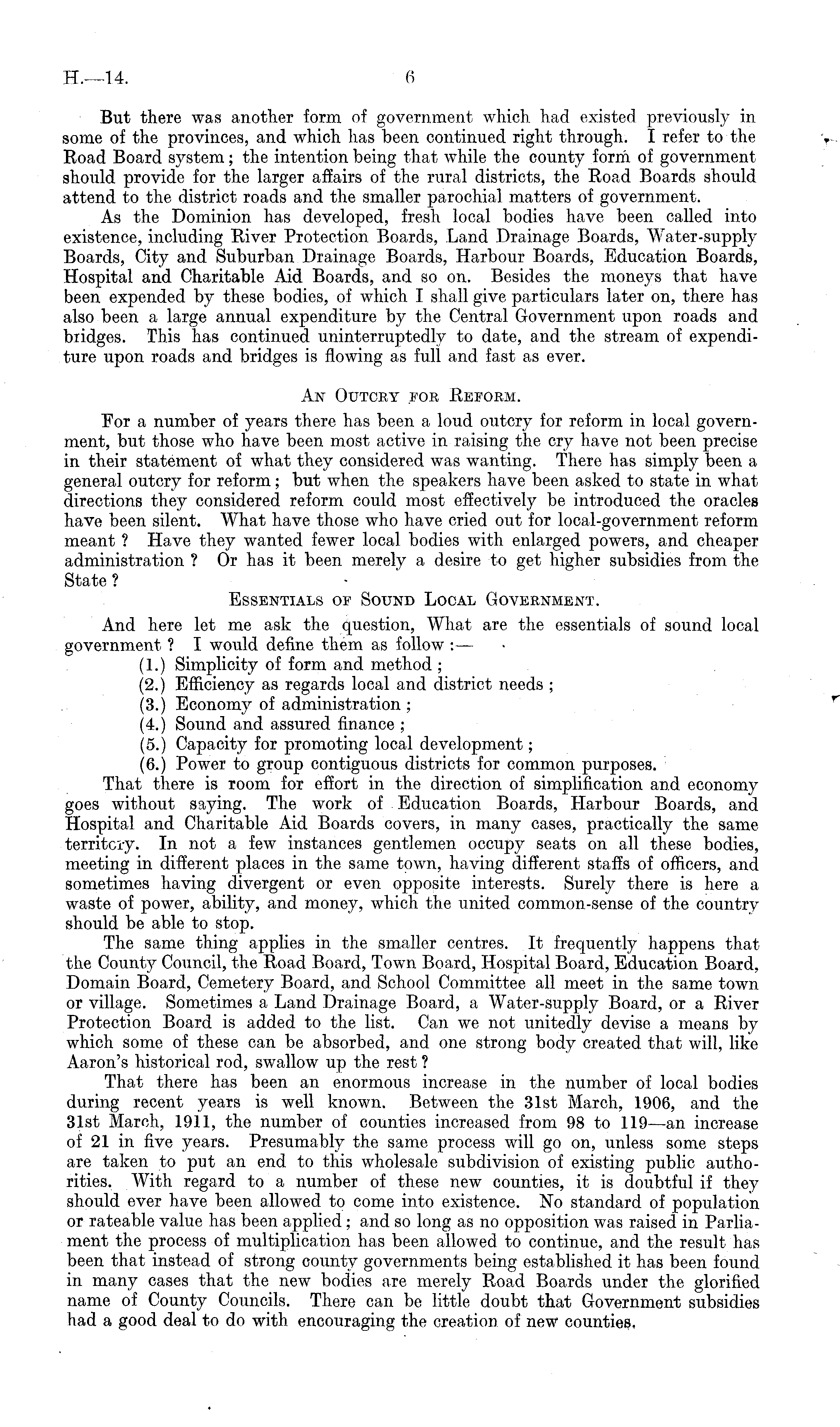 But there was another form of government which had existed previously in some of the provinces, and which has been continued right through. I refer to the Road Board system; the intention being that while the county form of government should provide for the larger affairs of the rural districts, the Eoad Boards should attend to the district roads and the smaller parochial matters of government. As the Dominion has developed, fresh local bodies have been called into existence, including River Protection Boards, Land Drainage Boards, Water-supply Boards, City and Suburban Drainage Boards, Harbour Boards, Education Boards, Hospital and Charitable Aid Boards, and so on. Besides the moneys that have been expended by these bodies, of which I shall give particulars later on, there has also been a large annual expenditure by the Central Government upon roads and bridges. This has continued uninterruptedly to date, and the stream of expenditure upon roads and bridges is flowing as full and fast as ever. An Outcby for Reform. For a number of years there has been a loud outcry for reform in local government, but those who have been most active in raising the cry have not been precise in their statement of what they considered was wanting. There has simply been a general outcry for reform; but when the speakers have been asked to state in what directions they considered reform could most effectively be introduced the oracles have been silent. What have those who have cried out for local-government reform meant ? Have they wanted fewer local bodies with enlarged powers, and cheaper administration ? Or has it been merely a desire to get higher subsidies from the State ? Essentials of Sound Local Government. And here let me ask the question, What are the essentials of sound local government ? I would define them as follow : — (1.) Simplicity of form and method ; (2.) Efficiency as regards local and district needs ; (3.) Economy of administration; (4.) Sound and assured finance ; (5.) Capacity for promoting local development; (6.) Power to group contiguous districts for common purposes. That there is room for effort in the direction of simplification and economy goes without saying. The work of Education Boards, Harbour Boards, and Hospital and Charitable Aid Boards covers, in many cases, practically the same territory. In not a few instances gentlemen occupy seats on all these bodies, meeting in different places in the same town, having different staffs of officers, and sometimes having divergent or even opposite interests. Surely there is here a waste of power, ability, and money, which the united common-sense of the country should be able to stop. The same thing applies in the smaller centres. It frequently happens that the County Council, the Road Board, Town Board, Hospital Board, Education Board, Domain Board, Cemetery Board, and School Committee all meet in the same town or village. Sometimes a Land Drainage Board, a Water-supply Board, or a River Protection Board is added to the list. Can we not unitedly devise a means by which some of these can be absorbed, and one strong body created that will, like Aaron's historical rod, swallow up the rest ? That there has been an enormous increase in the number of local bodies during recent years is well known. Between the 31st March, 1906, and the 31st March, 1911, the number of counties increased from 98 to 119 —an increase of 21 in five years. Presumably the. same process will go on, unless some steps are taken to put an end to this wholesale subdivision of existing public authorities. With regard to a number of these new counties, it is doubtful if they should ever have been allowed to come into existence. No standard of population or rateable value has been applied; and so long as no opposition was raised in Parliament the process of multiplication has been allowed to continue, and the result has been that instead of strong county governments being established it has been found in many cases that the new bodies are merely Road Boards under the glorified name of County Councils. There can be little doubt that Government subsidies had a good deal to do with encouraging the creation of new counties.