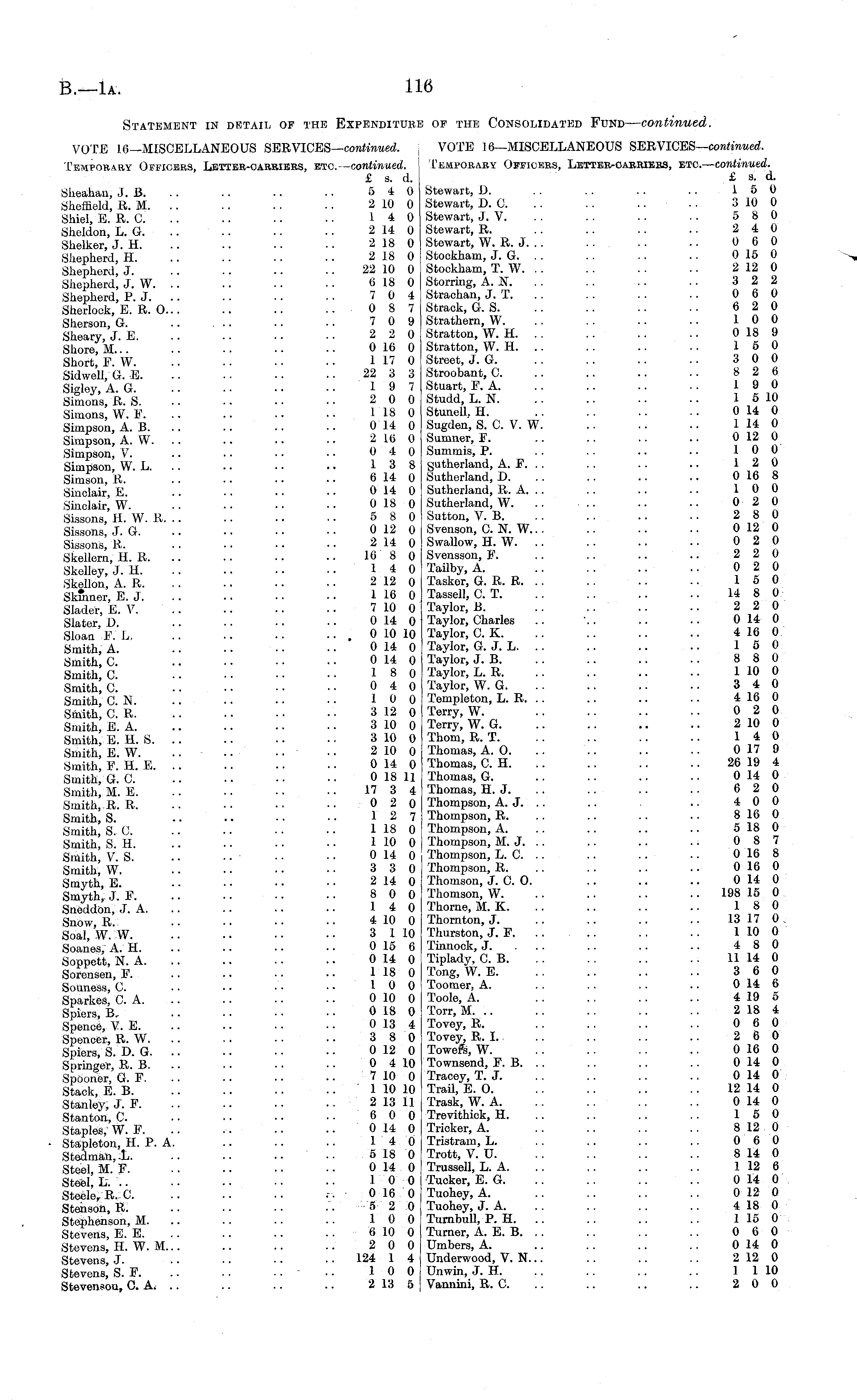 Statement in detail of the Expenditure op the Consolidated Fund — continued. VOTE 16—MISCELLANEOUS SERVlCES— continued. VOTE 16—MISCELLANEOUS SERVlCES— continued. Temporary Officers. Letter-carriers, etc.— continued. \ Temporary Officers, Letter-carriers, etc.— continued. £ s. d. £ a. d. Sheahan, J. B. .. .. .. 5 4 0 Stewart, D. .. .. .. .. 15 0 Sheffield, R. M. .. .. .. .. 210 0 Stewart, D. 0. .. .. .. .. 310 0 Shiel, E. R. C. .. .. .. • • 14 0 Stewart, J. V. .. .. .. .. 58 0 Sheldon, L. G. .. .. .. .. 214 0 Stewart, R. .. .. .. .. 2 4 0 Shelker, J. H 2 18 0 Stewart, W. R. J. .. 0 6 0 Shepherd H. .. .. .. .. 218 0 Stockham, J. G. .. . . . . .. 015 0 Shepherd, J 22 10 0 Stockham, T. W 2 12 0 Shepherd, J. W 6 18 0 Starring, A. N .. .. 3 2 2 Shepherd, P. J 7 0 4 Strachan, J. T 0 6 0 Sherlock, E. R. 0 0 8 7 Strack, G. S 6 2 0 Sherson, G. • • • • 7 0 9 Strathern, W. .. . . .. .. 10 0 Sheary J E .. .. • ■ • • 2 2 0 Stratton, W. H. . . .. .. .. 018 9 Shore, M... .. •. • • • • 016 0 Stratton, W. H. .. .. .. . . 15 0 Short FW. .. .. • • • • 117 0 Street, J. G. .. .. .. .. 3 0 0 Sidwell, G. E. .. .. .. • • 22 3 3 Stroobant, C. .. .. .. .. 82 6 Sigley AG .. .. •• •• 197 Stuart, F. A. .. .. .. .. 19 0 Simons, R. S 2 0 0 Studd, L. N 1 5 10 Simons, W. V. .. .. ■■ ■■ 118 0 Stunell, H. .. .. .. .. OHO Simpson, A. B 0 14 0 Sugden, S. C. V. W. 1 14 0 Simpson, A. W. .. .. .. •• 216 0 Sumner, F. .. .. .. .. 012 0 Simpson, V. .. .. •. • • 0 4 0 Summis, P. . . . . .. .. 10 0 Simpson, W. L. .. .. .. .. 13 8 Sutherland, A. F. .. .. .. .. 12 0 Simson R. .. .. .. • • 614 0 Sutherland, D. .. .. .. 016 8 Sinclair E .. .. .. • • 014 0 Sutherland, R. A. .. .. .. .. 10 0 Sinclair W .. .. • • • ■ 018 0 Sutherland, W .. .. 0 2 0 Sissons, H. W. R 5 8 0 Sutton, V. B 2 8 0 Sissons, J. G 0 12 0 Svenson, C. N. W 0 12 0 Sissons, R. 214 0 Swallow, H. W. .. 0 2 0 Skellern, H. R 16 8 0 Svensson, F 2 2 0 Skelley, J. H 14 0 Tailby, A. .. 0 2 0 Skellon, A. R 2 12 0 Tasker, G. R. R 15 0 Skinner, E. J 1 16 0 Tassell, C. T 14 8 0 Slader, E. V 710 0 Taylor, B. .. . . .. .. 2 2 0 Slater D. 014 0 Taylor, Charles .. '.. .. .. 014 0 Sloan F. L 0 10 10 Taylor, C. X 4 16 0 Smith, A. 0 14 0 Taylor, G. J. L 15 0 Smith, C. 0 14 0 Taylor, J. B 8 8 0 Smith, C. 18 0 Taylor, L. R 1 10 0 Smith, C. 0 4 0 Taylor, W. G 3 4 0 Smith ON. .. • • • ■ • • 10 0 Templeton, L. R. .. .. .. .. 416 0 Smith, C. R 3 12 0 Terry, W. 0 2 0 Smith, E. A 3 10 0 Terry, W. G 2 10 0 Smith, E. H. S 3 10 0 Thorn, R. T 14 0 Smith E. W ■ ■ • • 210 0 Thomas, A. 0 017 9 Smith, F. H. E 0 14 0 Thomas, C. H 26 19 4 Smith, G. C 0 18 11 Thomas, G 0 14 0 Smith, M. E 17 3 4 Thomas, H. J .. .. 6 2 0 Smith, R. R. .. .. • • ..020 Thompson, A. J. .. .. . .. 400 Smith, S. 12 7 Thompson, R 8 16 0 Smith, S. C. .. .. • • • • 118 0 Thompson, A. .. .. .. .. 518 0 Smith, S. H 1 10 0 Thompson, M. J 0 8 7 Smith, V. S. • • • • ■ • ■ • 014 0 Thompson, L. C. .. .. .. .. 016 8 Smith' W. .. • • • • • • 3 3 0 Thompson, R. .. .. .. .. 016 0 Smyth E .. ■ • • • • • 214 0 Thomson, J. G. O. .. .. .. 014 0 Smyth' J F .. ■ ■ • • • • 80 0 Thomson, W. . . .. .. 198 15 0 Sneddon, J. A 14 0 Thorne, M. X 18 0 Snow R .. • • ■ • ■ ■ 410 0 Thornton, J. .. .. .. .. 13 17 0. Soal W W .. • • • • 3 110 Thurston, J. F. . . .. .. .. 110 0 Soanes.A. H 0 15 6 Tinnock, J 480 Soppett, N. A 0 14 0 Tiplady, C. B 11 14 0 Sorensen, F 1 18 0 Tong, W. E 3 6 0 Souness, O. .. • • • • • • 10 0 Toomer, A. .. .. .. .. 014 6 Sparkes, C. A 0 10 0 Toole, A. 4 19 5 Spiers, B. 0 18 0 Torr, M 2 18 4 Spence, V. E 0 13 4 Tovey, R. 0 6 0 Spencer, R. W. .. ■ • ■ ■ • ■ 3 8 0 Tovey, R. I. .. .. .. .. 2 6 0 Spiers, S. D. G 0 12 0 Towers, W. 0 16 0 Springer R. B. .. .. •. • ■ 04 10 Townsend, F. B. . . .. .. .. 014 0 Spooner, G. F 7 10 0 Tracey, T. J 0 14 0 Stack E B .. .. • • .. 110 10 Trail, E. O. .. .. .. .. 12 14 0 Stanley, J. F 2 13 ll Trask, W. A 0 14 0 Stanton, C. .. 6 0 0 Trevithick, H 15 0 Staples, W. F. .. .. .. 014 0 Trieker, A. .. .. .. .. 812 0 Stapleton, H. P. A. .. .. .. 14 0 Tristram, L. .. .. .. .. 0 6 0 Stedman ;L. .. .. • • • ■ 518 0 Trott, V. U. .. .. .. .. 814 0 Steel M F .. .. • • • ■ 014 0 Trussell, L. A. .. .. .. . . 112 6 Steel' L.. •• ■■ •• •• 10 0 Tucker, E. G. .. .. .. .. 014 0 Steele, R..C .-. 0 16 0 Tuohey, A. .. .. .. .. 0 12 0 Stenson, R. .. .. .. •• 5 2 0 Tuohey, J. A. .. .. .. .. 4 18 0 Stephenson, M. .. .. .. .. 10 0 Turnbull, P. H. .. .. .. .. 115 0 Stevens, E. E 6 10 0 Turner, A. E. B. .. 0 6 0 Stevens, H. W. M 2 0 0 Umbers, A 0 14 0 Stevens, J. 124 1 4 Underwood, V. N... 2 12 0 Stevens, S. F. .. .. .. ■ ■ 10 0 Unwin, J. H. .. .. .. .. 1 110 Stevenson, 0. A. .. .. .. .. 213 5 Vannini, R. C. .. .. .. .. 2 0 0